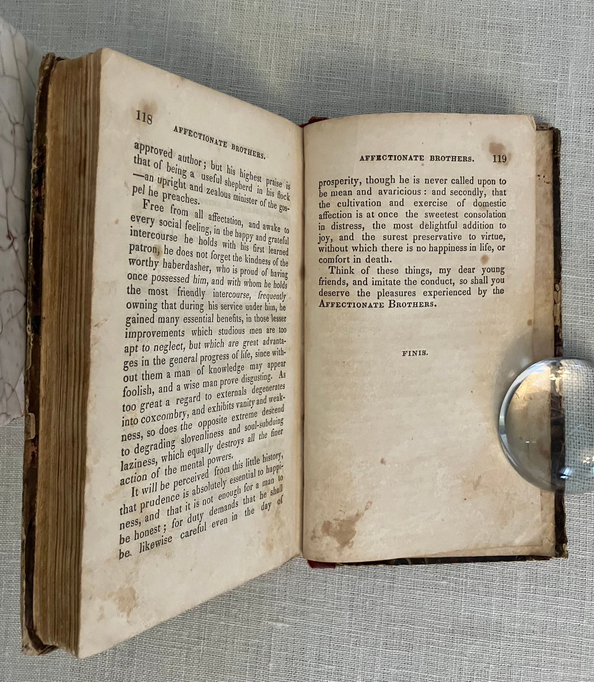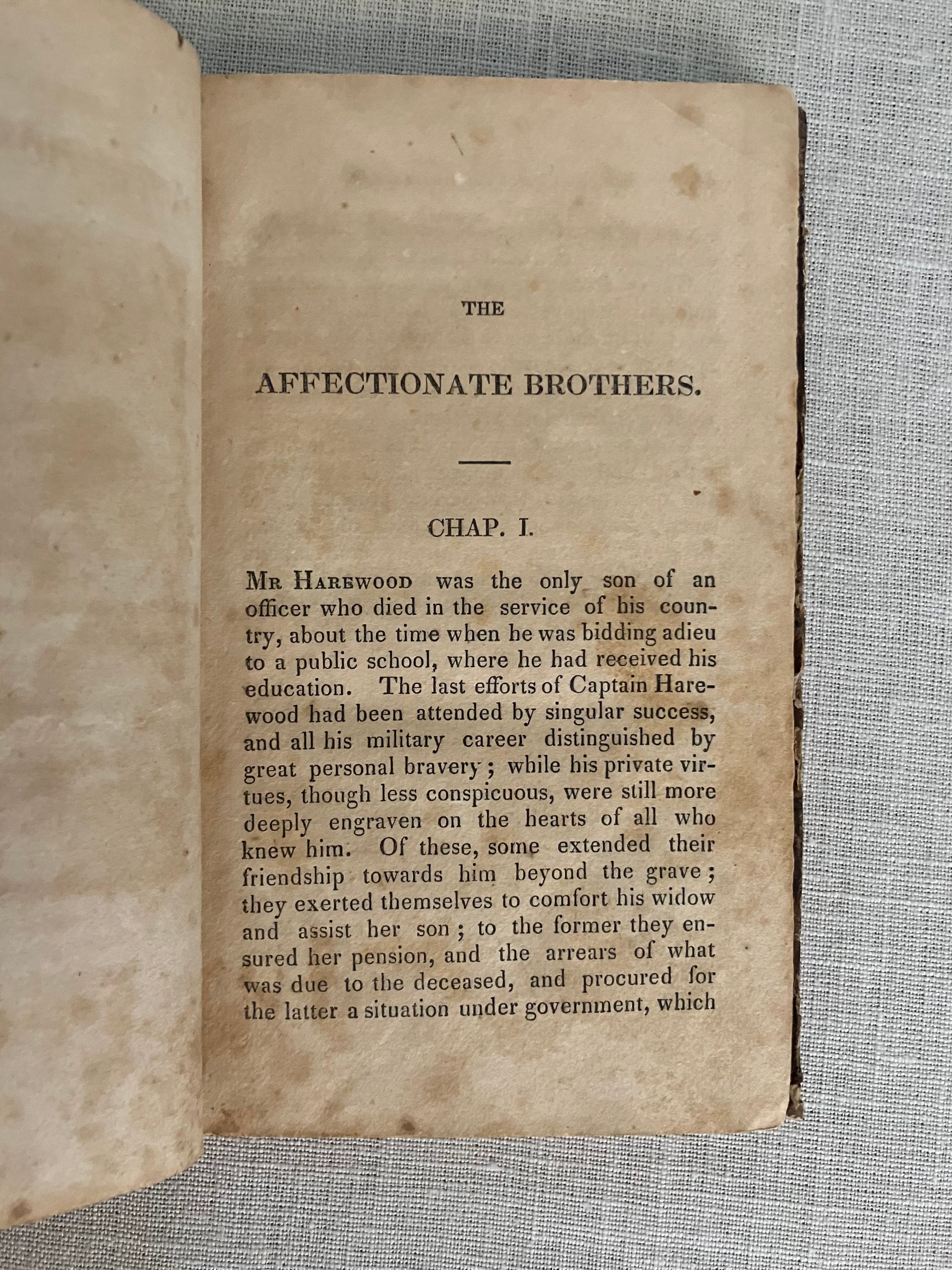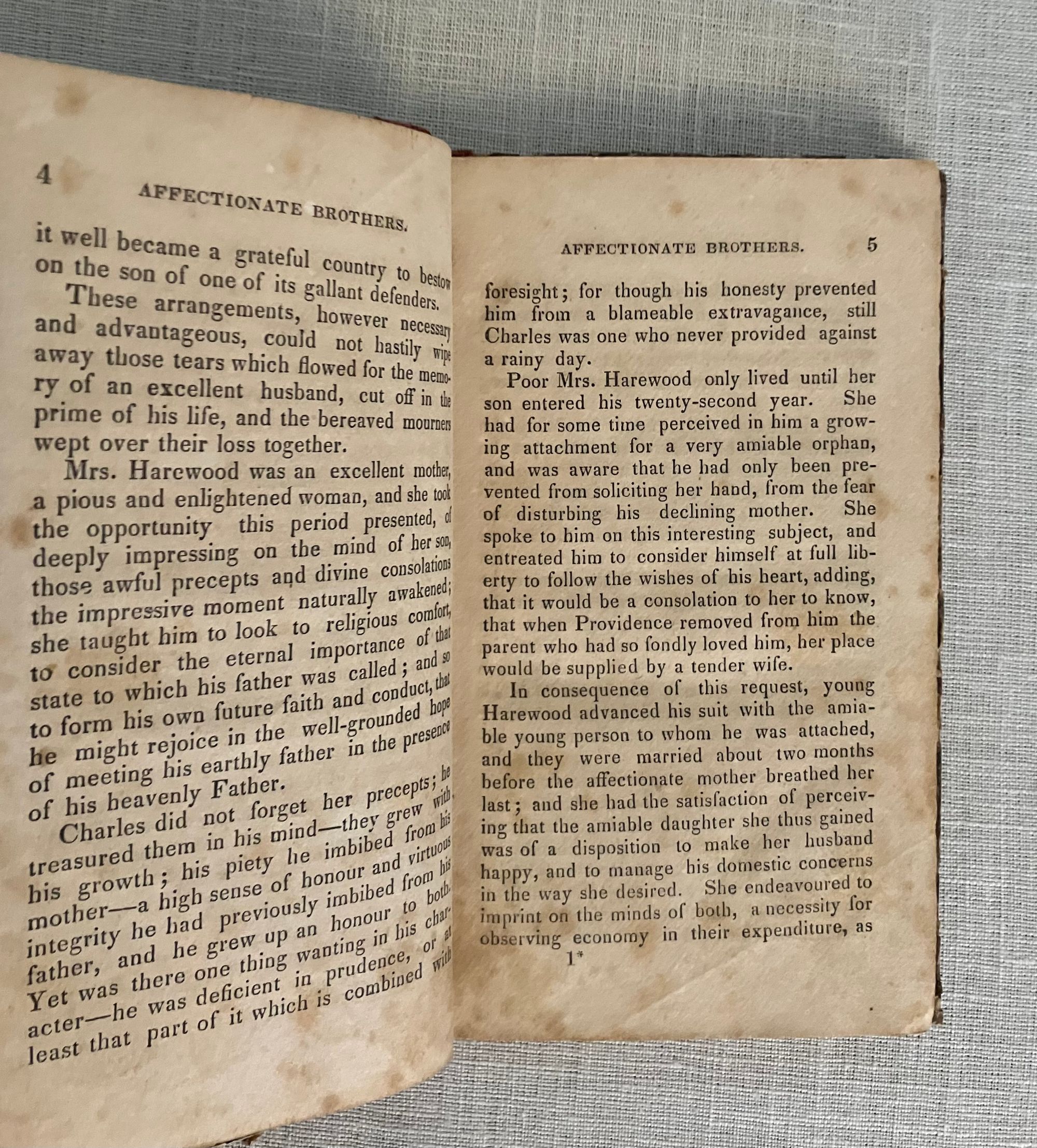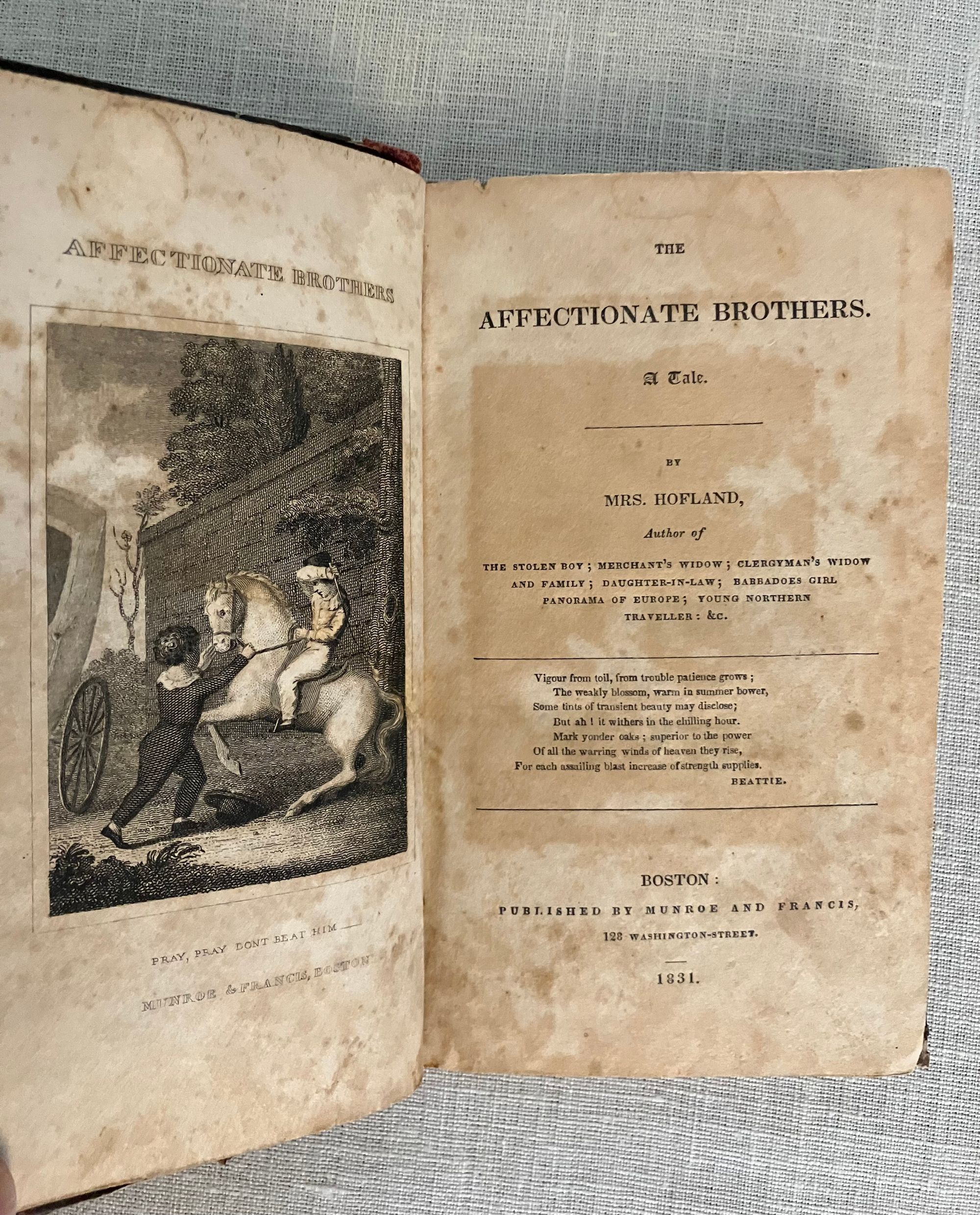 Reprint. Hard cover, 24 mo (measuring 3 1/2 x 6 inches) in half red leather, with marbled paper-covered boards, the title in gilt to the spine. Condition: Very Good Minus. Hinges cracked, but holding firm. Interior pages are sometimes stained and generally foxed. Paper label to front pastedown appears to be an old library label dictating the proper care of books, with a number in old ink upon it. Also, the stamp of John Price, Salem is on the ffep. **The moral tales written by Mrs. Hofland were extremely popular juvenile fiction in the early nineteenth century, both in America and their native England. The didactic tale recounted here was first published in both countries in 1816. Partly autobiographical, the tale is of the travails of a widowed young mother who finds herself with three children. The family's change in fortune brings to light some uncharitable reactions from old friends, and help from unexpected quarters. Mrs. Barbara Hofland (1770-1844) wrote under her second husband's name, (christened Barbara Wreakes in Sheffield, England, neƩ Hoole.) She penned a large number to support her family when she was first widowed. Her publishing success afforded her to then support her second husband, the landscape artist Thomas Christopher Hofland, RBA (1777-1843) a founding member of the Society of British Artists.** OCLC 84908324.