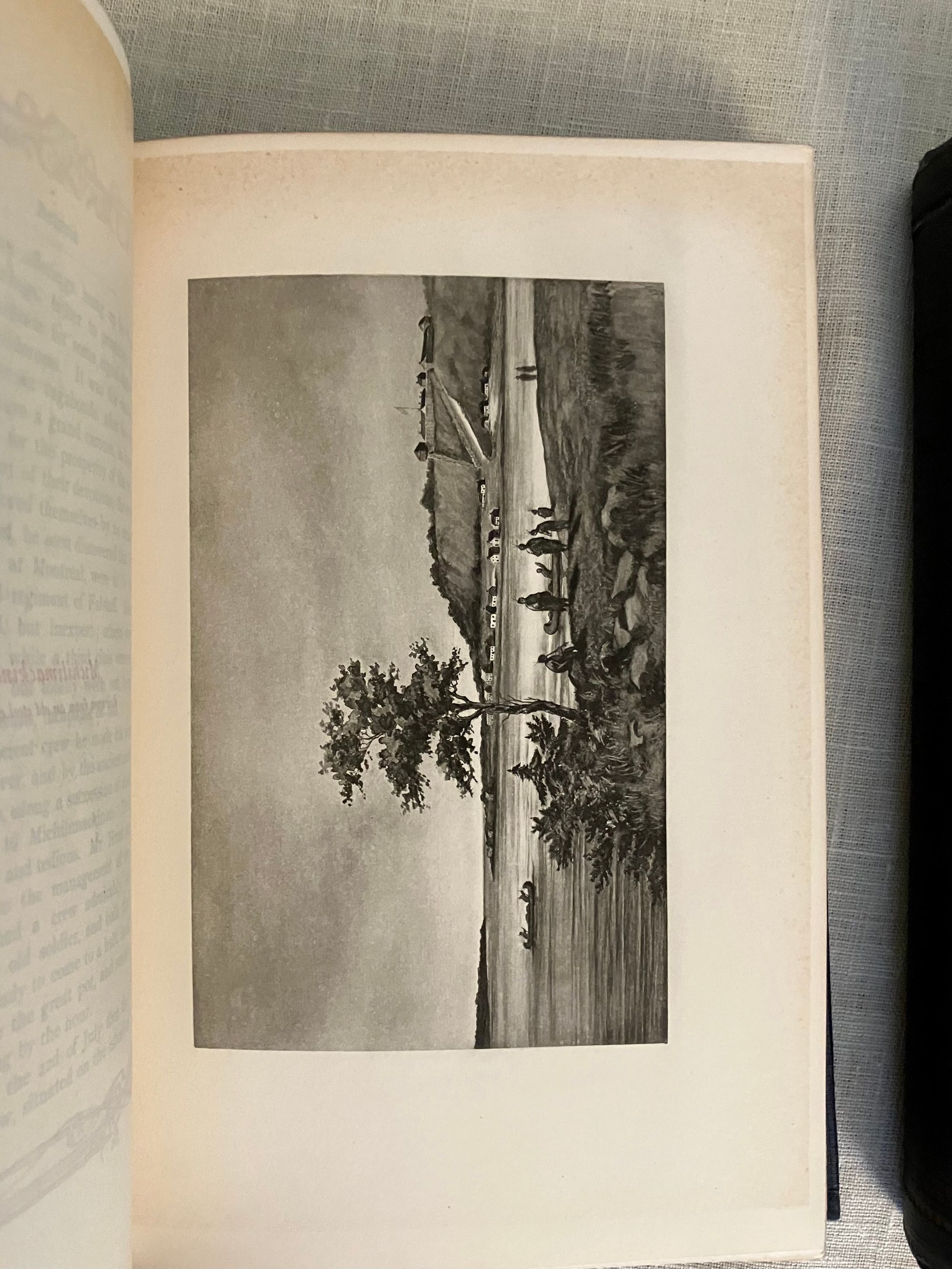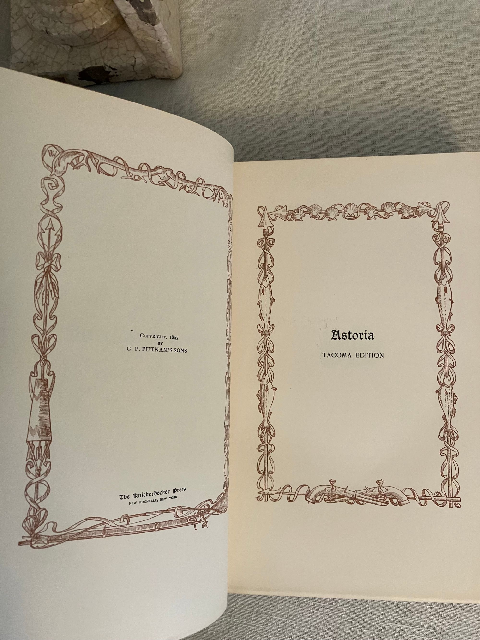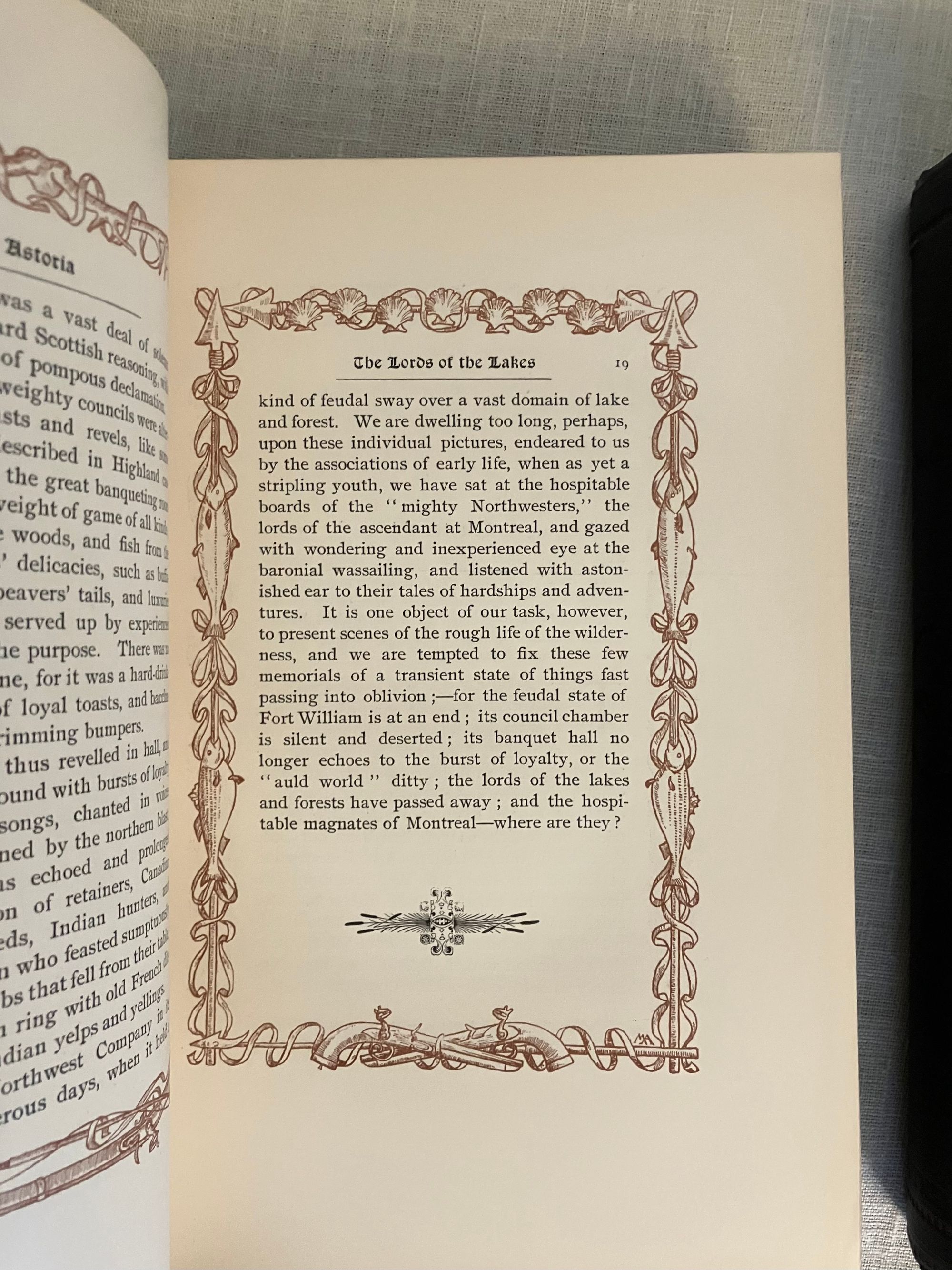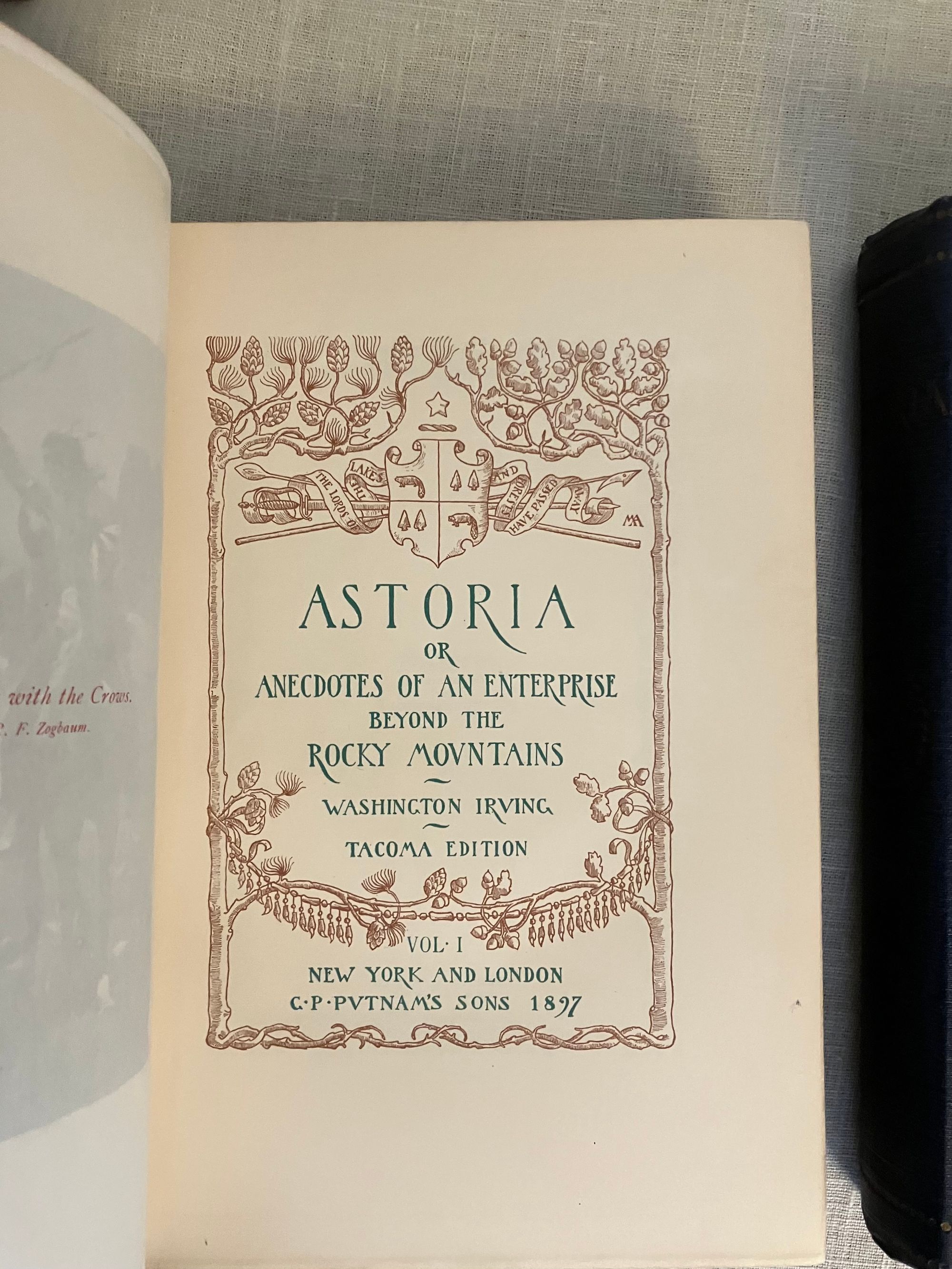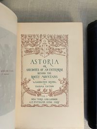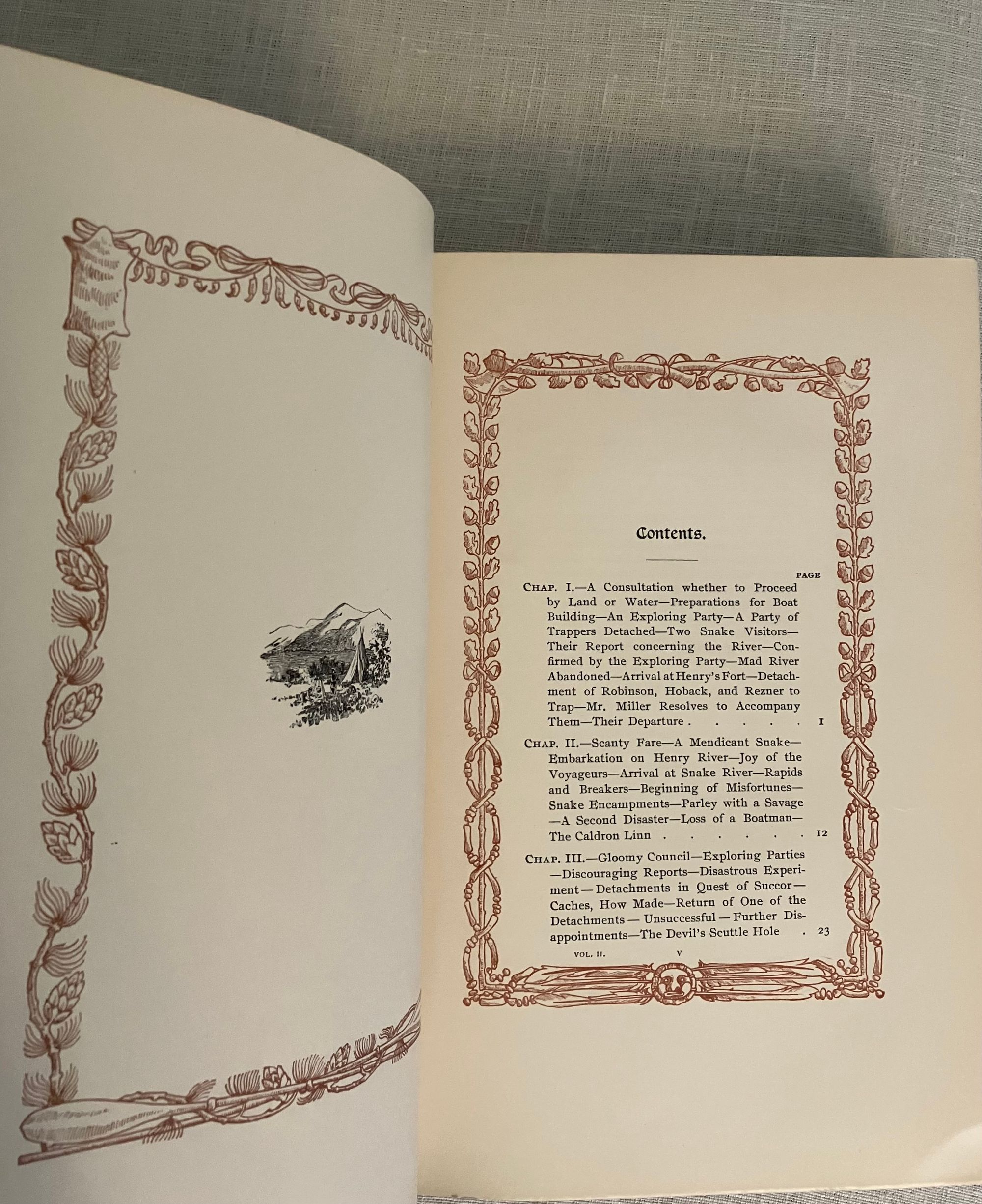 Printed at the Knickerbocker Press, New Rochelle, New York. Hard cover, 8vo. (measuring 6 x 9 inches) in blue cloth, the boards with a blind stamped double ruled border, and the spine with the titles in gilt, and author's name encircled in gilt dots. Vol. 1: (xvi), 389pp.15 black and white tissue-guarded illustrations. Vol. 2: (xxi) 391 pp., 12 illustrations. This edition features two-color title pages, and decorative borders in brown framing each page of text, with designs of acorns and pine cones. **First published in 1836, this account of the westward expansion of the fur trade was gleaned by the author Washington Irving from papers supplied to him from John Jacob Astor about the origins of the American and Pacific Fur Companies in the 18aughts. The author also relied on previously published accounts of Lewis and Clark, and others. American "manifest destiny," and tales of "remote and adventurous enterprises," all voiced with the skill of a novelist, makes for a really good read. Condition: Very Good Plus. Spines a bit sunned. Bright, tight and clean with no signs of foxing or writing. Very Gently age toned. (One half inch repair to a closed tear at fore-edge.) Very minimal head and foot shelf wear.