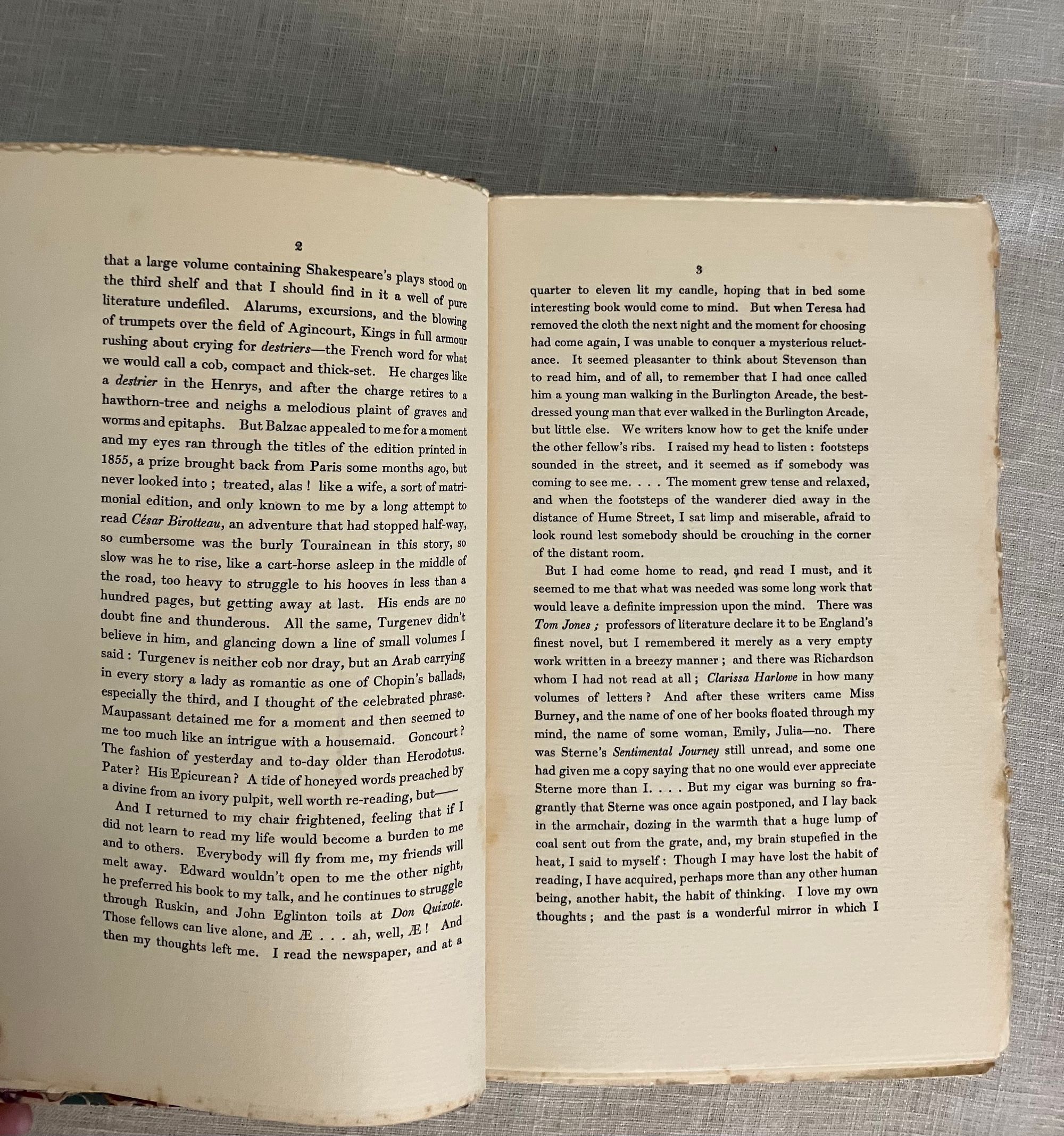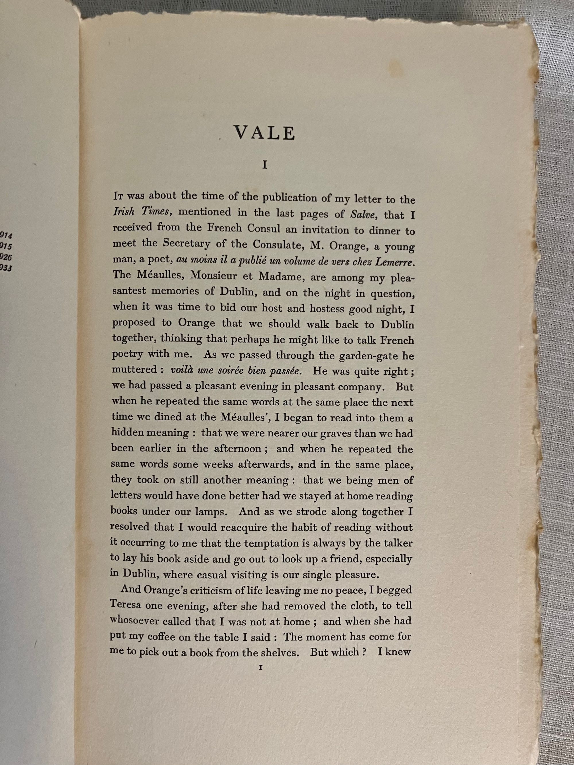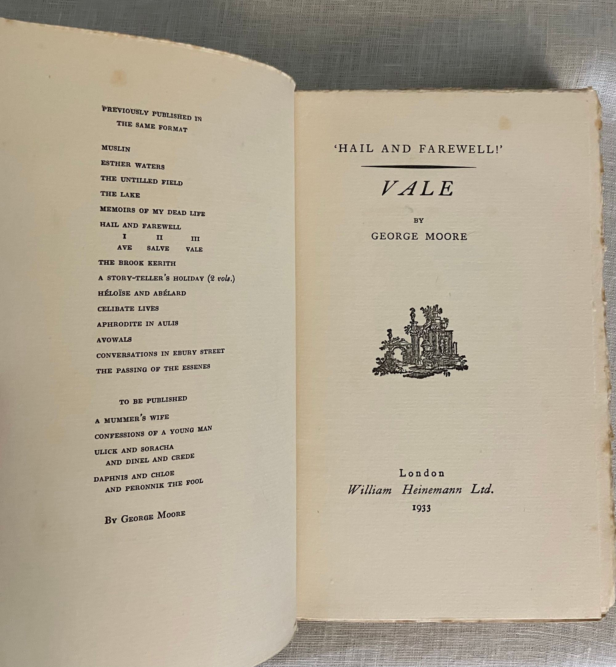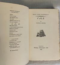 Hard cover, 8vo, in half brown cloth with marbled paper-covered boards, a cream printed paper label to the spine, edges untrimmed, with an engraved bookplate of a now-defunct, central Scottish baronetcy. 259 pp. on heavy laid paper. This is Book Ten of the Uniform Edition of Heinemann's "The Works of George Moore," being the third book (only) of a three volume novel. Condition: Very Good. There is some browning to the page edges, which are untrimmed, and a couple of gently bumped corners. A few spots of occasional foxing and lightly age-toned. This work has been described as a semi-autobiographical novel, and his most famous work, in which he voices his real contemporaries as fictional characters, such as Yeats and Lady Gregory. **Irish author, poet and critic, George Augustus Moore ( 1852-1933) was influenced by the naturalism of the French writers he met during residence in Paris while training as an artist in the 1880's, and would later go on to be instrumental in the foundation of Dublin's Abbey Theatre.
