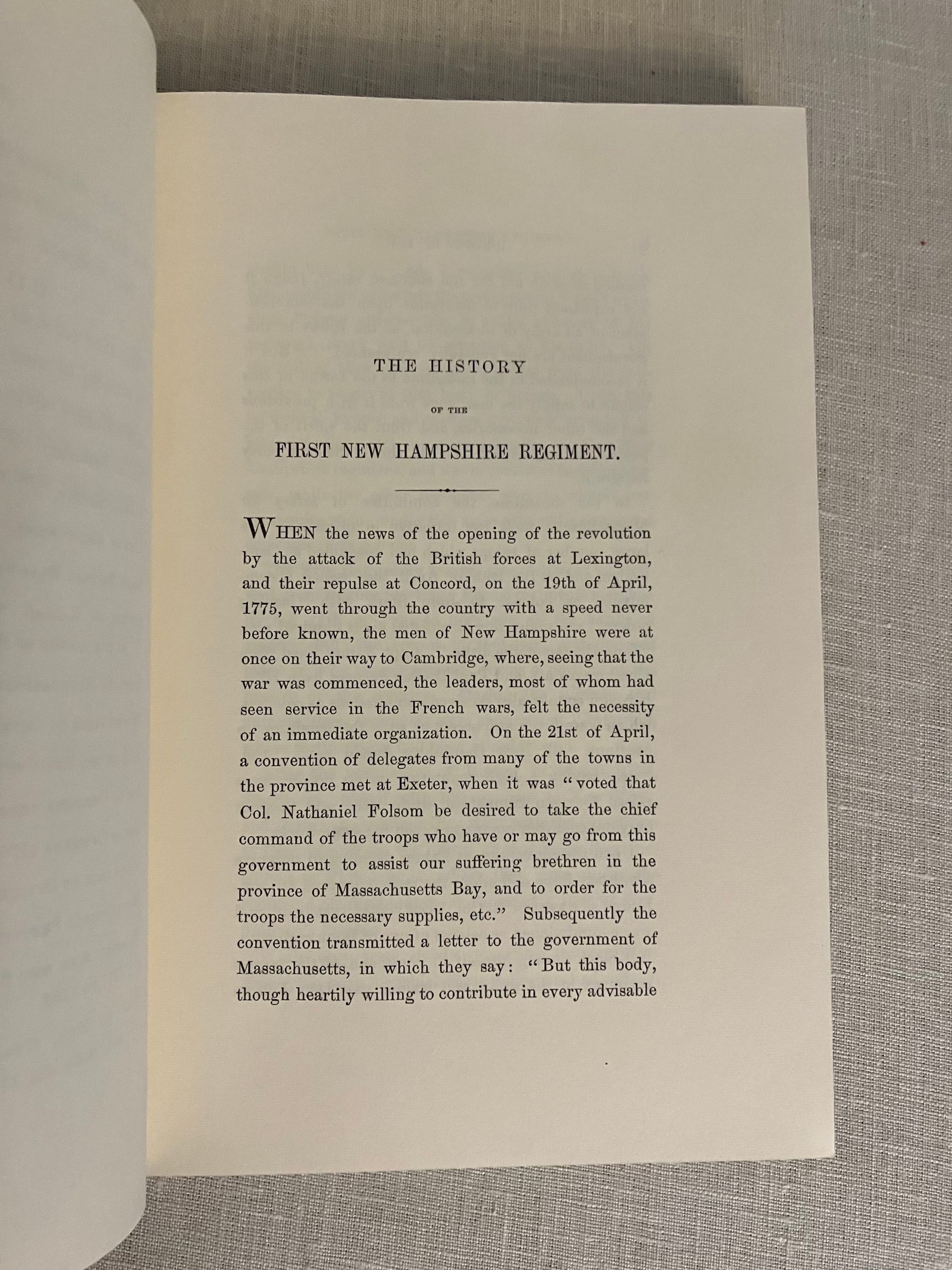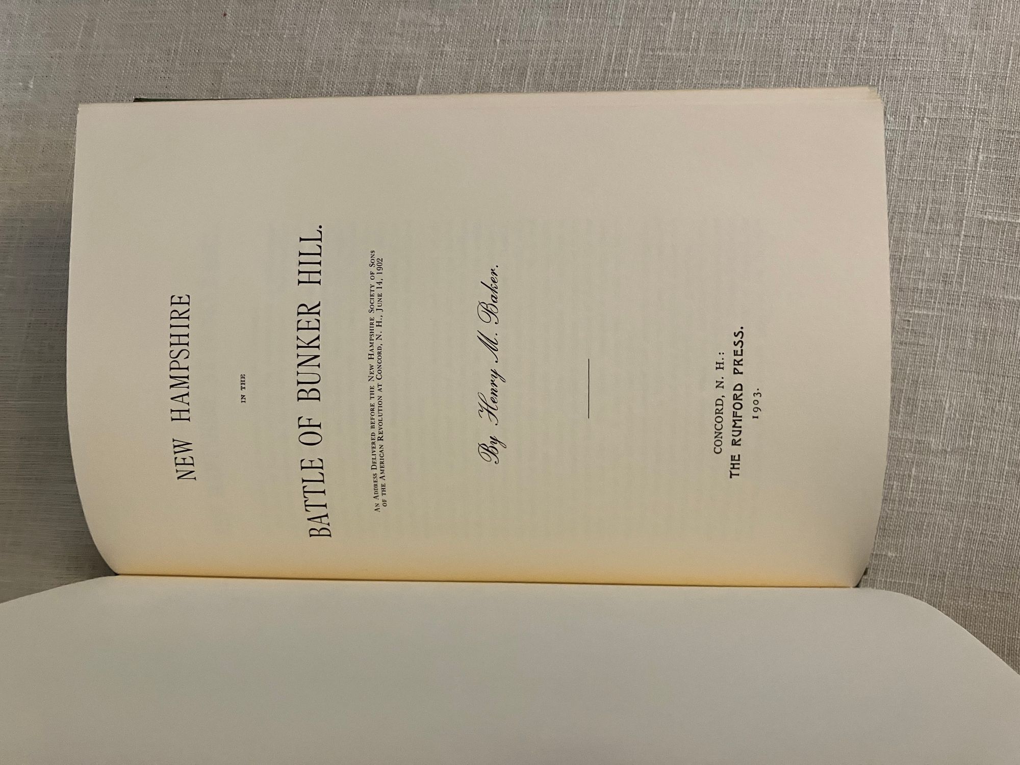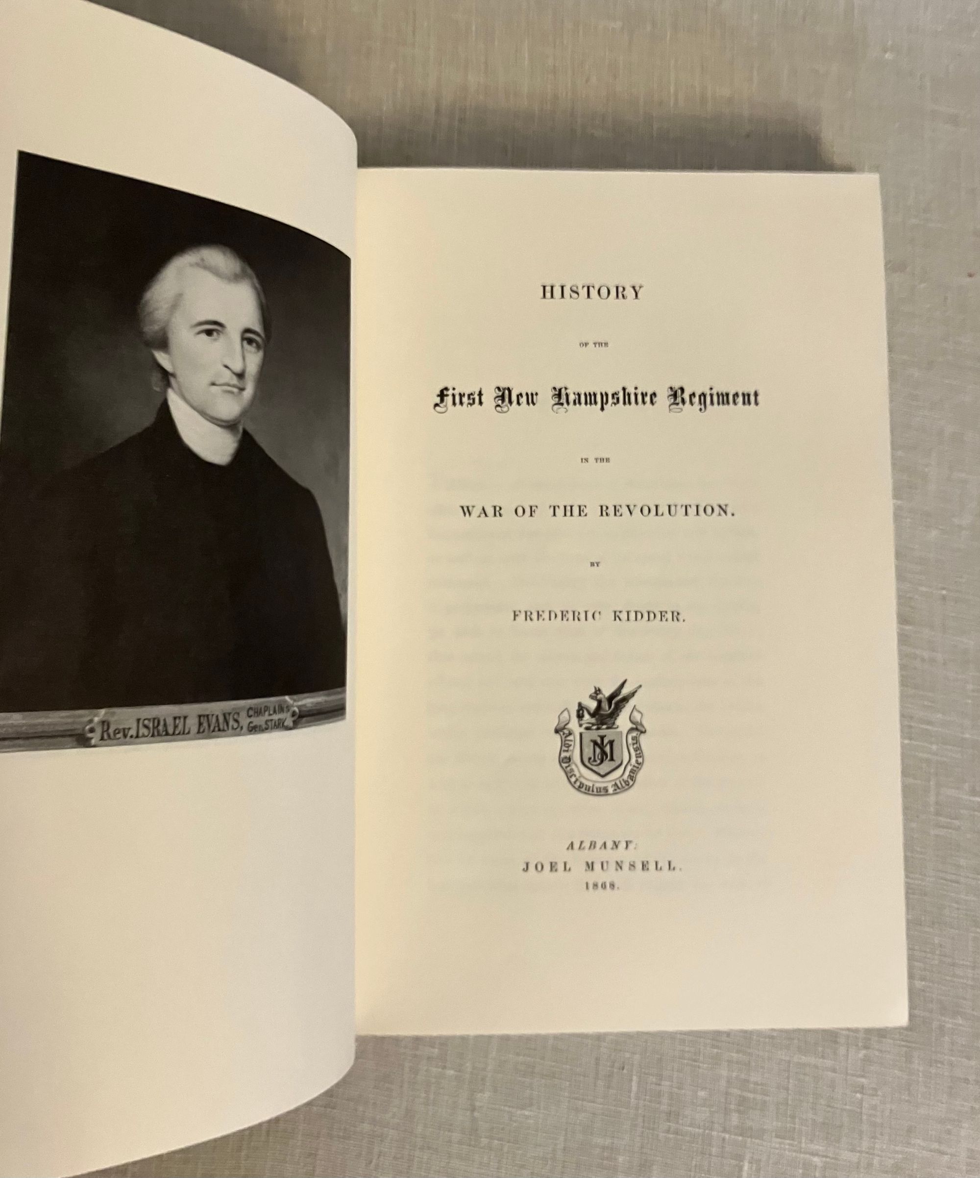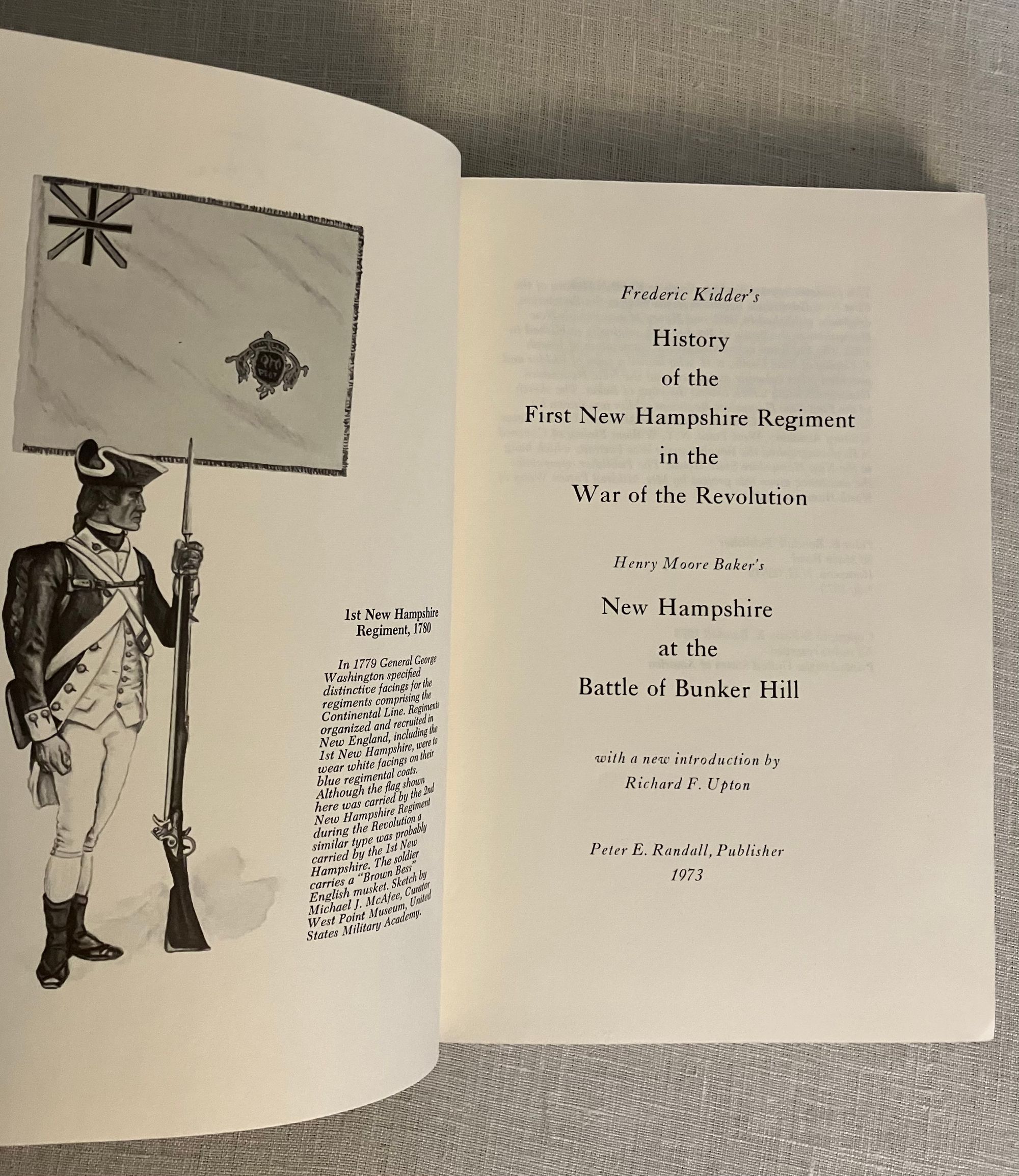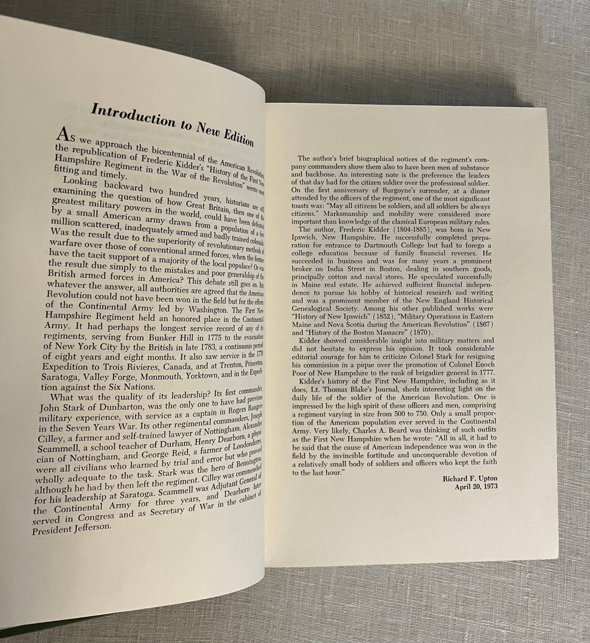 Hard cover, 8vo., in green cloth with gold print to front board and spine. Contains two complete facsimile works reprinted from the originals in one volume, with additional introduction and portrait illustrations. Kidder: 184pp including Index, originally published by Joel Munsell of Albany, NY (1868). Baker, 23pp. originally published at The Rumford Press, Conncord, NH, 1903. Condition: Very Good Plus. Ballpoint inscription to ffep. and former owner's bookplate. Otherwise clean, bright and showing little wear. The Kidder Manuscript examines how the individuals of the fabled the New Hampshire Regiment were able to out-maneuver the British in the various expeditions of the Revolutionary War, relying on diaries and other first-hand accounts and provides the roll of individuals and dates involved. The Baker manuscript is an adress delivered to the New Hampshire Society of the Sons and Daughters of the American Revolution in 1902.