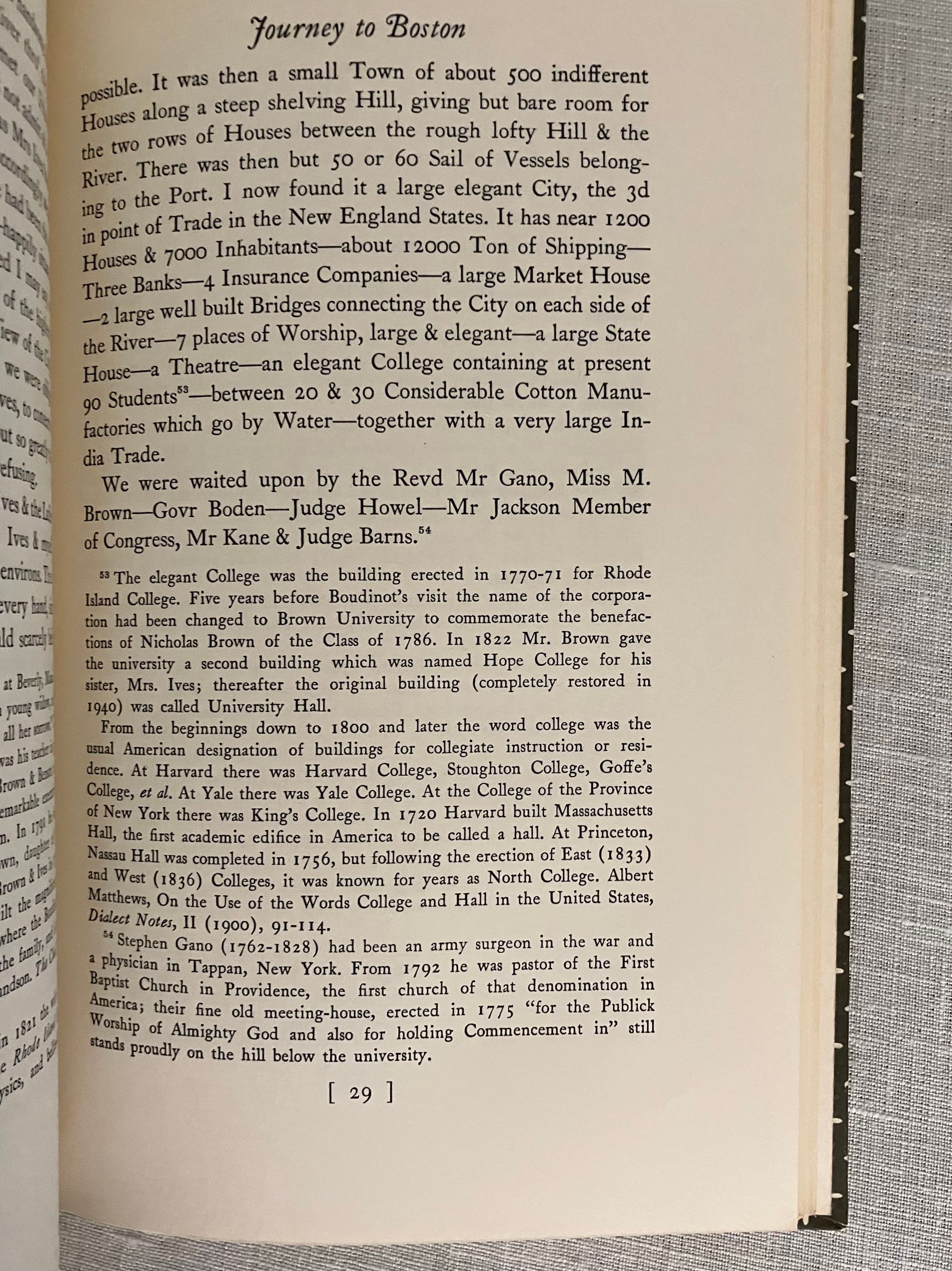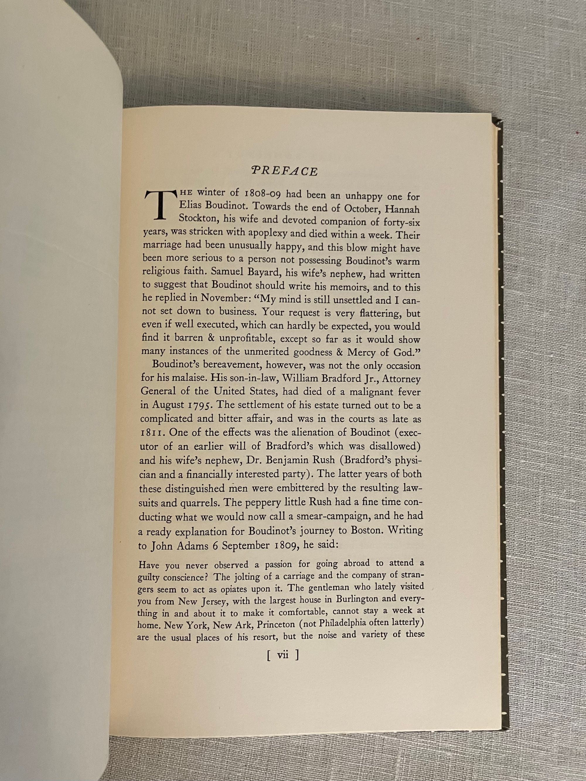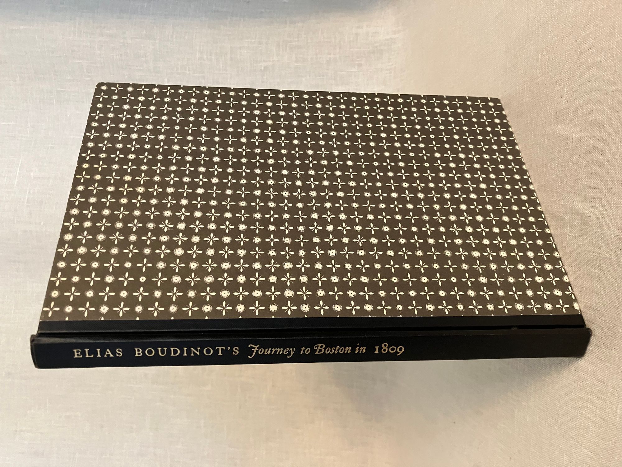 Hard cover, 8 vo, in half black cloth, with white and grey paper covered boards, titles to spine in gold, 97pp. This is a reprint of an original journal from 1809 now in the Princeton University Library. New Jersey native, Elias Boudinot, LL.D. (1740-1821) was a founding father, a member and later President, of Congress from 1782 to 1783. He was also a founder-member and President of the American Bible Society, and appointed by Washington as the Director of the United States Mint. The narrative is from a journal kept by Mr. Boudinot of a trip from his home in Burlington, New Jersey to Boston soon after the loss of his wife. Notes and an index are appended as auxiliary to the appreciation of the author's notable friends and acquaintances, and familiarity with the movers and shakers of early American industry passed by along his carriage route through New Jersey, Connecticut and on to Boston. One of his works, entitled: A Star in the West; or, a humble attempt to discover the long lost tribes of Israel, preparatory to the their return to Jerusalem..., is among the American books in the British Library (Stevens, p. 75.)
