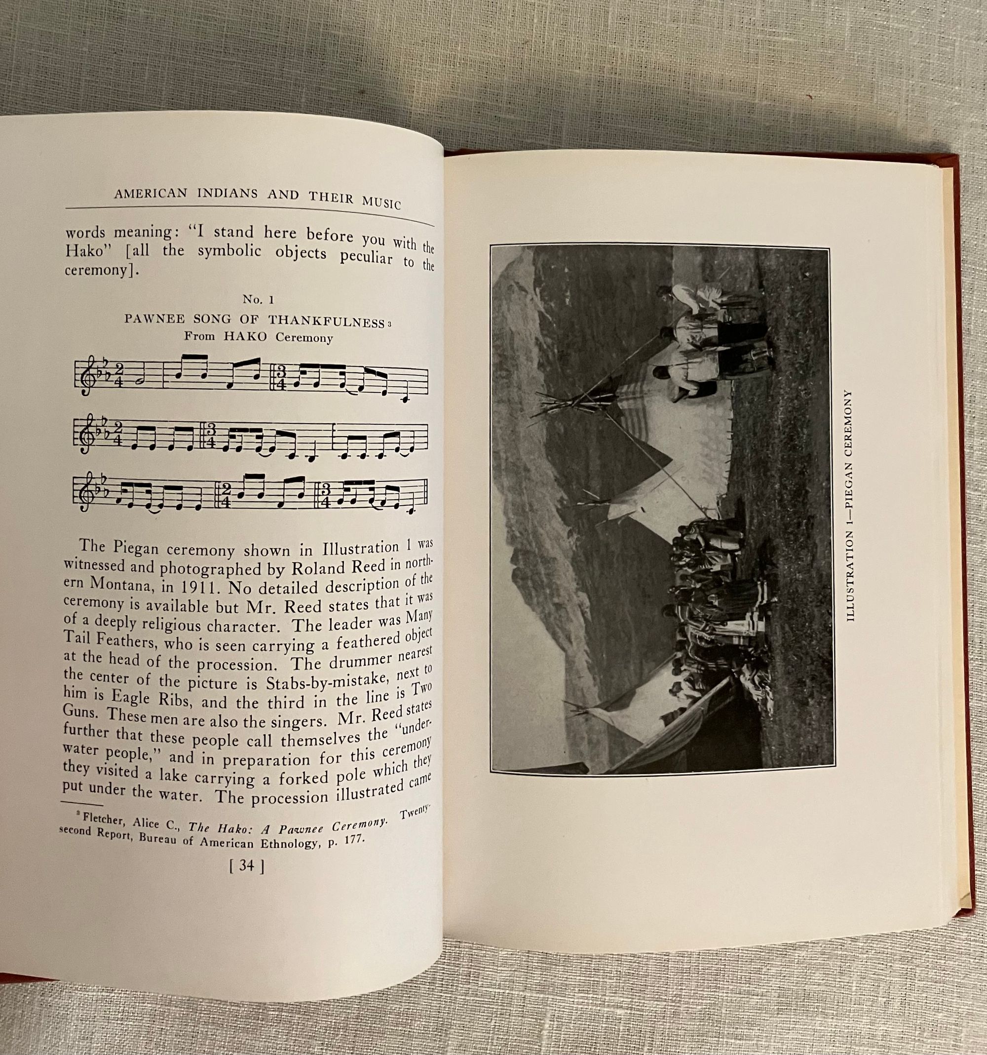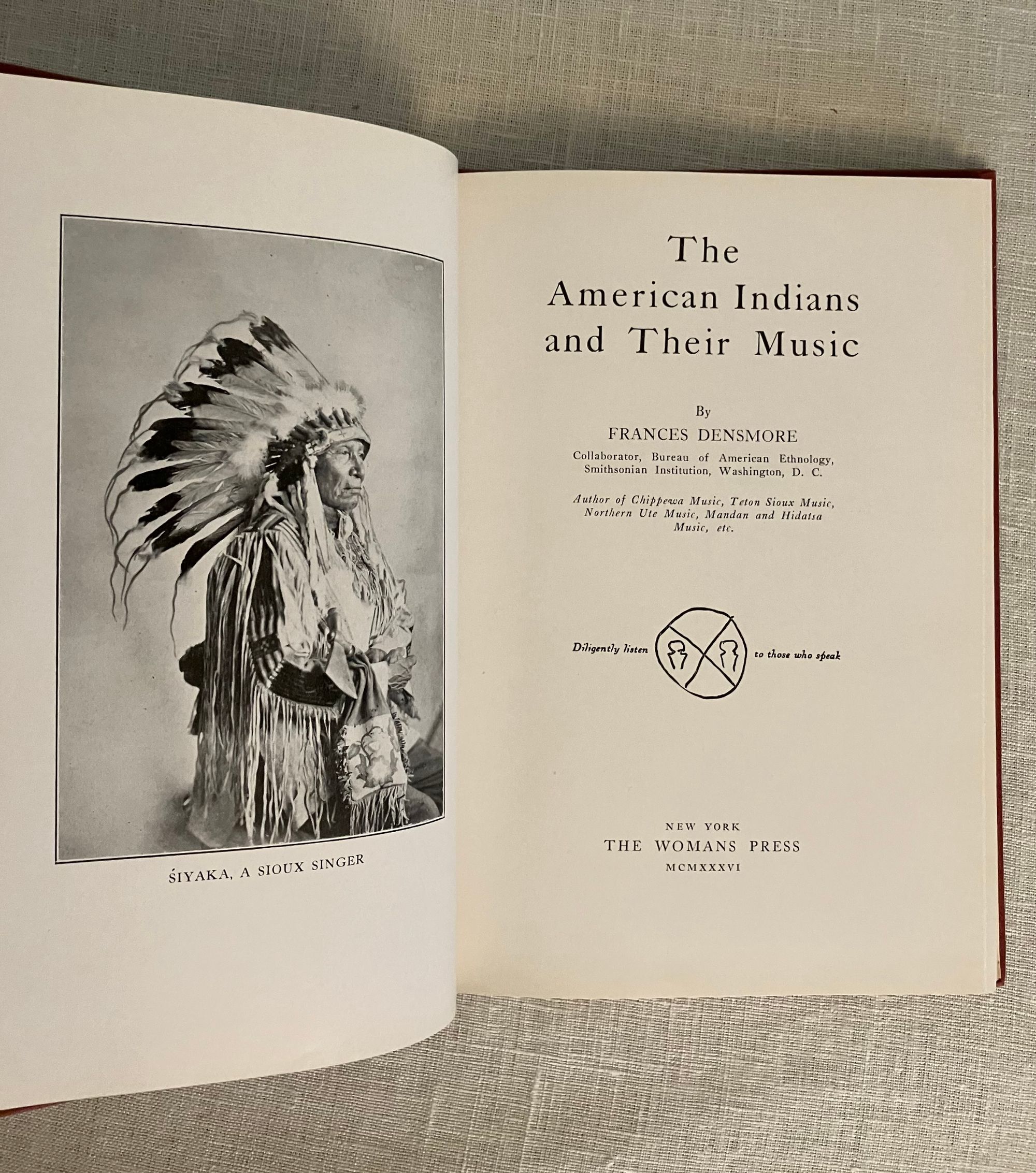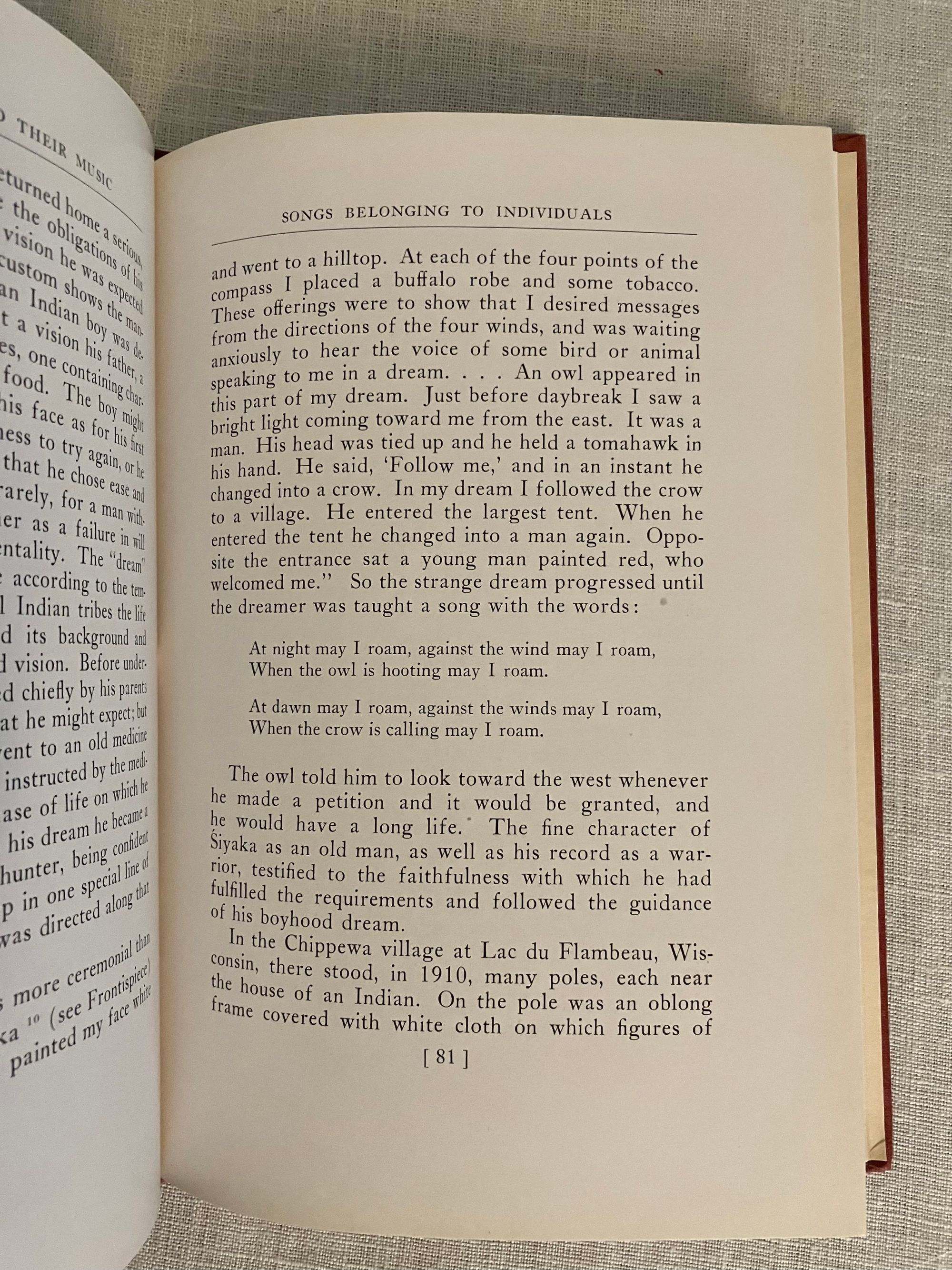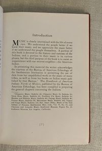 Hardcover, 8vo (5 ½" x 7 ⅞"). Revised version of the 1926 first edition. Condition: Fine. *** A study of the music, musical instruments, dance, songs and ceremonies of Native Americans, by the American anthropologist, Frances Theresa Densmore (1867-1957). As well as writing about the tribal songs, she made may recordings of them too, for the Bureau of American Ethnology (many of which are now housed in the Library of Congress). Her studies included the Chippewa, Mandan, Hidatsa, Sioux, Pawnee and the Papago.