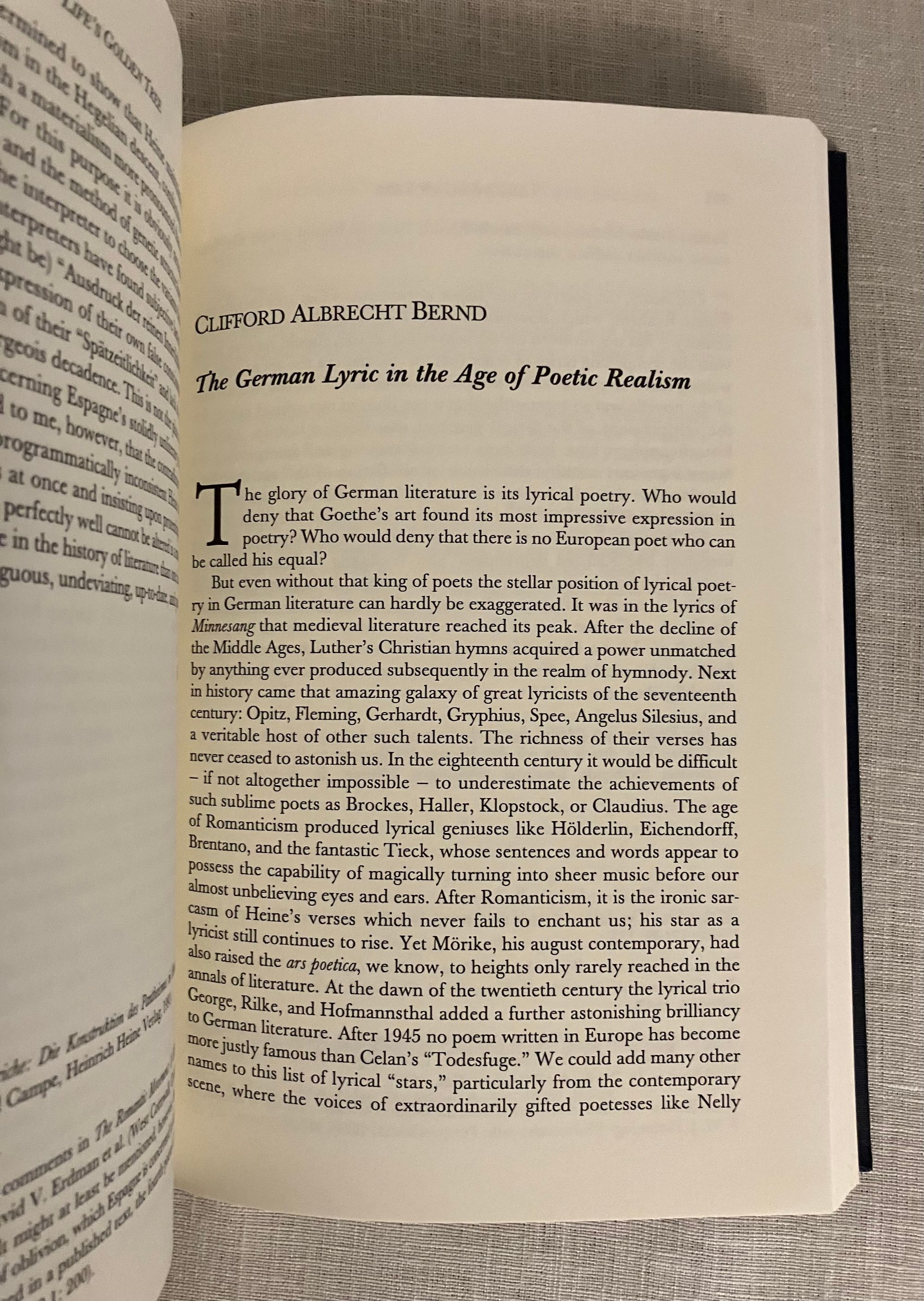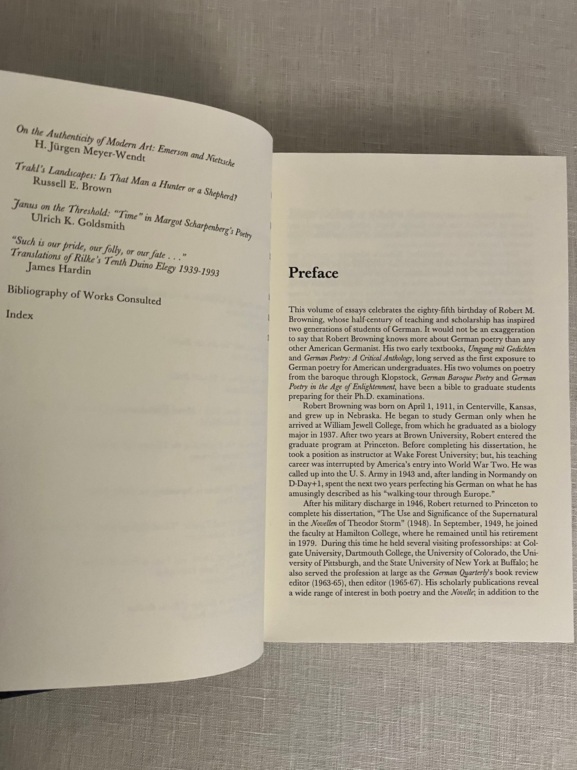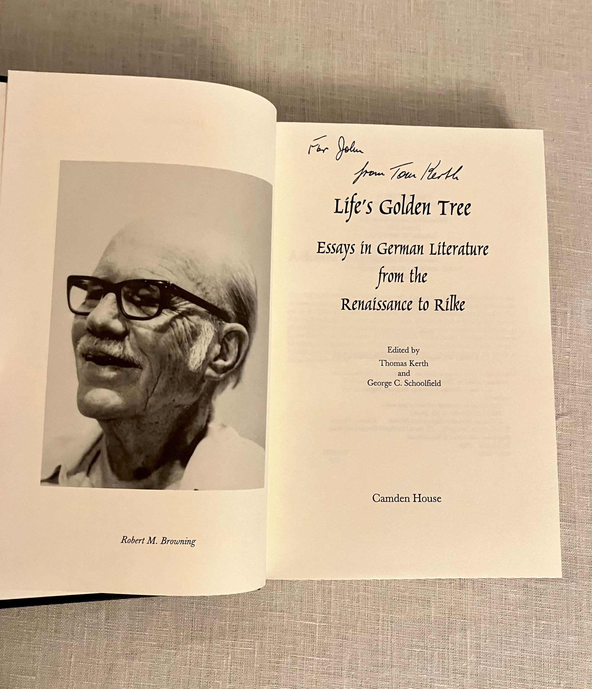 Hard cover, 8vo, in navy blue cloth with titles to front and spine in gold, First Edition, (xii), 282pp. English text. Condition: Fine, (like new). ** This is part of a series by Camden House of "Studies in German Literature, Linguistics and Culture." A volume celebrating the career of the scholar Professor Robert Browning, (1911- 2000) who taught for many years at Hamilton College, and was a widely respected author on German poetry. This anthology, in English, contains articles from various scholars, including: Paul F. Casey, "Children and Images of Childhood in German Biblical Drama of the Sixteenth Century"; Thomas Kerth, Sibylle Schwartz and die Art der Bilder"; Gerald Gillespie, "Baroque High: Above it All with Balde"; George C. Schoolfield, "Memory's Lane: Simon Dach's Memel Epithalamium of January 18, 1655"; Anthony J. Harper, "Urbs Litteraria: On Researching the Literary Life of the Town in Seventeenth-Century Germany"; John Roger Paas, "The Production of Emblems in Nurenberg, c. 1650-1680"; Christoph E. Schweitzer, "Goethe's Iphigenie auf Tauris: Gleich Opfergerüchen ("Parzenlied"); Jeffrey L. Sammons, observations on Aging, Death and Poesy in Heinrich Heine's Late Poem "Bimini," partly Philological"; Clifford Albrecht Bernd, "The German Lyric in the Age of Poetic Realism"; H. Jurgen Meyer-Wendt, "On the Authenticity of Modern Art: Emerson and Nietzsche"; Russell E. Brown, "Trakl's Landscapes: Is That Man a Hunter or a Shepherd?"; Ulrich K. Goldsmith, "Janus on the Threshold: "Time" in Margot Scharpenberg's poetry" and, finally, James Hardin, "Such is our pride, our folly, or our fate..." Translations of Rilke's Tenth Duino Elegy 1939-1993."