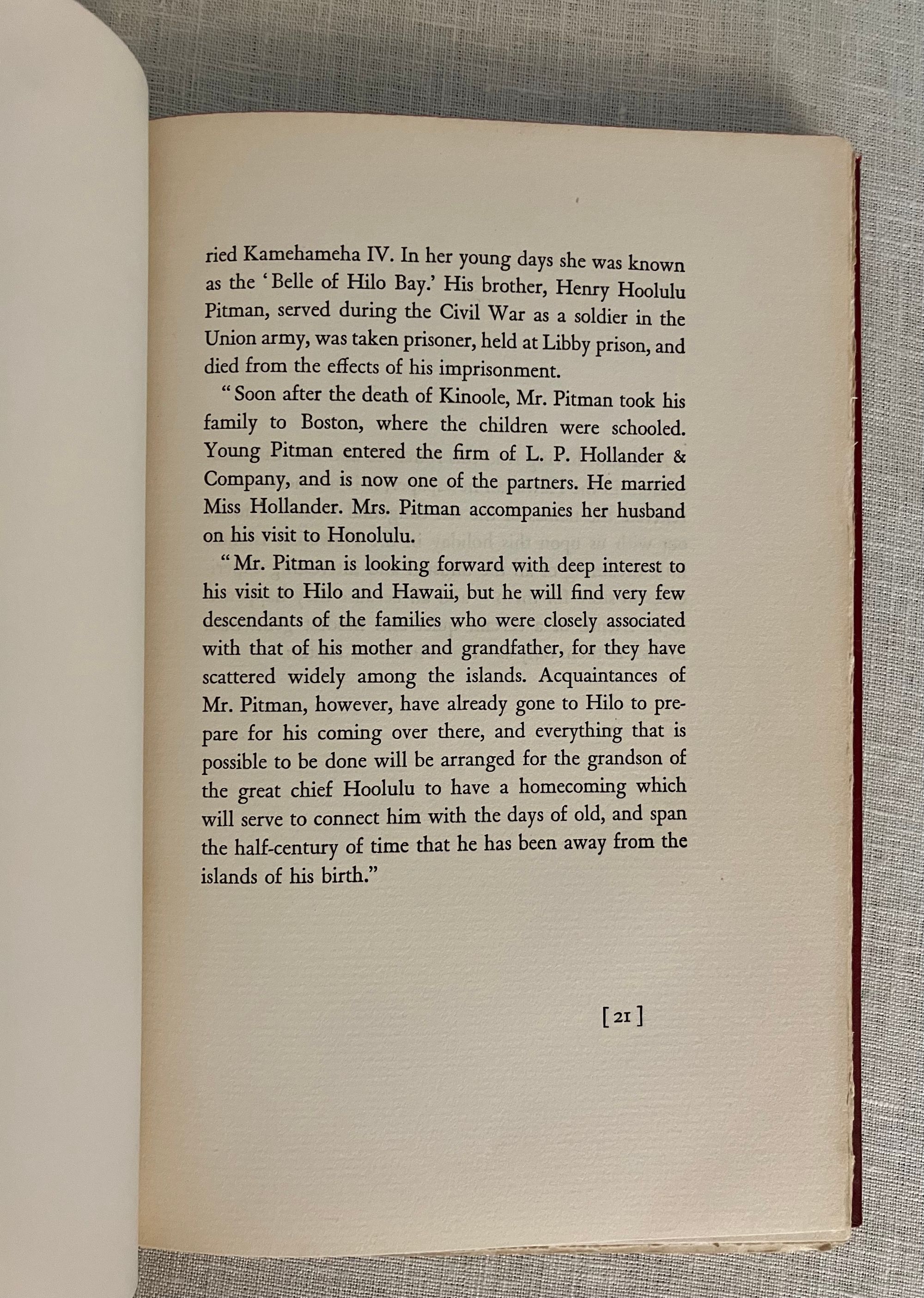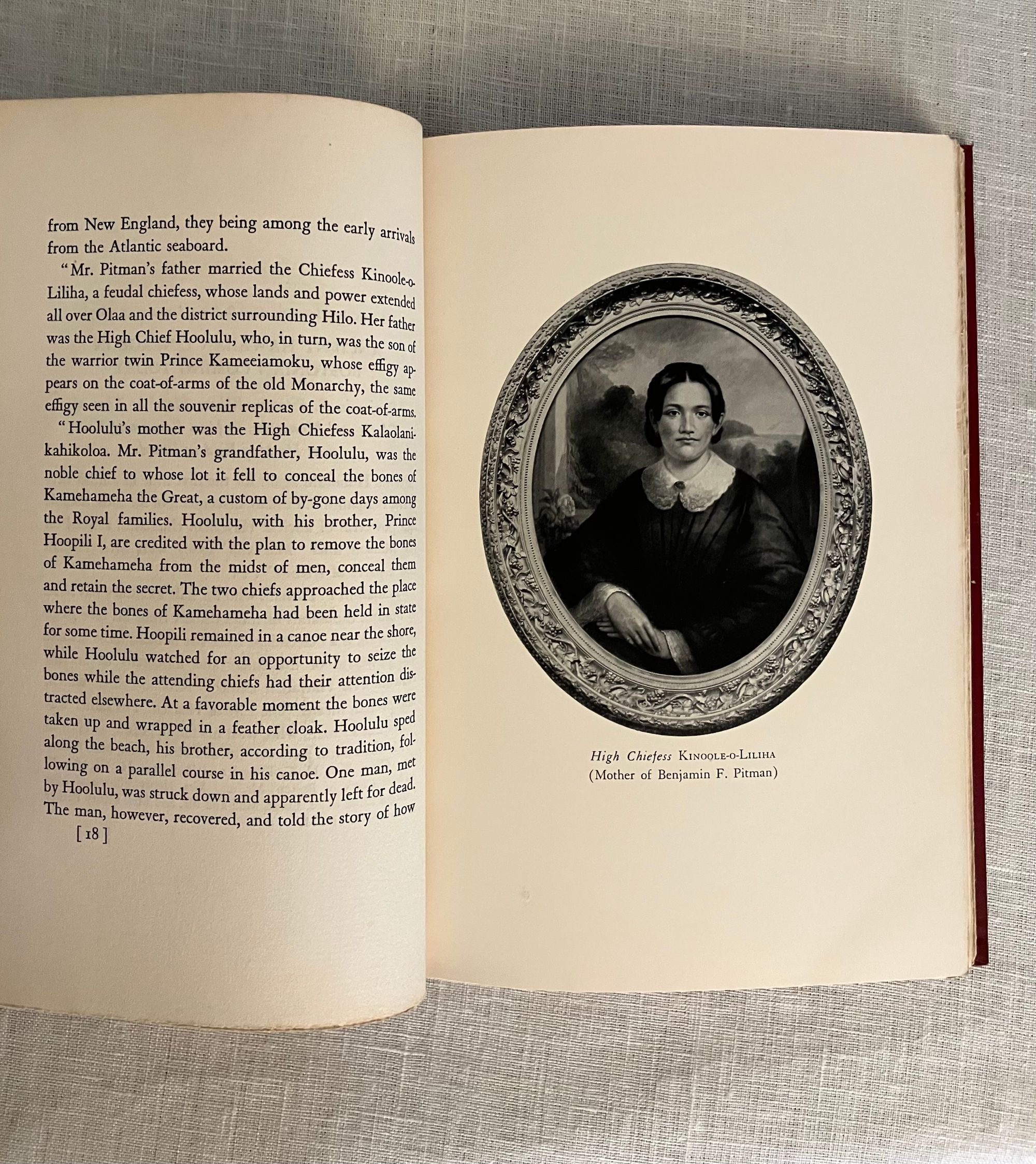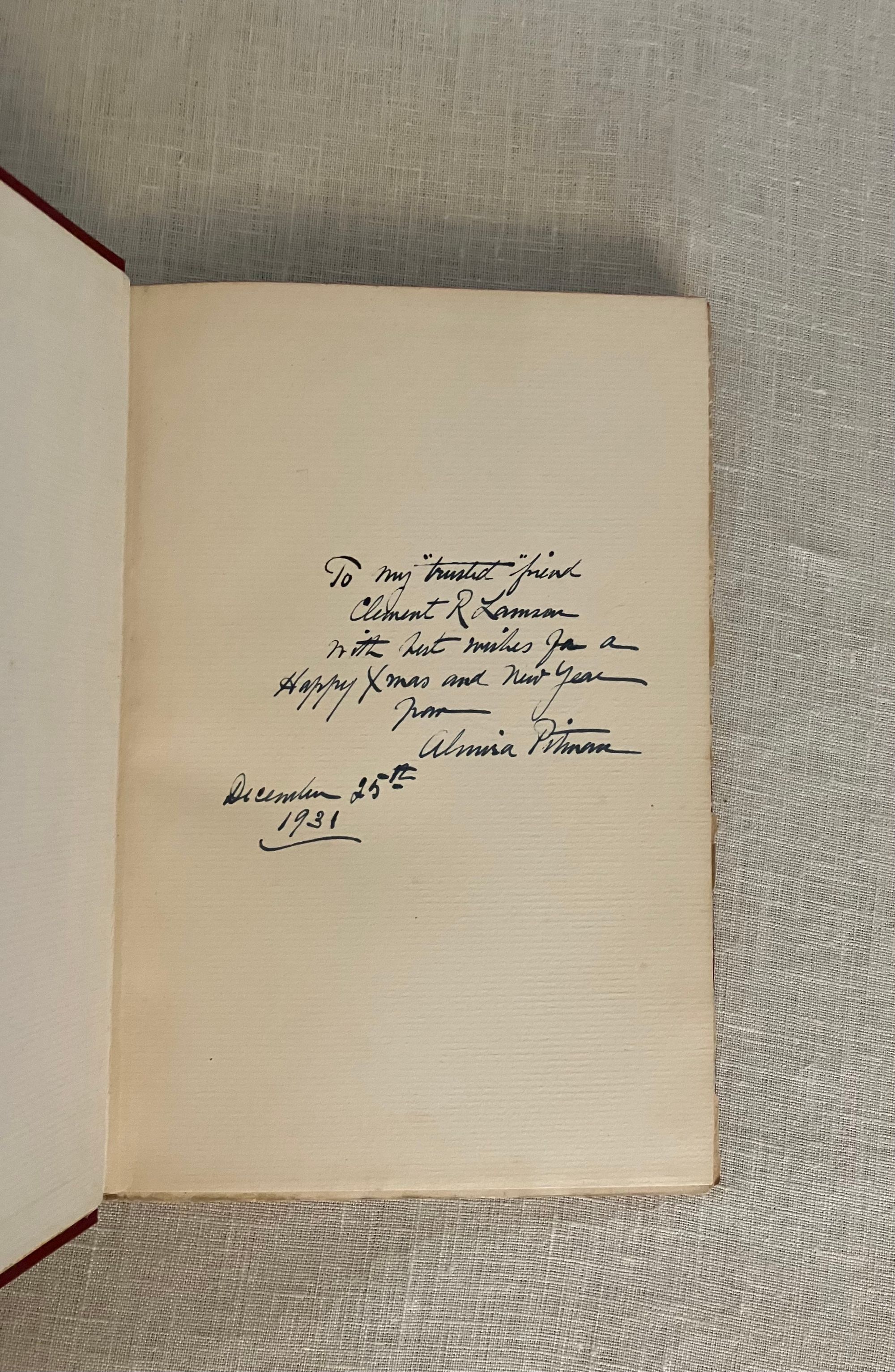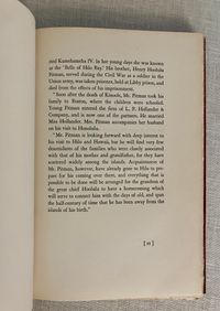 Hard cover, 8vo, in red cloth, gilt with the state symbol of Hawaii to front board, titles in gilt to spine, top edge stained red, with tissue-guarded frontispiece portrait and other black and white reproductions, 167 pp. (The Limited Edition is not numbered.) Condition: Near Fine. One spot to rear board. Inscribed in old ink by the Author on the ffep, dated 1931. One page corner turned and written on in preface in old ink. One pinhead sized rub-through to top edge front board. One plate with small soiling at one edge. Generally very clean. At least one page unopened. **An introductory family genealogy lays out Mr. Pitman's descent, on his mother's side, from a line of Hawaiian chiefs and monarchs dating back hundreds of years. His father, Benjamin Cox Pitman (1815-1888), sailed to Hawaii from Salem, Massachusetts, in the 1820's, first running a chandlery catering to the whaling fleet, establishing the first Volcano House tourist attraction on the cusp of Mount Kīlauae. He married Chiefess Kinóole o Liliha, who possessed feudal right to a great deal of land around Hilo, yielding coffee, arrowroot and sugarcane; Pitman Senior also did well in banking in Honolulu. The Pitman family returned to Boston after Kinoolle's death, whereupon the subject of this book, Benjamin Franklin Pitman would become a director at the L.P. Hollander & Co. department store, founded by his wife's father, in Boston. Some of their upscale womenswear is displayed at the Metropolitan Museum of Art). The story of Pitman's return to the islands as an adult to "take up" his ancestral titles in1917, is told in a series of correspondence by his wife, Almira. The Author, Almira Hollander Pitman (1854-1939) was notable in the woman's suffrage movement both in Boston, and in Hawaii; her influence is cited as instrumental to legislation protecting women's rights in Hawaii, from meetings conducted on this trip. There is much description of the pageants, receptions and Hawaiian customs surrounding the proceedings, and a section on Hawaiian Mythology. **An interesting firsthand account juxtaposing the notion of Hawaiian feudalism and royalty, and the author's influence on the suffragette movement in that State. Provenance: a laid in notice at the rear of book states it once belonged to Emerson Greenaway, (1906-1990), who was Director of the Free Library, Philadelphia and active in a foreign mission to the Soviet Union on behalf of the American Library Association in 1964. OCLC 3703871.