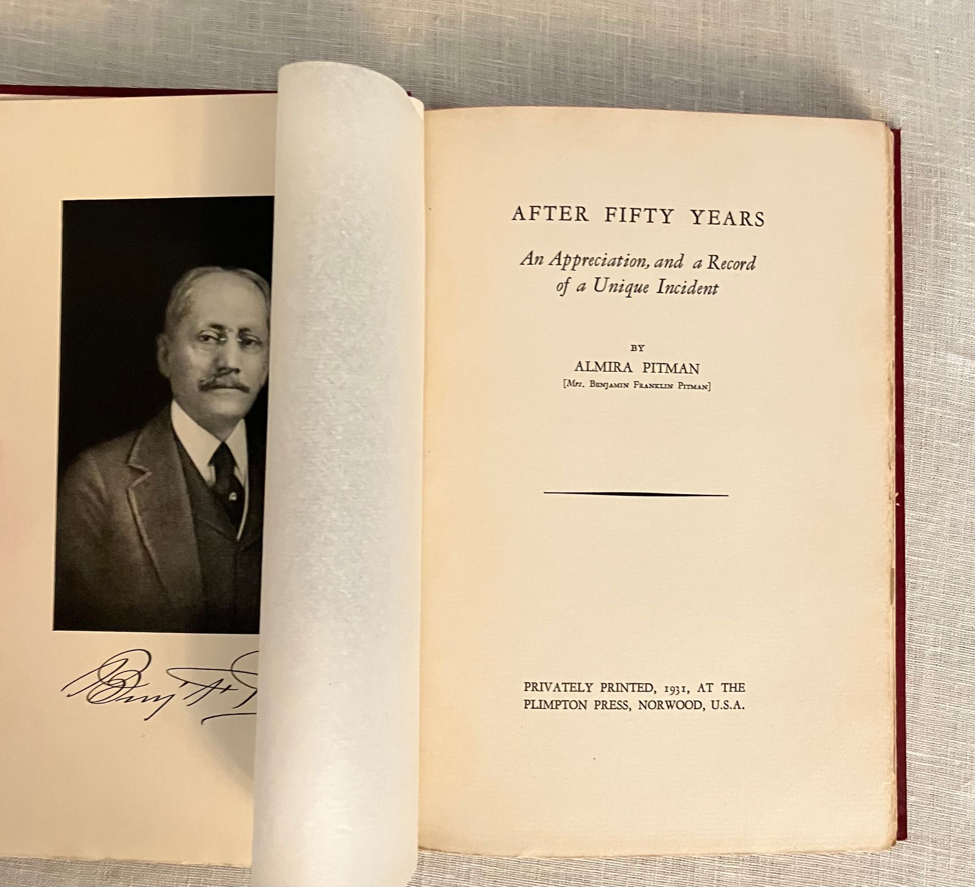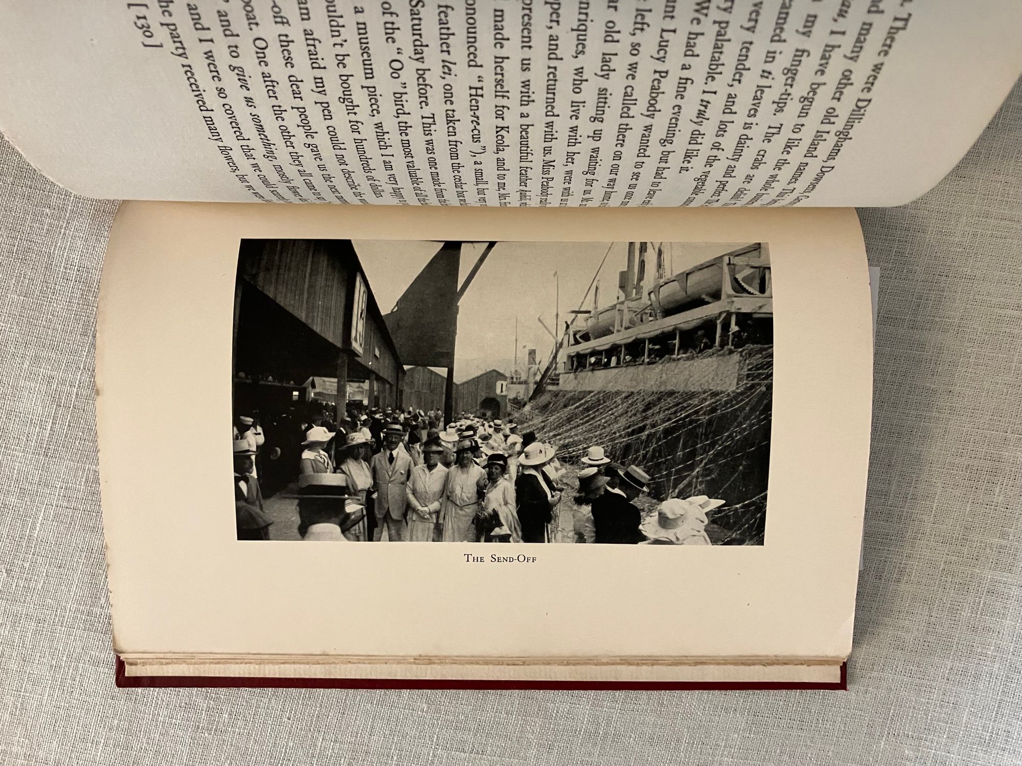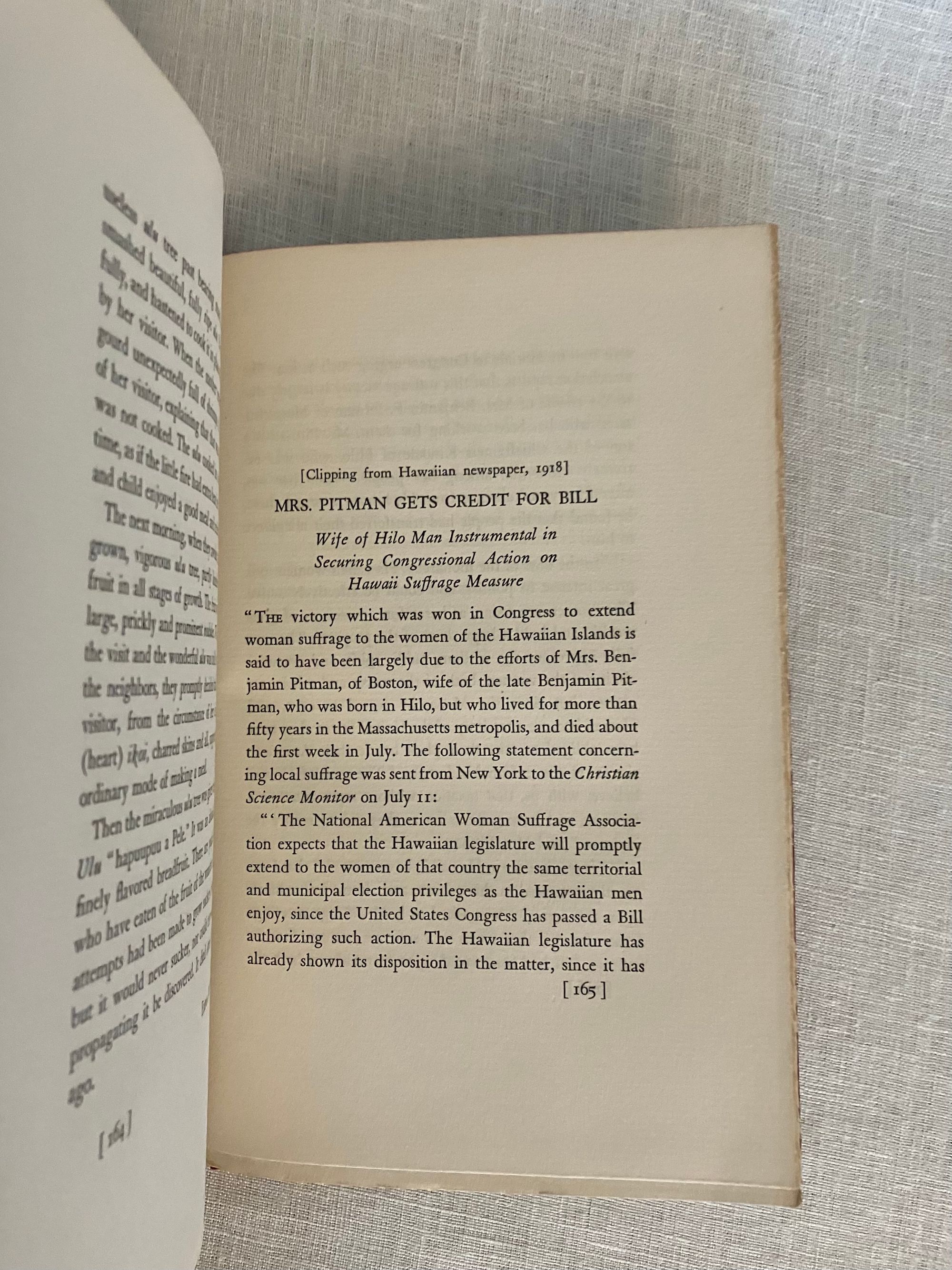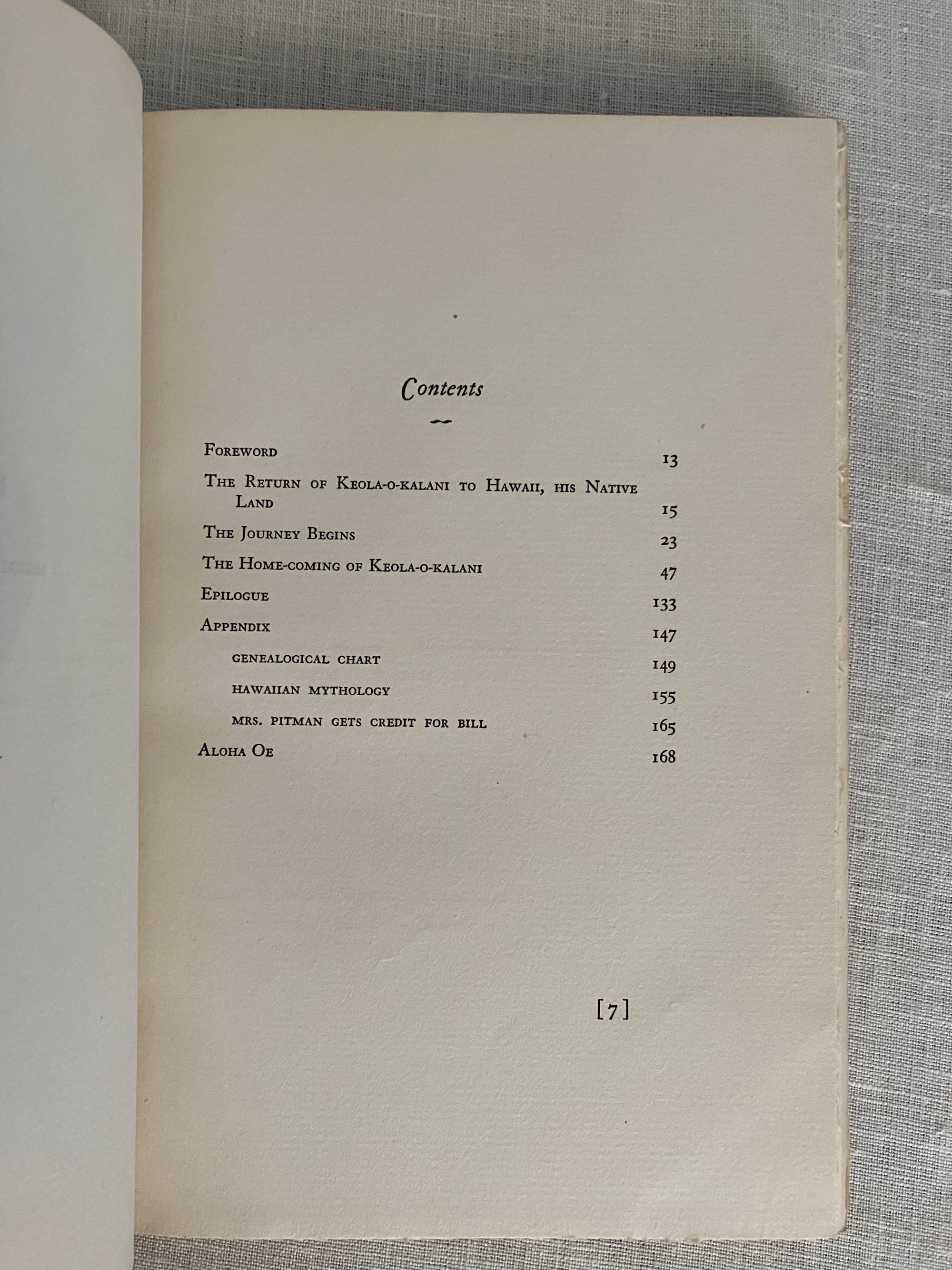 Hard cover, 8vo, in red cloth, gilt with the state symbol of Hawaii to front board, titles in gilt to spine, top edge stained red, with tissue-guarded frontispiece portrait and other black and white reproductions, 167 pp. (The Limited Edition is not numbered.) Condition: Near Fine. One spot to rear board. Inscribed in old ink by the Author on the ffep, dated 1931. One page corner turned and written on in preface in old ink. One pinhead sized rub-through to top edge front board. One plate with small soiling at one edge. Generally very clean. At least one page unopened. **An introductory family genealogy lays out Mr. Pitman's descent, on his mother's side, from a line of Hawaiian chiefs and monarchs dating back hundreds of years. His father, Benjamin Cox Pitman (1815-1888), sailed to Hawaii from Salem, Massachusetts, in the 1820's, first running a chandlery catering to the whaling fleet, establishing the first Volcano House tourist attraction on the cusp of Mount Kīlauae. He married Chiefess Kinóole o Liliha, who possessed feudal right to a great deal of land around Hilo, yielding coffee, arrowroot and sugarcane; Pitman Senior also did well in banking in Honolulu. The Pitman family returned to Boston after Kinoolle's death, whereupon the subject of this book, Benjamin Franklin Pitman would become a director at the L.P. Hollander & Co. department store, founded by his wife's father, in Boston. Some of their upscale womenswear is displayed at the Metropolitan Museum of Art). The story of Pitman's return to the islands as an adult to "take up" his ancestral titles in1917, is told in a series of correspondence by his wife, Almira. The Author, Almira Hollander Pitman (1854-1939) was notable in the woman's suffrage movement both in Boston, and in Hawaii; her influence is cited as instrumental to legislation protecting women's rights in Hawaii, from meetings conducted on this trip. There is much description of the pageants, receptions and Hawaiian customs surrounding the proceedings, and a section on Hawaiian Mythology. **An interesting firsthand account juxtaposing the notion of Hawaiian feudalism and royalty, and the author's influence on the suffragette movement in that State. Provenance: a laid in notice at the rear of book states it once belonged to Emerson Greenaway, (1906-1990), who was Director of the Free Library, Philadelphia and active in a foreign mission to the Soviet Union on behalf of the American Library Association in 1964. OCLC 3703871.