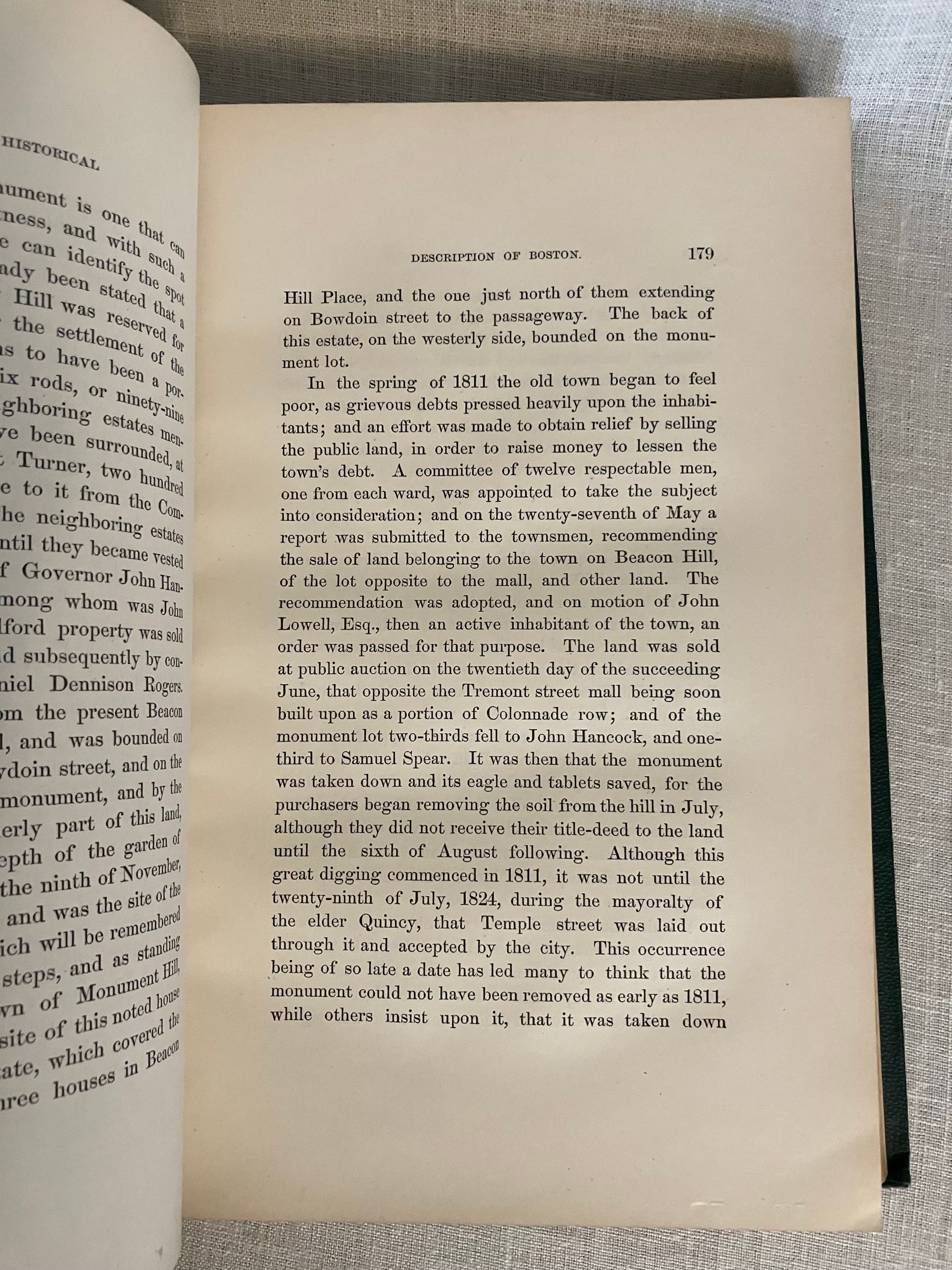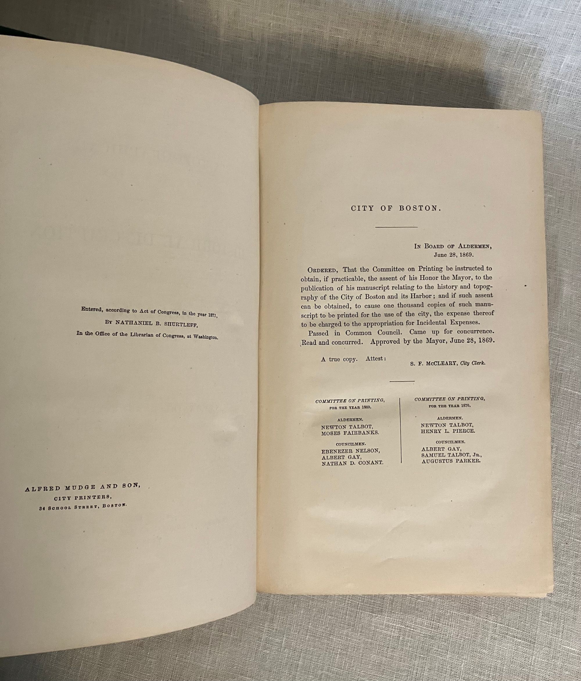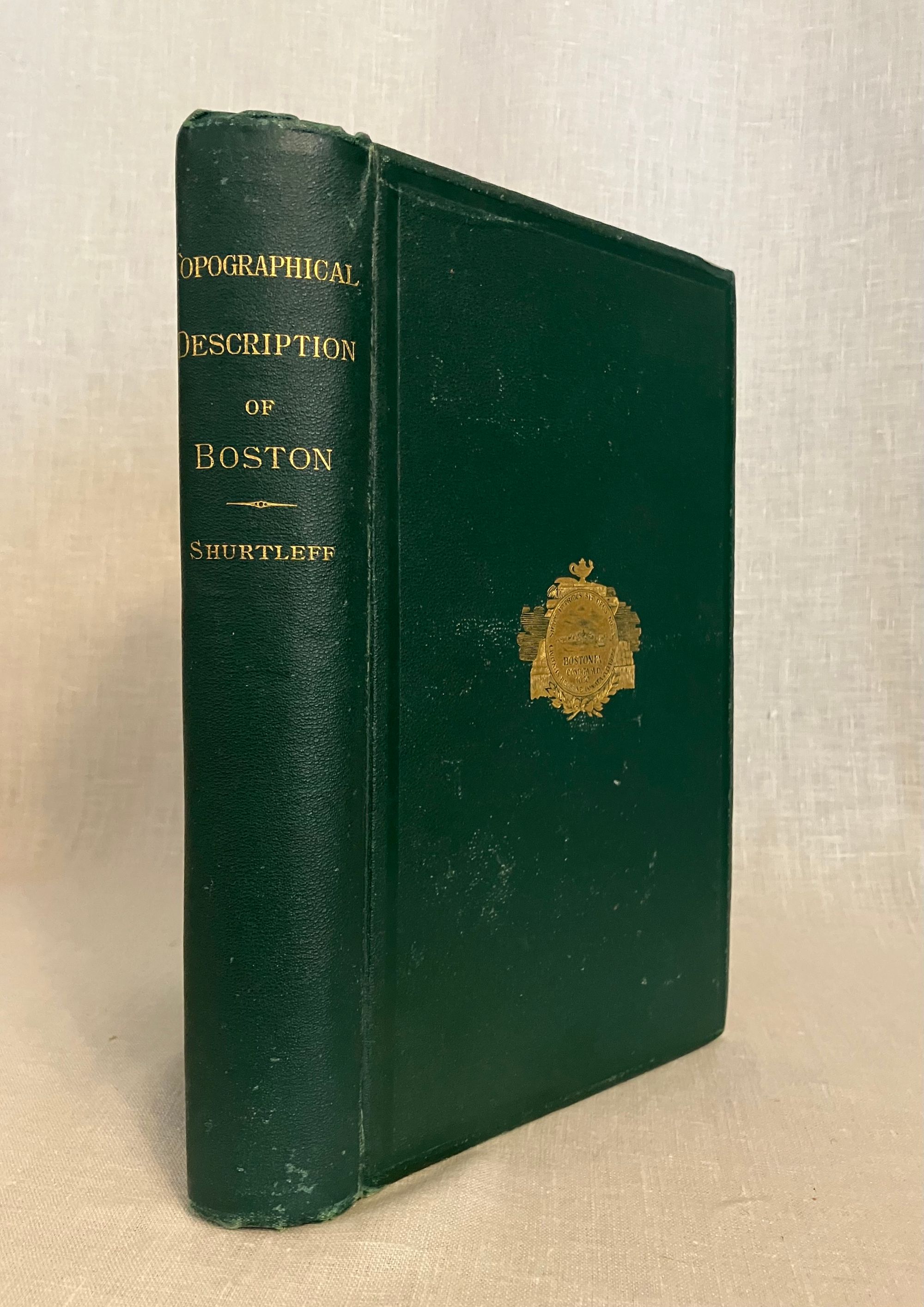 Hard cover, 4to., in pebbled green cloth, with seal of the City of Boston in gilt to front, titles in gilt to spine, 2 preliminary leaves, [iii]-ix, 720 pages, foldout map of Boston Harbor. [Lacking one map.] The original Limitation Statement authorized 1000 copies to be printed by the City Council of the original in 1869; this is a second edition. Printed by Alfred Mudge and Sons, City Printers, Boston. Except for the large fold-out map by Will Burgiss, originally engraved in 1728 and reproduced in 1869, the book has no other illustrations, unlike newer editions of this work. Condition: Very Good Minus. Lacking map. Exterior with some rubbing. Otherwise solid, clean and moderately age-toned. Author Nathaniel Bradstreet Shurtleff (1810-1874) was briefly Mayor of Boston from 1868-1870. (He is described in the City of Boston Archives as more of an accomplished antiquarian than mayor.) Trained as a physician, he was a member of "countless historical societies." The book contains a well-researched, thoroughly detailed look at the earliest origins of Boston, the political and physical changes which shaped the lives of the inhabitants of one of America's oldest cities. OCLC 4422090