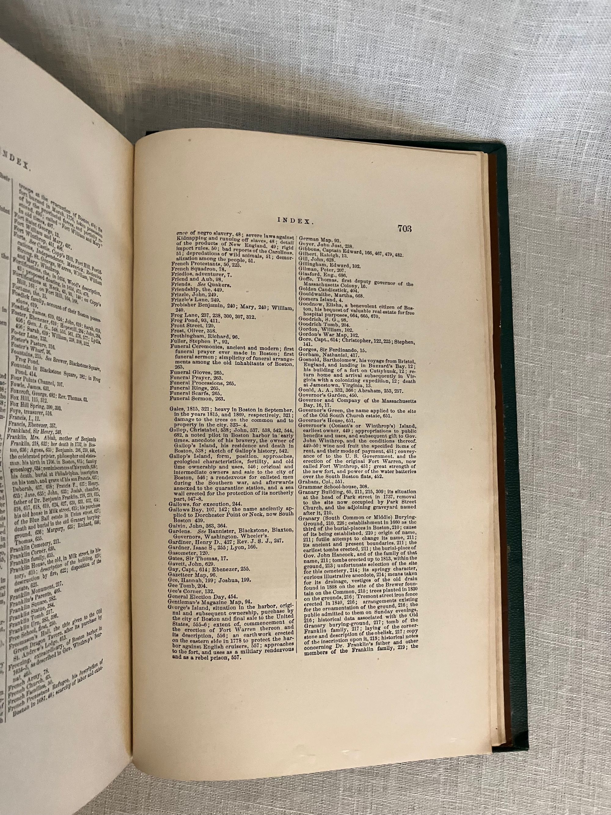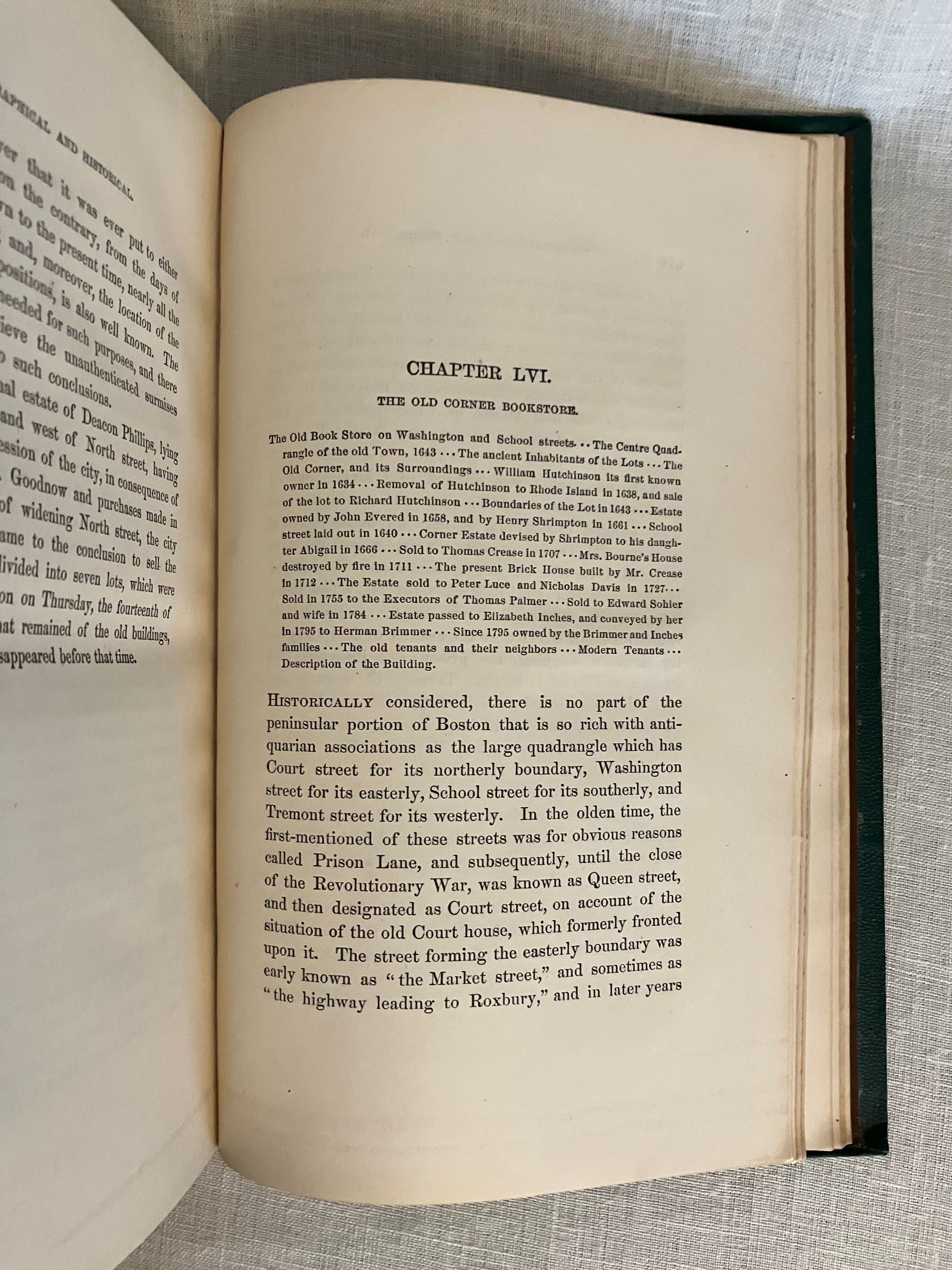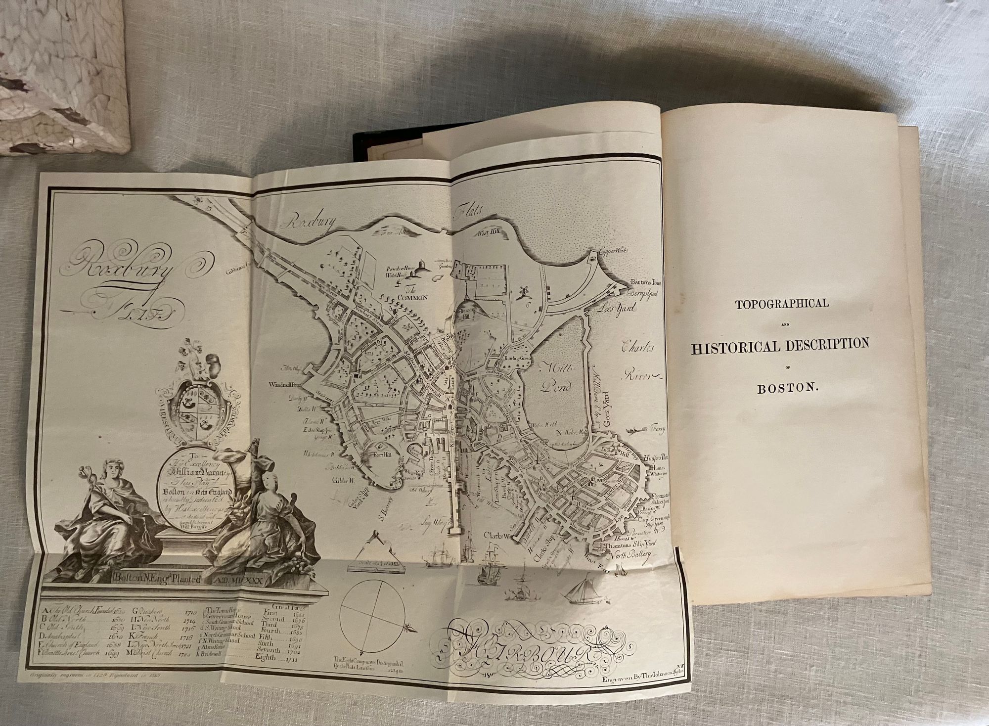 Hard cover, 4to., in pebbled green cloth, with seal of the City of Boston in gilt to front, titles in gilt to spine, 2 preliminary leaves, [iii]-ix, 720 pages, foldout map of Boston Harbor. [Lacking one map.] The original Limitation Statement authorized 1000 copies to be printed by the City Council of the original in 1869; this is a second edition. Printed by Alfred Mudge and Sons, City Printers, Boston. Except for the large fold-out map by Will Burgiss, originally engraved in 1728 and reproduced in 1869, the book has no other illustrations, unlike newer editions of this work. Condition: Very Good Minus. Lacking map. Exterior with some rubbing. Otherwise solid, clean and moderately age-toned. Author Nathaniel Bradstreet Shurtleff (1810-1874) was briefly Mayor of Boston from 1868-1870. (He is described in the City of Boston Archives as more of an accomplished antiquarian than mayor.) Trained as a physician, he was a member of "countless historical societies." The book contains a well-researched, thoroughly detailed look at the earliest origins of Boston, the political and physical changes which shaped the lives of the inhabitants of one of America's oldest cities. OCLC 4422090