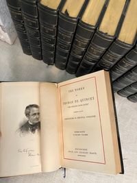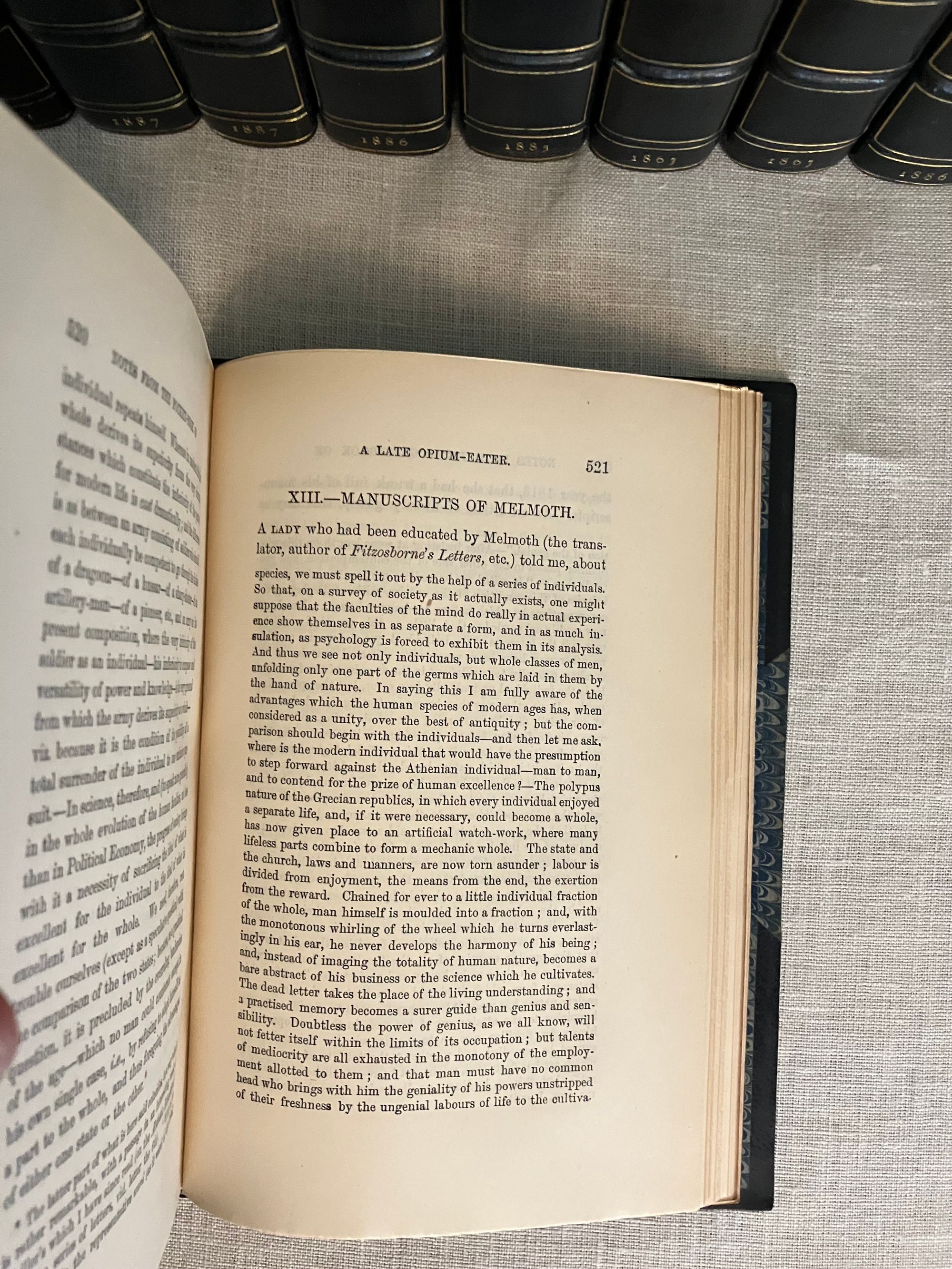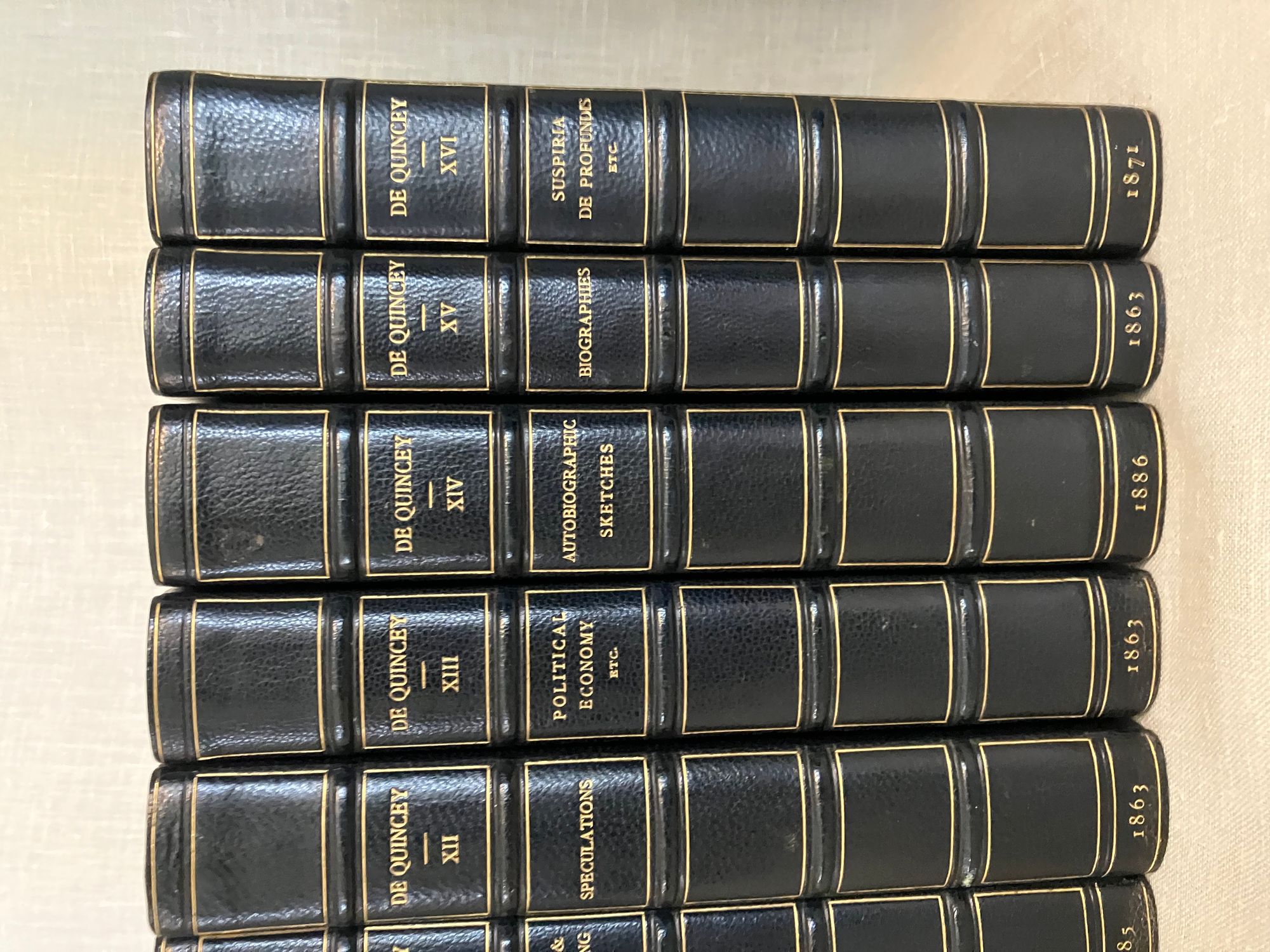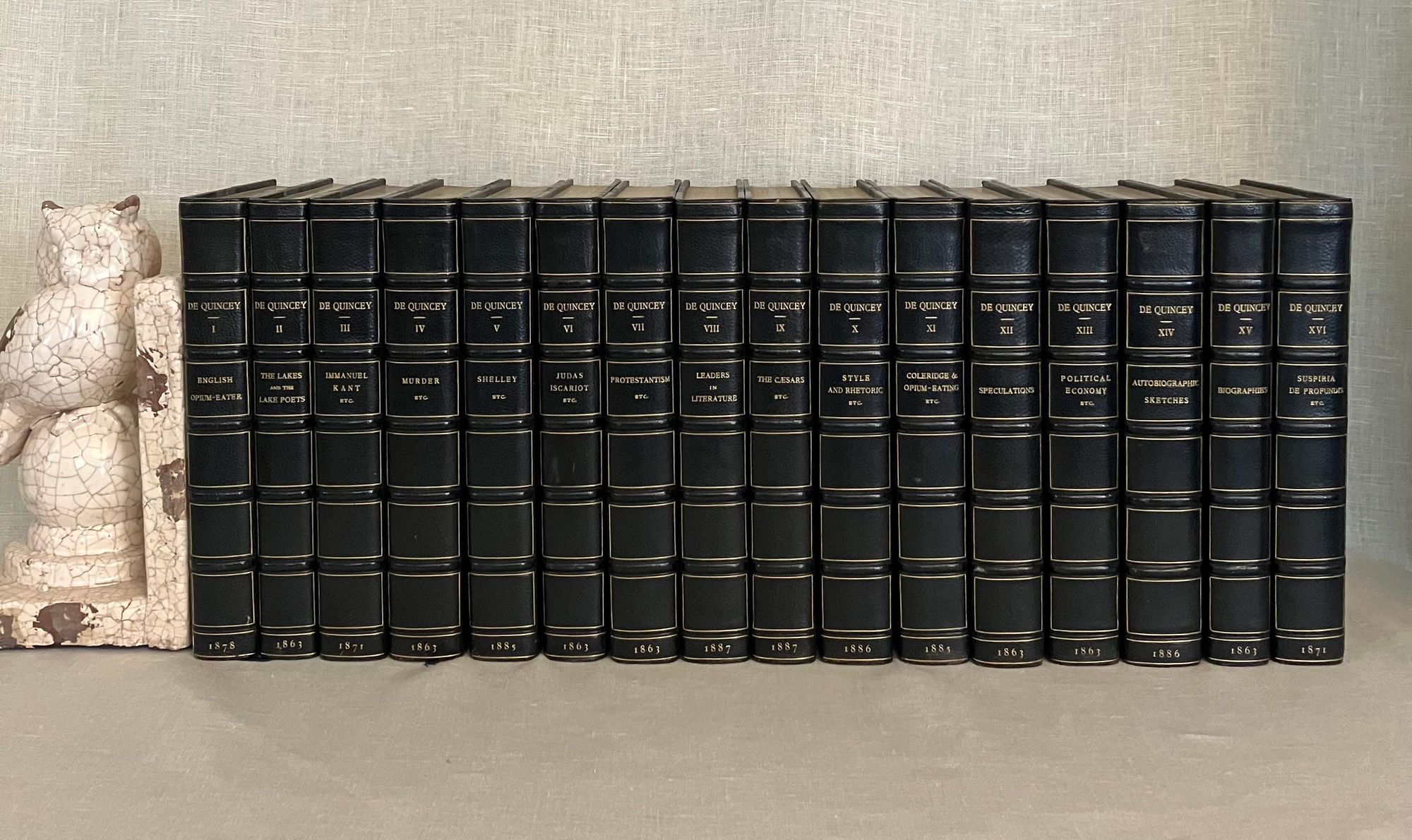 Hardcover, 16 volumes dated 1863-1886. 8vo, finely bound by Bumpus of London in three-quarter navy morocco with with 5 raised bands and gold lettering to spines. Condition: Almost Fine, with some very light shelf-wear, with a small scratch to volume one, and some tiny chips to the board edges. *** Thomas De Quincey (1785-1859) was the quintessential man of letters - visitors would describe his rooms as being strewn with papers and books. He was friends with the Lake Poets, Samuel Taylor Coleridge and William Wordsworth, and enjoyed instant popularity with the magazine publication of his "Confessions of an English Opium Eater" in 1821. *** Contents include "Confessions of an English Opium Eater", his widely praised essay on Shakespeare, "On the Knocking at the Gate in Macbeth" (1823), and his opium-inspired dreamscapes in "The English Mail-Coach" (1849). *** De Quincey recalls in his "Confessions" his escape from an English public school, his subsequent wanderings around Wales (where he intended to write about his travels) and his poverty in London. He feared being sent back to school if his guardians caught up with him, so scraped a living by squatting in an empty house, keeping company with other lost souls in the anonymity of the city. He finally left London for Oxford University, after the intervention of friends who chanced upon him. As a scholar, he excelled, especially in Greek. However, headaches brought about by washing his head in cold water before going to bed induced De Quincey to try opium, which he obtained easily from a pharmacy. He relates in the "Confessions" how this transformed not just his pain, but his intellectual outlook. This autobiography describes his addictions, first to wine and then opium. He talked about taking both as a remedy for his stomach pains, brought about perhaps by his "Down and Out" experiences in London, or perhaps as a result of his dislike of the English "public school" to which his guardians had sent him. The opium-induced dreams De Quincey describes in detail are, like those of H.P. Lovecraft and Clark Ashton Smith, both fantastical and edged with horror. De Quincey elaborated on this theme in what some consider his masterpiece, "The English Mail-Coach". *** Provenance: From the library of Annie Pearson, Viscountess Cowdray, with her bookplate to front pastedowns. Lady Cowdray (1860-1932) was a noted feminist and President of the Women's Liberal Federation. She was also an early member and supporter of the Women's Engineering Society. *** Bibliography: Watson III, 1239. *** Weight: 19.0 lb