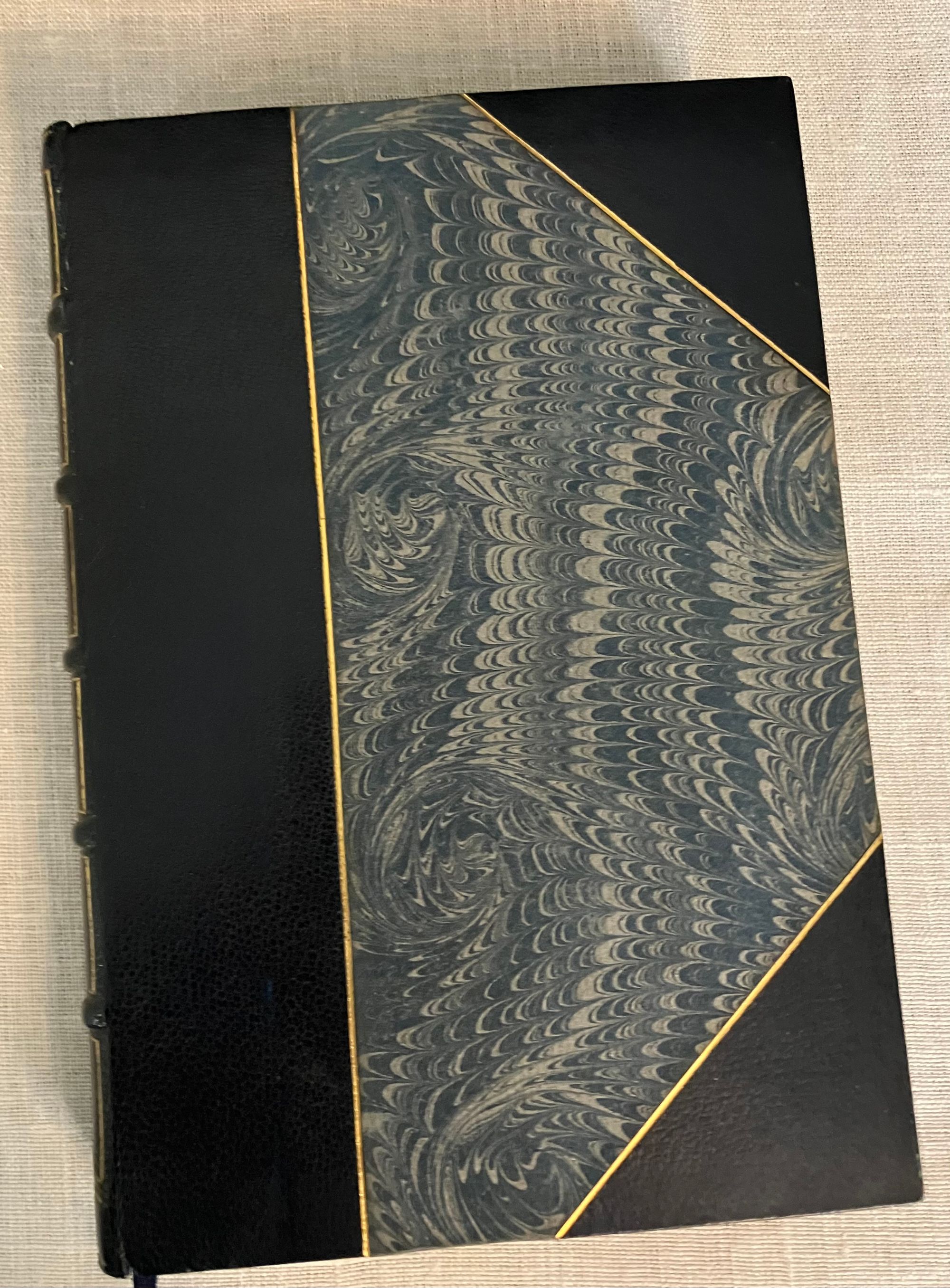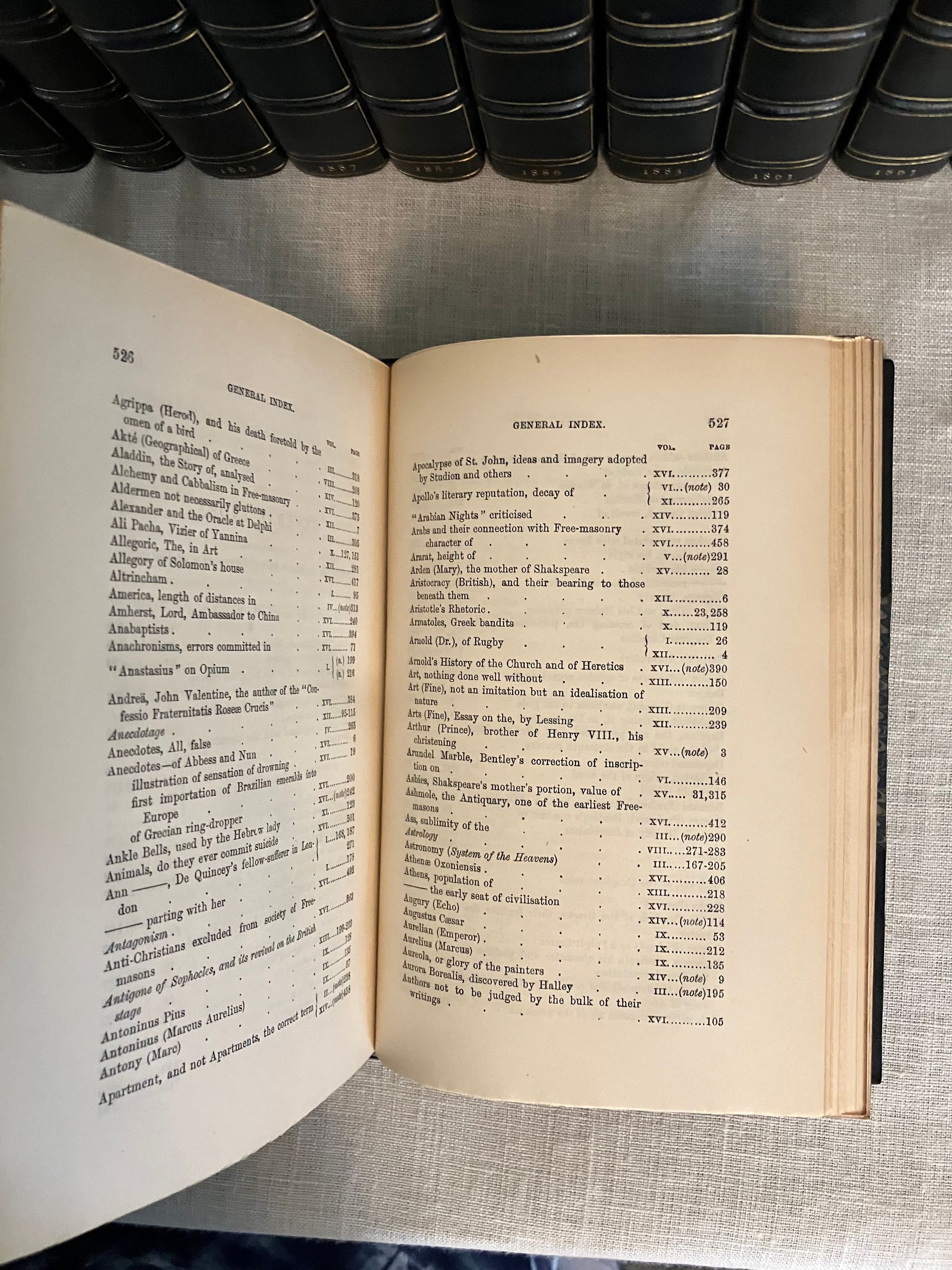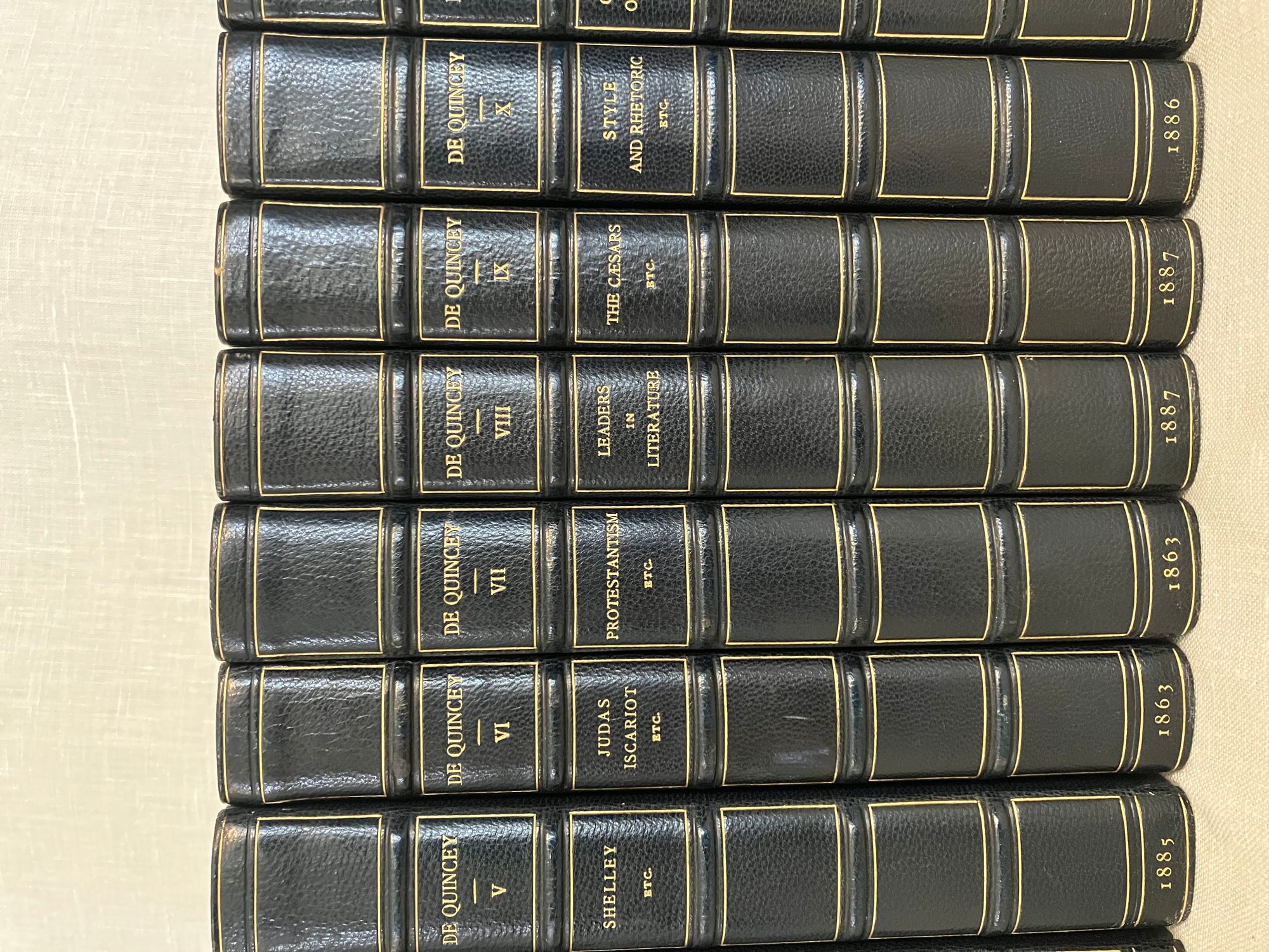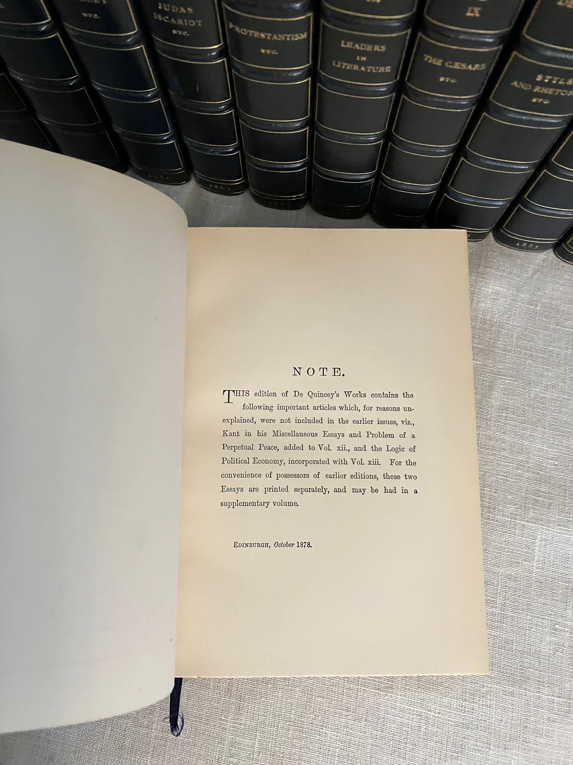 Hardcover, 16 volumes dated 1863-1886. 8vo, finely bound by Bumpus of London in three-quarter navy morocco with with 5 raised bands and gold lettering to spines. Condition: Almost Fine, with some very light shelf-wear, with a small scratch to volume one, and some tiny chips to the board edges. *** Thomas De Quincey (1785-1859) was the quintessential man of letters - visitors would describe his rooms as being strewn with papers and books. He was friends with the Lake Poets, Samuel Taylor Coleridge and William Wordsworth, and enjoyed instant popularity with the magazine publication of his "Confessions of an English Opium Eater" in 1821. *** Contents include "Confessions of an English Opium Eater", his widely praised essay on Shakespeare, "On the Knocking at the Gate in Macbeth" (1823), and his opium-inspired dreamscapes in "The English Mail-Coach" (1849). *** De Quincey recalls in his "Confessions" his escape from an English public school, his subsequent wanderings around Wales (where he intended to write about his travels) and his poverty in London. He feared being sent back to school if his guardians caught up with him, so scraped a living by squatting in an empty house, keeping company with other lost souls in the anonymity of the city. He finally left London for Oxford University, after the intervention of friends who chanced upon him. As a scholar, he excelled, especially in Greek. However, headaches brought about by washing his head in cold water before going to bed induced De Quincey to try opium, which he obtained easily from a pharmacy. He relates in the "Confessions" how this transformed not just his pain, but his intellectual outlook. This autobiography describes his addictions, first to wine and then opium. He talked about taking both as a remedy for his stomach pains, brought about perhaps by his "Down and Out" experiences in London, or perhaps as a result of his dislike of the English "public school" to which his guardians had sent him. The opium-induced dreams De Quincey describes in detail are, like those of H.P. Lovecraft and Clark Ashton Smith, both fantastical and edged with horror. De Quincey elaborated on this theme in what some consider his masterpiece, "The English Mail-Coach". *** Provenance: From the library of Annie Pearson, Viscountess Cowdray, with her bookplate to front pastedowns. Lady Cowdray (1860-1932) was a noted feminist and President of the Women's Liberal Federation. She was also an early member and supporter of the Women's Engineering Society. *** Bibliography: Watson III, 1239. *** Weight: 19.0 lb