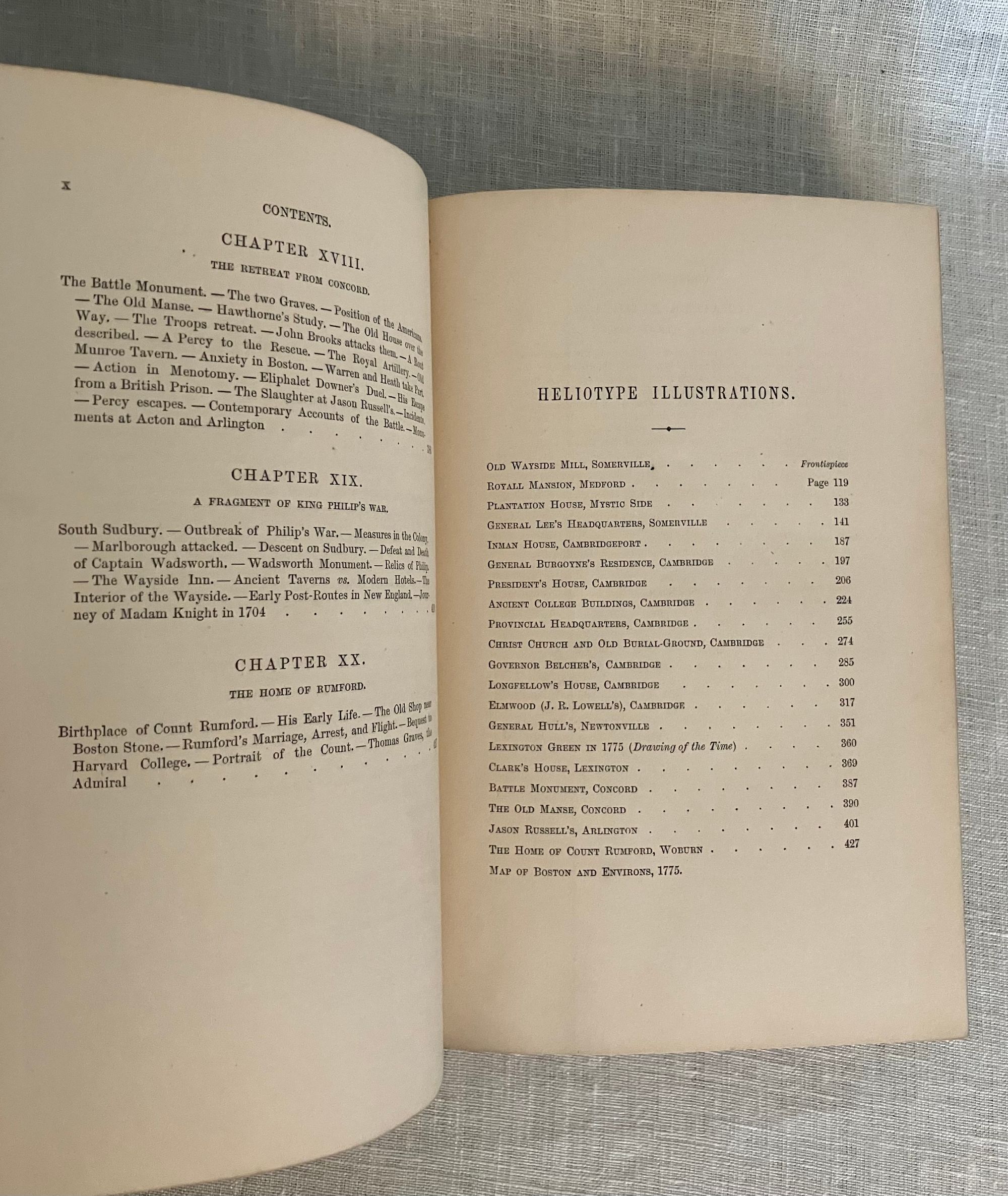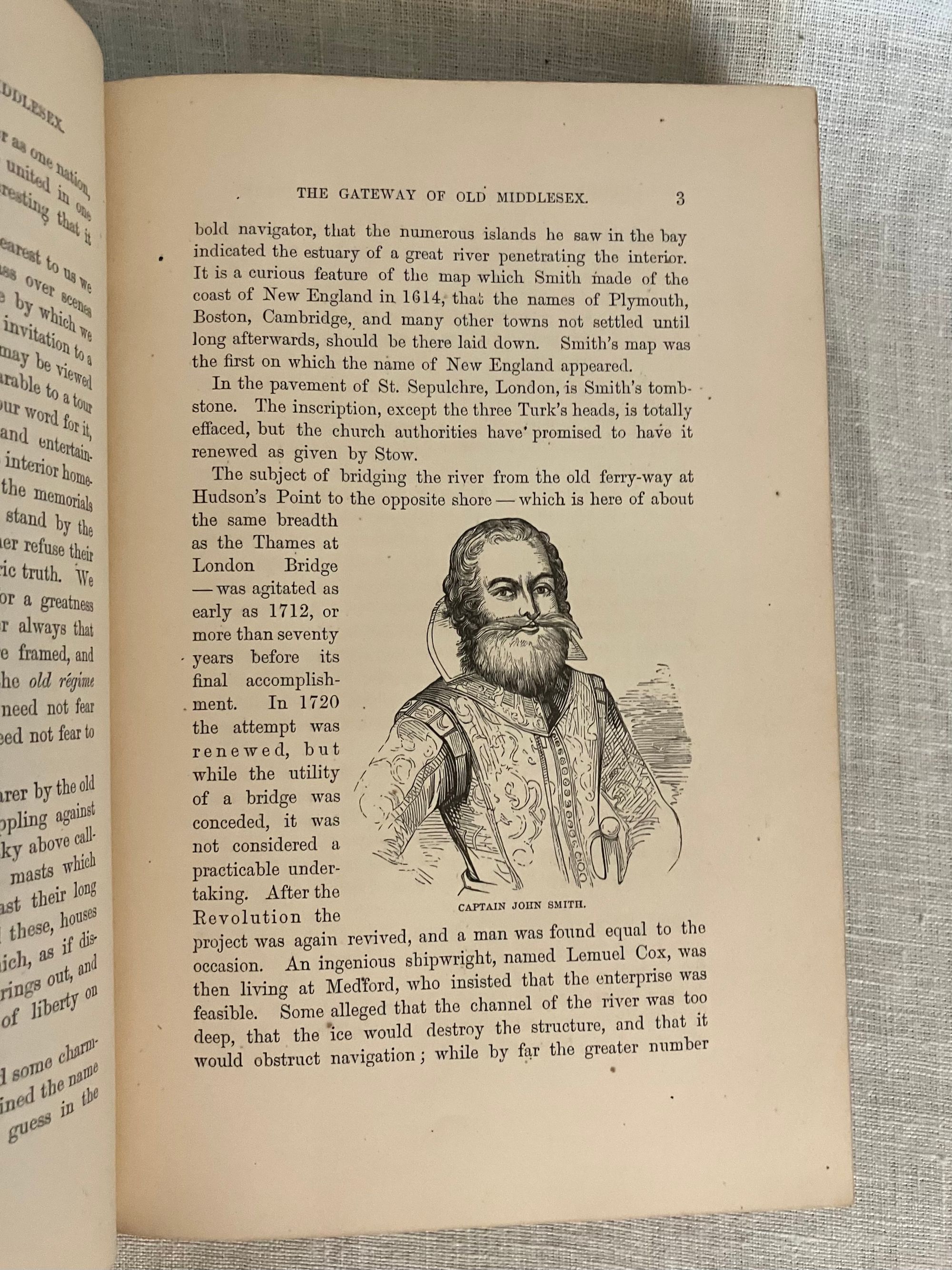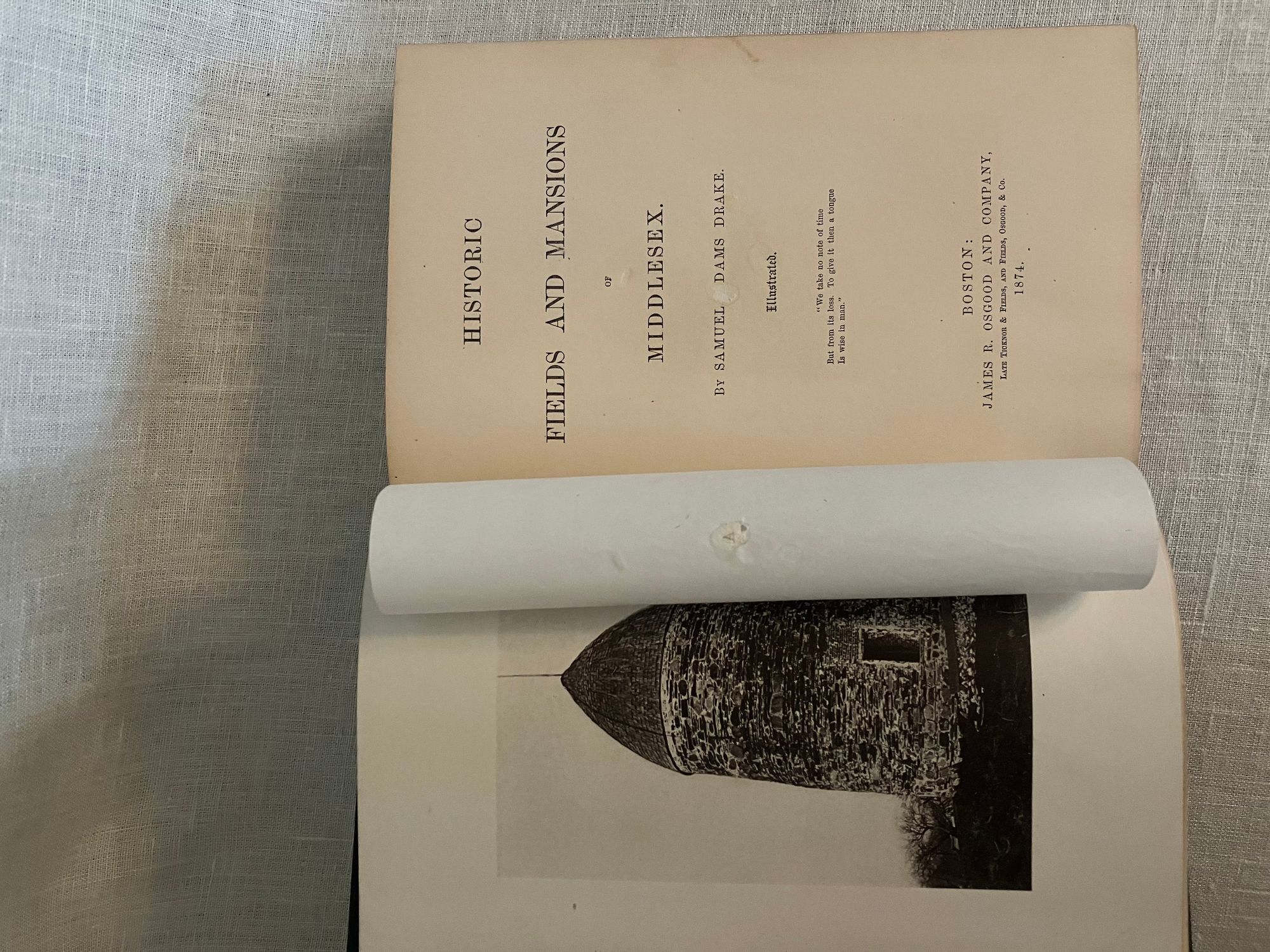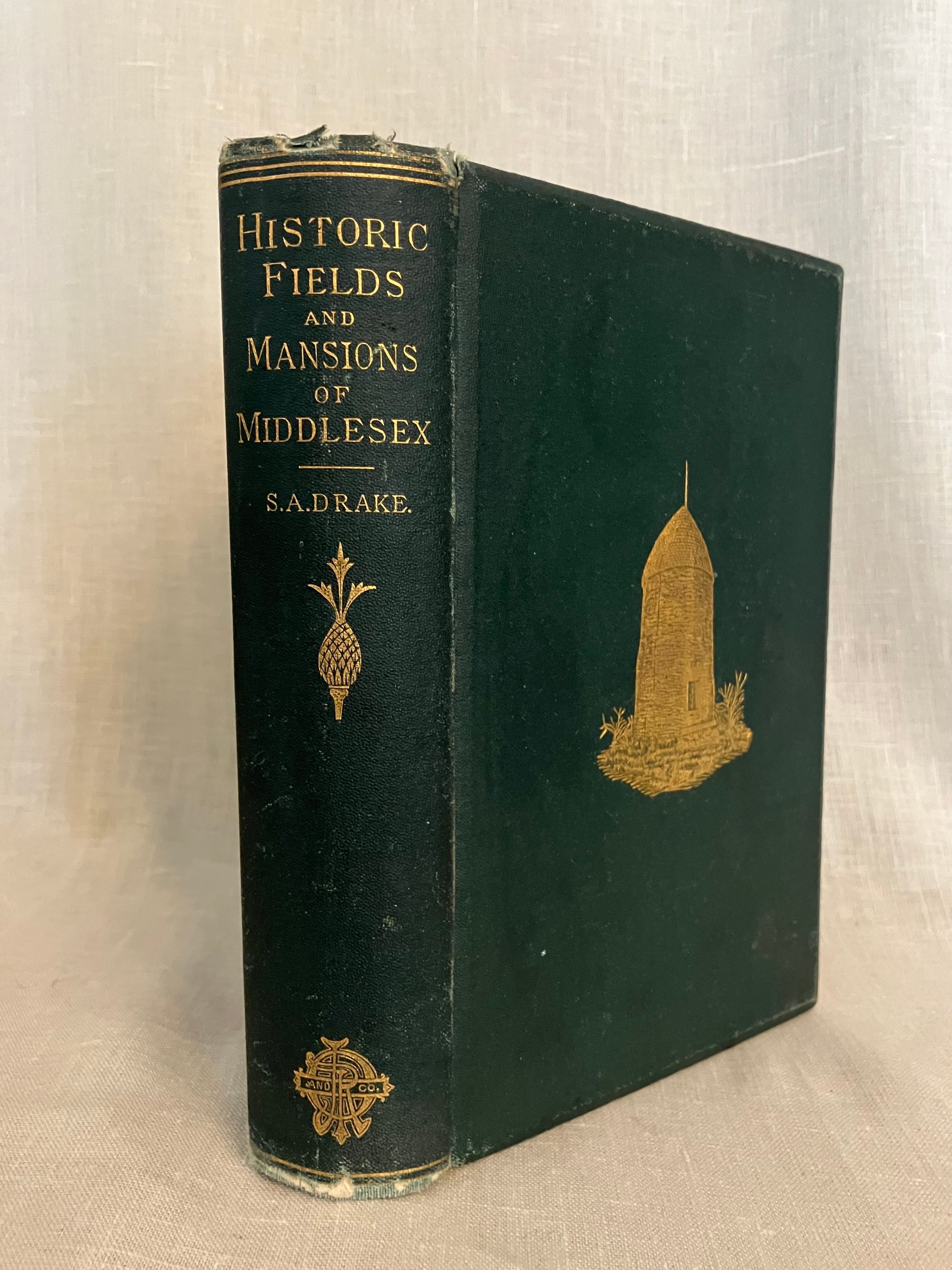Hard cover, 8vo, (measuring 5 x 8 inches ) in green cloth, bevelled edged boards, with gilt illustration to front board, titles and publisher's logo to the spine in gilt. Top edge gilt, glazed brown end papers, (xiv), fold-out map unnumbered, 442pp. Condition: Very Good Minus. Shelfwear with moderate fraying to head and tail of spine. Slightly shaken, otherwise clean and gently age toned. Now in mylar. Old gift inscription in pencil to ffep dated 1924. ** The Author, Samuel Adams Drake (1833-1905), presents this as a "wandering" set of essays touching on interesting people, places and happenings in old Middlesex County, in the Boston, Massachusetts area. He worked as a journalist and published twenty three books. His better-known father, Samuel G. Drake, also was a notable author of Americana. This book contains early examples of the heliotype--" a printing process in which an impression is taken in ink from a gelatine surface that has been exposed under a negative and prepared for printing." There are 20 unnumbered, tissue-guarded leaves of such plates, plus the map, in this volume, as well as traditional engravings. WorldCat says this is only the third heliotype book published in the US. by Osgood (Hanson). OCLC 2859336. Scarce.