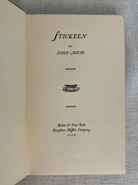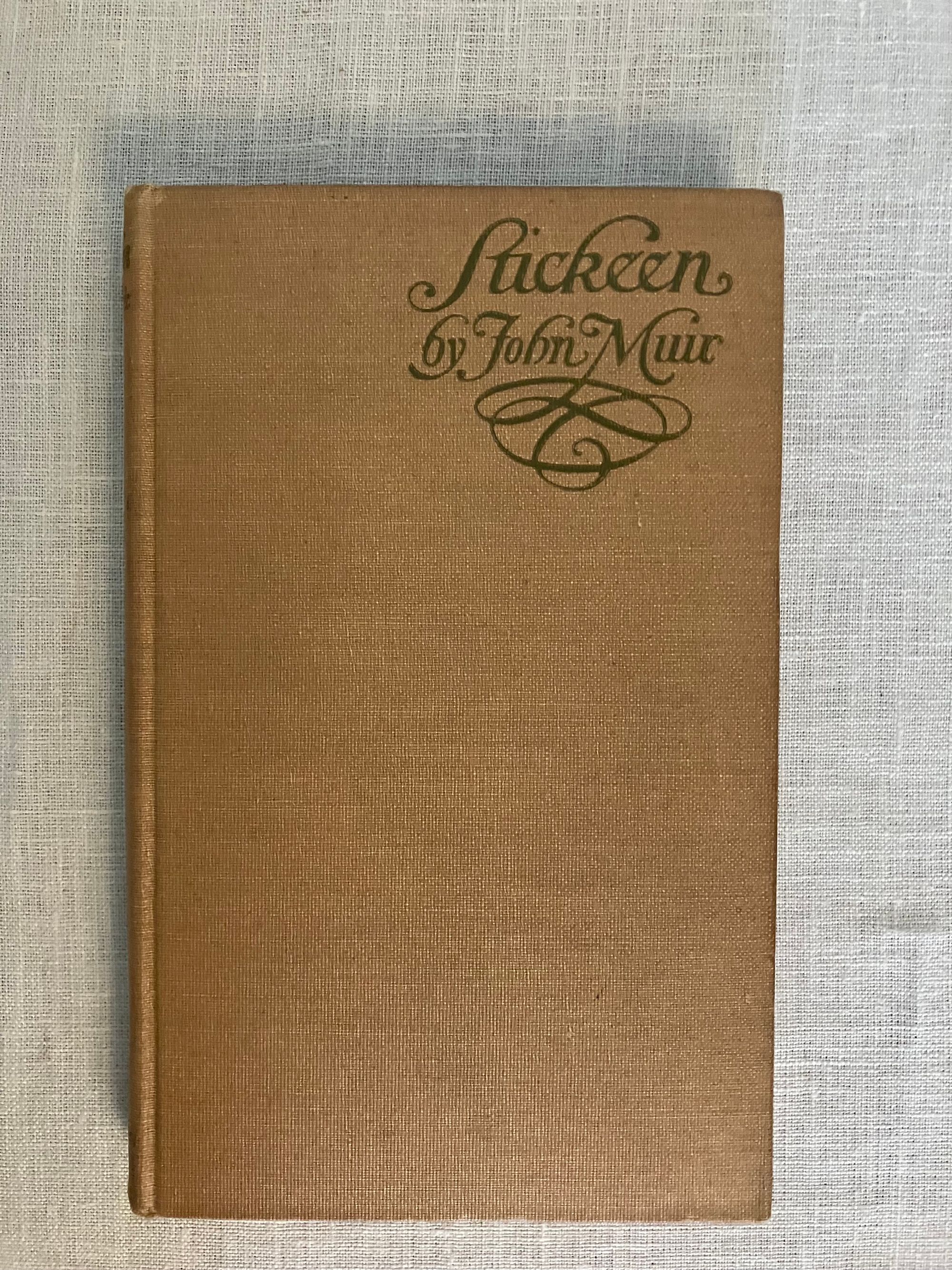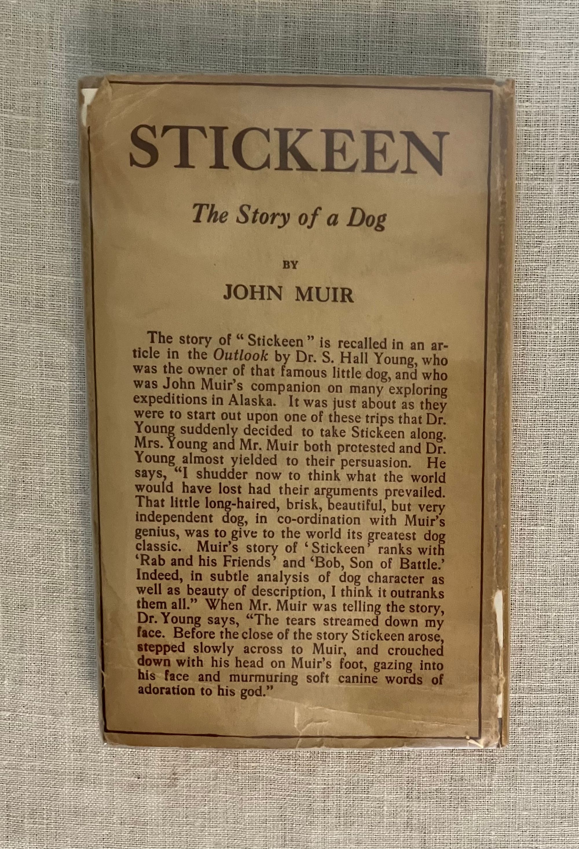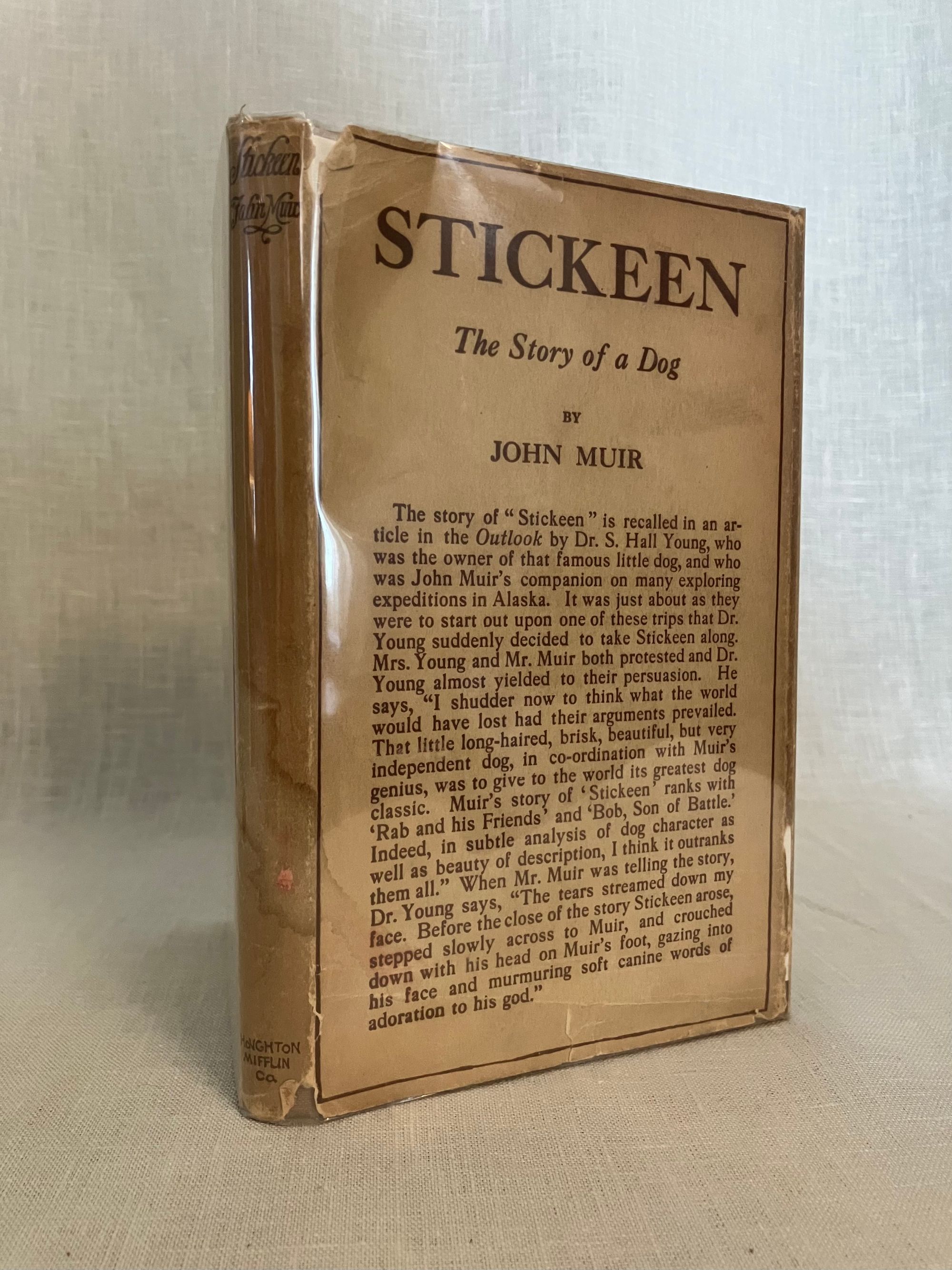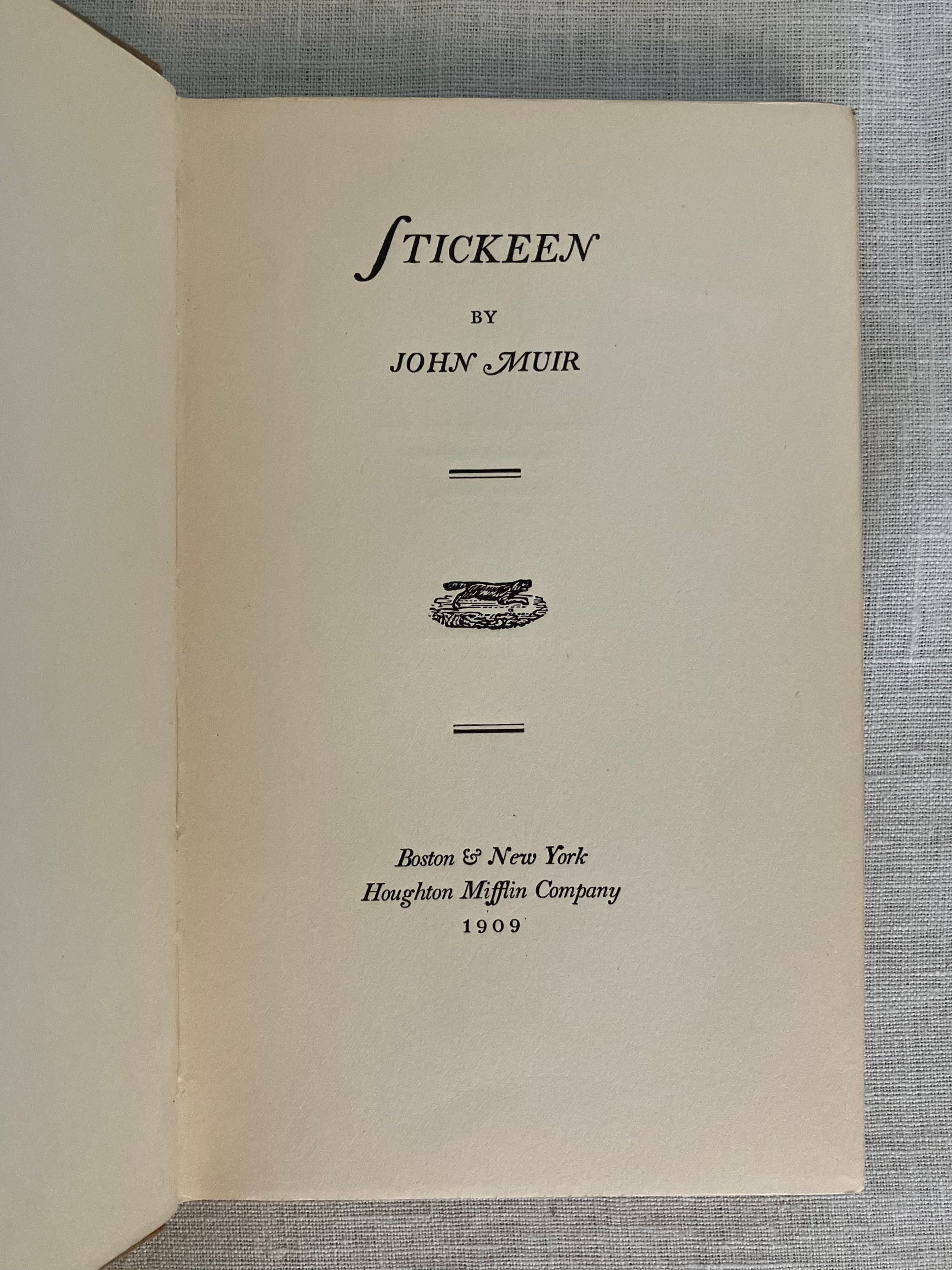 First Edition, sixth impression, stated. Hard Cover, 12 mo, (4 3/4 x 7 1/2 inches), in tan cloth, titles to front and spine in olive green, 73pp., in the original, unclipped, dust jacket, in mylar. Typography design by famed American print designer, Bruce Rogers (1870-1957). CONDITION: Very Good. Exterior with minuscule small marks, very minor crimping to head and tail of spine, one lightly frayed corner. Top edge dusty. Pages are lightly toned, with adjacent rectangles of browning affecting the copyright and dedication pages, as seen in photos. One loose signature re-glued. D/j is Very Good, albeit with a frayed and soiled fore edge, few fold lines and a couple of open tears and chips at edges. Stain on spine d/j. Rare with the dust jacket, however.** "Stickeen" is the true story of a little dog who heroically accompanies Author John Muir and his companion, Dr. S. Hall Young, on a number of explorations of Alaskan glaciers in the 1880's. It is considered a Classic Dog Story, and written for a young audience. This issue has no illustrations.** Author John Muir (1838-1914), lived the majority of his life and legacy in America, where he is famous as the forefather of environmental conservation, a strong voice behind creation of the National Parks, appreciation of the wilderness, and founder of the Sierra Club. These booksellers must note, however, that he was born in Scotland in the coastal village of Dunbar, East Lothian, a fishing village, south of Edinburgh to which we have travelled many times. A John Muir Museum is found there at his birthplace on the High Street. Warde & Haas, A Bruce Rogers Bibliography, No. 84., p.31 (Kennikat Press, 1968).