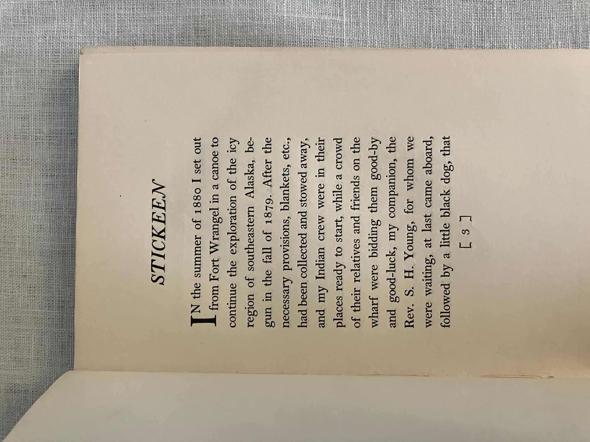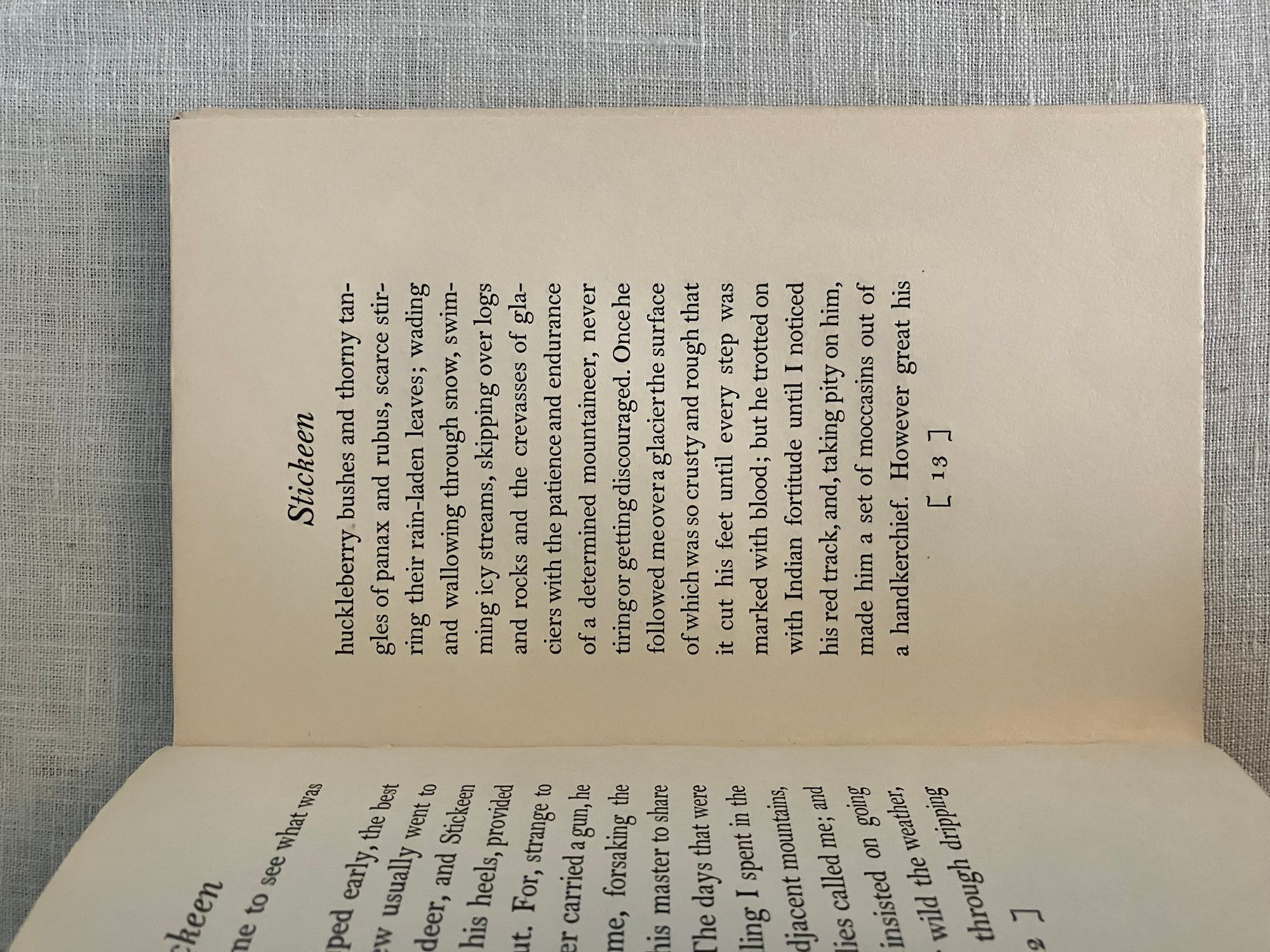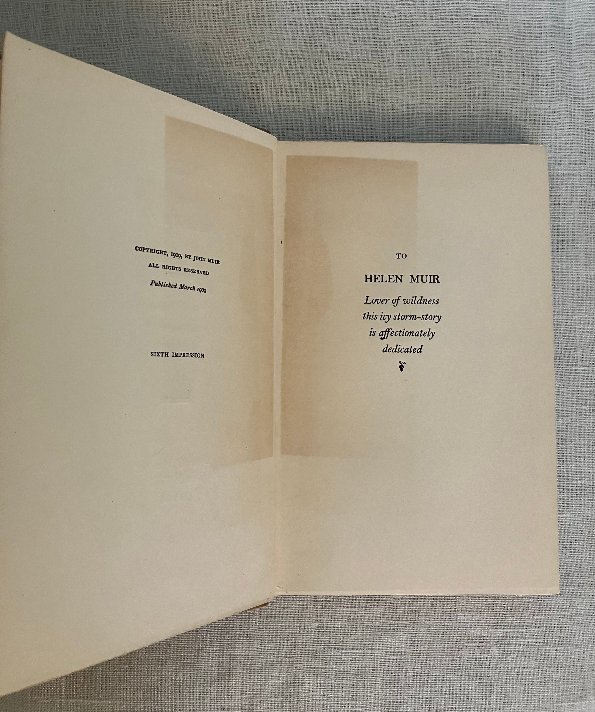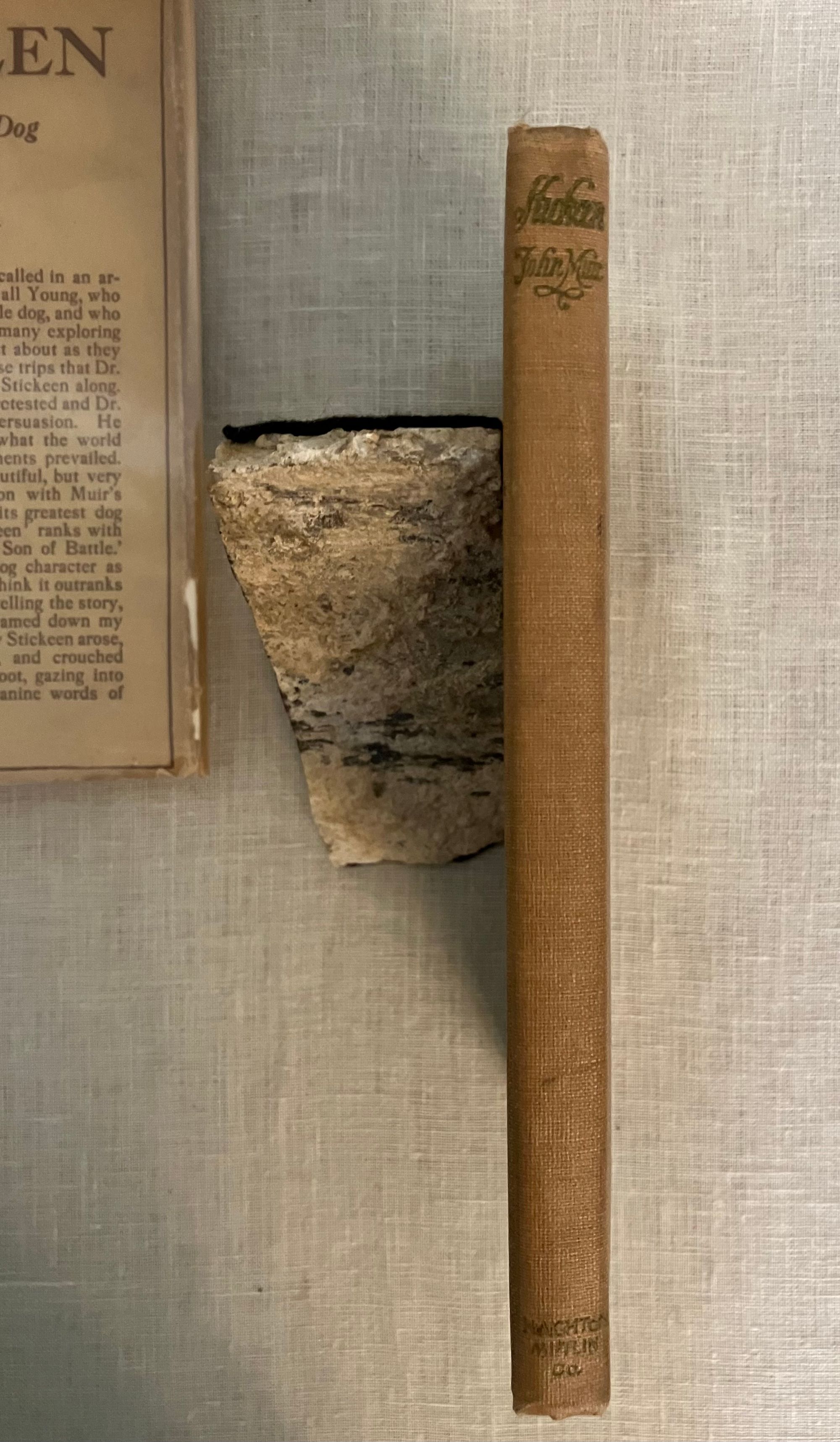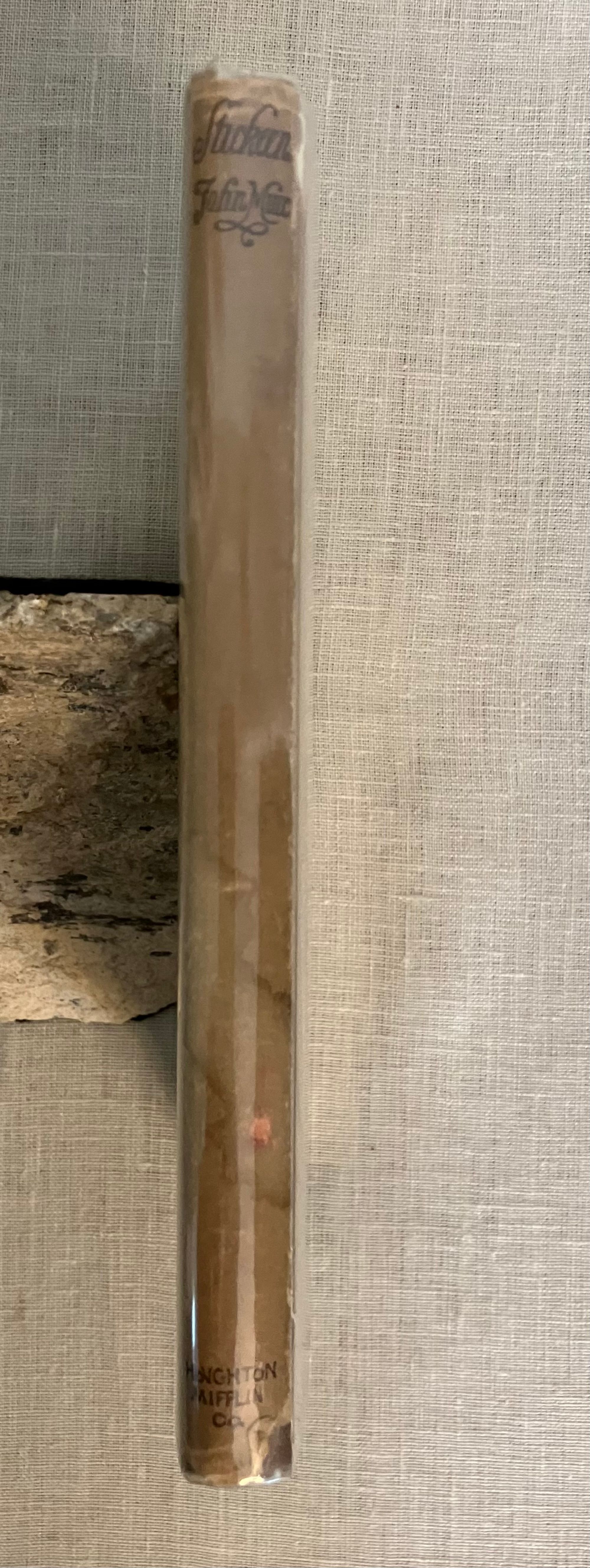 First Edition, sixth impression, stated. Hard Cover, 12 mo, (4 3/4 x 7 1/2 inches), in tan cloth, titles to front and spine in olive green, 73pp., in the original, unclipped, dust jacket, in mylar. Typography design by famed American print designer, Bruce Rogers (1870-1957). CONDITION: Very Good. Exterior with minuscule small marks, very minor crimping to head and tail of spine, one lightly frayed corner. Top edge dusty. Pages are lightly toned, with adjacent rectangles of browning affecting the copyright and dedication pages, as seen in photos. One loose signature re-glued. D/j is Very Good, albeit with a frayed and soiled fore edge, few fold lines and a couple of open tears and chips at edges. Stain on spine d/j. Rare with the dust jacket, however.** "Stickeen" is the true story of a little dog who heroically accompanies Author John Muir and his companion, Dr. S. Hall Young, on a number of explorations of Alaskan glaciers in the 1880's. It is considered a Classic Dog Story, and written for a young audience. This issue has no illustrations.** Author John Muir (1838-1914), lived the majority of his life and legacy in America, where he is famous as the forefather of environmental conservation, a strong voice behind creation of the National Parks, appreciation of the wilderness, and founder of the Sierra Club. These booksellers must note, however, that he was born in Scotland in the coastal village of Dunbar, East Lothian, a fishing village, south of Edinburgh to which we have travelled many times. A John Muir Museum is found there at his birthplace on the High Street. Warde & Haas, A Bruce Rogers Bibliography, No. 84., p.31 (Kennikat Press, 1968).
