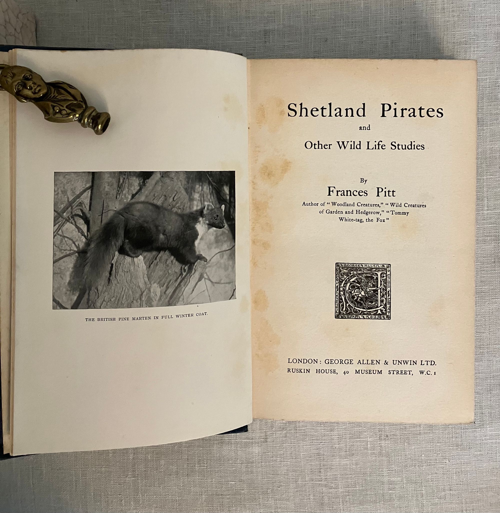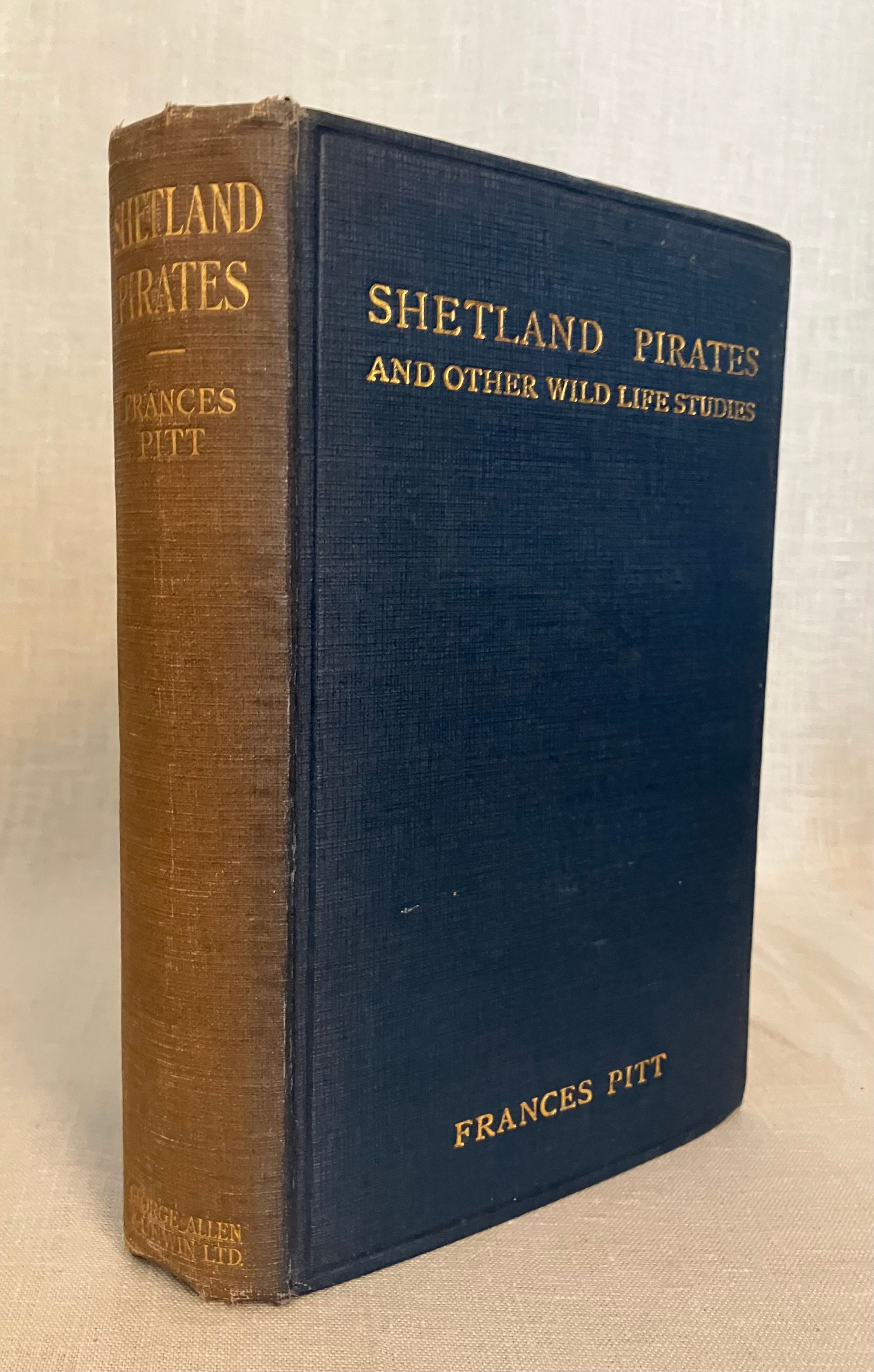 Hard cover, 8vo, in blue cloth with gold titles and blocked in blind, 248 pp. plus 6 pp. publisher's adverts. Condition: Good Plus. Lacking d/j. Spine sunned, with moderate fraying at head and foot, top edge dusty, several cracks to interior pages.** The Shetland Pirates referred to here are the Great and Arctic, or Richardson's, Skuas, the aggressive shore birds of the Shetland Islands of Scotland. Other chapters dwell on other wildlife of the area, including Pine Martins, Polecats and Scottish Wildcats. Includes many photographic plates taken by the Author Frances Pitt, a pioneer of wildlife photography. This is an early, scarce work of the Shropshire-born, British naturalist Author Frances Martin (1888-1964,) reworked from magazine articles into book form in 1923. OCLC 1548897.