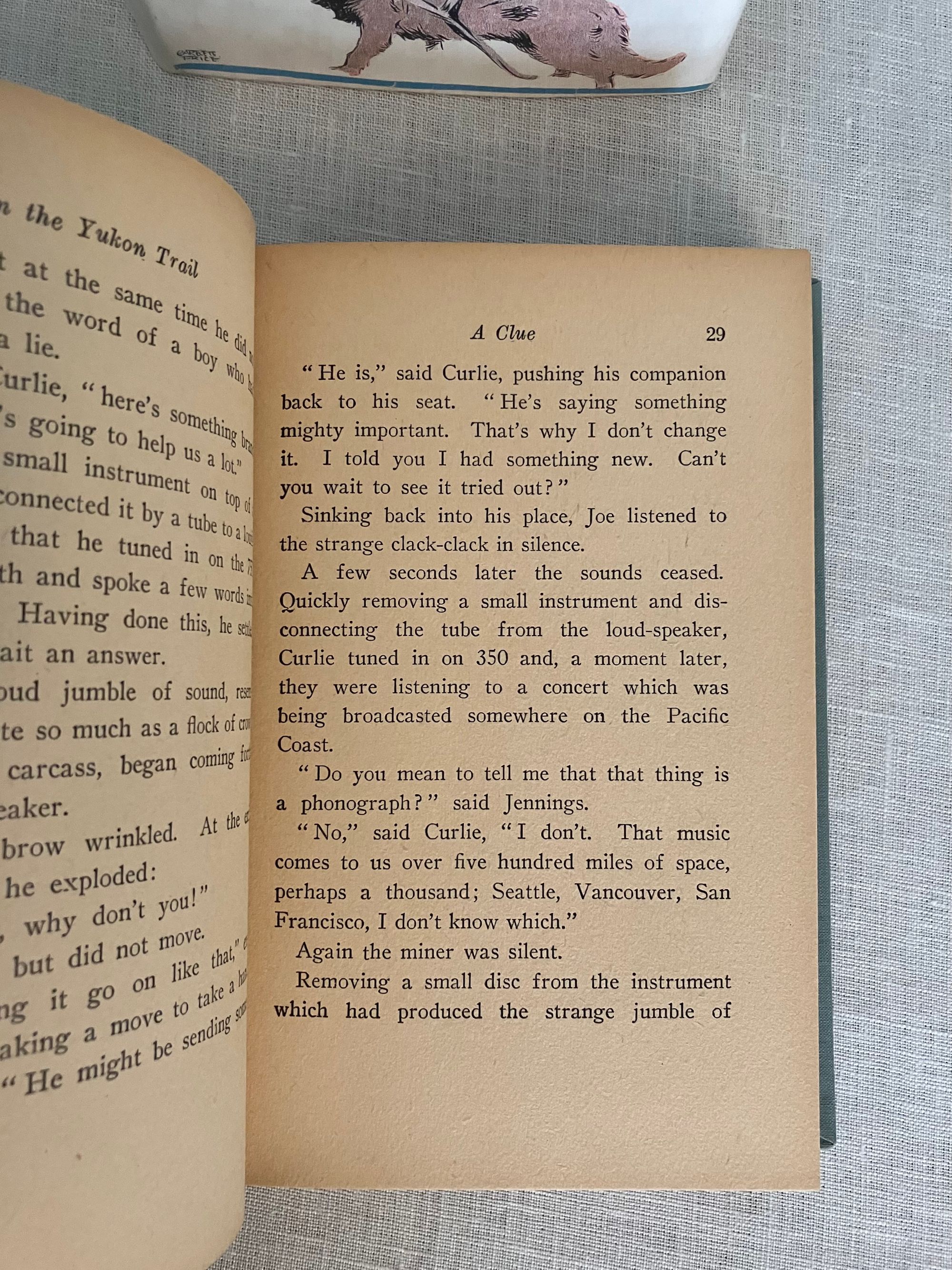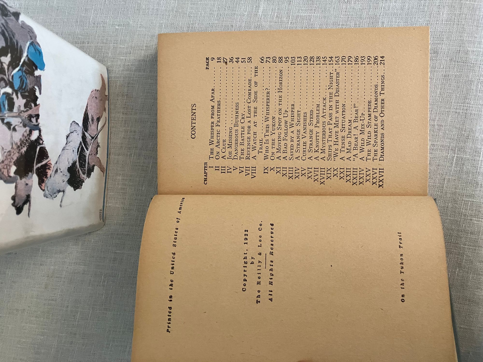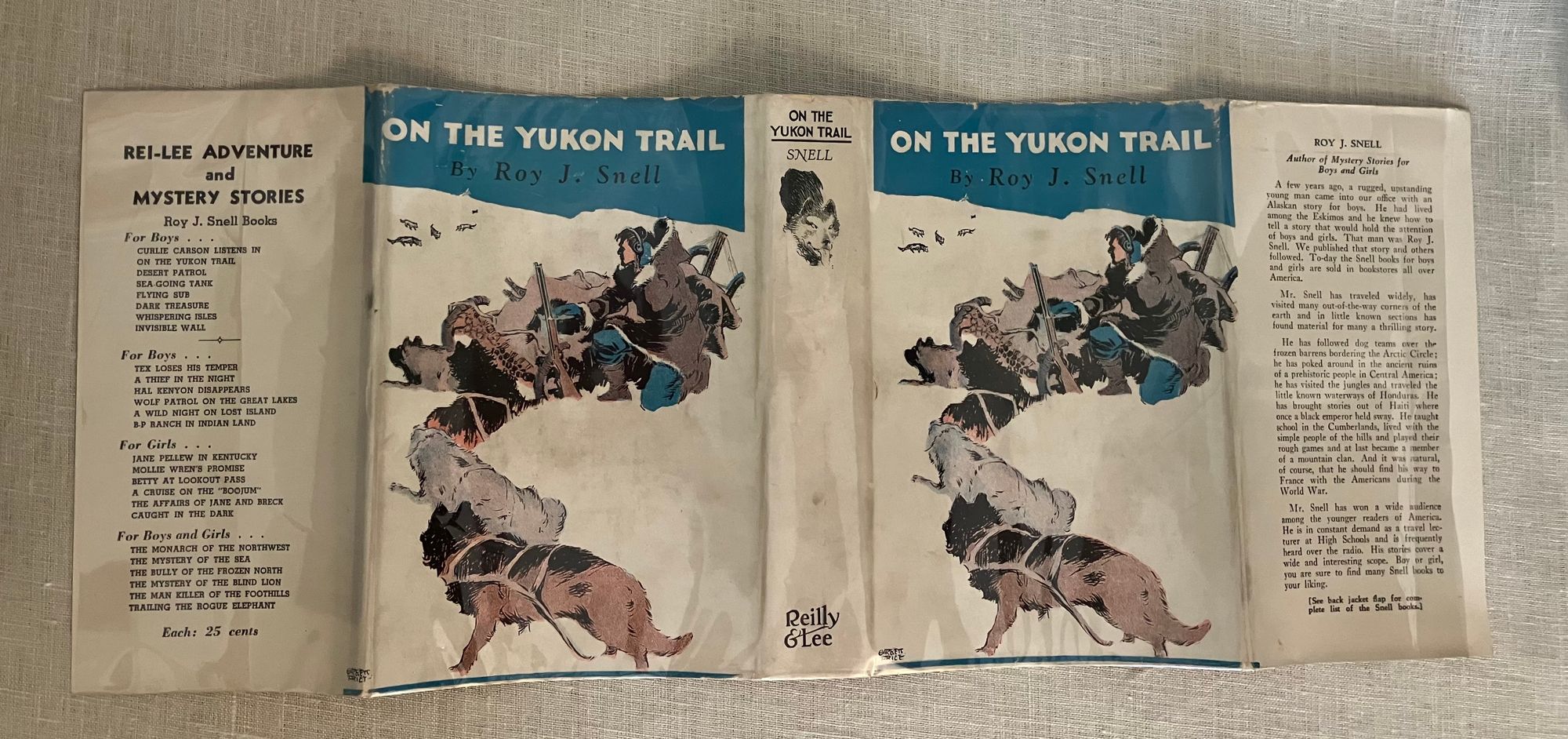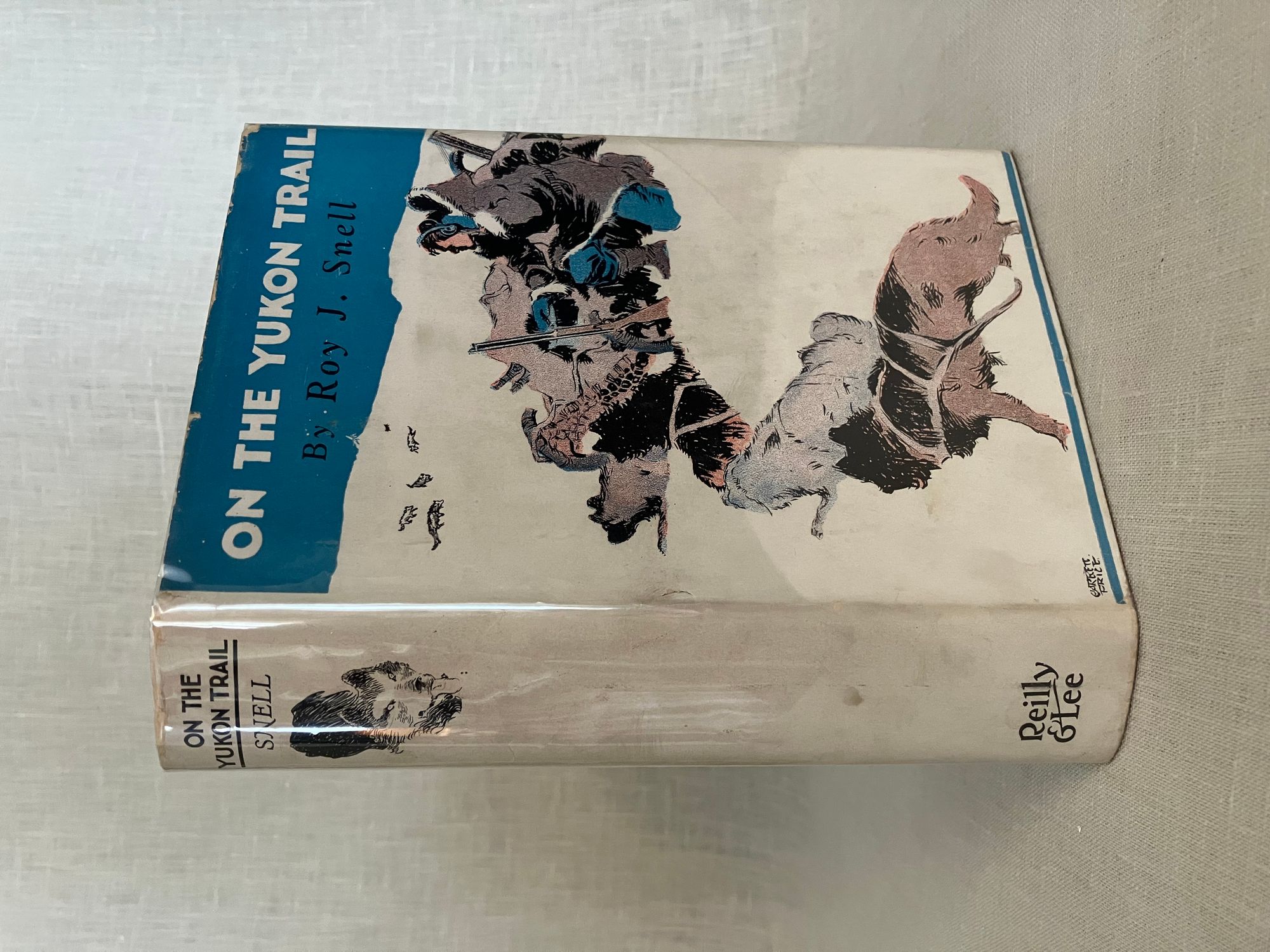 Reprint, with copyright 1922. [The first edition was published under one of Snell's nom de plumes, James Craig.] Hard cover 16 mo, in light blue cloth, the tiles blocked in black. 223 pp. (no illustration). Original, unclipped, pictorial dust jacket by artist Garrett Price, in mylar. Condition: Uniform moderate age-toning of pages, otherwise very clean and unmarked. Dust jacket with some light soiling, and corner wear.**Missouri-born Author Roy J. Snell (1878-1959) travelled extensively, using this as inspiration for many stories and novels written prior to World War II. On The Yukon Trail is the second of eight books in the series. The protagonist is tracing an international jewel thief and smuggler from Valdez, Alaska up the Yukon trail of the gold miners by dog sled, using his wireless radio to keep in touch with base, called the Secret Service of the Air. Bears, sled dogs and lots of snow make this a breezy choice for a long hot summer!