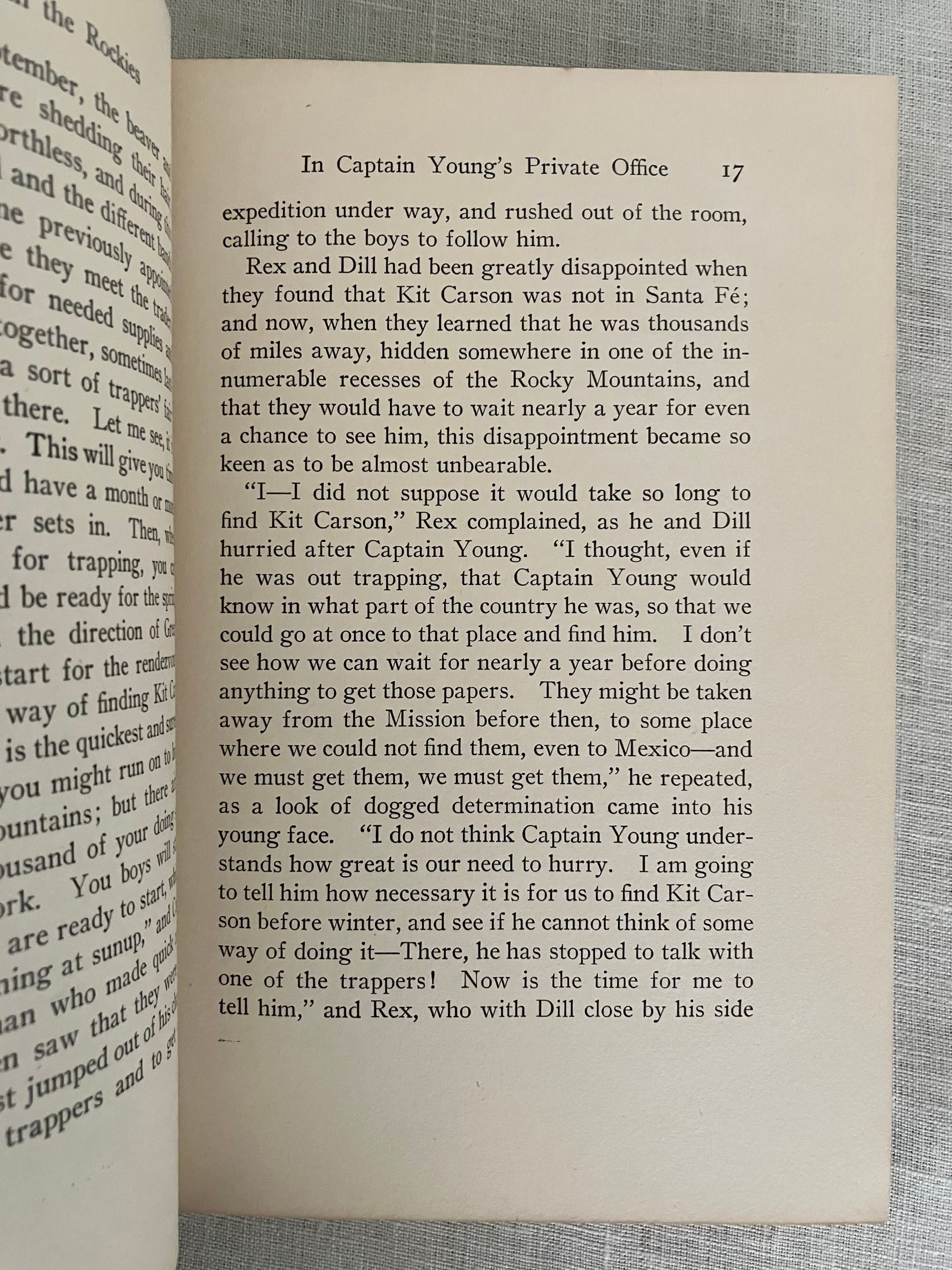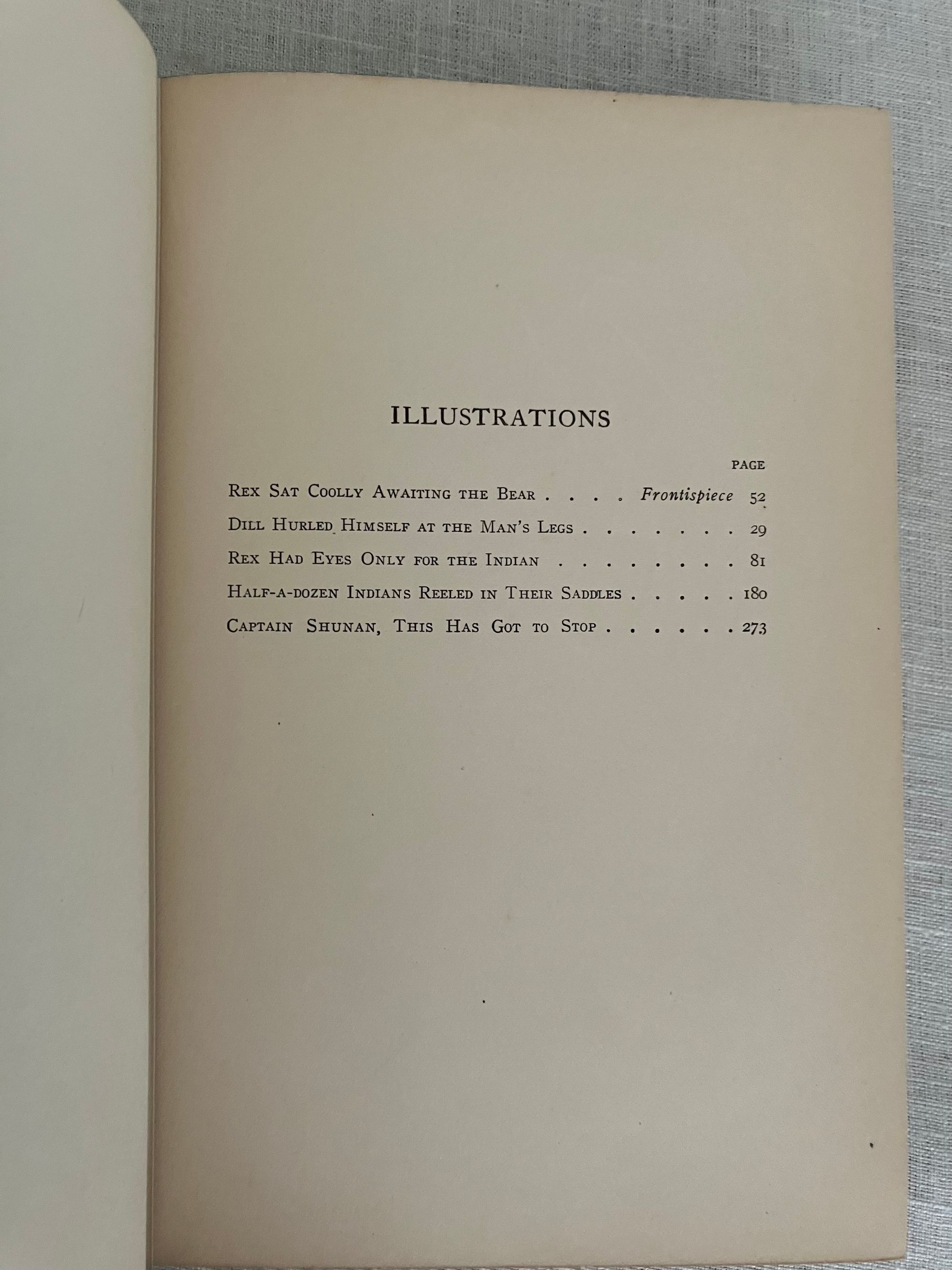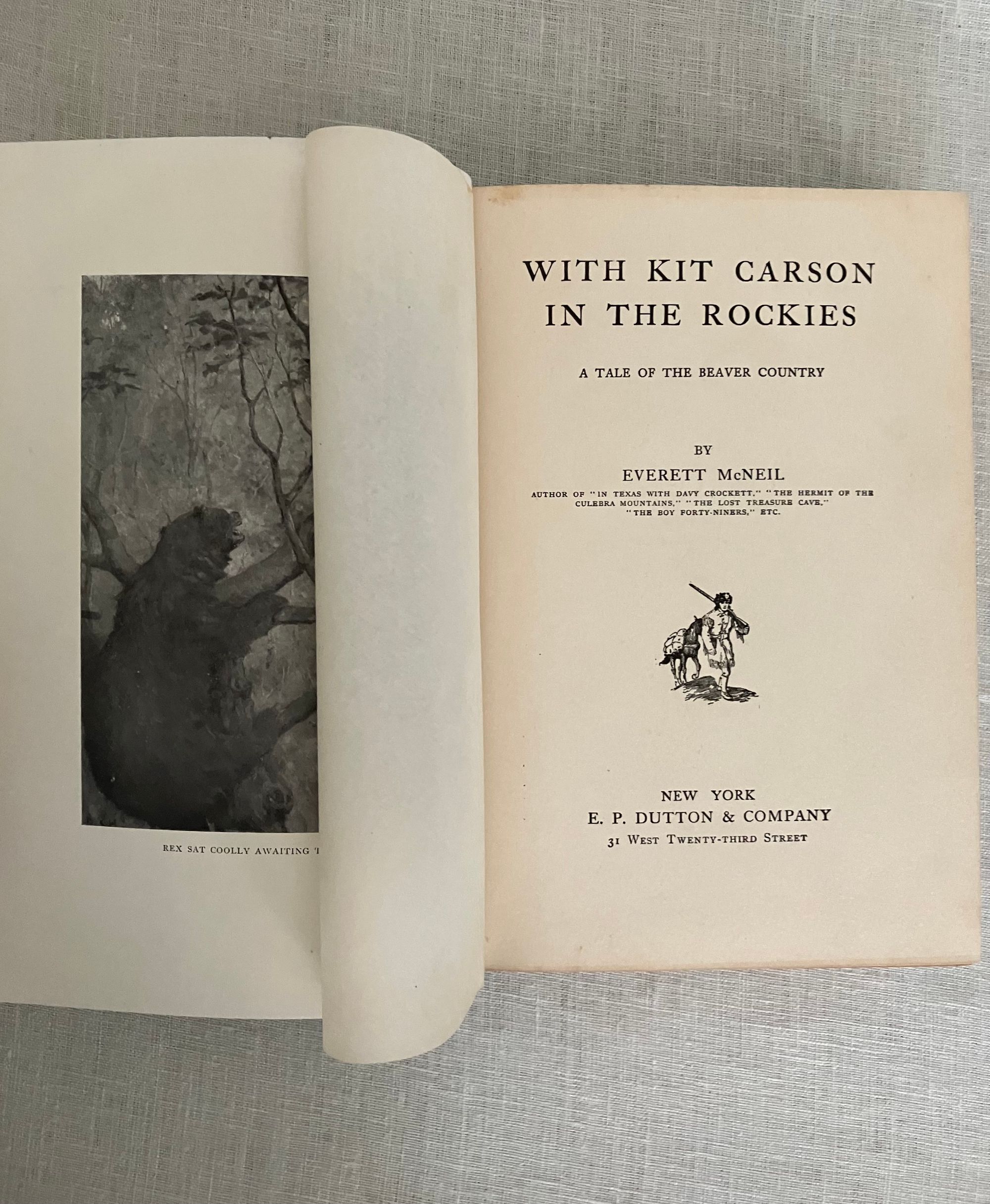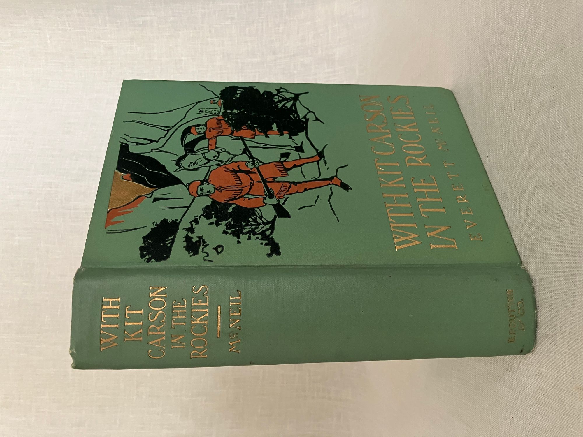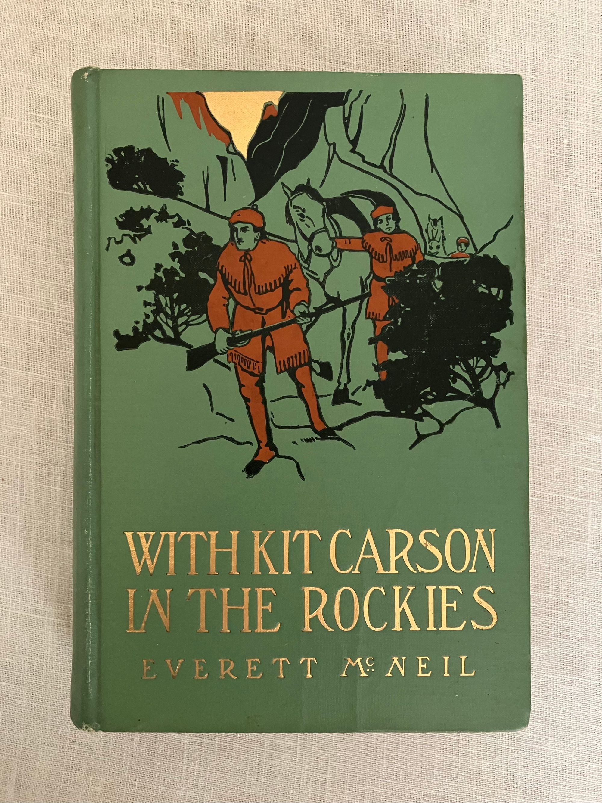 Hard cover in green cloth, titles blocked in gold to front board and spine, with pictorial decoration in black, red and gold, with tissue-guarded frontispiece plus four additional full page black and white illustrations. top edge stained green, 333 pp. plus 4pp. publisher"s catalogue. Lacking d/j. **Condition: Very Good. Creasing to cover. Lacking ffep. and front hinge has some perforation. Overall, it is sound and generally clean internally, with mild age-toning. Soiling to top of rear board. **Two teens, Rex and Dill, must travel into the Rockies in order to find the famous trapper, Kit Carson. Their mission is to convince Kit to travel with them in search of some papers needed by the family back in New Orleans, being held by their Uncle Manuel in California. Wagon-training, trapping, hunting, and general outdoorsy adventure are promised in this well-written novel. Contemporary attitudes of the time it was written may prompt discussions, but that's why we read. **Wisconsin-born Author Everett McNeil (1862-1929) released this story in 1909, one in a series of similar novels for young people focused on heroes of the West. A veteran of the Mexican-American War, he walked across country from Wisconsin to New York to engage in a literary career. In later years he was a supporter of H.P. Lovecraft.