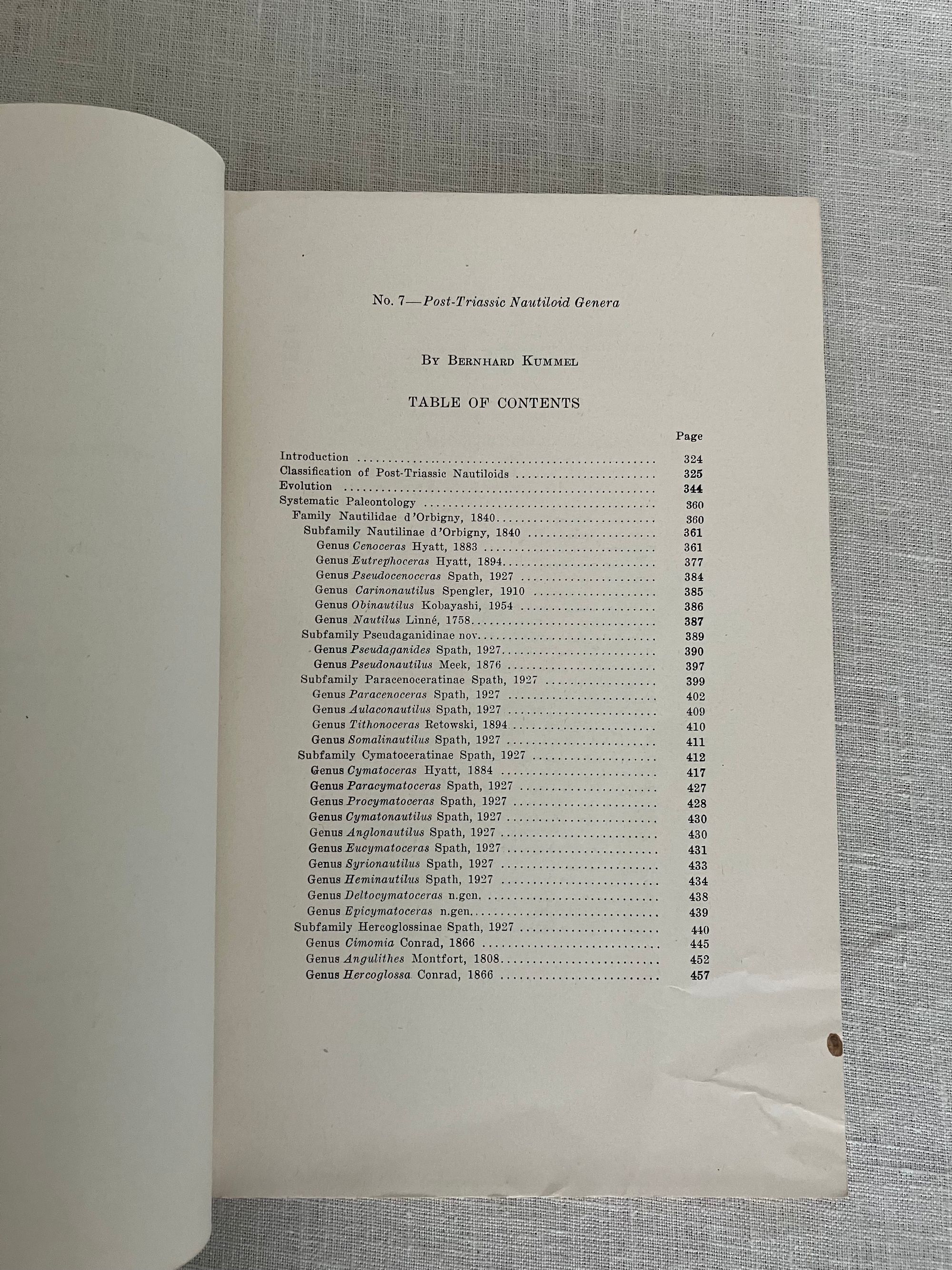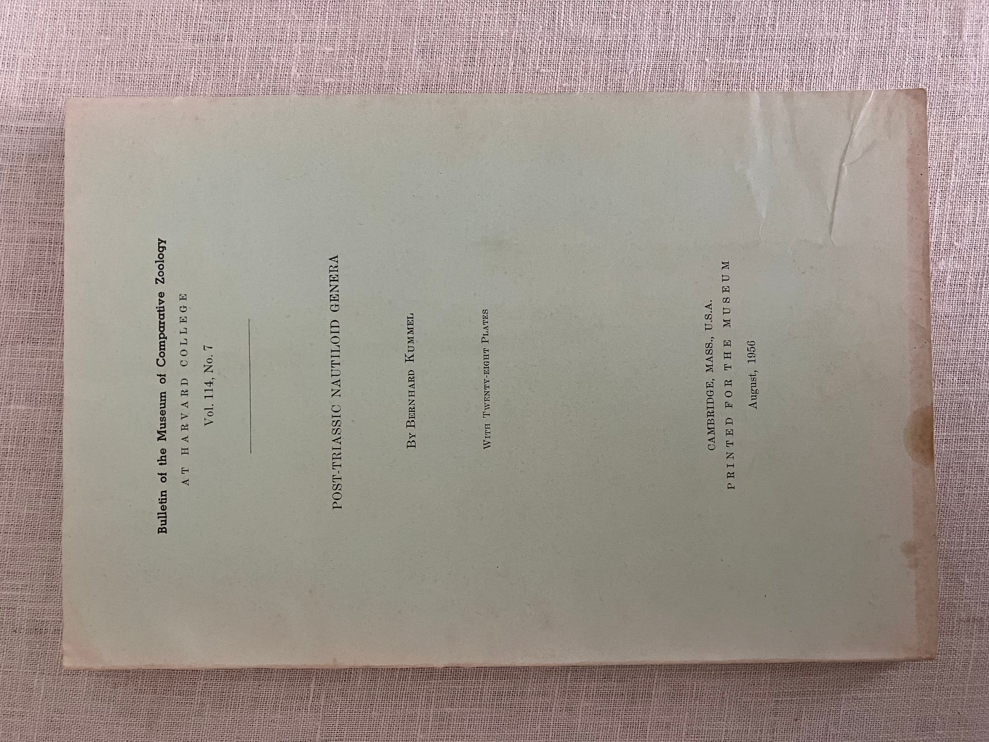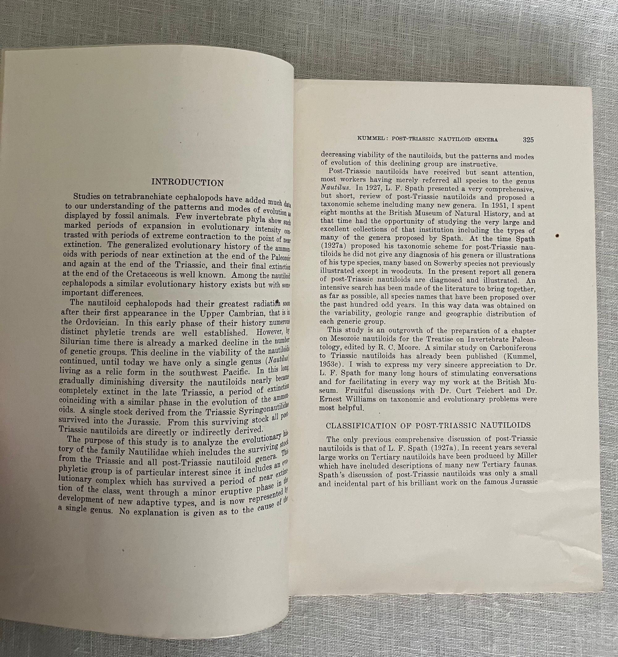 Soft Cover, 8vo, in light green paper wraps, pp. 325 - 494 plus 28 pp. full-page black and white plates. Line illustrations, maps and other charts within text. Condition: Very Good. Wraps show sunning on all sides, especially at spine. Soiling to bottom of front wrap and contents page, as seen. Otherwise, item is sound, and has mild toning. **The evolutionary history of nautiloid cephalopods is traced through different eras, and reasons for their near-extinction are discussed. The Author, Dr. Kummel, was Professor of Geology at Harvard from 1952 to 1980. His work here re-considers samples held and first delineated by Dr. Spath at the British Museum in a1927 publication on the subject.