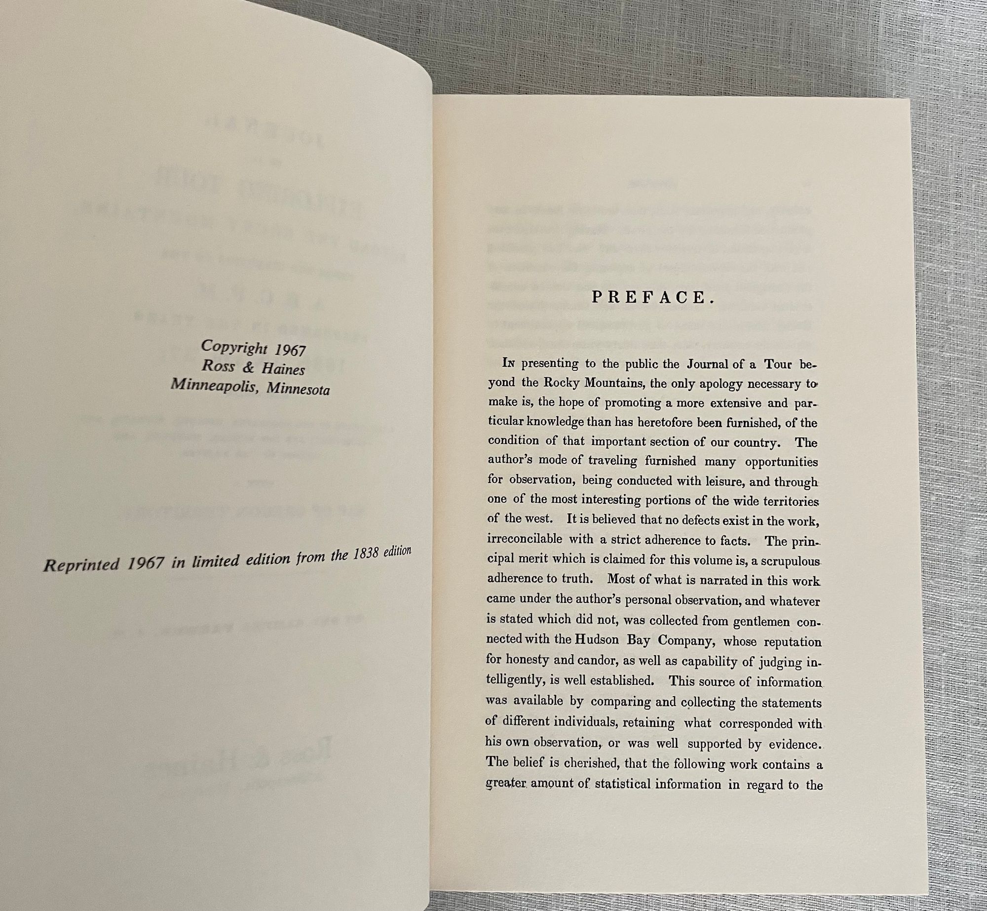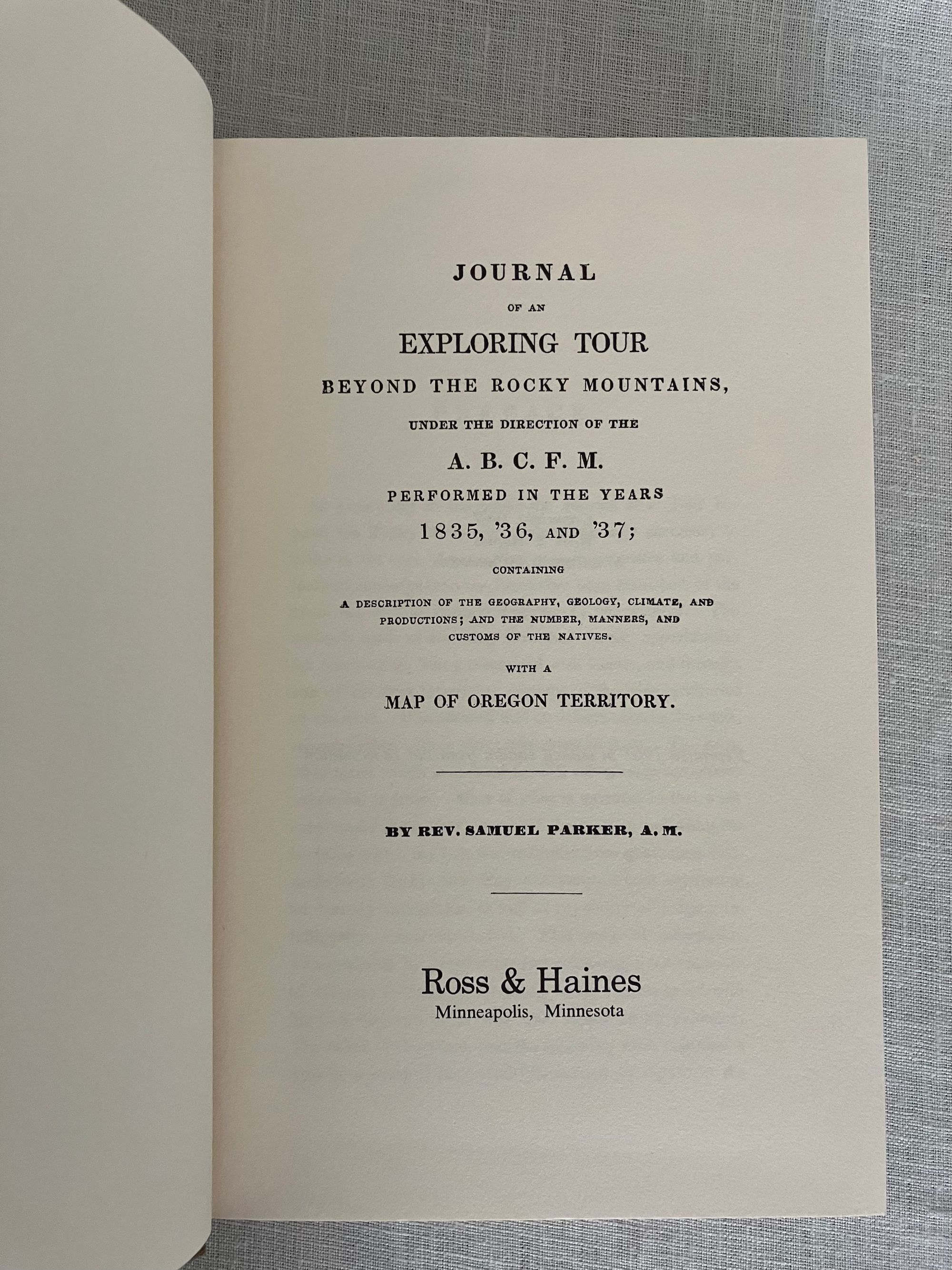 Hard cover, 8vo, in brown cloth with titles blocked to spine in brown, xii plus 379 pp. Folded map laid in. An un-numbered Limited Edition facsimile of the original publication of 1838. In original, price-clipped dust jacket and protective mylar. Condition: Fine. D/J is Very Good Plus with sunning to spine. **The Massachusetts-born Author, Rev. Samuel A.M. Parker (1779-1866) was the first Presbyterian missionary in the Northwest. He trained at the Andover Theological Seminary, the training ground of a number of notable Christian missionaries despatched in the nineteenth century from Massachusetts to places such as China, India and other far-flung locales. The volume describes his travels begun in 1835 under Fontenelle of the American Fur Company. His observations are described as a valuable resource on the tribes he encounters, the descriptions of the land, its agriculture, animal life and geology. The map shows the earliest representation of interior Oregon. (The original 1838 title is listed in Shaw and Shoemaker, 52134.)