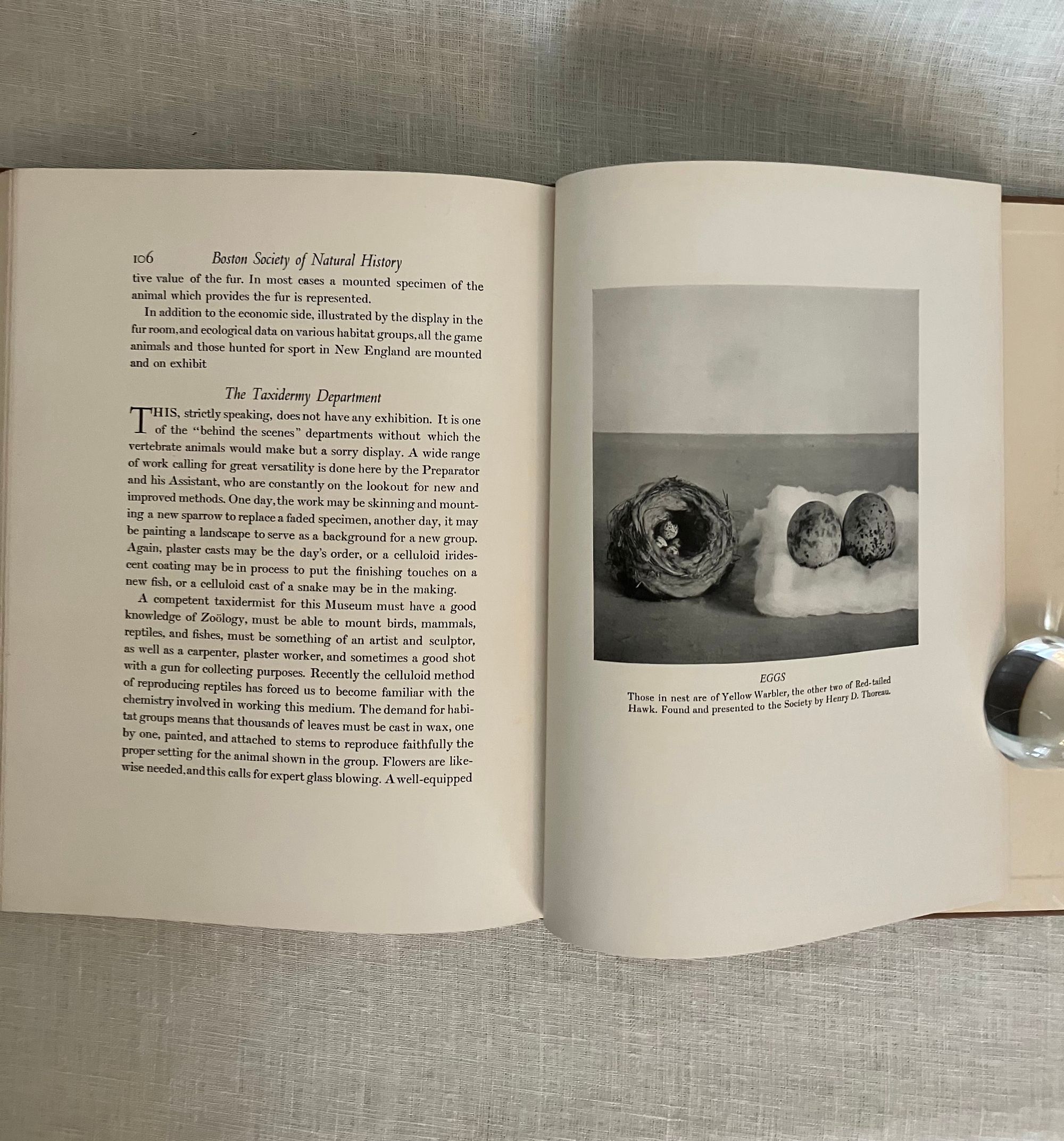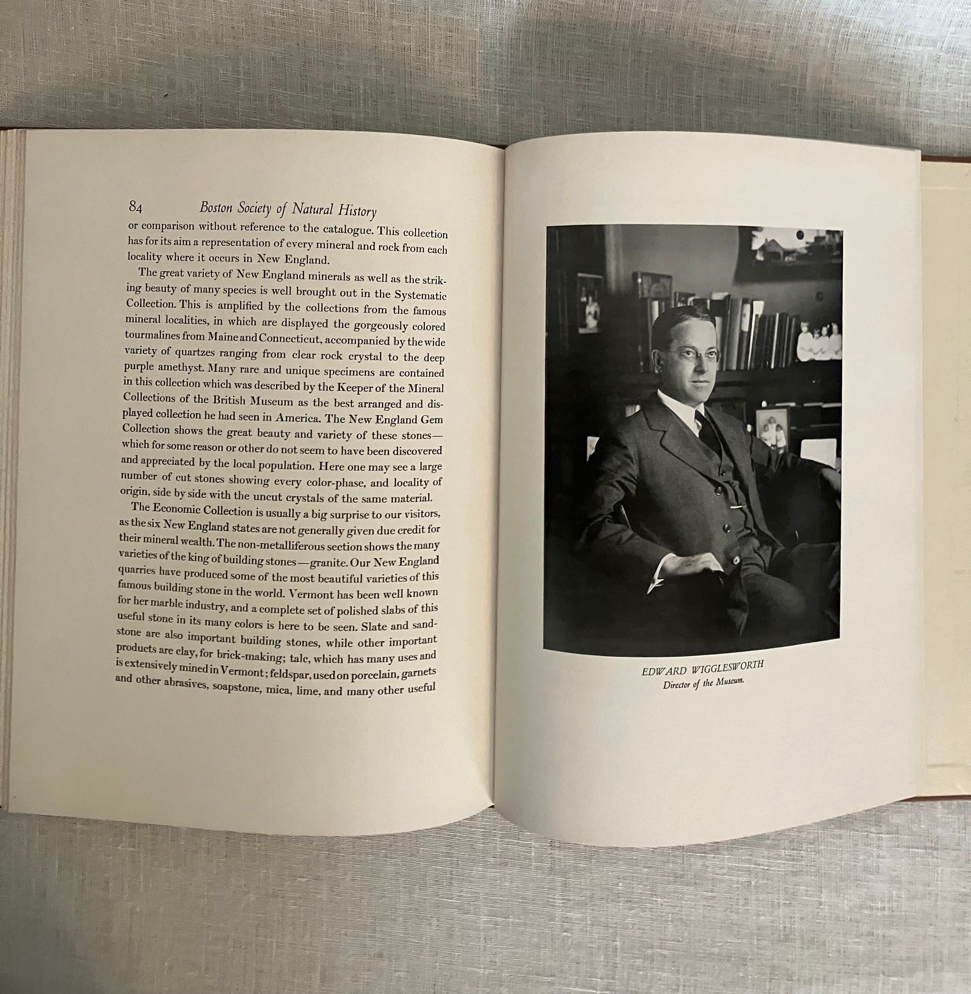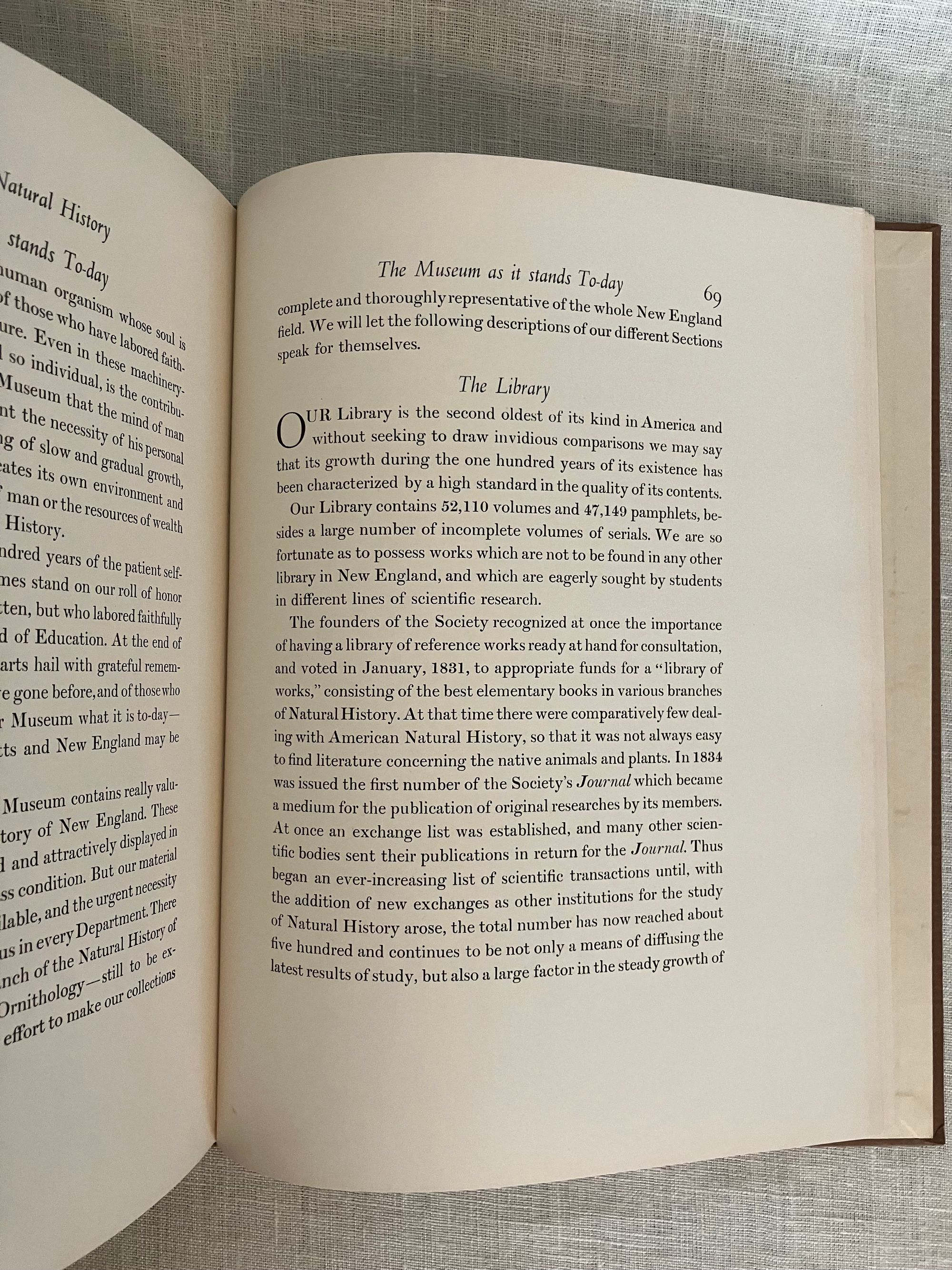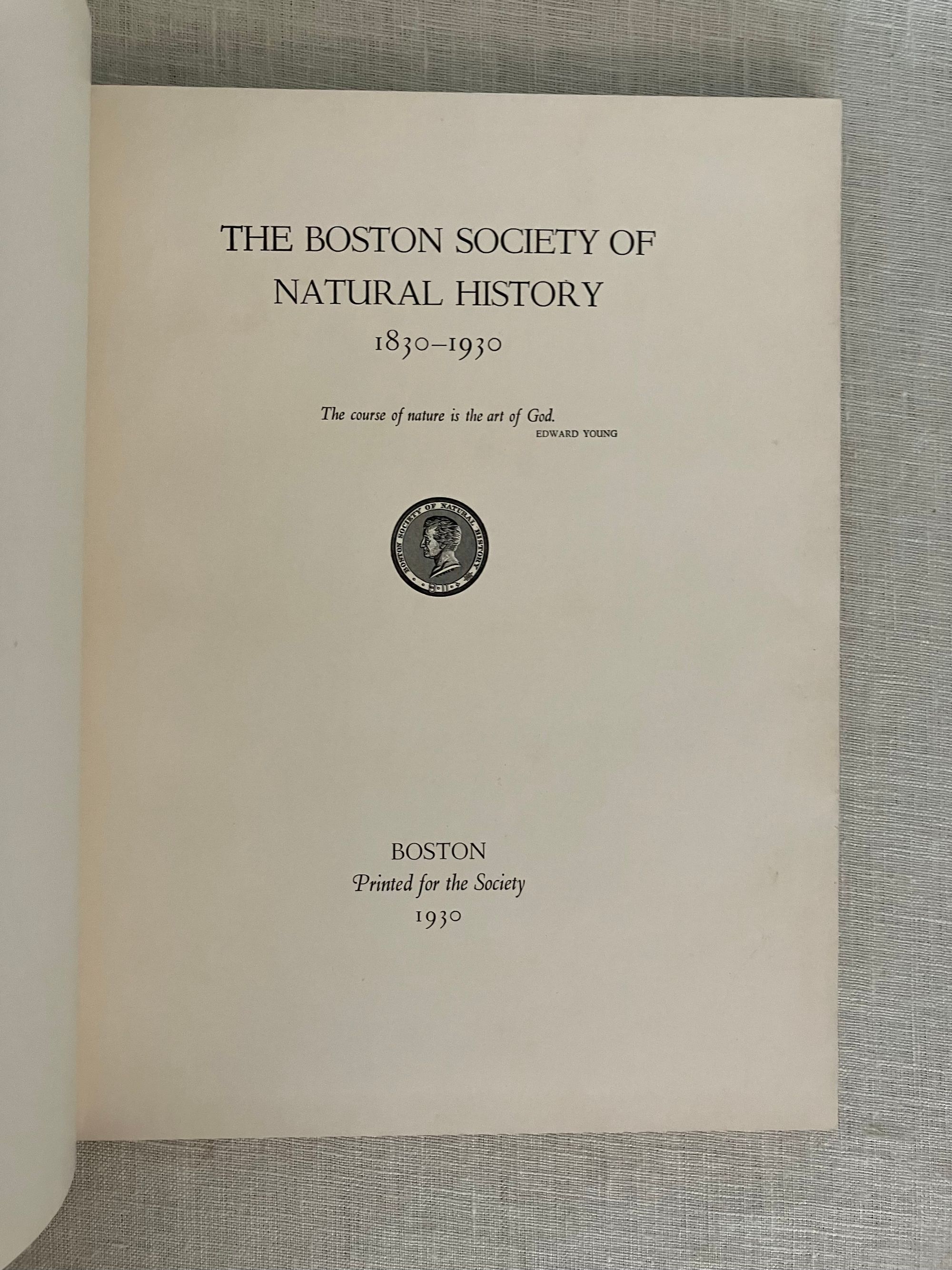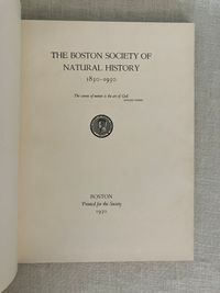Hard cover, 4to, in half olive linen over brown laid paper-covered boards with titles blocked to front board and spine in gold, 117 pp. Condition Near Fine. One small mark to lower front board. Former owner's signature in ballpoint to ffep. Features numerous photograveure reproductions of a number of Boston grandees, many of whom were also benefactors in other Bay State institutions, among them being notable men of science, commerce, historians, and artists. The museum took up the mantel of Linnean Society of New England, another early nineteenth-century Boston-based natural history institution, whose collections of "animals, plants and minerals" were transferred after their dissolution in 1822. (The collapse of the former being due to an imbroglio over the society's discredited report confirming the existence of the Gloucester sea serpent.) In the early 1950's the Society for Natural History's collection became the basis of the Boston Museum of Science. Printed at Daniel B. Updike's Merrymount Press of Boston.