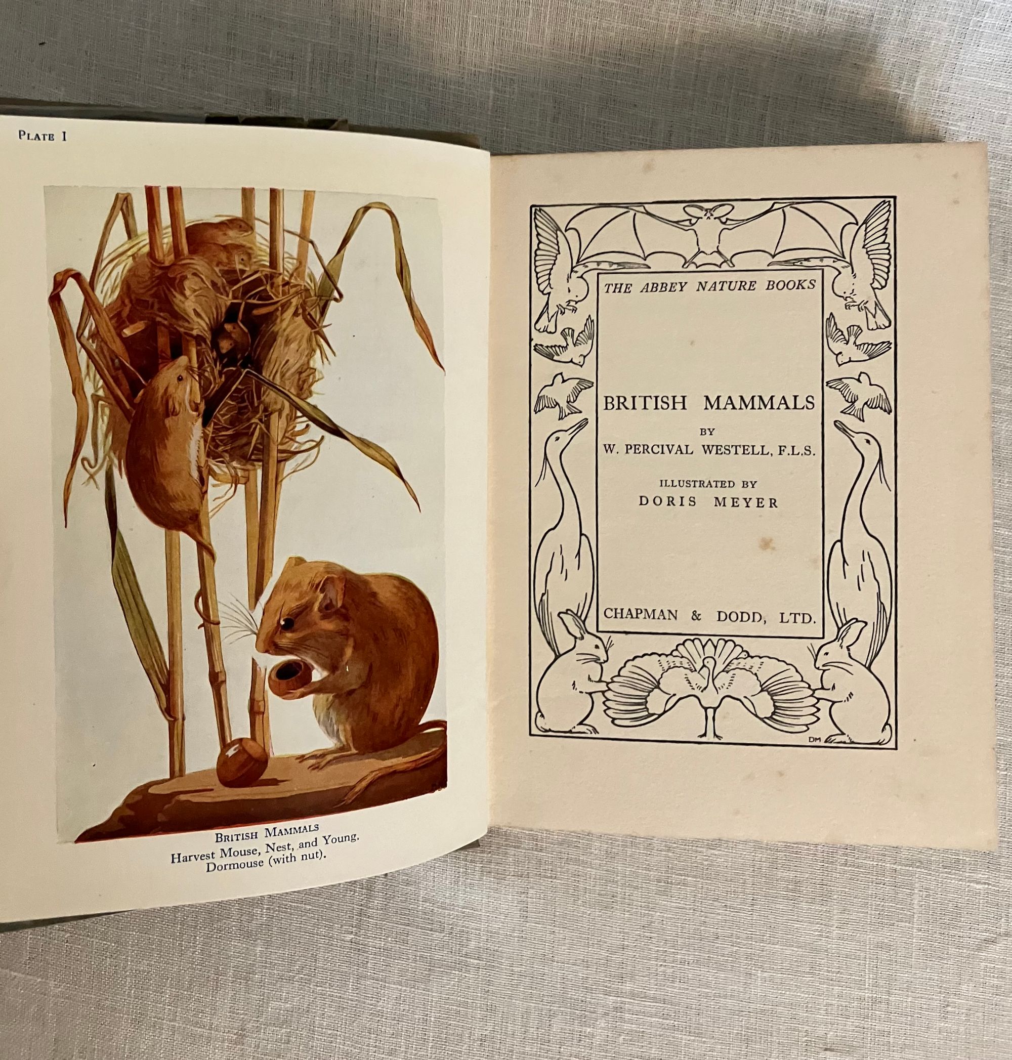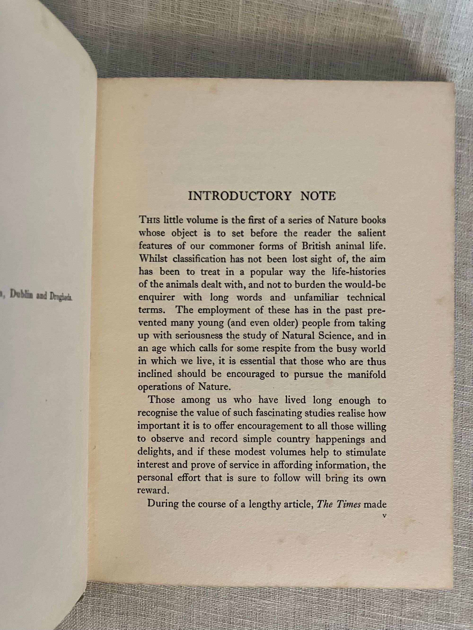 Hard cover 8vo, in green-tan cloth decorated with pictorial border and titles in blue to front and upon spine, color frontispiece plus additional color plate in addition to many line illustrations, x, 127 pp. Inscription in fountain pen dated 1925 to ffep. Original dust jacket, unclipped. Printed by Cahill and Co., London, Dublin and Drogheda. **Condition: Very Good, with very light foxing along edge of text block and upon interior pages. Otherwise, tight, clean and hinges in order. Dust jacket is Very Good, still bright with the spine unsunned, with some small chips along top and bottom edges. **This was the first part of a five-book set with the additional titles on British birds, reptiles, butterflies and moths, and insects.