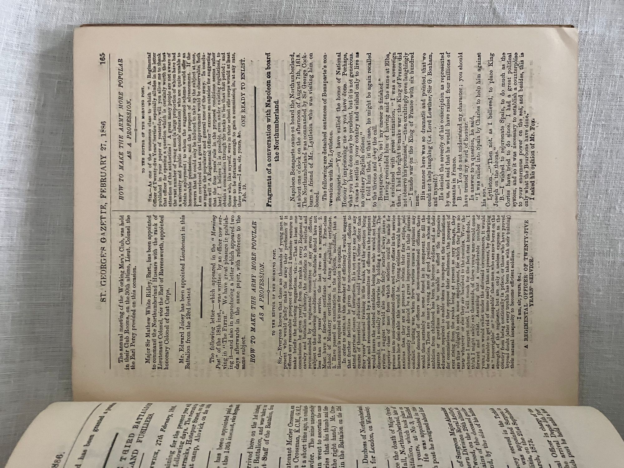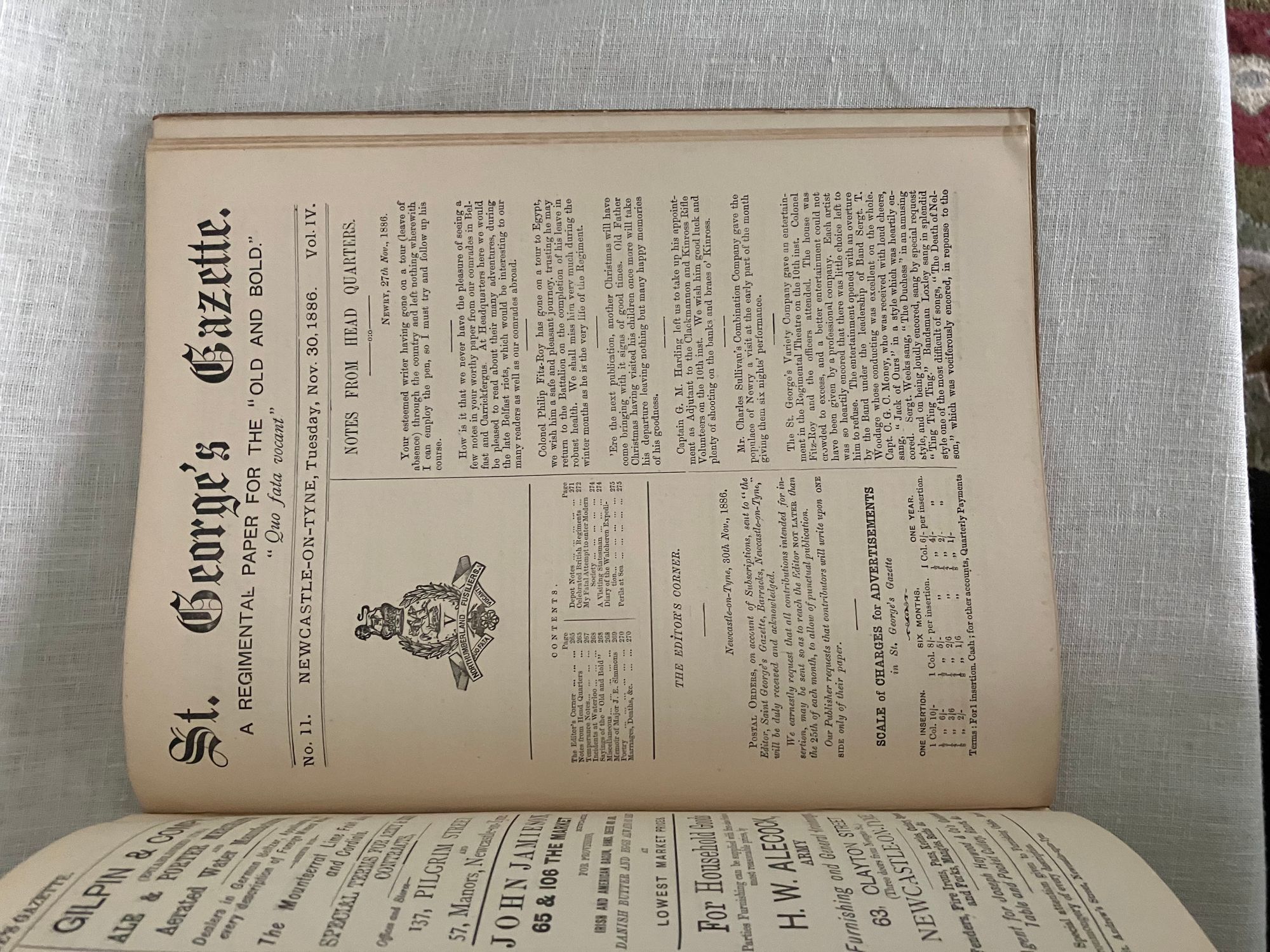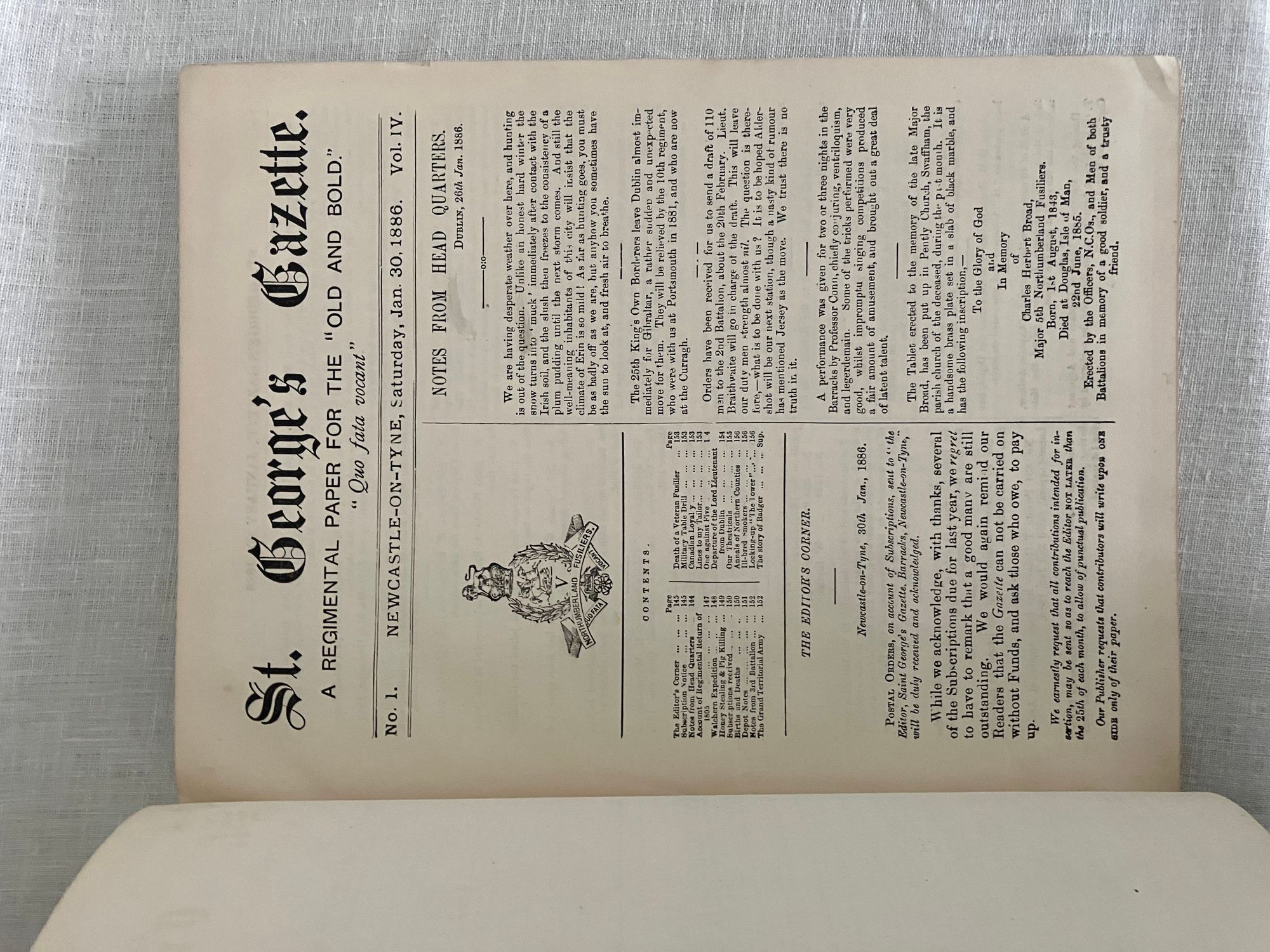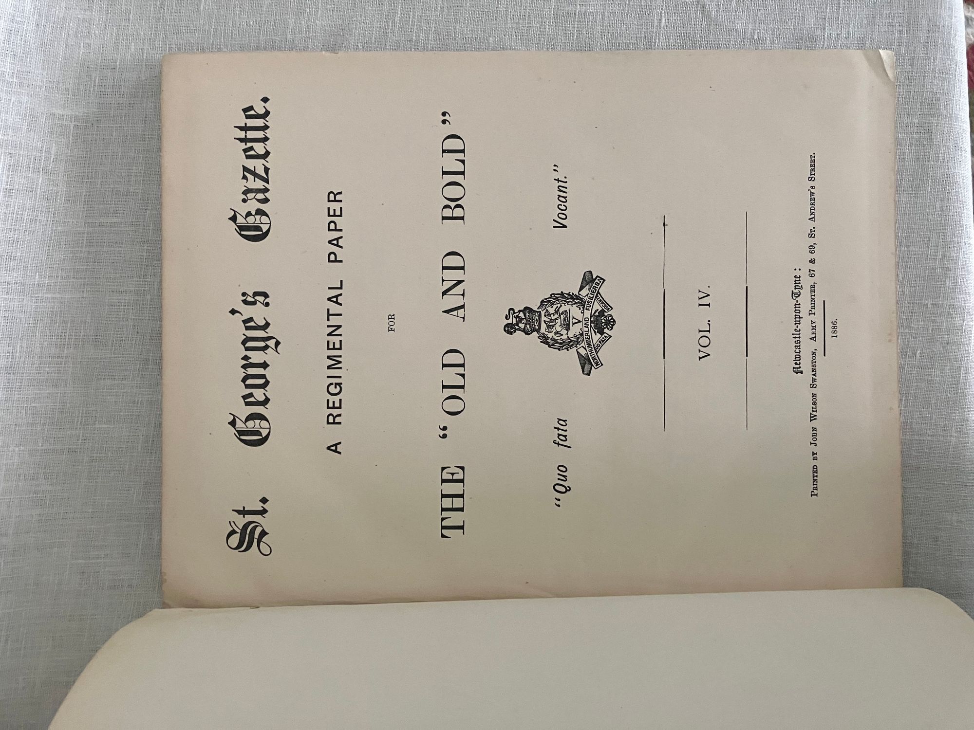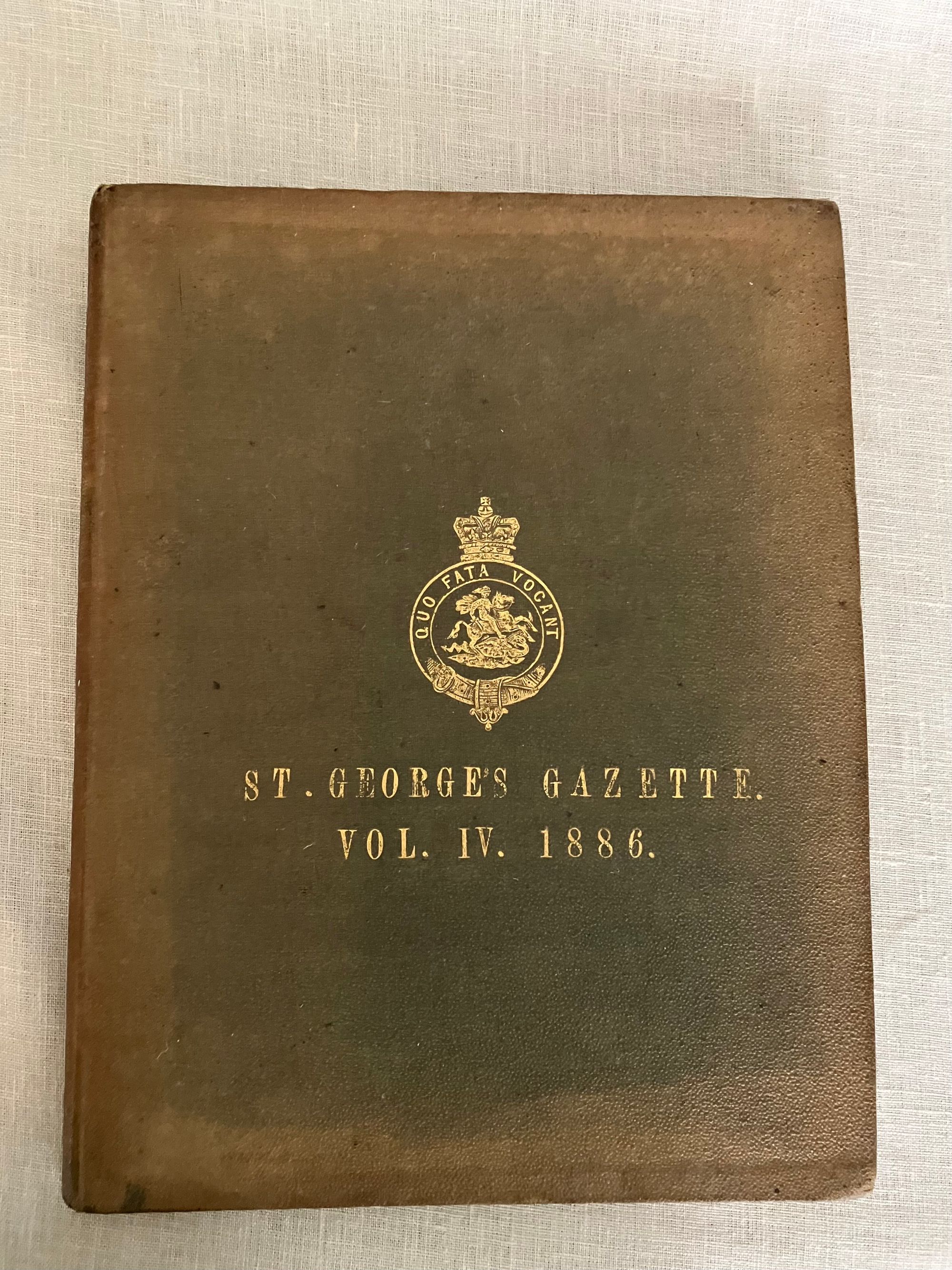 Hard cover, quarto, pp145-288 +double-page Fusiliers' Almanac for 1887. Covers January to December, 1886. In publisher's green pebbled cloth binding with gold lettering and regimental insignia. Condition: Very Good Minus. Covers heavily sunned, with heavy staining to the back cover. Binding tight and text block clean. ** An informative and entertaining regimental publication, with promotion notices, letters, advertisements, articles on shooting competitions with the name & rank of the winners listed, and historical accounts mentioning the Battle of Toulouse, the "Great Battle of Waterloo". Articles include "A Week's Leave in the Himalayas", "Introduction of Bayonets into the Army", and "How I Bought My Dog". ** The Northumberland Fusiliers became part of the British Army after their part in the "Glorious Revolution" of 1688, when William of Orange (William III), deposed James II to become king of England, Scotland and Ireland. They fought during many historical events, including: the Siege of Gibraltar (1727), the Battle of Warburg (1760), the Battle of Lexington and Concord (1775), the Battle of Bunker Hill (1775), the Peninsular War (1807-1814), the Second Boer War (1899-1902), and both World Wars. The regiment was finally reorganized as the 29th British Infantry Brigade in 1951.