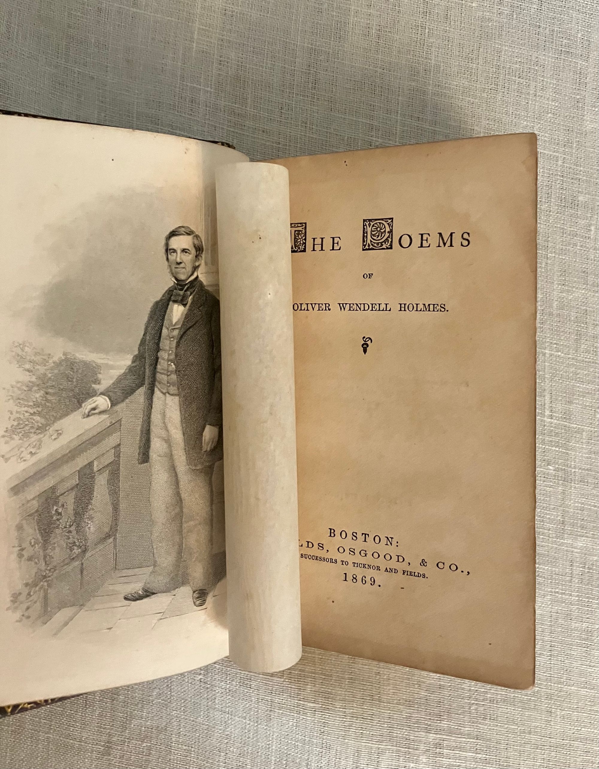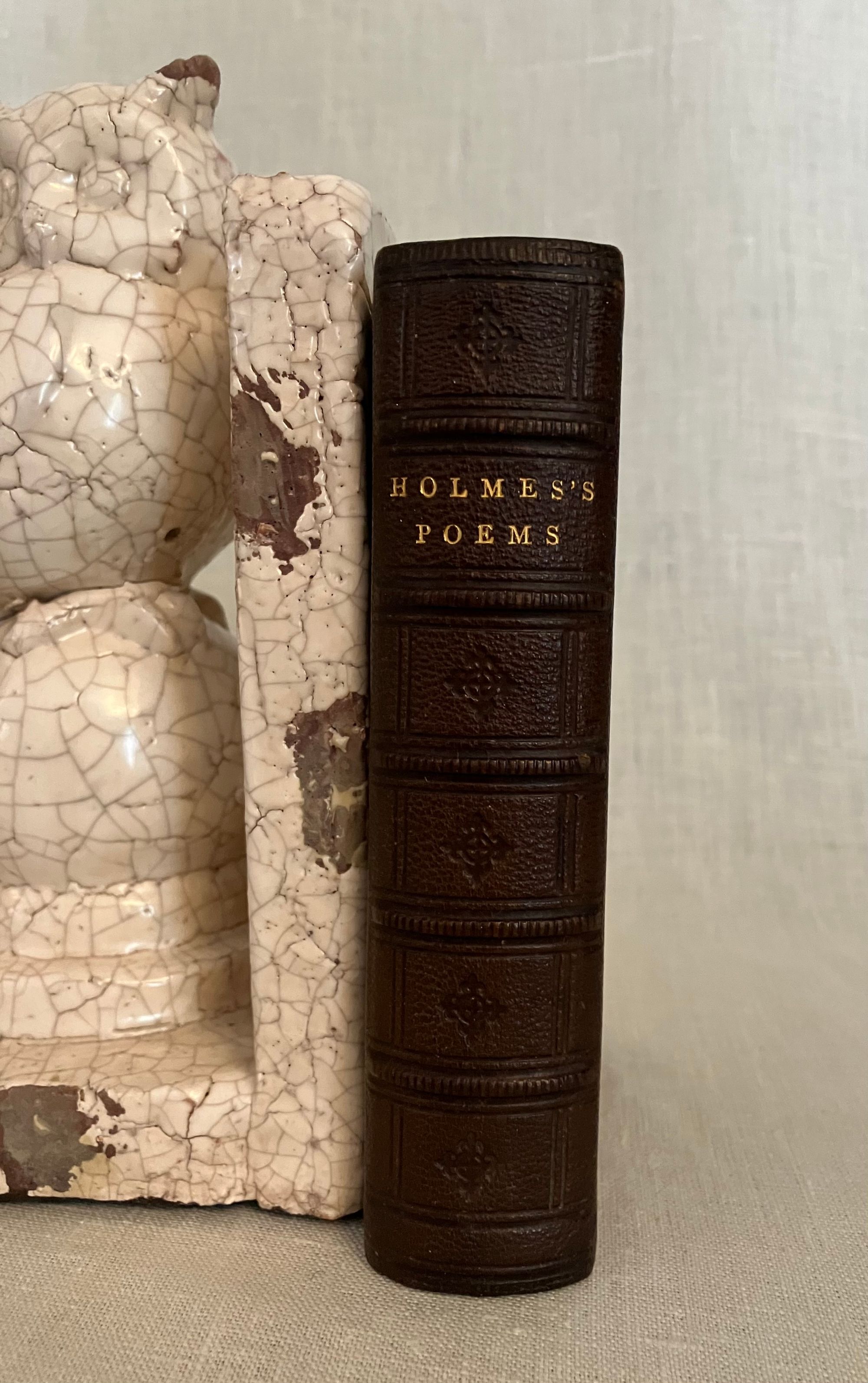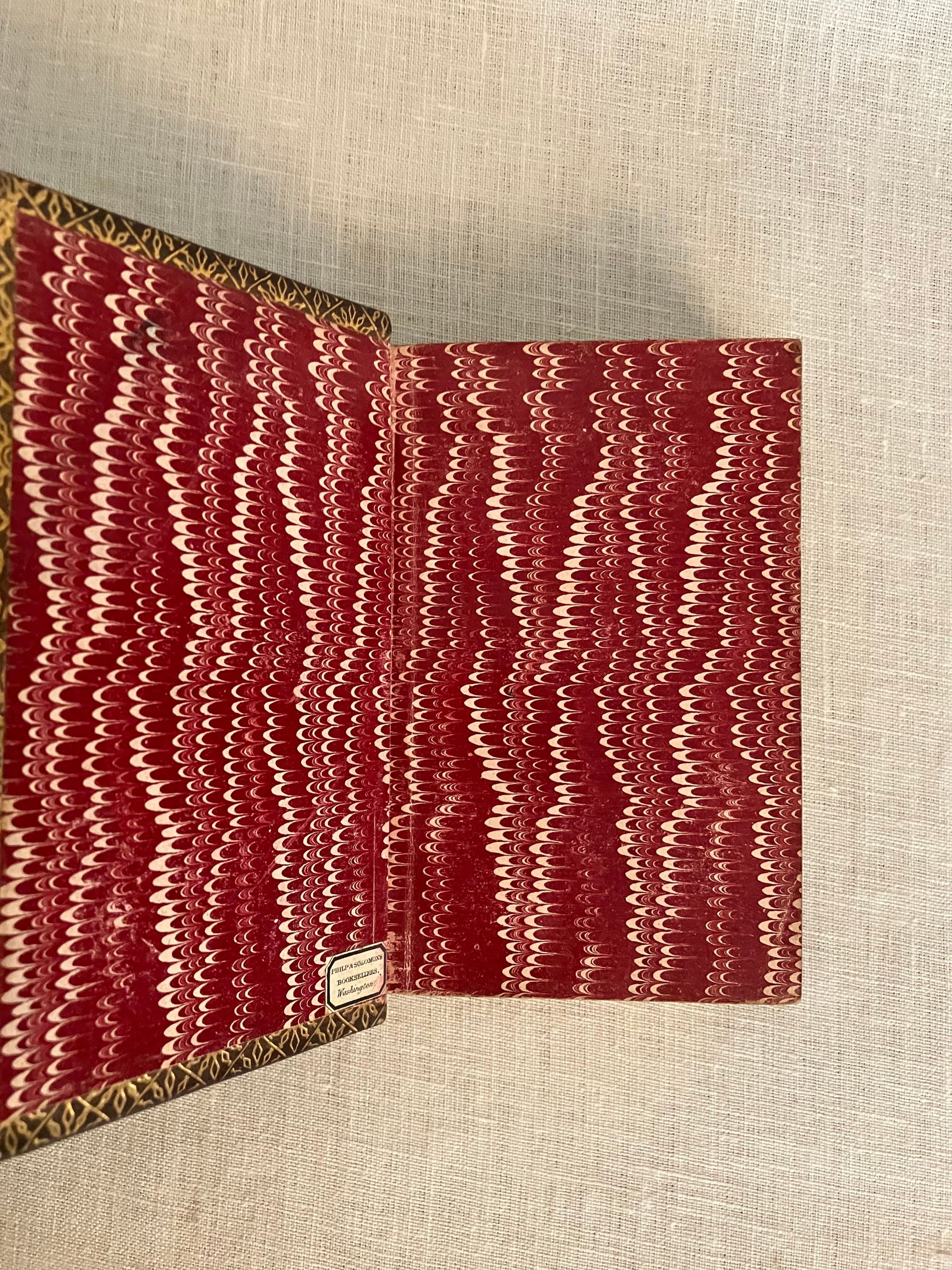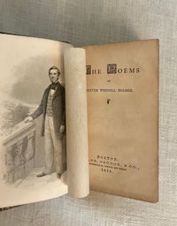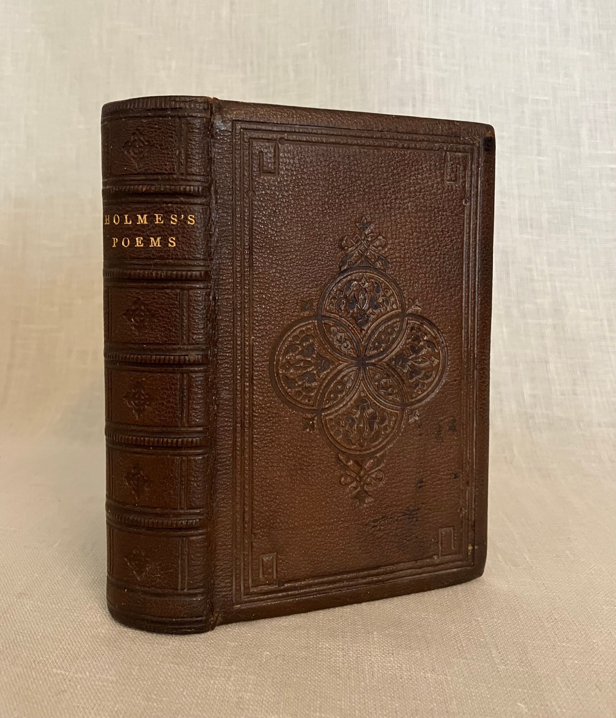 Reprint. Hard cover 24 mo, in contemporary rebinding of full leather blind-stamped with triple-ruled border featuring a design of Gothic-style interlaced circles with floral decoration, the spine with five raised bands and the title blocked in gold, marbled end papers with the dentelles and board edges blocked in gold, all edges gilt, tissue-guarded engraved frontispiece portrait of the Author, xi, (1-5) 6-410 pp., stated Fifteenth Edition.**Condition: Very Good. Some old black ink stains to both boards. Very light rubbing to two corners. Original owner's signature in pencil to ffep., small Washington DC. bookseller's label to front pastedown. Gentle age toning, moderate to title page, otherwise very clean and tight.**This work is an anthology of the beloved Boston-born Poet, physician and all round man of letters, Oliver Wendell Holmes Sr. (1809-1894.) Included are: Poetry: a Metrical Essay (1836); Miscellaneous Poems ( 1830 et al ); and Songs in Many Keys (1861). **Provenance: Virginia (Dodge) Poore, (1826-1894) born Washington D.C., married to fellow-Bay Stater, the influential Washington journalist, foreign correspondent, and author, Maj. Ben: Perley Poore (1820-1887). He was also the first President of Washington's Gridiron Club. The Poores would live the latter part of their lives at his family home in West Newbury, Massachusetts. BAL 7226.( See our listing 8938 for item in a matching binding from the same library; the owner rebound many of their books from the original cloth as a matter of course.)