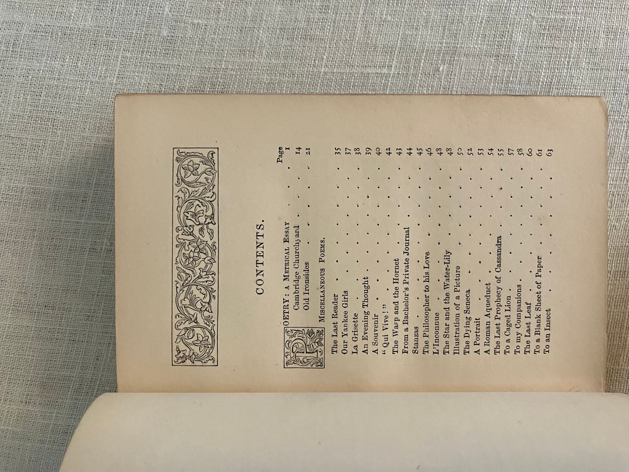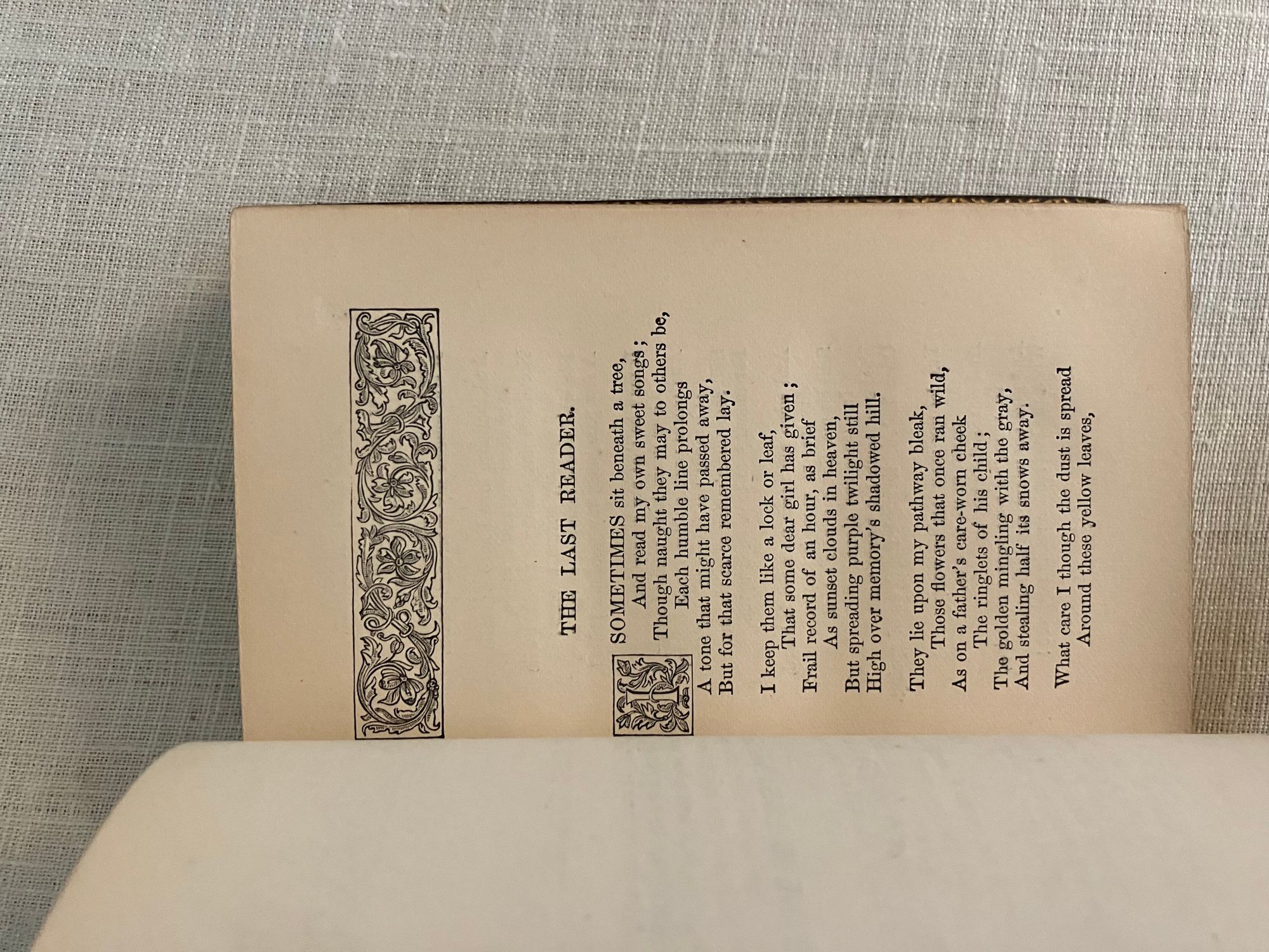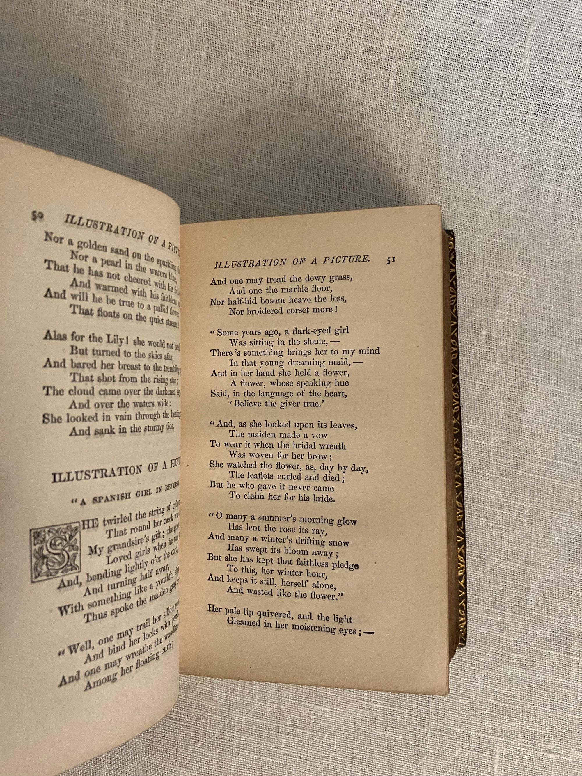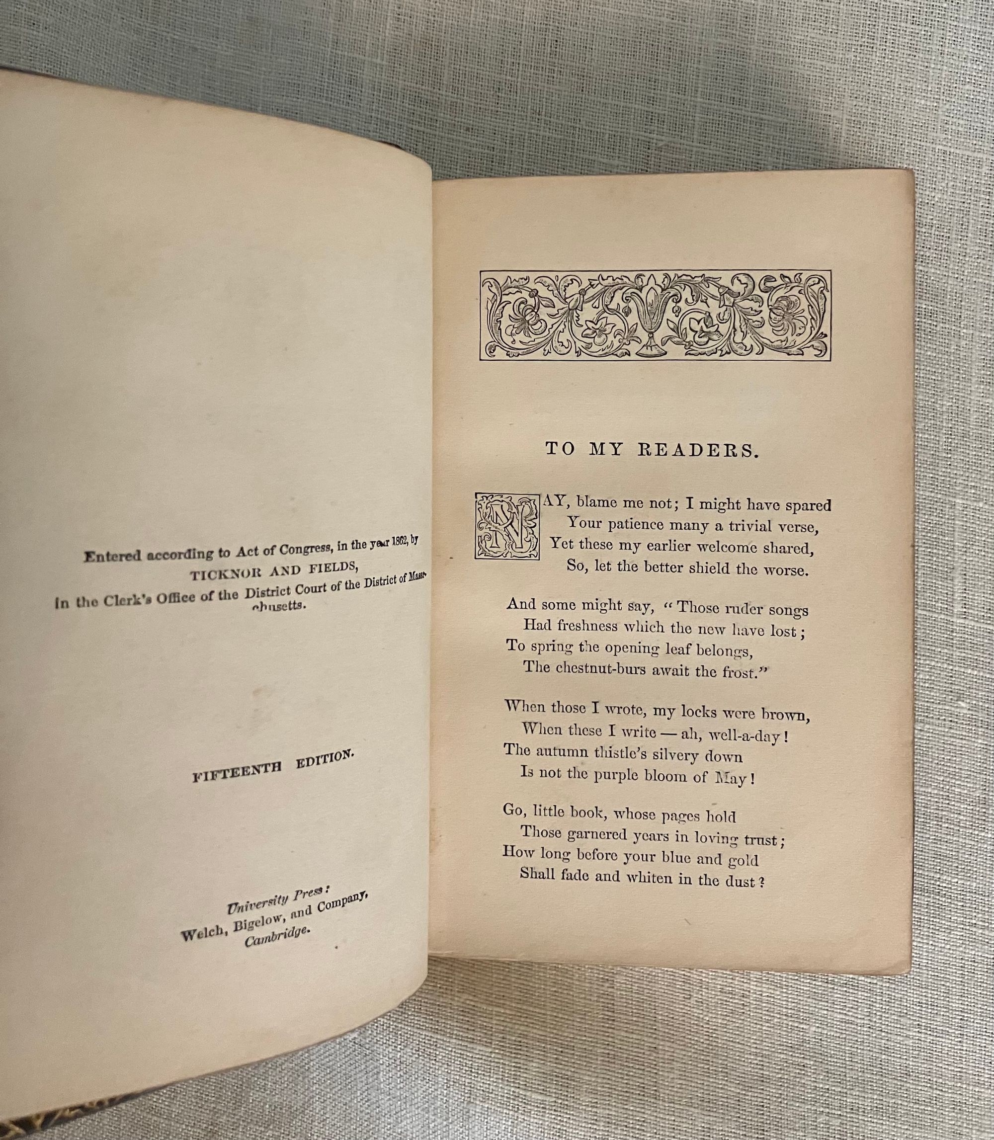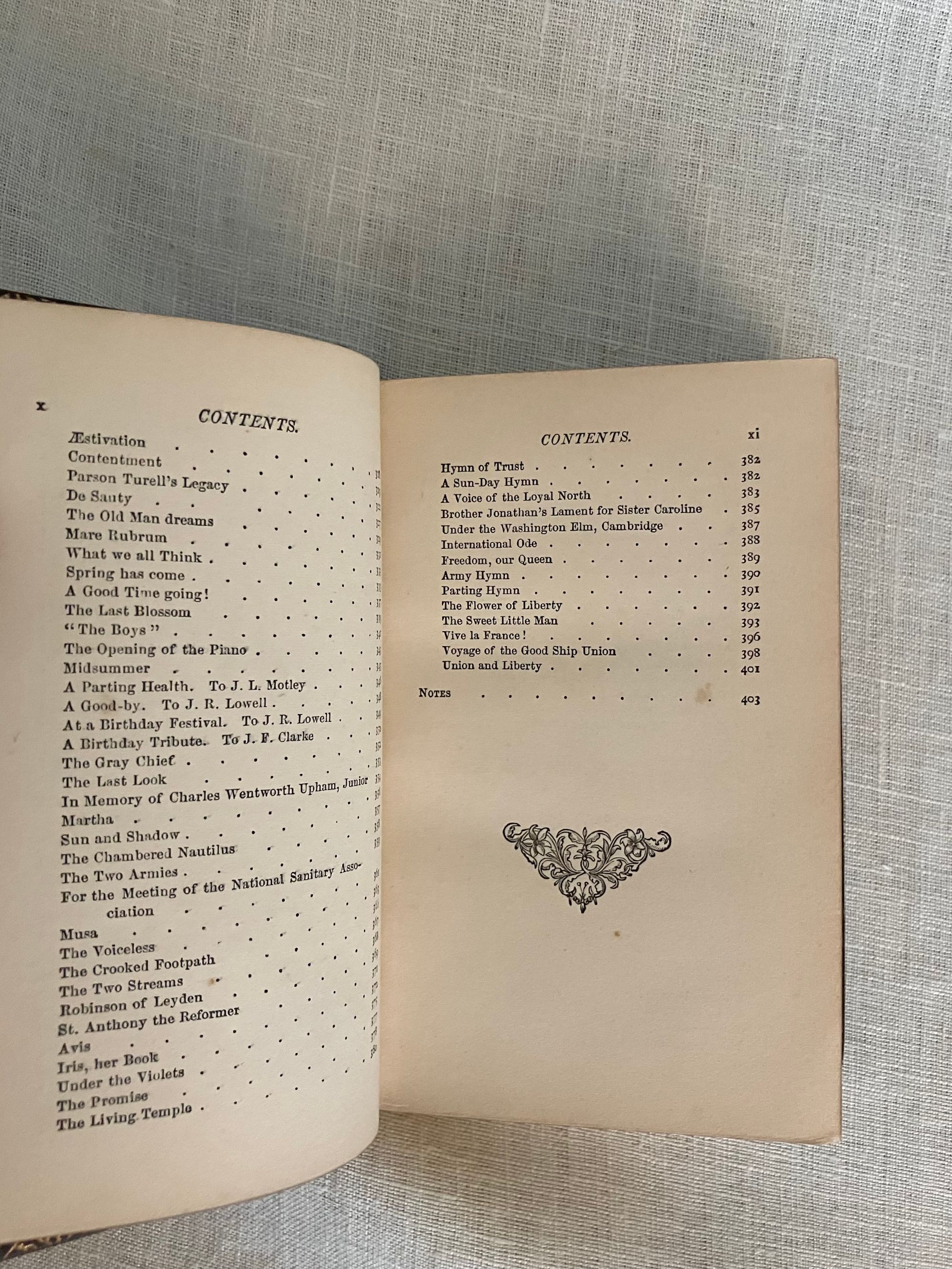 Reprint. Hard cover 24 mo, in contemporary rebinding of full leather blind-stamped with triple-ruled border featuring a design of Gothic-style interlaced circles with floral decoration, the spine with five raised bands and the title blocked in gold, marbled end papers with the dentelles and board edges blocked in gold, all edges gilt, tissue-guarded engraved frontispiece portrait of the Author, xi, (1-5) 6-410 pp., stated Fifteenth Edition.**Condition: Very Good. Some old black ink stains to both boards. Very light rubbing to two corners. Original owner's signature in pencil to ffep., small Washington DC. bookseller's label to front pastedown. Gentle age toning, moderate to title page, otherwise very clean and tight.**This work is an anthology of the beloved Boston-born Poet, physician and all round man of letters, Oliver Wendell Holmes Sr. (1809-1894.) Included are: Poetry: a Metrical Essay (1836); Miscellaneous Poems ( 1830 et al ); and Songs in Many Keys (1861). **Provenance: Virginia (Dodge) Poore, (1826-1894) born Washington D.C., married to fellow-Bay Stater, the influential Washington journalist, foreign correspondent, and author, Maj. Ben: Perley Poore (1820-1887). He was also the first President of Washington's Gridiron Club. The Poores would live the latter part of their lives at his family home in West Newbury, Massachusetts. BAL 7226.( See our listing 8938 for item in a matching binding from the same library; the owner rebound many of their books from the original cloth as a matter of course.)