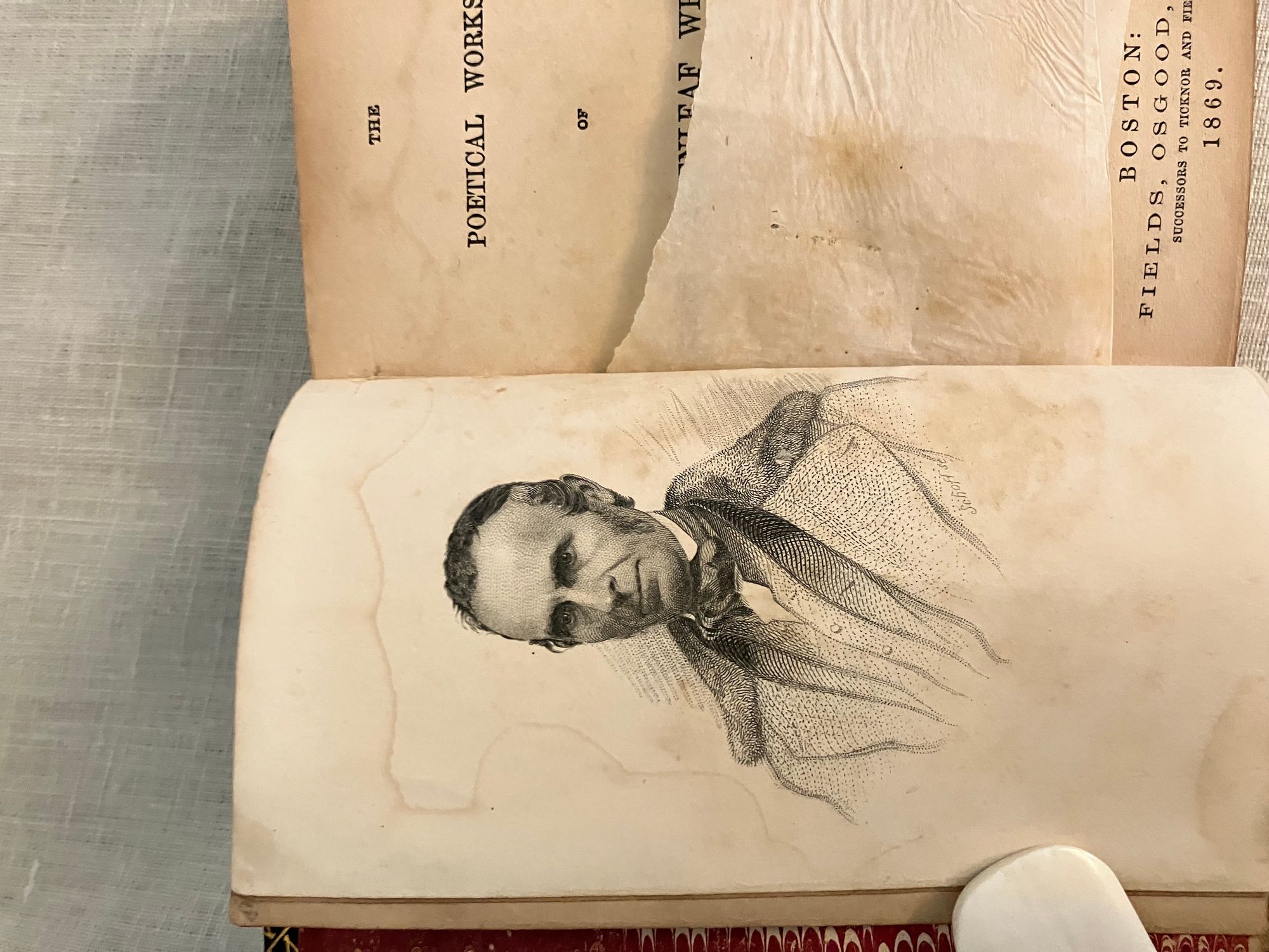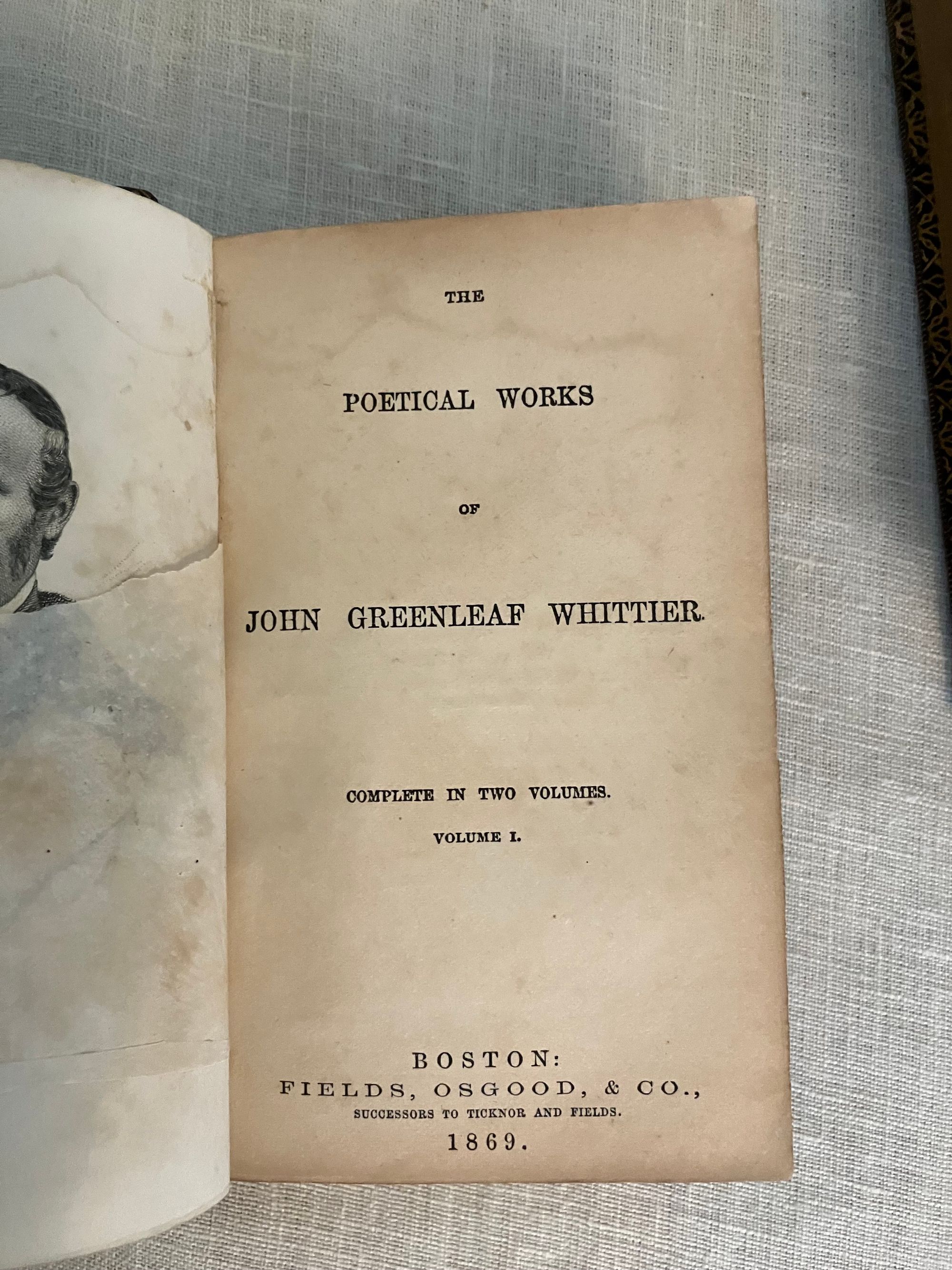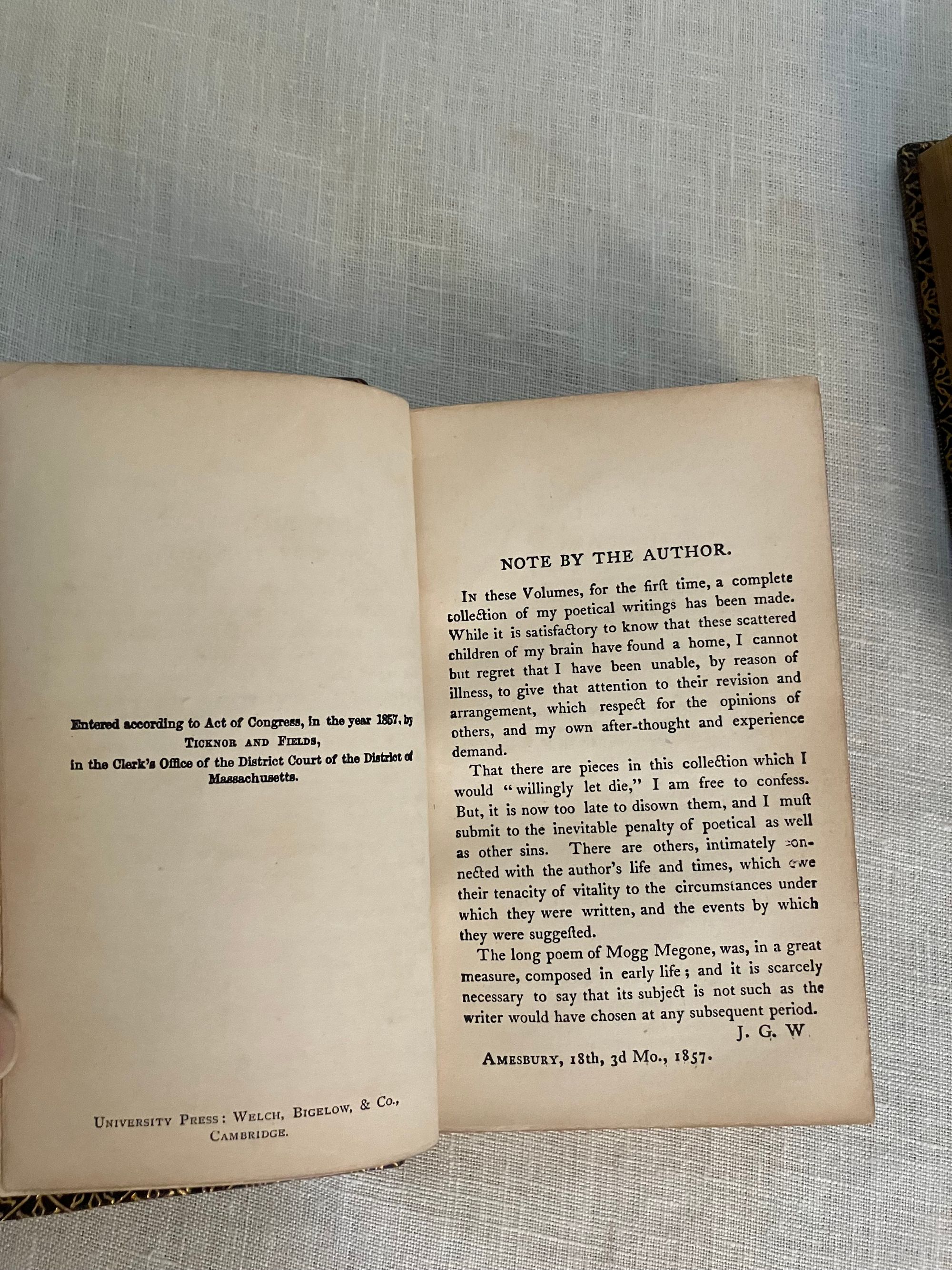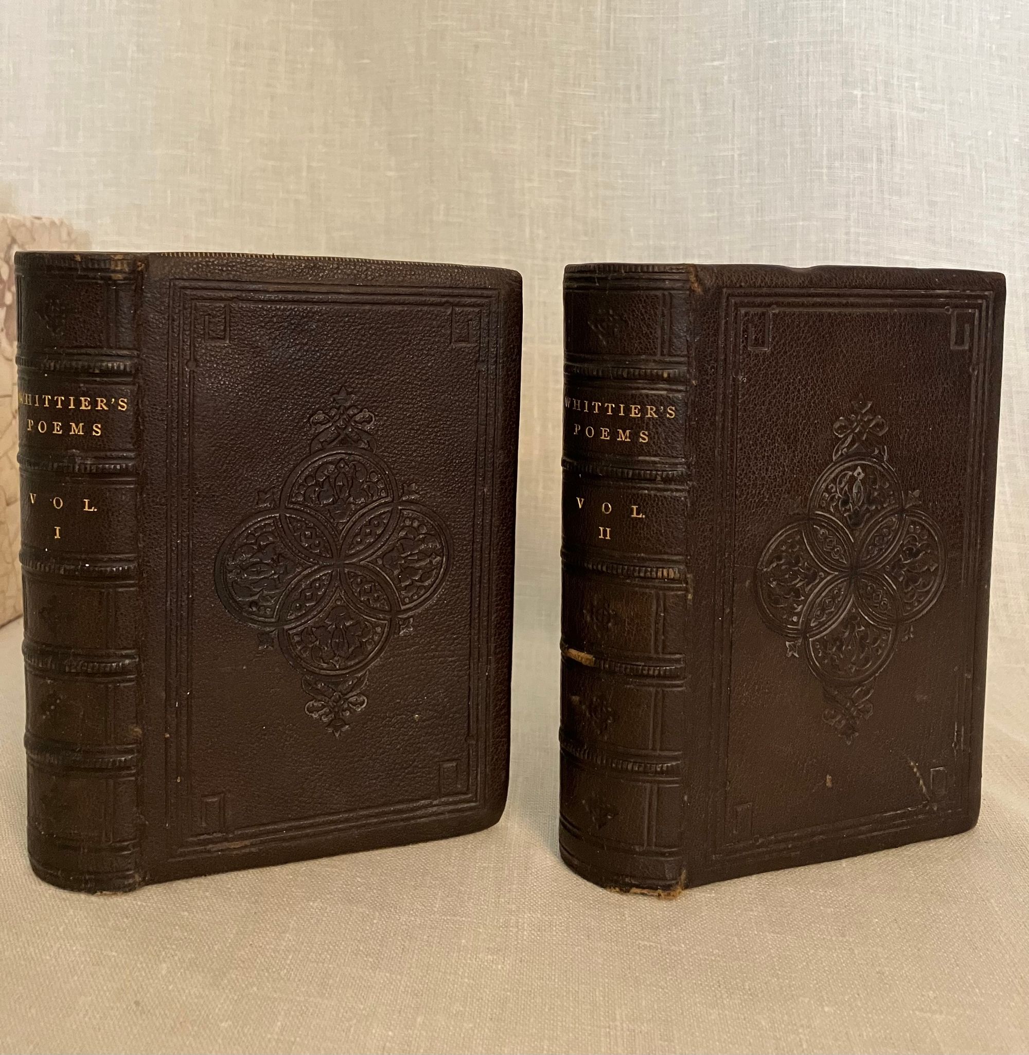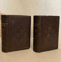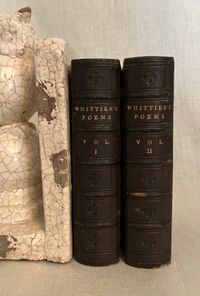 Stated 1869 reprint. [Copyright 1857 Ticknor & Fields] Hard cover , 24mo. in a contemporary re-binding of full leather blind stamped with triple ruled border featuring a design of Gothic-style interlaced circles with floral decoration, the spine with five raised bands and the title blocked in gold, marbled end papers with the dentelles and board edges blocked in gold, all edges gilt, and tissue-guarded engraved frontispiece portrait of the Author, viii plus 395 and vi plus 420 pp. There are included text annotations at the end of each volume. **Condition: Very Good. Some marks, one scuff, to covers. Light rubbing at foot of both spines, and along one raised band of Vol. 2. Dent at top edge where Vol 1 was likely tied together at some point (?). Sign of some pooling water damage to very bottom of front pastedown of Vol. 1 causing minor bubble (--house was involved in a fire in the 1950's causing books to be hastily rescued. ) A small tideline appears on the preliminaries of Vol 1 affecting the author portrait, which has also lost parts of its tissue guard. Title page on Vol. I a more tanned than the rest of text. Overall, however, this is a handsome set: tight, clean and bright. Gilt remains bright. **Haverhill, Massachusetts-born John Greenleaf Whittier (1807-1892), was considered one of the two best nineteenth century American poets. In the Author's preliminary Note to the edition, he states this represents "for the first time, the complete collection of my poetic works." (p. iii) Prior titles included in the anthology include The Early and Legendary Poems, Voices of Freedom (works on abolition and slavery); Miscellaneous, ; In War Time (1857); Home Ballads and Occasional Poems. Vol. II Includes Songs of Labor, and Other Poems (1850), The Chapel of Hermits and Other Poems (1852); The Panorama, and Other Poems (1856); Ballads; Later Poems (1856-7); Home Ballads and Poems and Lyrics.**Provenance: Maj.Ben: Perley Poore or his wife Virginia (Dodge) Poore. Purchased directly from descendants. (See also our inventory no. 8937 for matching item, signed.) The book here was likely purchased in Washington DC, although the bookseller's label has now gone, where Virginia purchased (and signed) the other item, in an identical binding and published in the same year. The influential Washington journalist, foreign correspondent, and author, Maj. Ben: Perley Poore (1820-1887) was also the first President of Washington's Gridiron Club. The Perley Poores would live the latter part of their lives at his family home in West Newbury, Massachusetts. (Note: a copy showing the original cloth binding can be found online; a number of books from this owner were rebound in leather as a matter of course.) OCLC 1157063912.