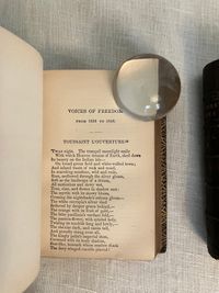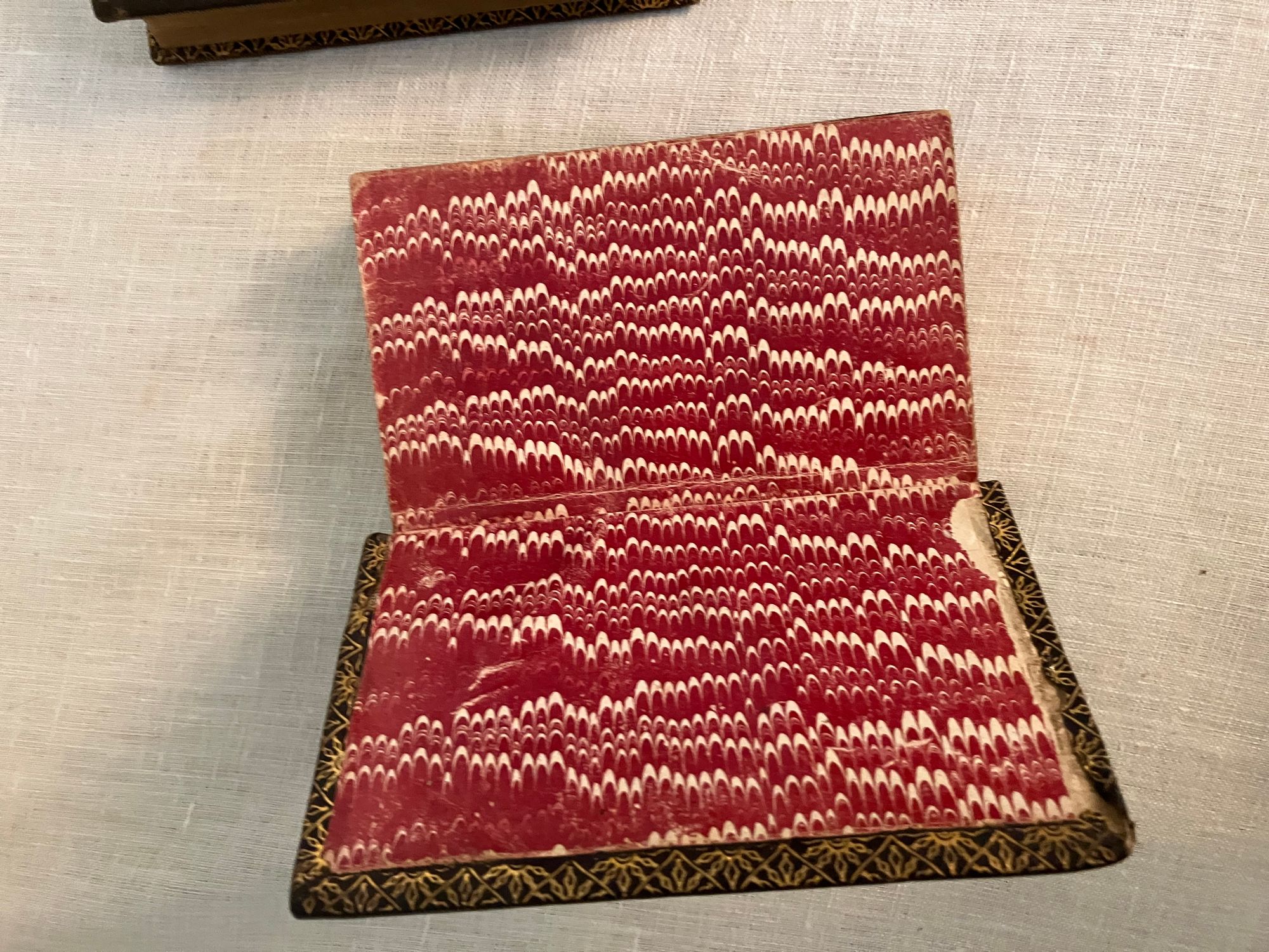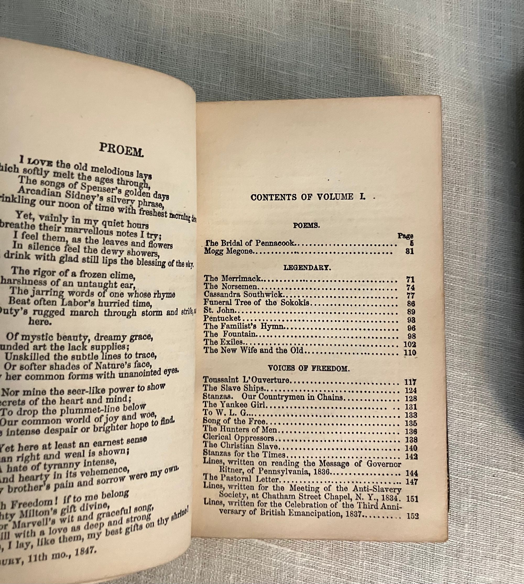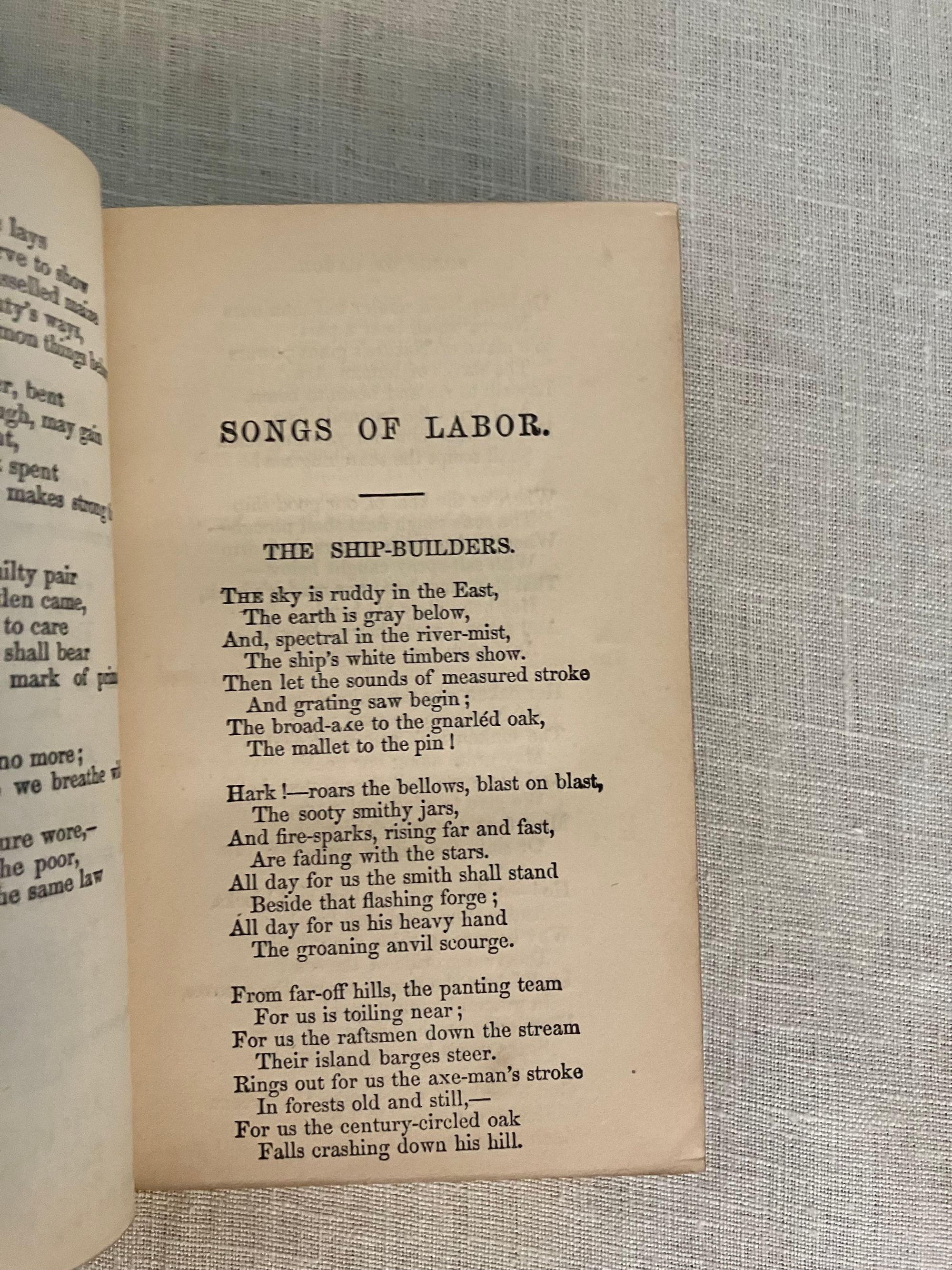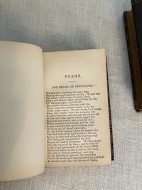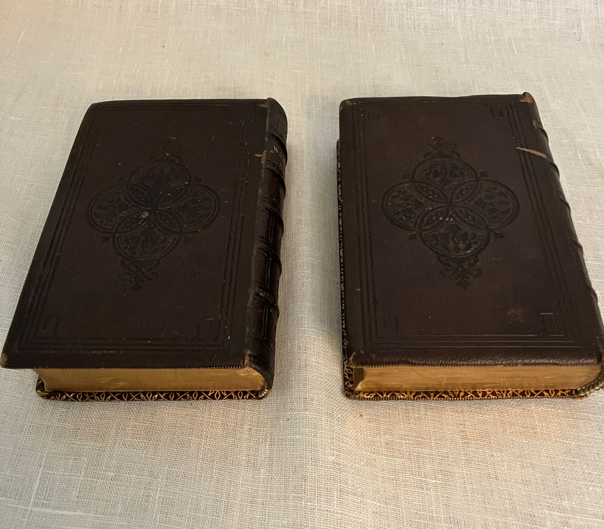 Stated 1869 reprint. [Copyright 1857 Ticknor & Fields] Hard cover , 24mo. in a contemporary re-binding of full leather blind stamped with triple ruled border featuring a design of Gothic-style interlaced circles with floral decoration, the spine with five raised bands and the title blocked in gold, marbled end papers with the dentelles and board edges blocked in gold, all edges gilt, and tissue-guarded engraved frontispiece portrait of the Author, viii plus 395 and vi plus 420 pp. There are included text annotations at the end of each volume. **Condition: Very Good. Some marks, one scuff, to covers. Light rubbing at foot of both spines, and along one raised band of Vol. 2. Dent at top edge where Vol 1 was likely tied together at some point (?). Sign of some pooling water damage to very bottom of front pastedown of Vol. 1 causing minor bubble (--house was involved in a fire in the 1950's causing books to be hastily rescued. ) A small tideline appears on the preliminaries of Vol 1 affecting the author portrait, which has also lost parts of its tissue guard. Title page on Vol. I a more tanned than the rest of text. Overall, however, this is a handsome set: tight, clean and bright. Gilt remains bright. **Haverhill, Massachusetts-born John Greenleaf Whittier (1807-1892), was considered one of the two best nineteenth century American poets. In the Author's preliminary Note to the edition, he states this represents "for the first time, the complete collection of my poetic works." (p. iii) Prior titles included in the anthology include The Early and Legendary Poems, Voices of Freedom (works on abolition and slavery); Miscellaneous, ; In War Time (1857); Home Ballads and Occasional Poems. Vol. II Includes Songs of Labor, and Other Poems (1850), The Chapel of Hermits and Other Poems (1852); The Panorama, and Other Poems (1856); Ballads; Later Poems (1856-7); Home Ballads and Poems and Lyrics.**Provenance: Maj.Ben: Perley Poore or his wife Virginia (Dodge) Poore. Purchased directly from descendants. (See also our inventory no. 8937 for matching item, signed.) The book here was likely purchased in Washington DC, although the bookseller's label has now gone, where Virginia purchased (and signed) the other item, in an identical binding and published in the same year. The influential Washington journalist, foreign correspondent, and author, Maj. Ben: Perley Poore (1820-1887) was also the first President of Washington's Gridiron Club. The Perley Poores would live the latter part of their lives at his family home in West Newbury, Massachusetts. (Note: a copy showing the original cloth binding can be found online; a number of books from this owner were rebound in leather as a matter of course.) OCLC 1157063912.