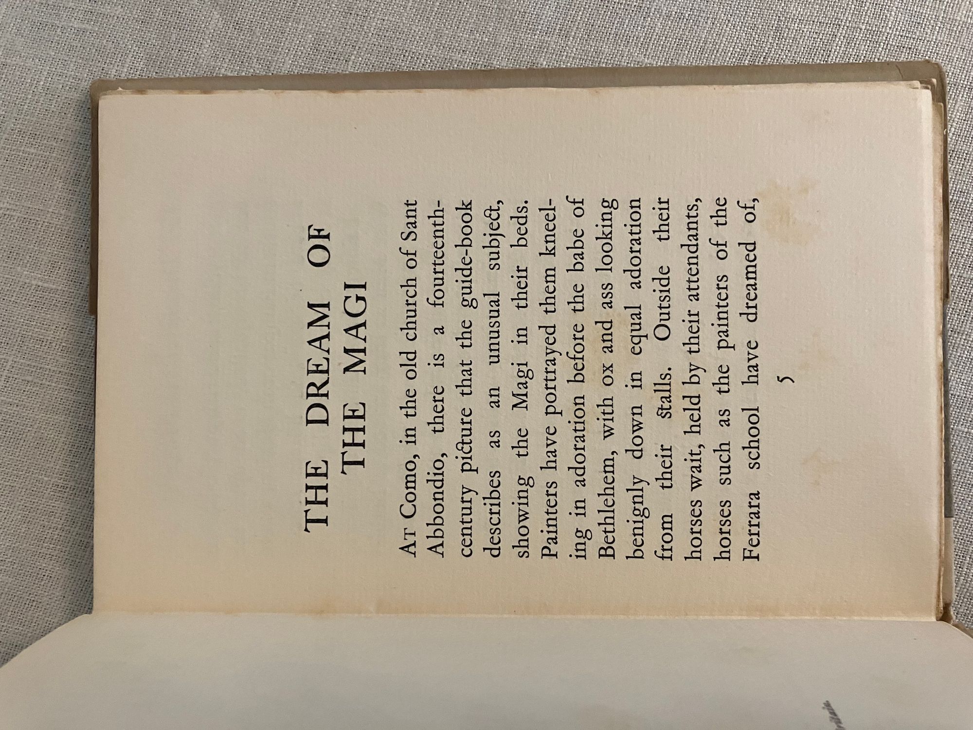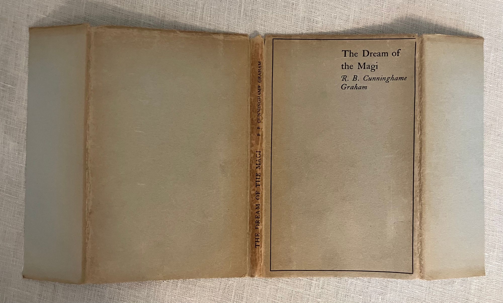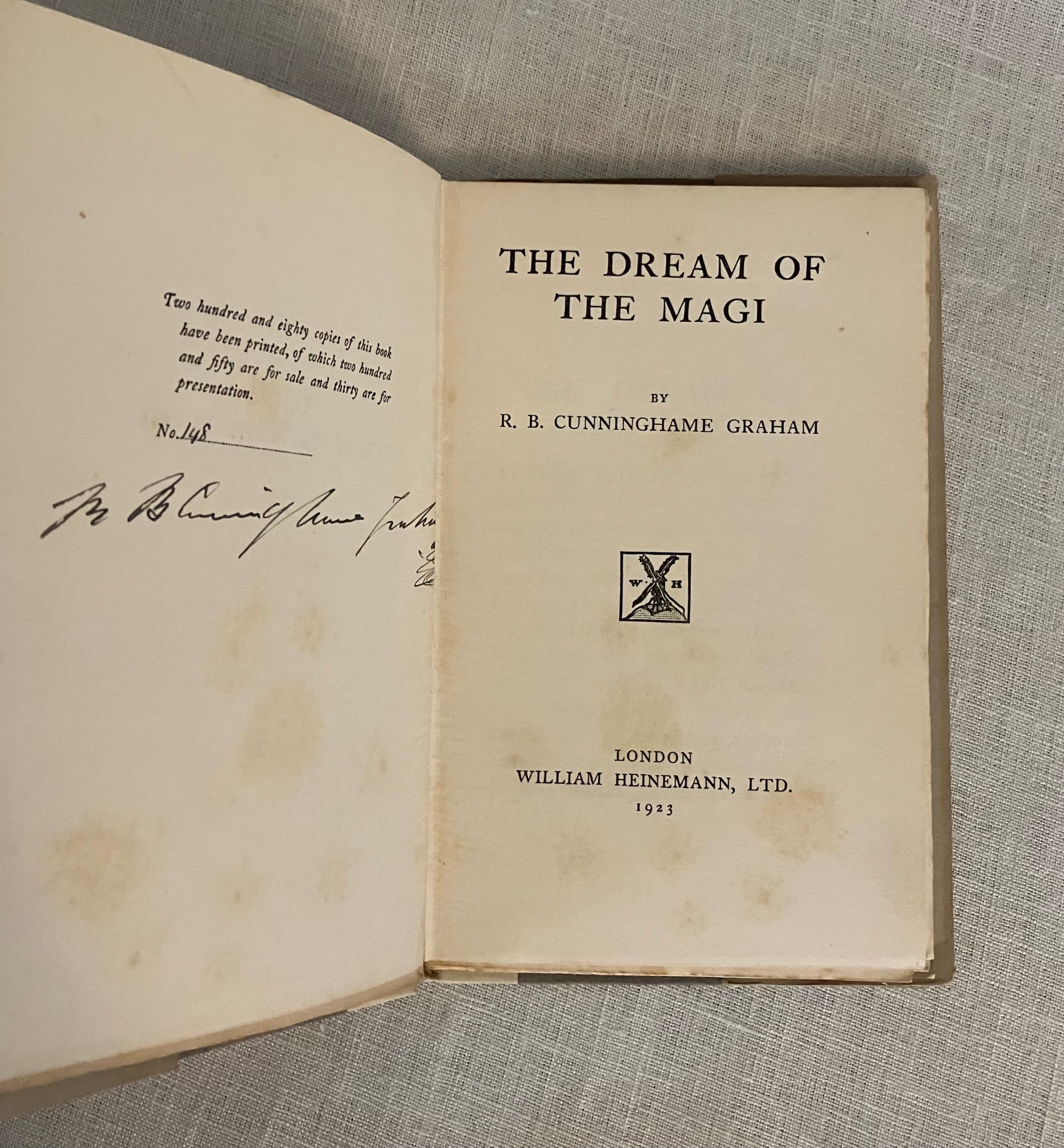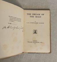 Hard cover, 12mo., pp 43 [1]. Signed by author. Limited edition: number 148 of the 250 for sale; (another 30 for presentation.) Printed by Richard Clay & Sons Ltd., Printers, Bunguay, Suffolk. In publisher's quarter cream cloth, over blue covered paper boards. Paper label to front cover, and gold lettering to spine. Plain olive-gray dust jacket with titles to front and spine. Fore-edge of text block untrimmed. Condition: Very Good. Light foxing throughout. Light shelf wear to bottom edge of covers. Author signature on limitation page "goes over" to gutter of p. 15 (signed when sheets were unbound presumably.) Dust jacket dust-soiled on spine, with tiny loss to head of spine, now protected in mylar. ** A retelling of the journey the Magi took across the desert to Bethlehem, inspired by the image of the sleeping Magi on the walls of Sant Abbondio church in Como, Italy. ** Scottish politician and author, Robert Bontine Cunninghame Graham (1852-1936), was the child of a Scottish admiral and a Spanish noblewoman. He grew up on a family ranch in Argentina, and was there kidnapped by rebel gauchos, who named him "Don Roberto". He escaped, but retained a lifelong desire to help the underclass. He married a "Chilean poetess", Gabrielade la Belmondiere, who was actually a British actress, Caroline Horsfall. Together they travelled through France, Germany, America and finally Mexico, where Graham taught fencing and his wife taught guitar. On his father's death in 1883, Graham returned to Scotland to manage the family estates at Gartmore (near Stirling, in central Scotland). Like many landed gentry, he turned to politics and was elected to Parliament as a Liberal. Graham did not care much for the niceties of Parliamentary etiquette, and was the first MP ever to be suspended for swearing (he said "damn"!). He advocated for the removal of the (hereditary) House of Lords and for an eight-hour working day. He founded the Scottish Labour Party along with James Keir Hardie in 1888, and became its first president. His political career was derailed when, as a prospective Labour MP, he failed to win the seat for Glasgow Camlachie in 1892. ** Graham then turned to his adventurous past to become a writer. Known for travel books, as well as for atmospheric short stories, or "literary sketches", he also named the "prince of the preface" for his many contributions to other books. In "A Vanished Arcadia" (1901) he described the treatment of the Indians in Paraguay under both the Jesuits as well as the Spanish colonial leaders; the 1986 film "The Mission" was loosely based on this work.