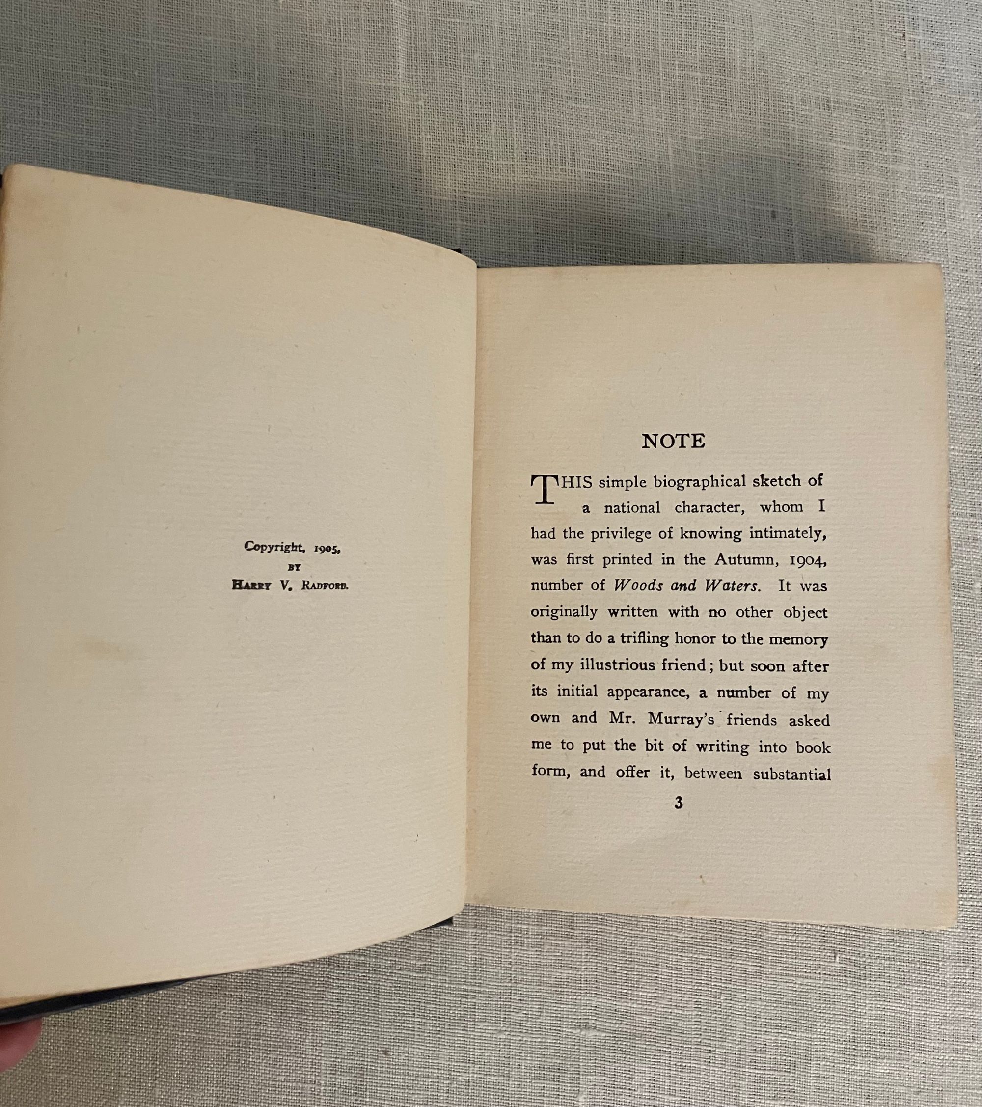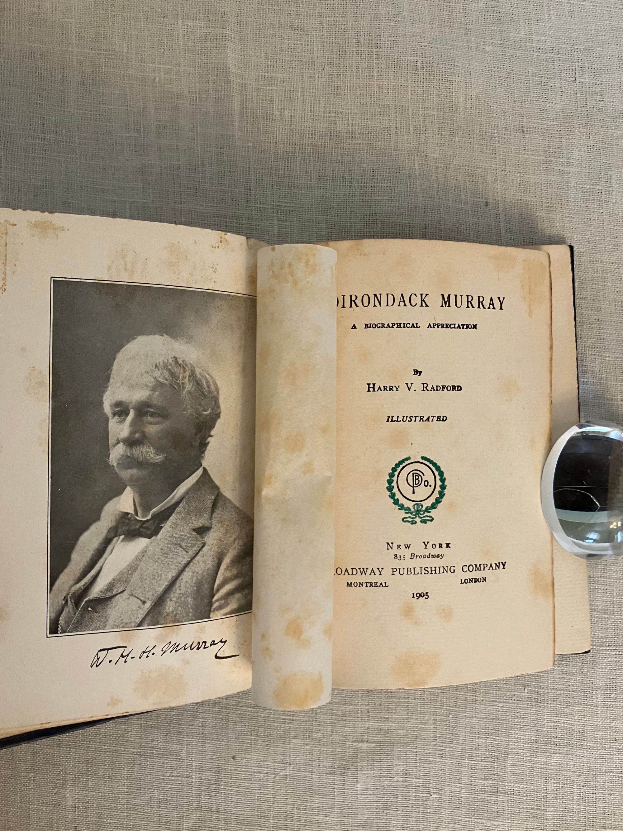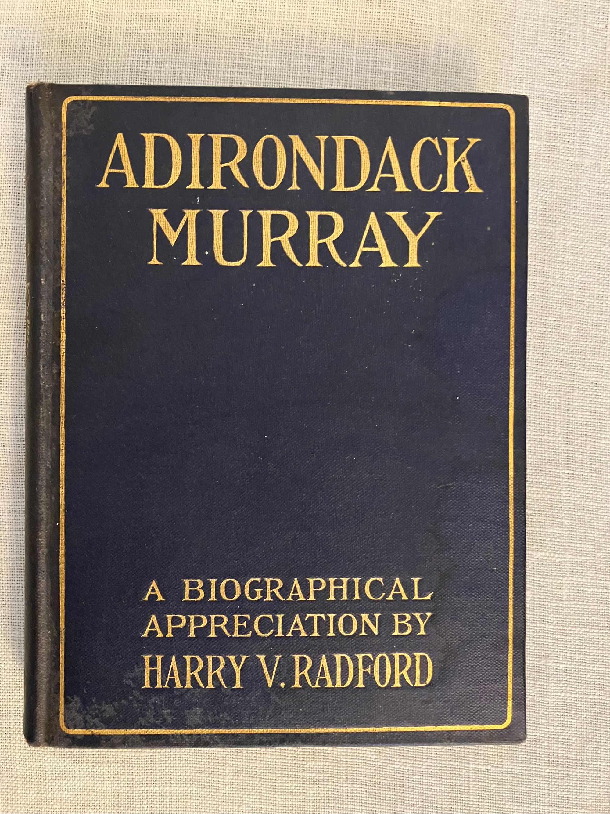 Hard cover, 32 mo, in blue cloth , the titles blocked in gold to the top board and the spine, (8) 84 pp., First Edition in book form. Condition: Very Good. Some water damage to front board, browning to paste-downs. Foxing opposite photogravure illustrations. Otherwise clean. **This is a biographical sketch of the father of the Outdoors Movement, William Henry Harrison Murray (1840-1904), as told by Harry V. Radford , editor and publisher of "Woods and Waters Magazine," in which this was first serialized beginning the Autumn of 1904. (p.3.) Radford describes his friend Murray as "The Great Evangelist of Outdoor Life for the People." This is a psychological look at the forces which shaped the life of an extraordinary man; early poverty, self-sufficiency, the hard farm work from a young age used to pay for his own education; all these character-building ways the young man was led to his later callings as an original thinker, famed orator, and author. Murray's dalliance with progressive ideas at Boston's Park Street Church, his exploration and settlement in the Adirondacks, marriage and family life, and finally the arc of his various careers as an increasingly progressive voice. **The Author, Harry V. Radford (d. 1914), is described in the pages of Adirondack Life, (C. Jerome," A Legend in his Own Mind," 9/10/2019) as using his friendship with his mentor Murray, his magazine and extensive travels to promote conservation: "He called for more state and national parks, removal of all bounties on wildlife, prohibiting the killing of birds for the feather trade and saving the buffalo. Closer to home, he promoted Adirondack businesses and guides, and campaigned vociferously for closed seasons on bear. His most energetic efforts involved restoration of species that had been depleted or were extinct in the Adirondacks, namely beaver and moose (and elk, in the mistaken notion that they had been indigenous)." Radford and his fellow explorer T. George Street, were murdered in an ill-fated trip into the Arctic Circle in 1914 (as engagingly told in the aforementioned article.)