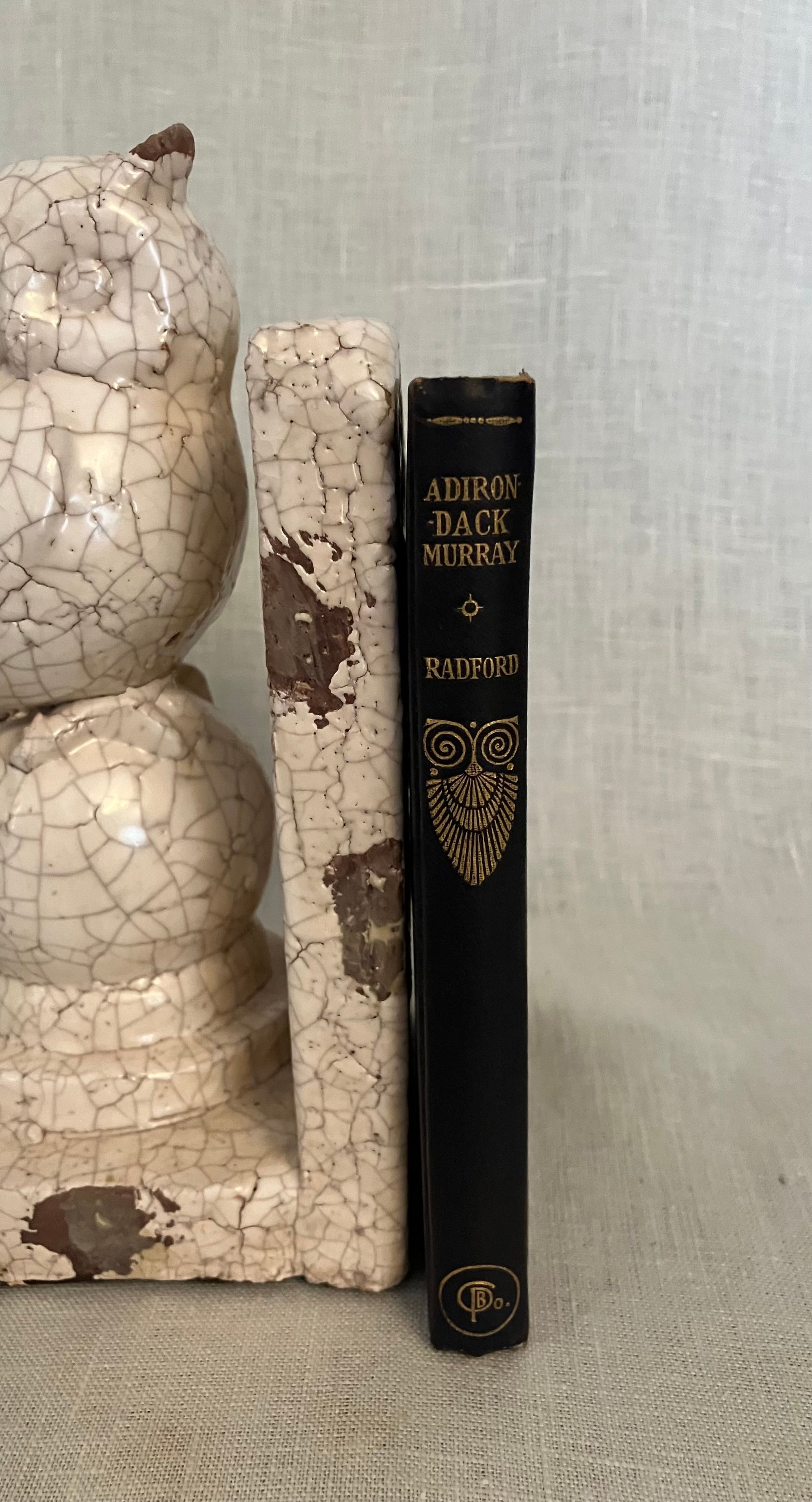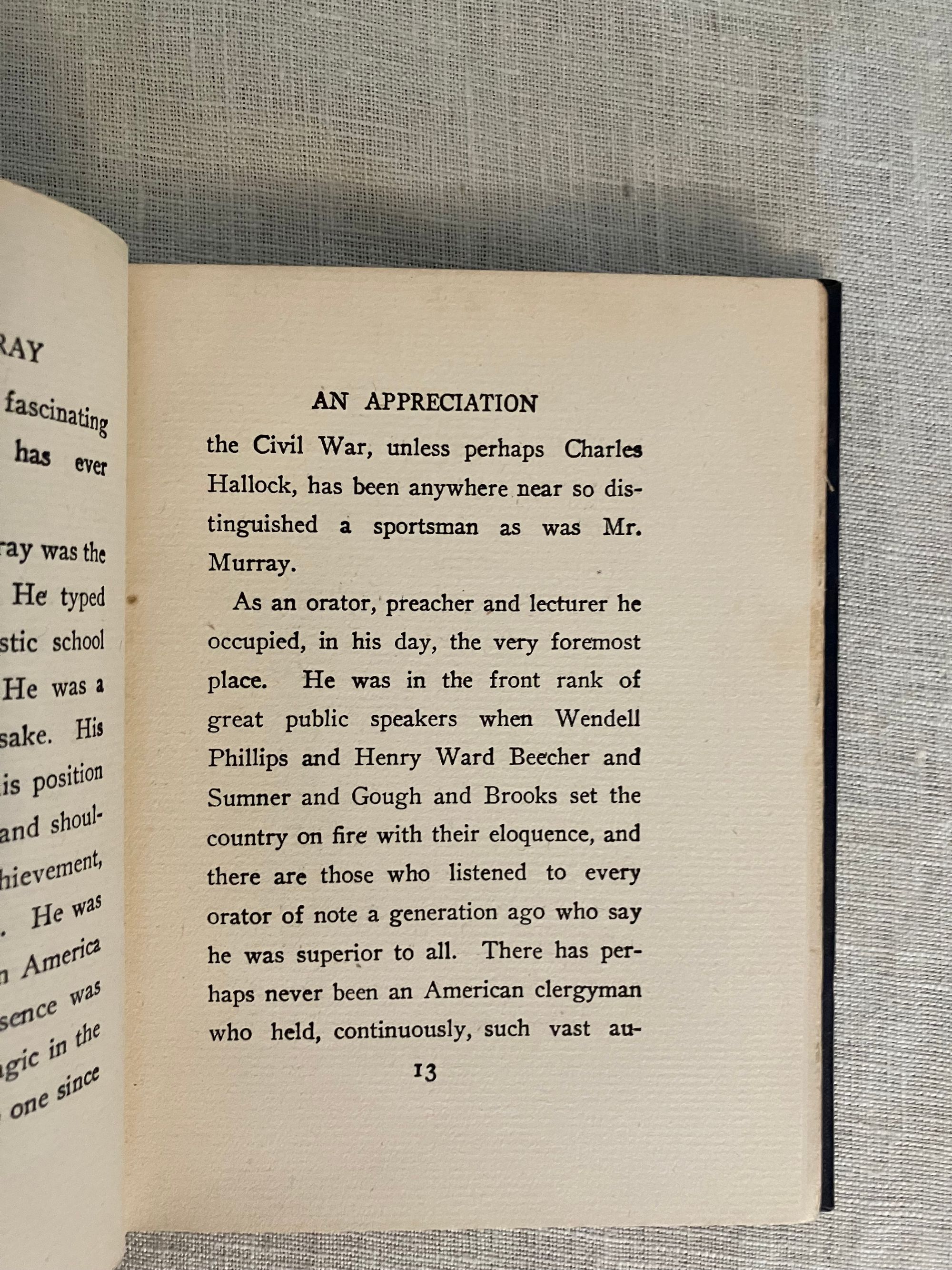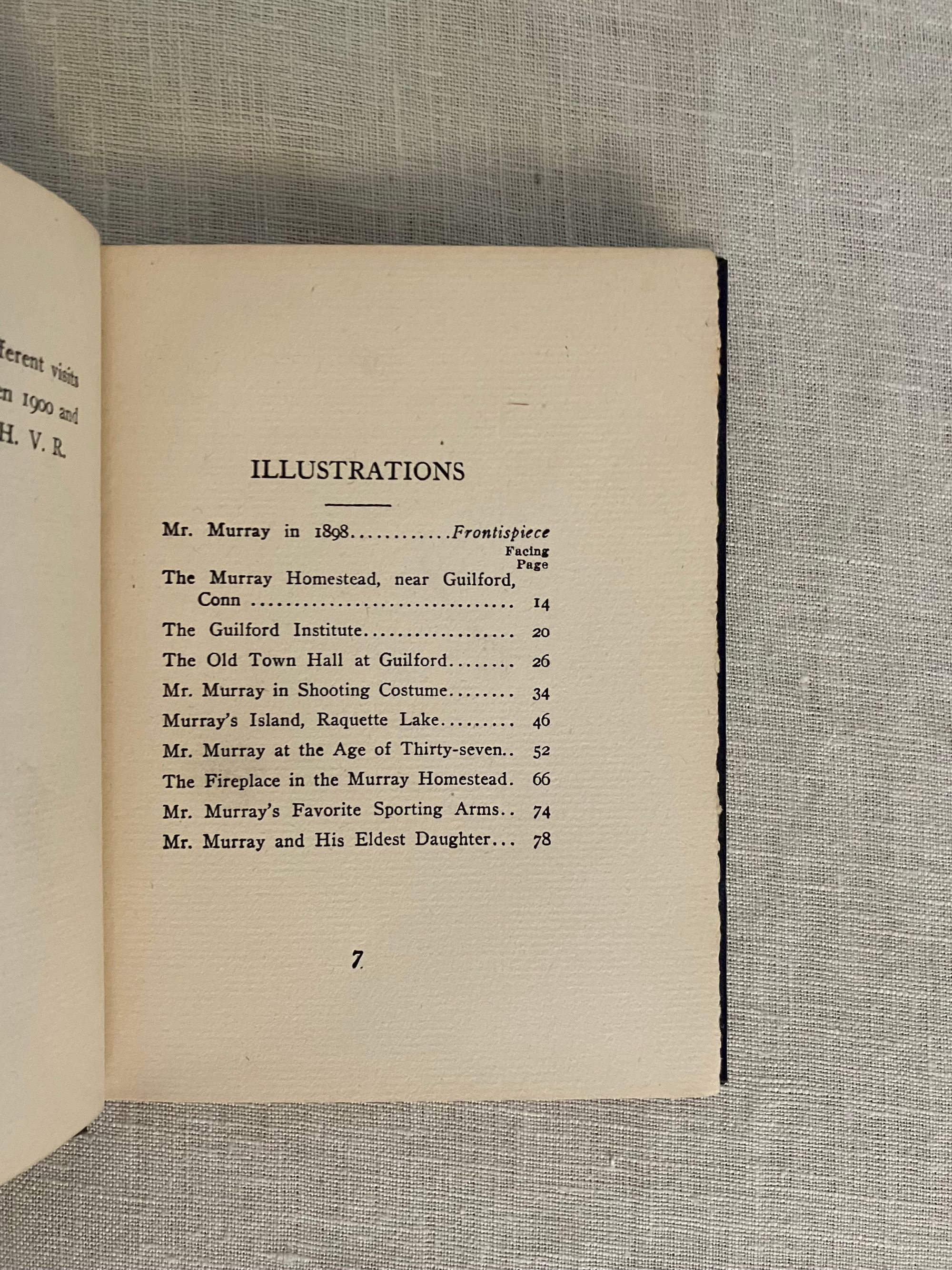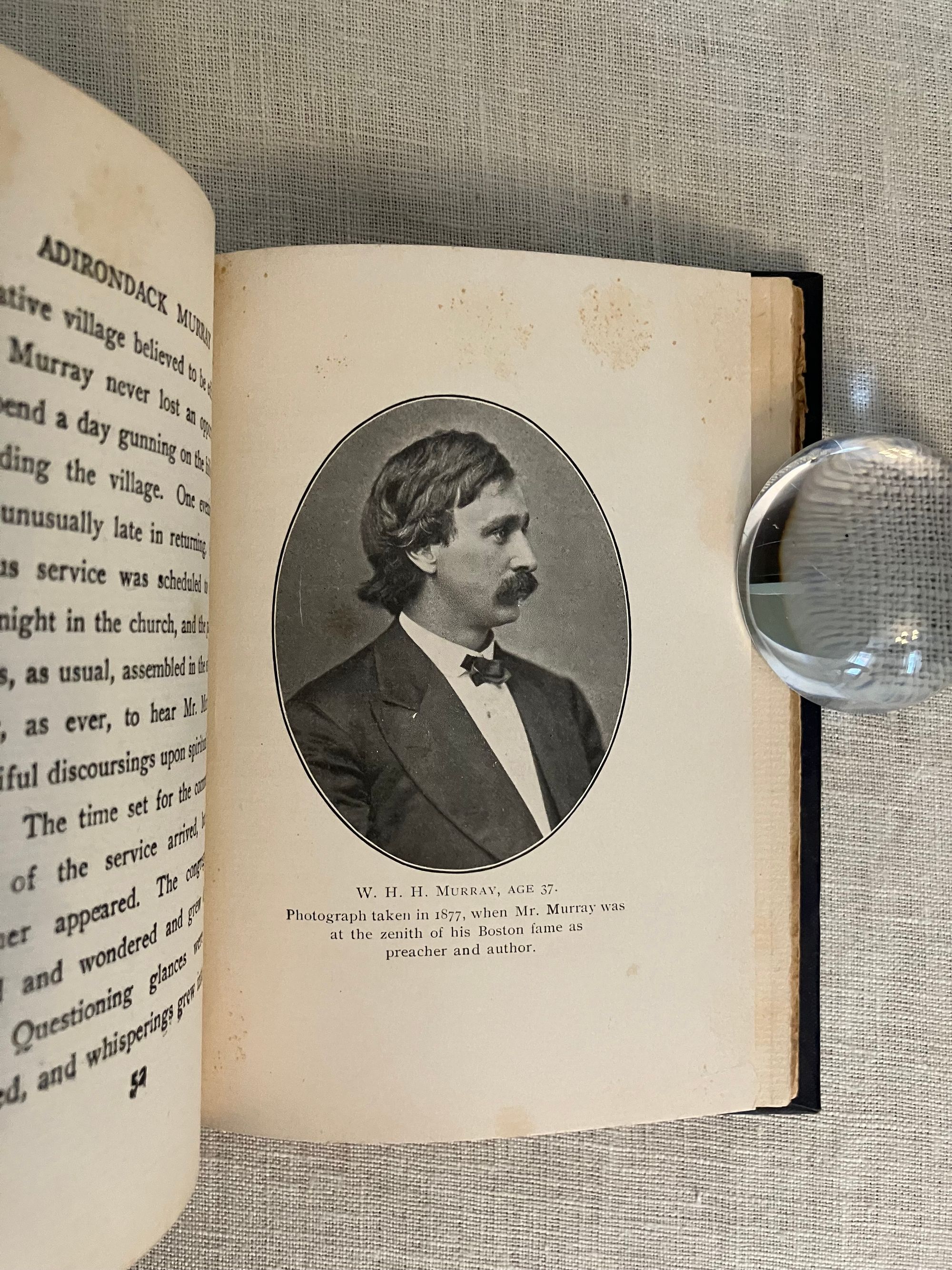 Hard cover, 32 mo, in blue cloth , the titles blocked in gold to the top board and the spine, (8) 84 pp., First Edition in book form. Condition: Very Good. Some water damage to front board, browning to paste-downs. Foxing opposite photogravure illustrations. Otherwise clean. **This is a biographical sketch of the father of the Outdoors Movement, William Henry Harrison Murray (1840-1904), as told by Harry V. Radford , editor and publisher of "Woods and Waters Magazine," in which this was first serialized beginning the Autumn of 1904. (p.3.) Radford describes his friend Murray as "The Great Evangelist of Outdoor Life for the People." This is a psychological look at the forces which shaped the life of an extraordinary man; early poverty, self-sufficiency, the hard farm work from a young age used to pay for his own education; all these character-building ways the young man was led to his later callings as an original thinker, famed orator, and author. Murray's dalliance with progressive ideas at Boston's Park Street Church, his exploration and settlement in the Adirondacks, marriage and family life, and finally the arc of his various careers as an increasingly progressive voice. **The Author, Harry V. Radford (d. 1914), is described in the pages of Adirondack Life, (C. Jerome," A Legend in his Own Mind," 9/10/2019) as using his friendship with his mentor Murray, his magazine and extensive travels to promote conservation: "He called for more state and national parks, removal of all bounties on wildlife, prohibiting the killing of birds for the feather trade and saving the buffalo. Closer to home, he promoted Adirondack businesses and guides, and campaigned vociferously for closed seasons on bear. His most energetic efforts involved restoration of species that had been depleted or were extinct in the Adirondacks, namely beaver and moose (and elk, in the mistaken notion that they had been indigenous)." Radford and his fellow explorer T. George Street, were murdered in an ill-fated trip into the Arctic Circle in 1914 (as engagingly told in the aforementioned article.)