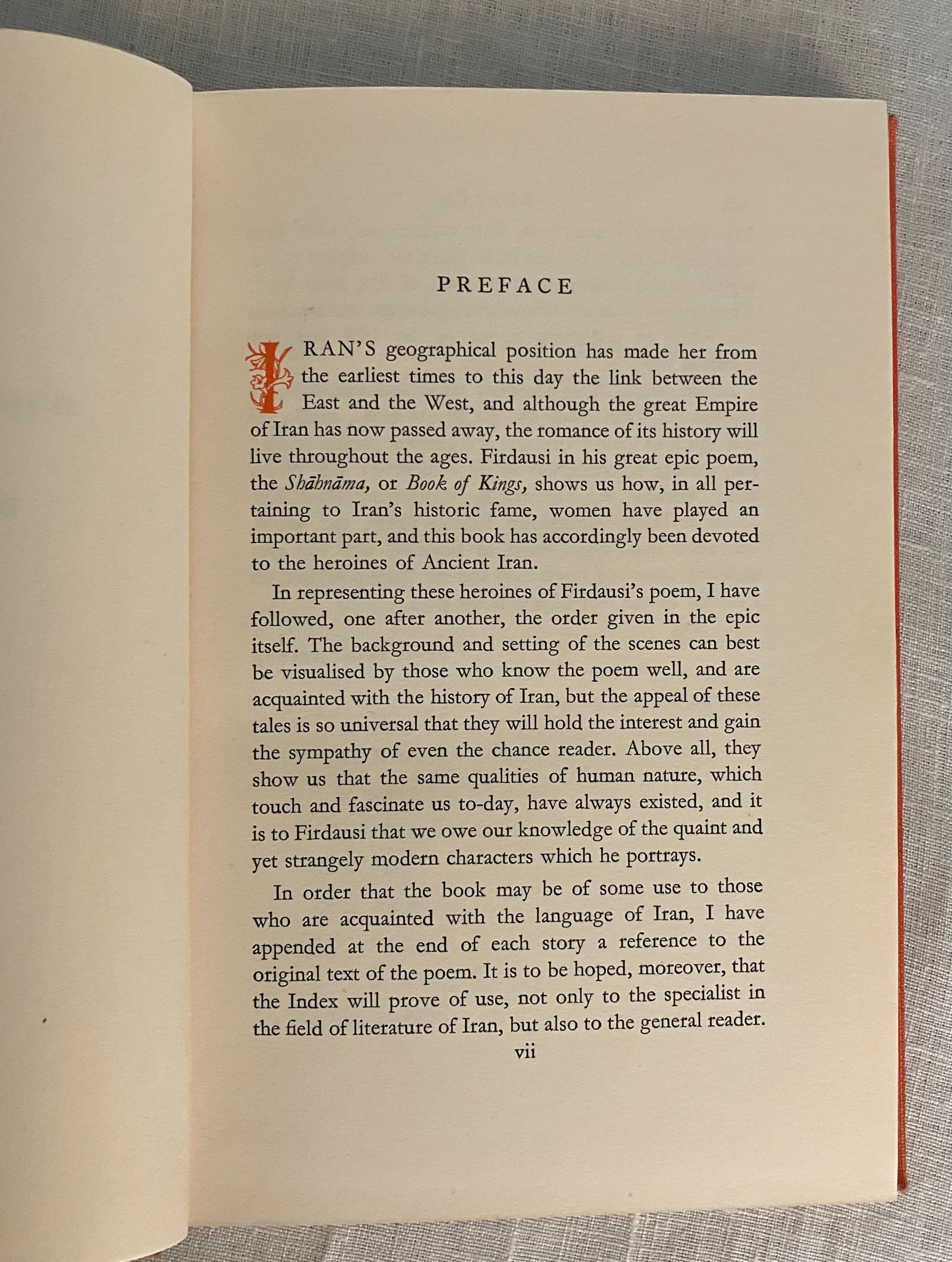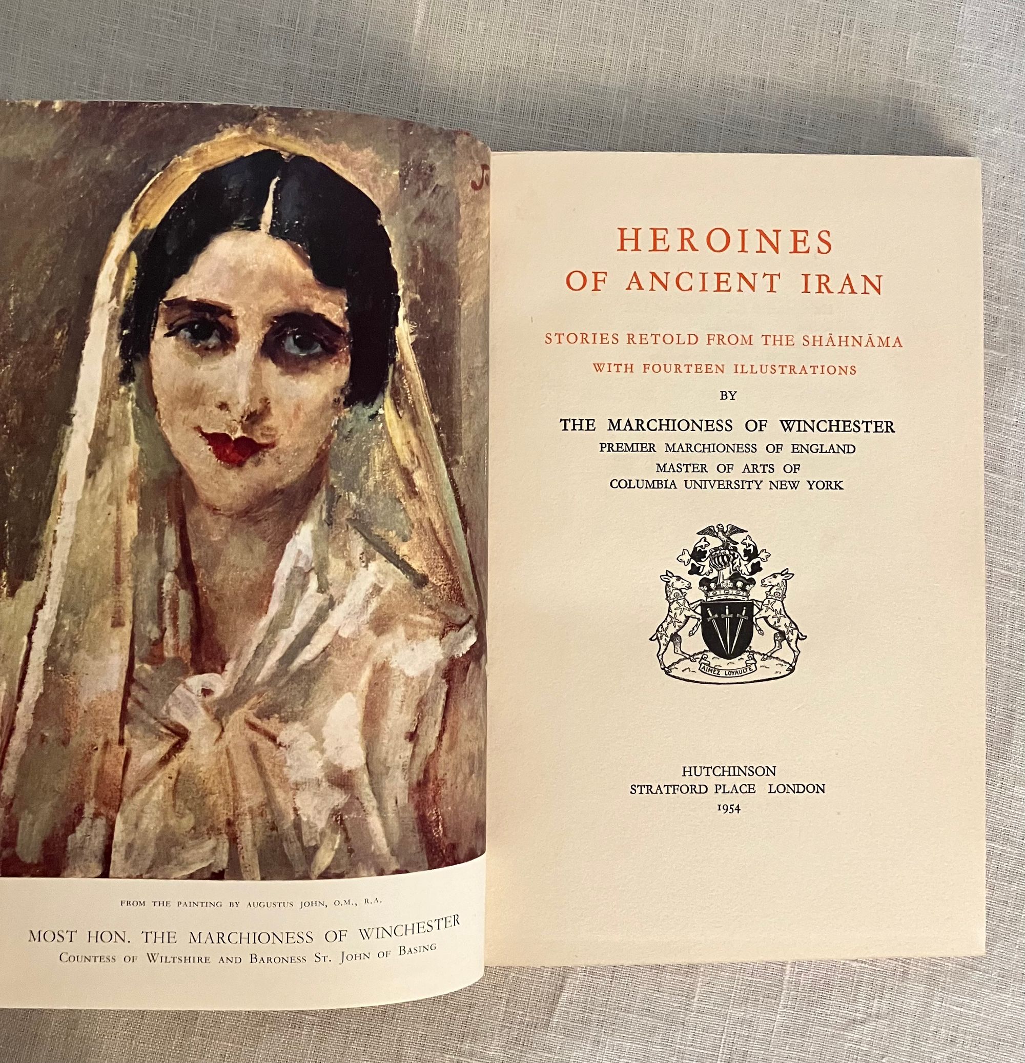 Hard cover, 8vo., 111 pp. Limited edition: number 78 of an edition of 250. In publisher's orange/red cloth binding with gold decorations featuring the coat of arms of the Marquess of Winchester. First published in 1930 as "The Heroines of Ancient Persia". Include illustrations taken from various editions of the original manuscript book. Condition: Near Fine. Some ink marks to covers, and rubbing to gilt. ** Abul-Qâsem Ferdowsi Tusi (940 - 1019 or 1025), more commonly known as Ferdowsi or Firdausi, was the author of an epic poem of the story of Iran, the Shāhnāma or "Book of Kings". The story of its creation is itself the stuff of folklore: the Sultan Mahmud of Ghazni commissioned Ferdowsi to write the epic poem for which he was promised a gold piece for every couplet completed. Given the choice of pay-as-you-go or a lump sum on completion, Ferdowsi chose the latter. Thirty years later, he finished the poem and asked for the 60,000 gold piece recompense. The sultan produced the coins, but the courtier who was to deliver the money disliked Ferdowsi, and so replaced the gold coins with silver. Upon seeing the subterfuge, Ferdowsi gave all the money away, wrote a satire on the sultan, and fled. Years later, the sultan learned of the courtier's deception and had him executed. He then dispatched the 60,000 gold coins to the city of Tus where Ferdowsi lived - with the gold-bearing caravan enterring the city just as the funeral procession for Fersdowsi was leaving the city gates -- he had died of a heart attack. ** The author Bapsybanoo "Bapsy" Pavry (1902-1995), was the daughter of a Parsi Zoroastrian priest and orientalist. She was raised in Bombay, and educated at Columbia University in New York. In 1952, she married the 90 year old Marquess of Winchester, who subsequently abandoned her to live with Eve Fleming (mother of Ian Fleming, of James Bond fame,) in Monte Carlo. Bapsy was painted several times by Augustus John, with the c.1930 portrait being the frontispiece of this book. Scarce limited edition. OCLC 265815792.