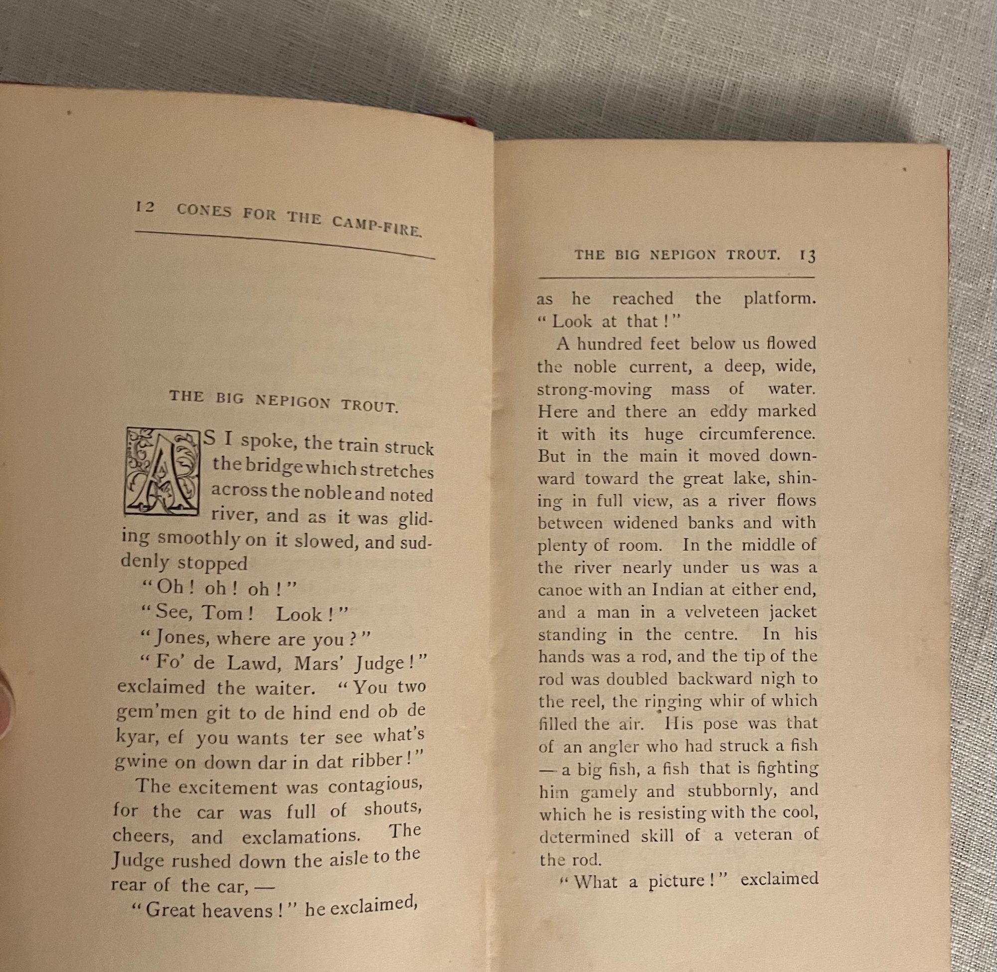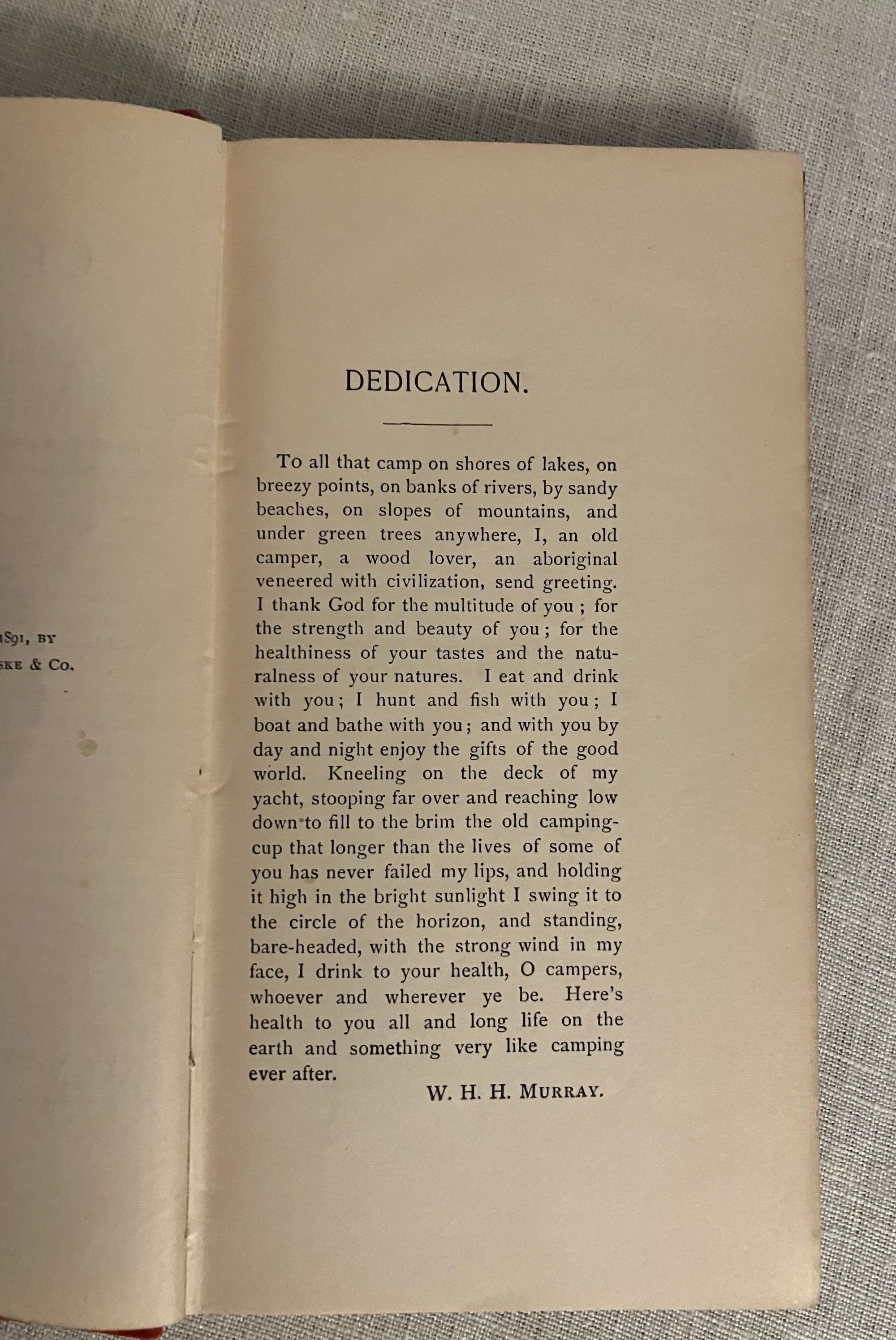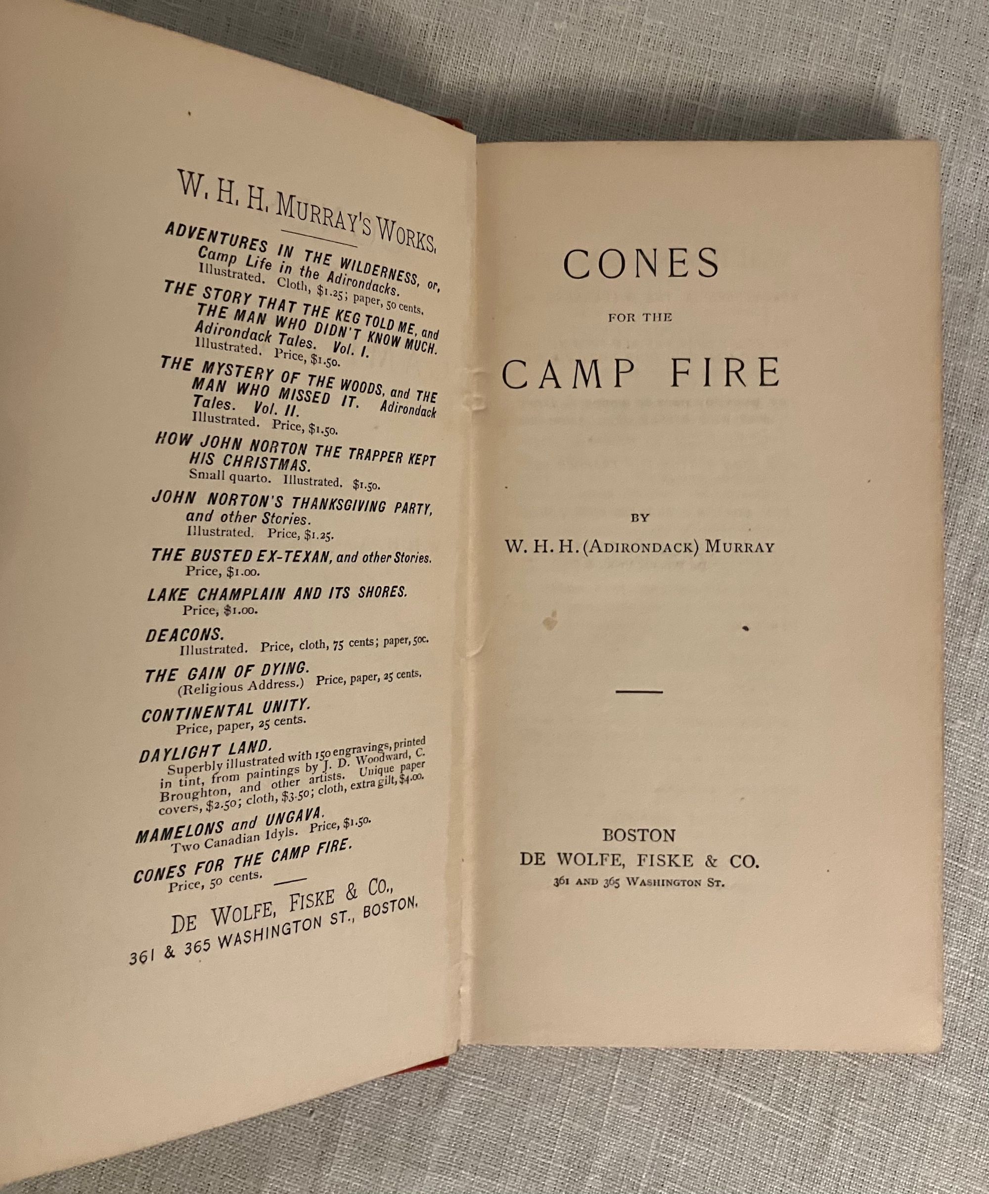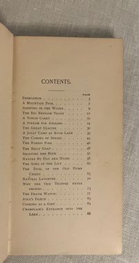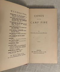 Hard cover, 16mo, in red cloth with pictorial pine cone bough and lean-to design blocked in black, titles to spine, 189 pp. with 1 page publisher's ad at front. Excerpts from his popular earlier works promoting the Outdoor Life, camping, hunting and fishing for the beneficial spiritual uplift of the comman man. Some bits are reprinted from "Adirondack Tales," by William Henry Harrison Murray (1840-1904.) Condition: Very Good Plus. Rear board sunned at top, with marks to same area. Hinges in order. Moderately age-toned. Old ink signature to front pastedown. Plum & Scribner 7328. Wright 3905.