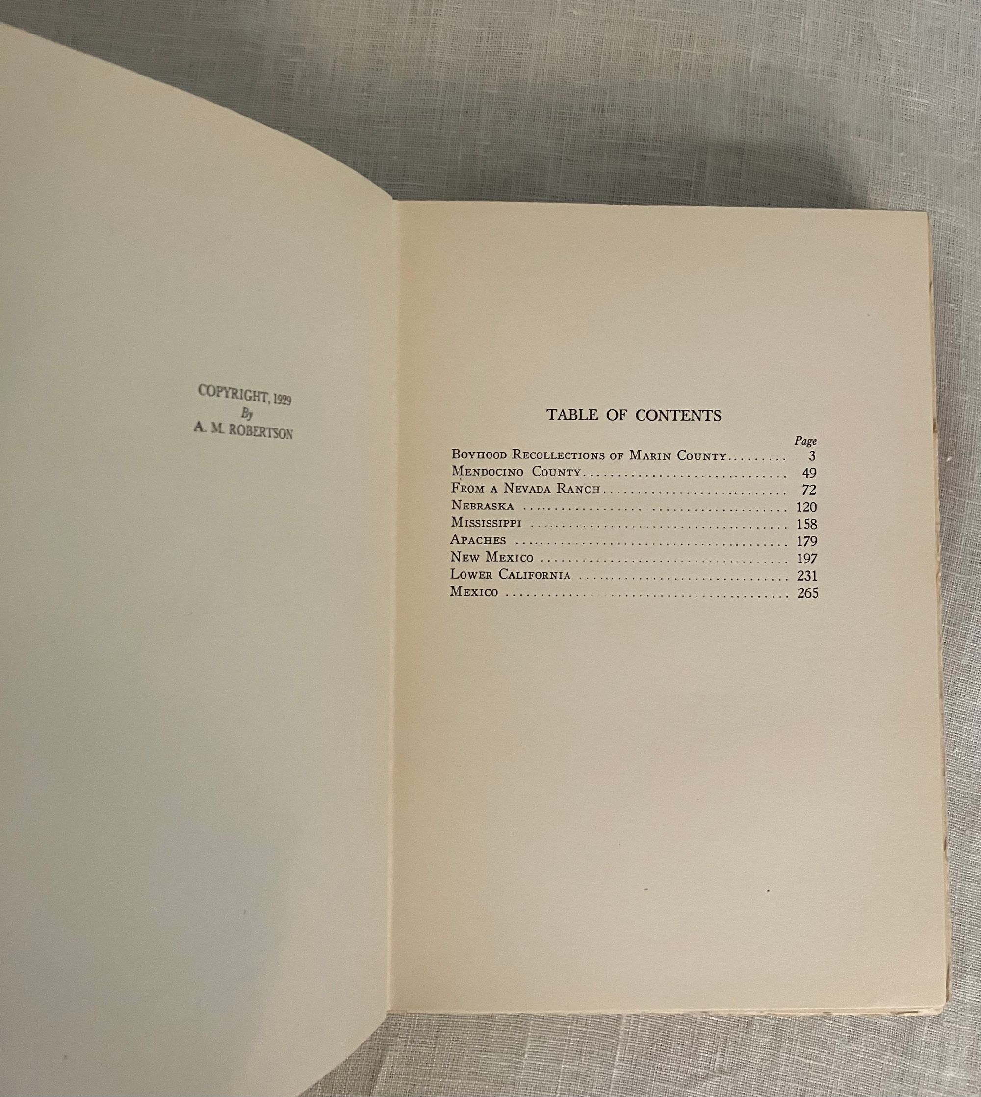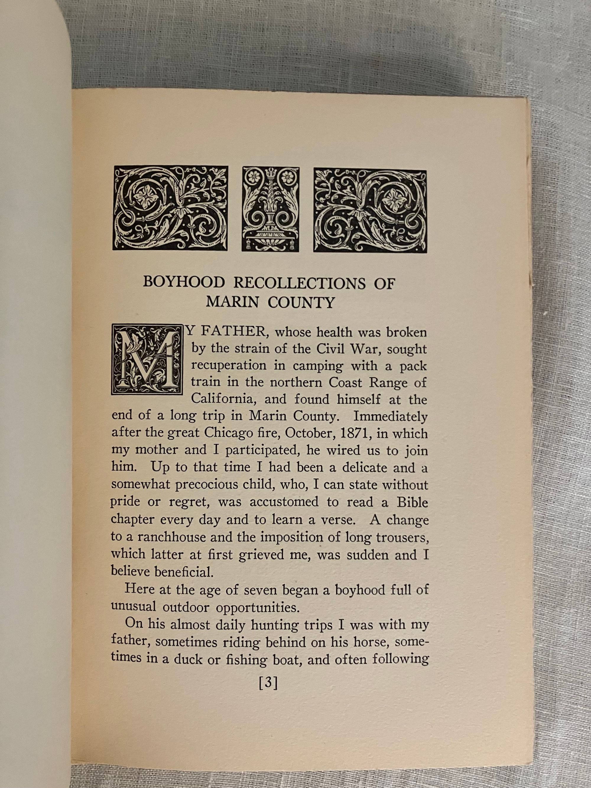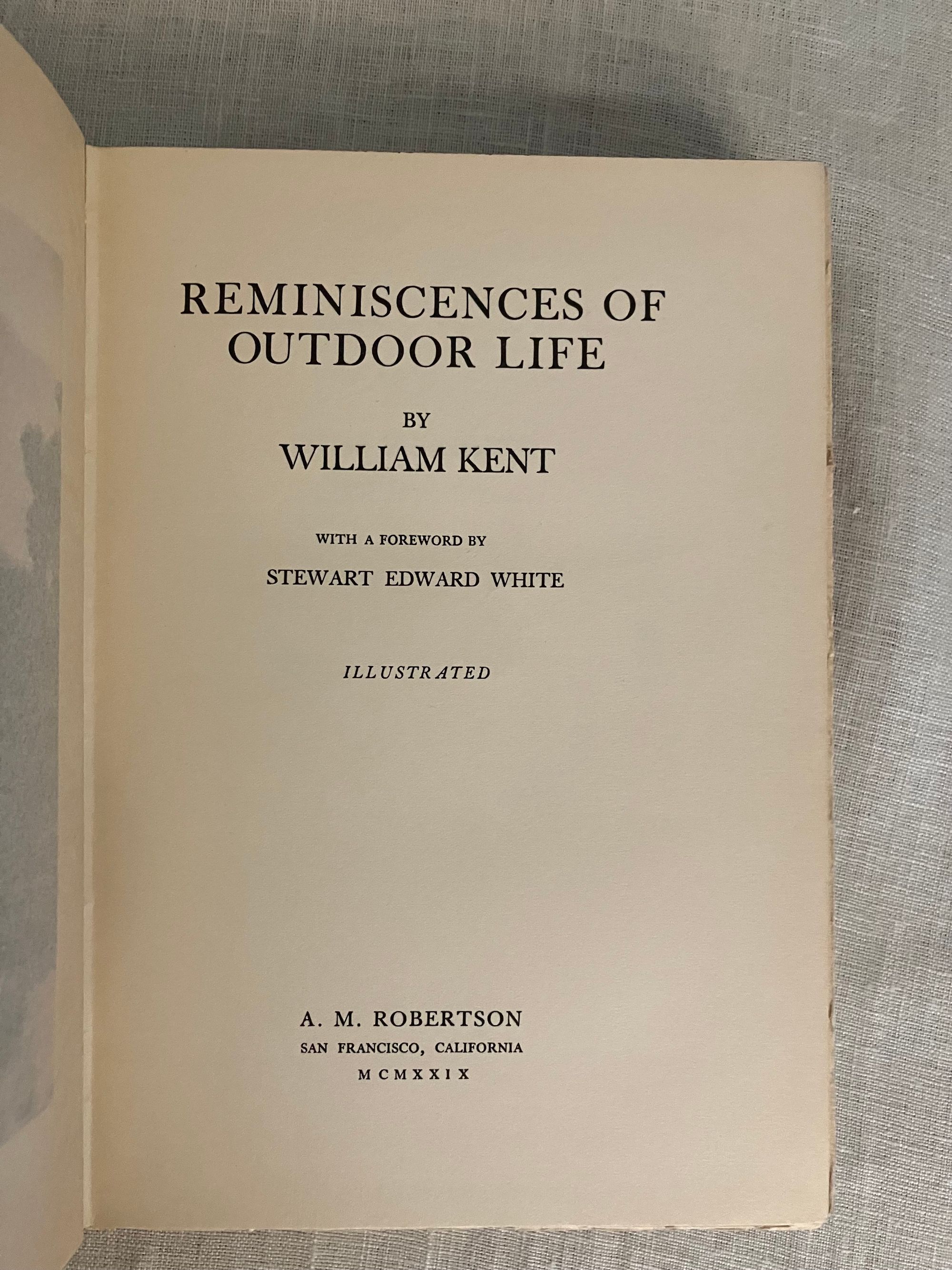 Hard cover, ex-lib, 8vo, in half brown cloth over brown paper covered boards, titles in brown to front board, and with printed paper label to spine. Lacking d/j. xii, 304 (1) pp., black and white illustrations with labelled tissue-guards. Printed at the Bruce Burrough Press, San Francisco. **Reminiscences of Chicago-born businessman, rancher and conservationist William Kent (1864-1928), who was perhaps best-known for donating the land which became the redwood forested Muir Woods Nat'l. Monument near San Francisco, California. He also sponsored the bill in Congress which Theodore Roosevelt would eventually sign into law in 1916, creating the National Park Service. The tissue-guarded, labelled silvertone frontispiece photo of Mt. Tamalpais has been attributed to Ansel Adams. The remaining full page photos are offset lithography. Condition: Very Good. Lacking d/j. Library marking at foot of spine in pen, label neatly removed. Ghost of rear pocket glue. Otherwise, the book is quite clean, and features some nice decorative typography on heavy paper which is but gently toned. One notation in pen opposite rear pastedown. OCLC 3138798.
