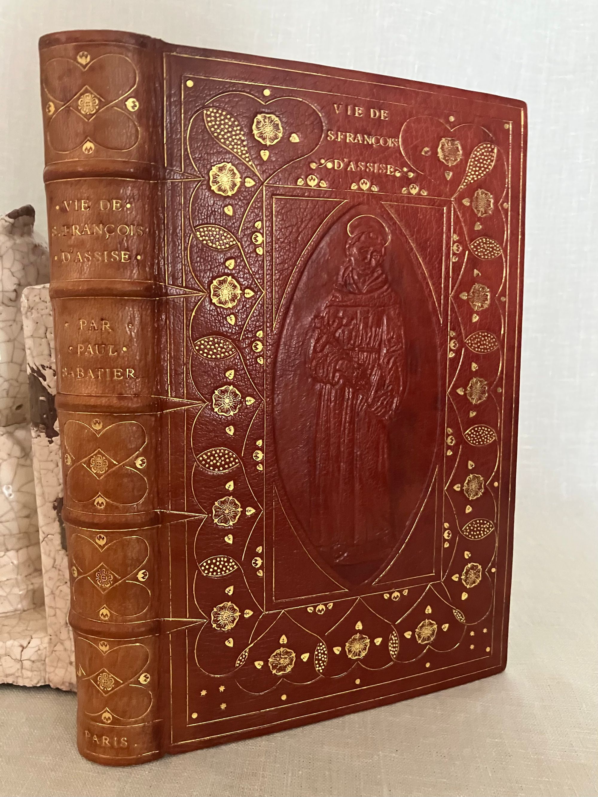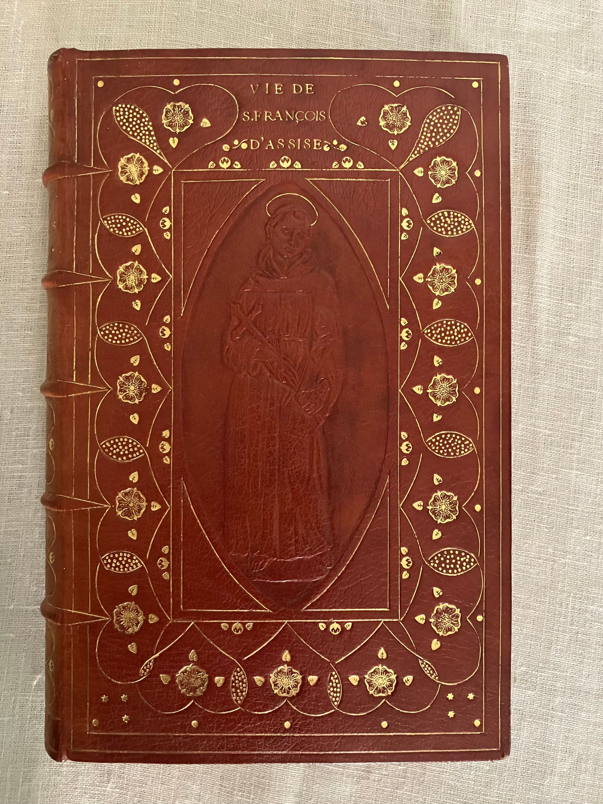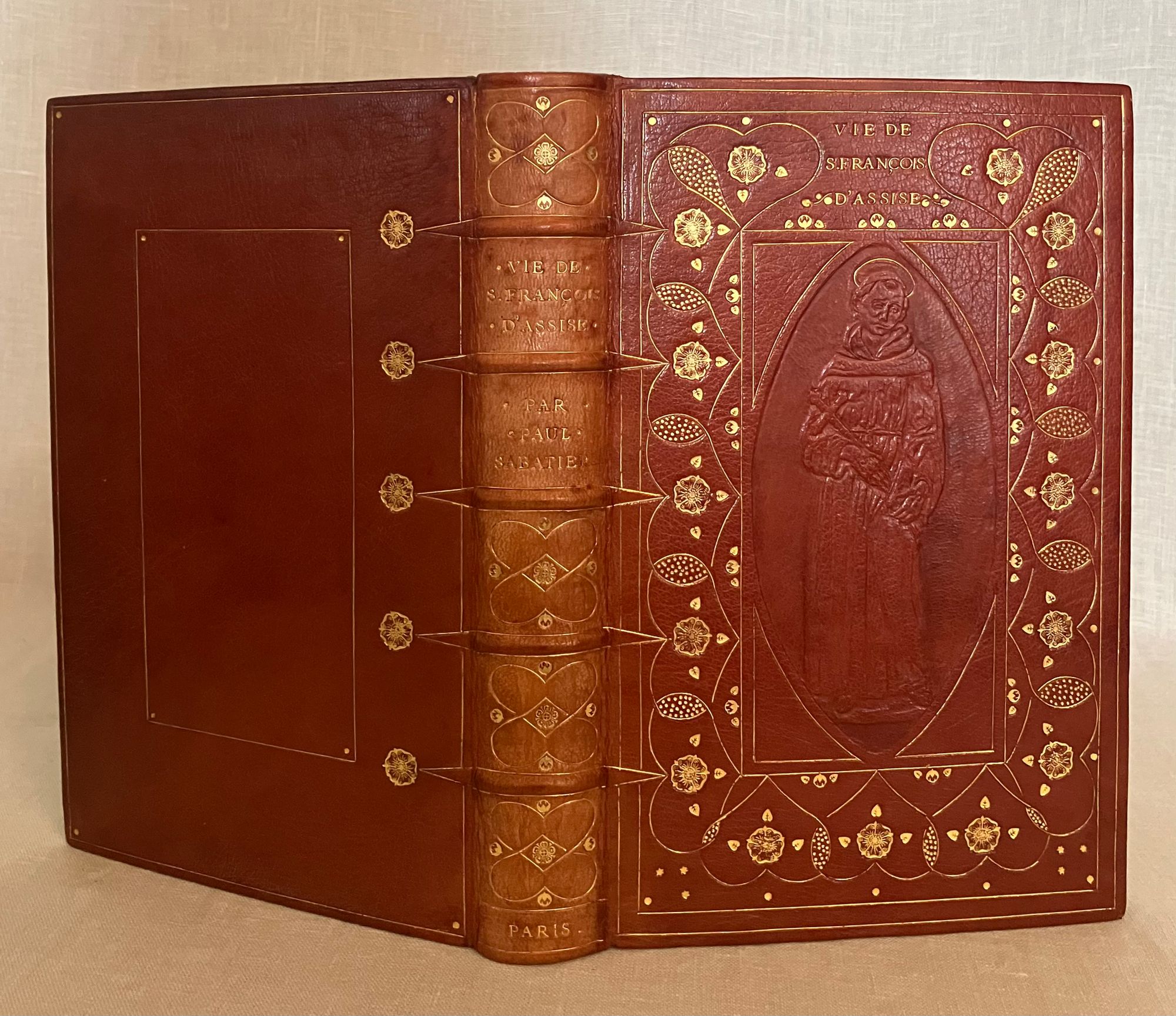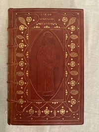 Reprint. (33rd edition,) in French. Near Fine. Hard cover, 8vo, in a contemporary fine binding of full niger levant morocco with decoration in blind and in gilt, and with the gilt-tooled signature attributed to the early professional debut of the American master bookbinder, bookbinding historian, author and teacher, Miss Edith [Josephine Lee] Diehl (1876-1953), appearing on the rear turn-in with the four-letter monogram and date: "19 EJLD 07." In a cloth covered, felt-lined slipcase. The front board has a panel stamped portrait in blind of Saint Francis within an ellipse, in imitation of panel-stamped German or French religious books of the fifteenth or sixteenth centuries. This is contrasted to border decoration tooled in gilt done in the manner of one of her contemporary English bookbinding mentors, Douglas Cockerell, [to whom the bookbinding was once attributed in the past, given some similarities of the somewhat difficult-to-read initials, and on style.] The "Cockerellesque" British Arts and Crafts border design consists of a series of heart shapes in gilt, tooled to intersect, and yet not fully enclose, the additional decoration of 15 Tudor roses, flanked by small leaves, and stippled dots applied somewhat irregularly within the heart intersections. In addition, a row of what appear to be small, stylized cotton ball blooms (or another small, round flower?) and smaller leaf accent the double-banded ruled border. Board edges are also ruled in gilt. Endcaps are tooled with "shilling" style lines. All edges gilt. The spine has five raised bands, each terminating in the Cockerellesque manner of medieval-like "hinge" extensions, with a tooled Tudor rose accenting each point on both front and rear boards. The rear board also has a more simple design consisting of two concentric rectangles with medium dots tooled at the corners. Within, the turn-ins are decorated with two opposing lines of the cotton ball flowers, leaves, with a single (smaller) Tudor rose at each corner. Edith Diehl's signature and date appear to rear turn-in as described above. **CONDITION: Near Fine, in a Fine slipcase. The spine is a bit sunned, and shows some areas lacking varnish. Pages are moderately age-toned. Pencil notation to front pastedown and ffep. remain with the [incorrect] Cockerell attribution.**The initials EJLD and date have been explained as incorporating Edith's mother's name, Josephine Lee Diehl into the monogram. (an identical sounding desription appears in a near-contemporary example appears in a professional book dealer's cached catalog; interestingly on a title which showcasing a different set of book decorative skills, including the use of small circles of gilt banded onlaid circles; strongly suggesting the lineage of the Cockerellesque tutelage.**The influence of American Bookbinder, author and educator Edith Diehl (1876-1953) is hard to overstate in terms of her craft, and in her writings about the inequities of women employed in the skilled trades associated with bookmaking in the early to mid twentieth century. Her title, "Bookbinding: It's Background and Technique" (1946) remains a classic two-volume encyclopedia of both the history of the book from antiquity as well as a manual for all parts of book production by hand. (Diehl discusses her preference for the use of this particular morocco, the distinctively pinky-red colored niger "levant" on page 311.) **Born in Brewster, New York, and educated at the all-women's Wellesley College ('04) near Boston, Diehl continued studies in philosophy at the University of Jena; her time on the continent must also have introduced her to the elaborate medieval-era panel-stamped book bindings found in Germany, France and Belgium, from which she may have taken the inspiration for this depiction of St. Francis. Home again in New York, she trained under Florence Foote at New York's female-run Emily Nordhoff Bindery. She went abroad again to extend her bookbinding training in 1902, visiting London, Paris and Brussels. Marianne Tidcombe sites Diehl's first solely-owned workshop, dating from 1906, at 121 East 23rd Street, New York. Later, a display ad appears for "Miss Edith Diehl/Bookbinder/ Instruction in Hand Bookbinding/Orders Taken for Binding Books in Leather or Vellum/ Finishing Department in Charge of Monsieur Adolphe Dehertogh/ Late Head Finisher of the Club Bindery/ Studio: 131 East 31st St., N.Y." ( from "Arts and Decoration Magazine" of Jan. 1911, Vol. 1, No. 3, p. 99, via jstordotorg)**Finally, this book's significance lies in its representation of the early promise of a woman professional bookbinder who would become a major figure in the teaching of the history of the book, and book binding techniques in the early twentieth-century United States. With the world of fine books as her teacher, Edith Diehl's travels channelled a passion to study with some of the "Best of British" practitioners of the era, including Douglas Cockerell. Some of her works can be seen in New York's Grolier Club. Refs.: M. Tidcombe, Women Book-Binders (Oak Knoll, British Library, 1996) pp. 180-81. Notes p. 235.