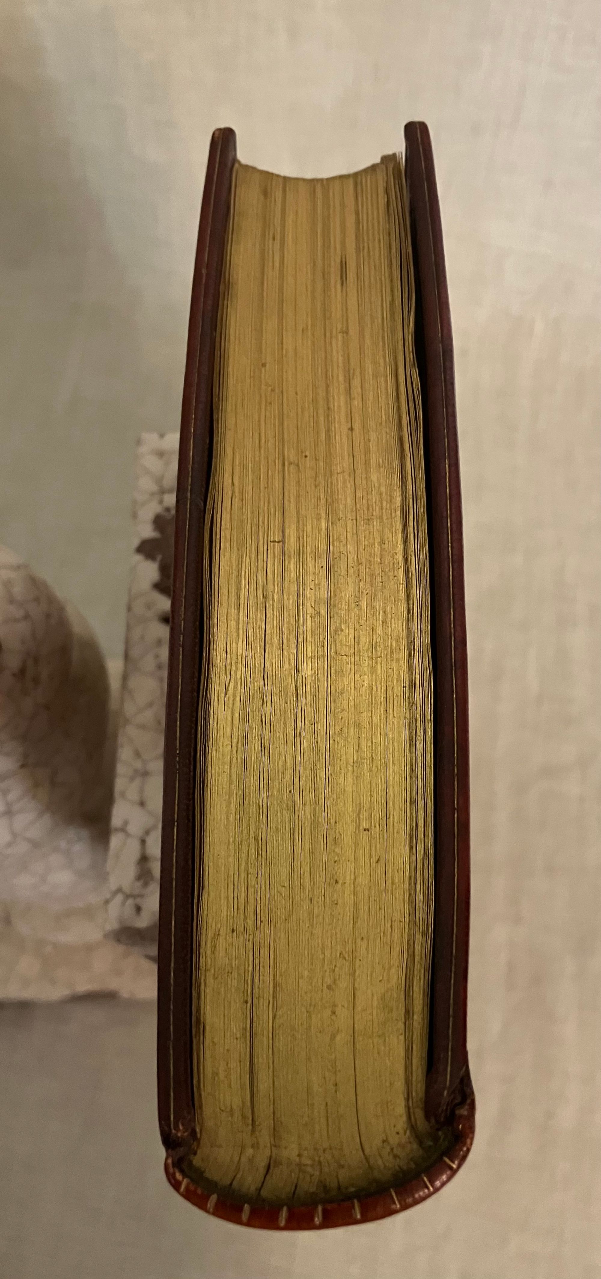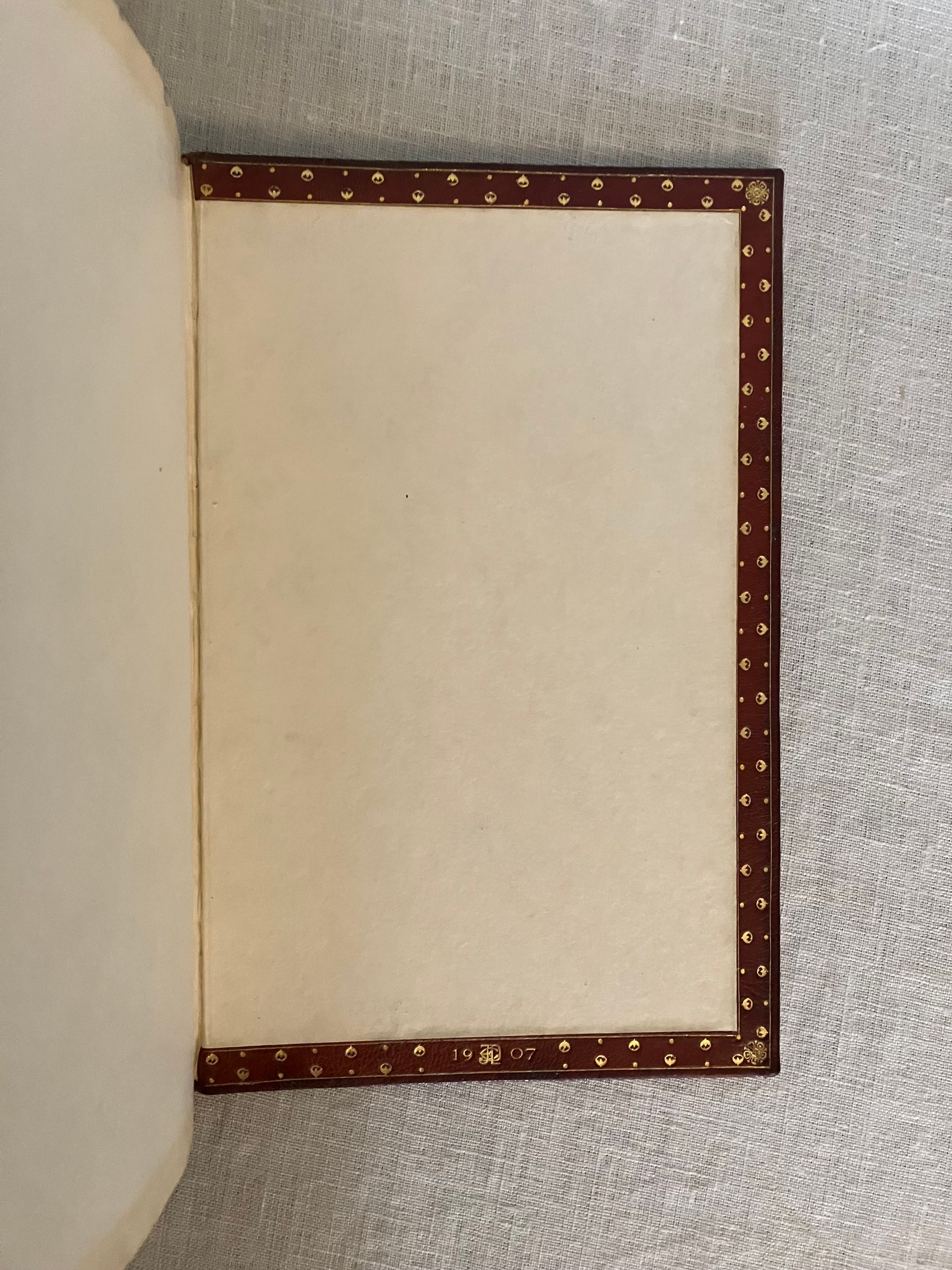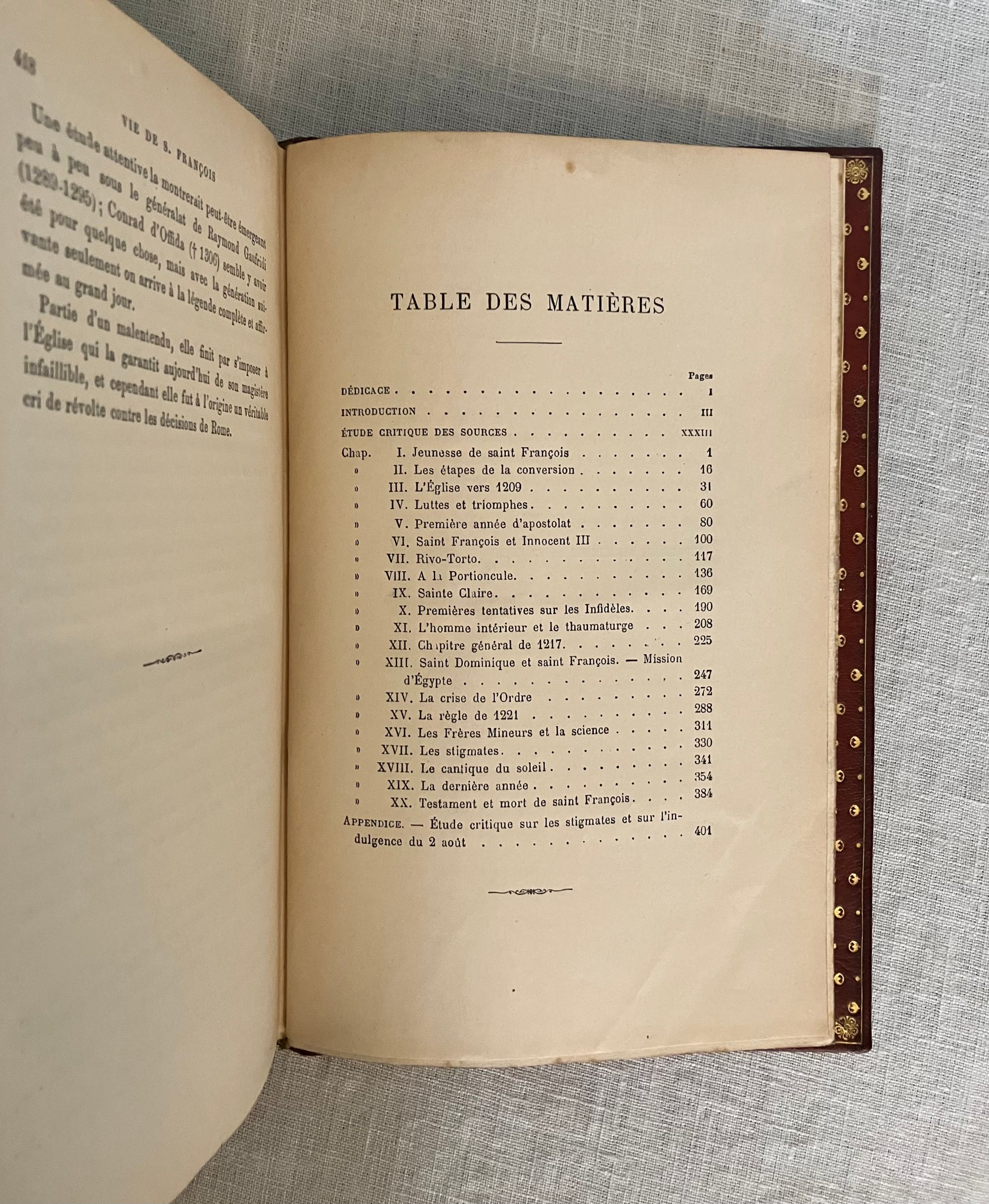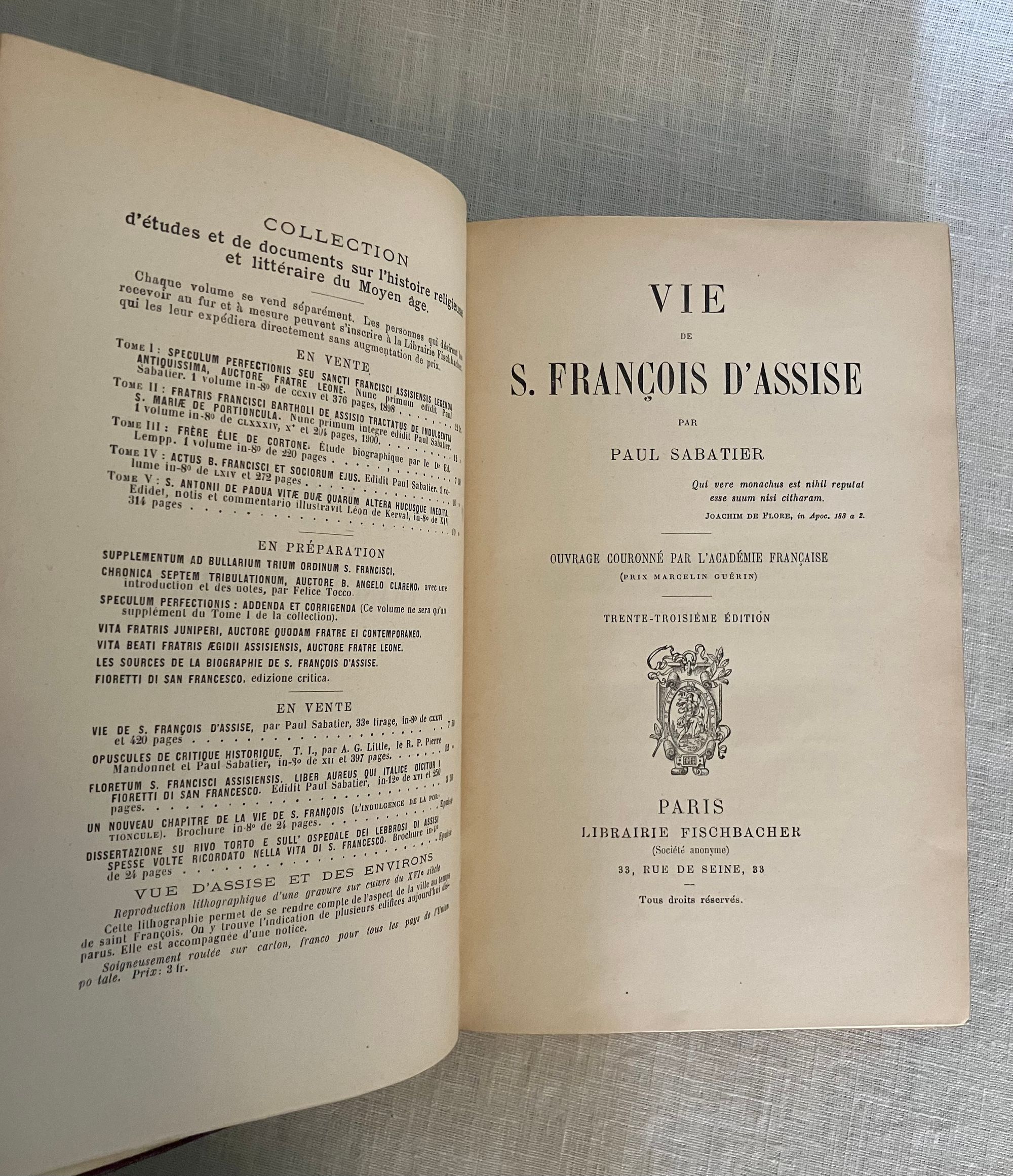 Reprint. (33rd edition,) in French. Near Fine. Hard cover, 8vo, in a contemporary fine binding of full niger levant morocco with decoration in blind and in gilt, and with the gilt-tooled signature attributed to the early professional debut of the American master bookbinder, bookbinding historian, author and teacher, Miss Edith [Josephine Lee] Diehl (1876-1953), appearing on the rear turn-in with the four-letter monogram and date: "19 EJLD 07." In a cloth covered, felt-lined slipcase. The front board has a panel stamped portrait in blind of Saint Francis within an ellipse, in imitation of panel-stamped German or French religious books of the fifteenth or sixteenth centuries. This is contrasted to border decoration tooled in gilt done in the manner of one of her contemporary English bookbinding mentors, Douglas Cockerell, [to whom the bookbinding was once attributed in the past, given some similarities of the somewhat difficult-to-read initials, and on style.] The "Cockerellesque" British Arts and Crafts border design consists of a series of heart shapes in gilt, tooled to intersect, and yet not fully enclose, the additional decoration of 15 Tudor roses, flanked by small leaves, and stippled dots applied somewhat irregularly within the heart intersections. In addition, a row of what appear to be small, stylized cotton ball blooms (or another small, round flower?) and smaller leaf accent the double-banded ruled border. Board edges are also ruled in gilt. Endcaps are tooled with "shilling" style lines. All edges gilt. The spine has five raised bands, each terminating in the Cockerellesque manner of medieval-like "hinge" extensions, with a tooled Tudor rose accenting each point on both front and rear boards. The rear board also has a more simple design consisting of two concentric rectangles with medium dots tooled at the corners. Within, the turn-ins are decorated with two opposing lines of the cotton ball flowers, leaves, with a single (smaller) Tudor rose at each corner. Edith Diehl's signature and date appear to rear turn-in as described above. **CONDITION: Near Fine, in a Fine slipcase. The spine is a bit sunned, and shows some areas lacking varnish. Pages are moderately age-toned. Pencil notation to front pastedown and ffep. remain with the [incorrect] Cockerell attribution.**The initials EJLD and date have been explained as incorporating Edith's mother's name, Josephine Lee Diehl into the monogram. (an identical sounding desription appears in a near-contemporary example appears in a professional book dealer's cached catalog; interestingly on a title which showcasing a different set of book decorative skills, including the use of small circles of gilt banded onlaid circles; strongly suggesting the lineage of the Cockerellesque tutelage.**The influence of American Bookbinder, author and educator Edith Diehl (1876-1953) is hard to overstate in terms of her craft, and in her writings about the inequities of women employed in the skilled trades associated with bookmaking in the early to mid twentieth century. Her title, "Bookbinding: It's Background and Technique" (1946) remains a classic two-volume encyclopedia of both the history of the book from antiquity as well as a manual for all parts of book production by hand. (Diehl discusses her preference for the use of this particular morocco, the distinctively pinky-red colored niger "levant" on page 311.) **Born in Brewster, New York, and educated at the all-women's Wellesley College ('04) near Boston, Diehl continued studies in philosophy at the University of Jena; her time on the continent must also have introduced her to the elaborate medieval-era panel-stamped book bindings found in Germany, France and Belgium, from which she may have taken the inspiration for this depiction of St. Francis. Home again in New York, she trained under Florence Foote at New York's female-run Emily Nordhoff Bindery. She went abroad again to extend her bookbinding training in 1902, visiting London, Paris and Brussels. Marianne Tidcombe sites Diehl's first solely-owned workshop, dating from 1906, at 121 East 23rd Street, New York. Later, a display ad appears for "Miss Edith Diehl/Bookbinder/ Instruction in Hand Bookbinding/Orders Taken for Binding Books in Leather or Vellum/ Finishing Department in Charge of Monsieur Adolphe Dehertogh/ Late Head Finisher of the Club Bindery/ Studio: 131 East 31st St., N.Y." ( from "Arts and Decoration Magazine" of Jan. 1911, Vol. 1, No. 3, p. 99, via jstordotorg)**Finally, this book's significance lies in its representation of the early promise of a woman professional bookbinder who would become a major figure in the teaching of the history of the book, and book binding techniques in the early twentieth-century United States. With the world of fine books as her teacher, Edith Diehl's travels channelled a passion to study with some of the "Best of British" practitioners of the era, including Douglas Cockerell. Some of her works can be seen in New York's Grolier Club. Refs.: M. Tidcombe, Women Book-Binders (Oak Knoll, British Library, 1996) pp. 180-81. Notes p. 235.