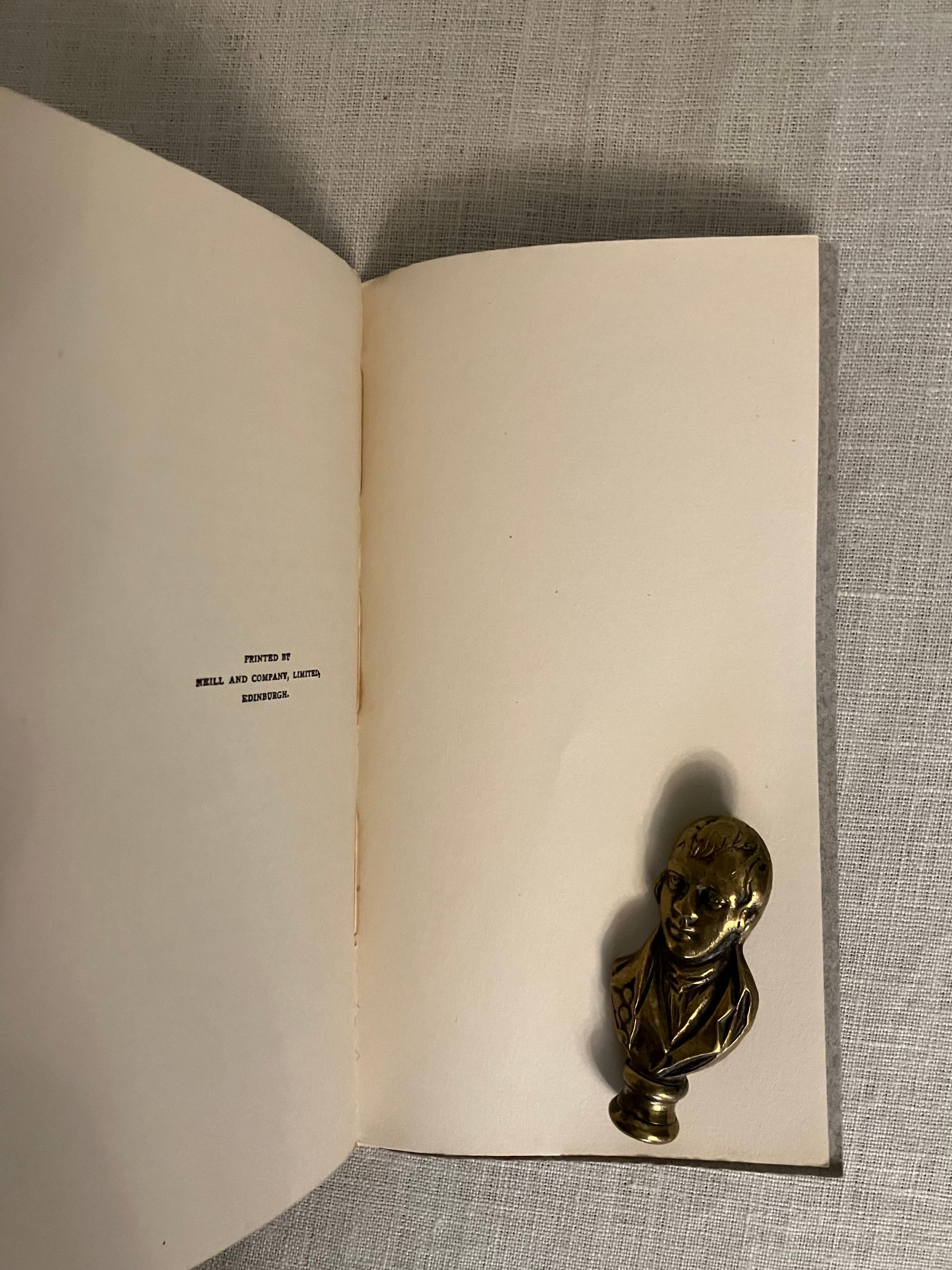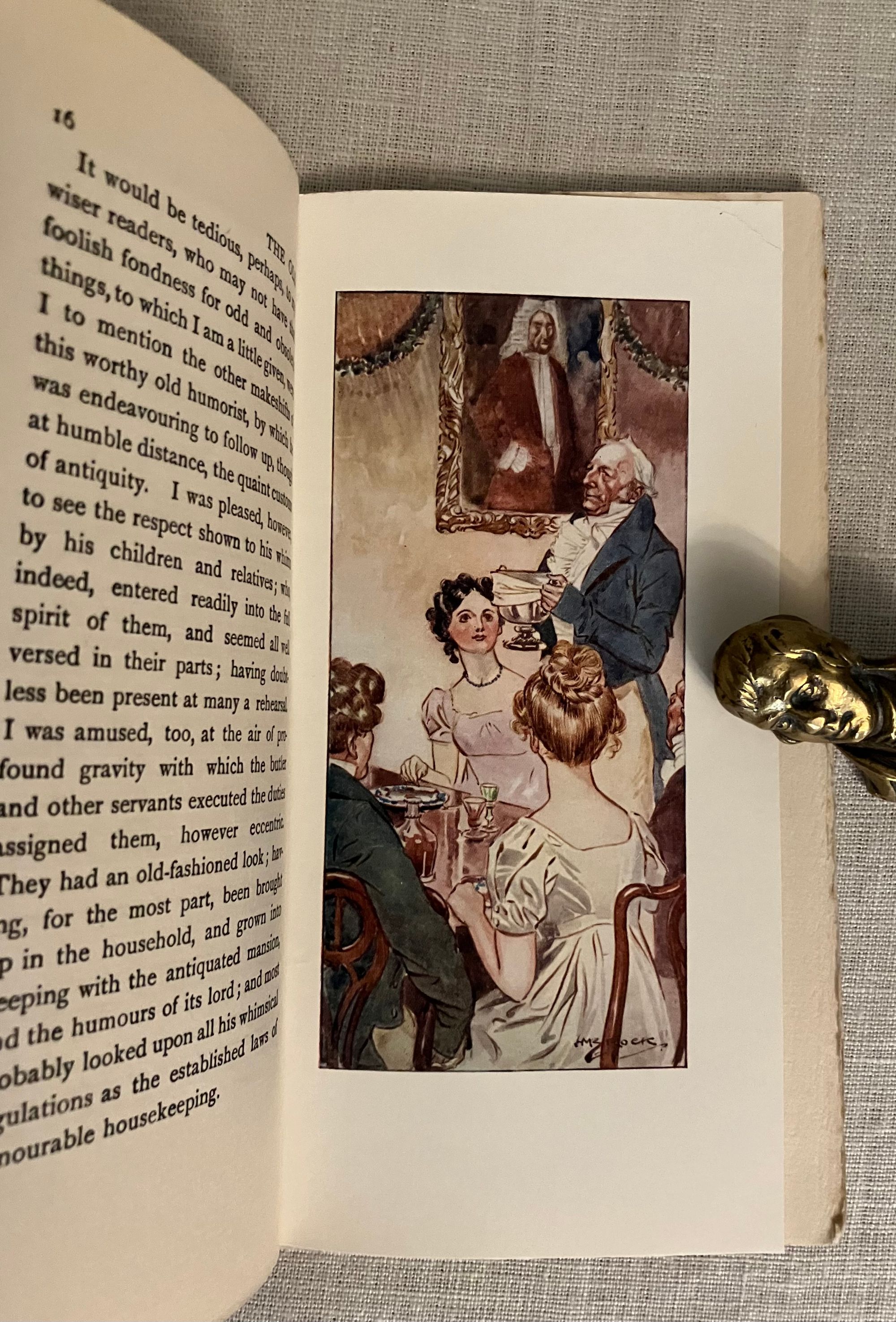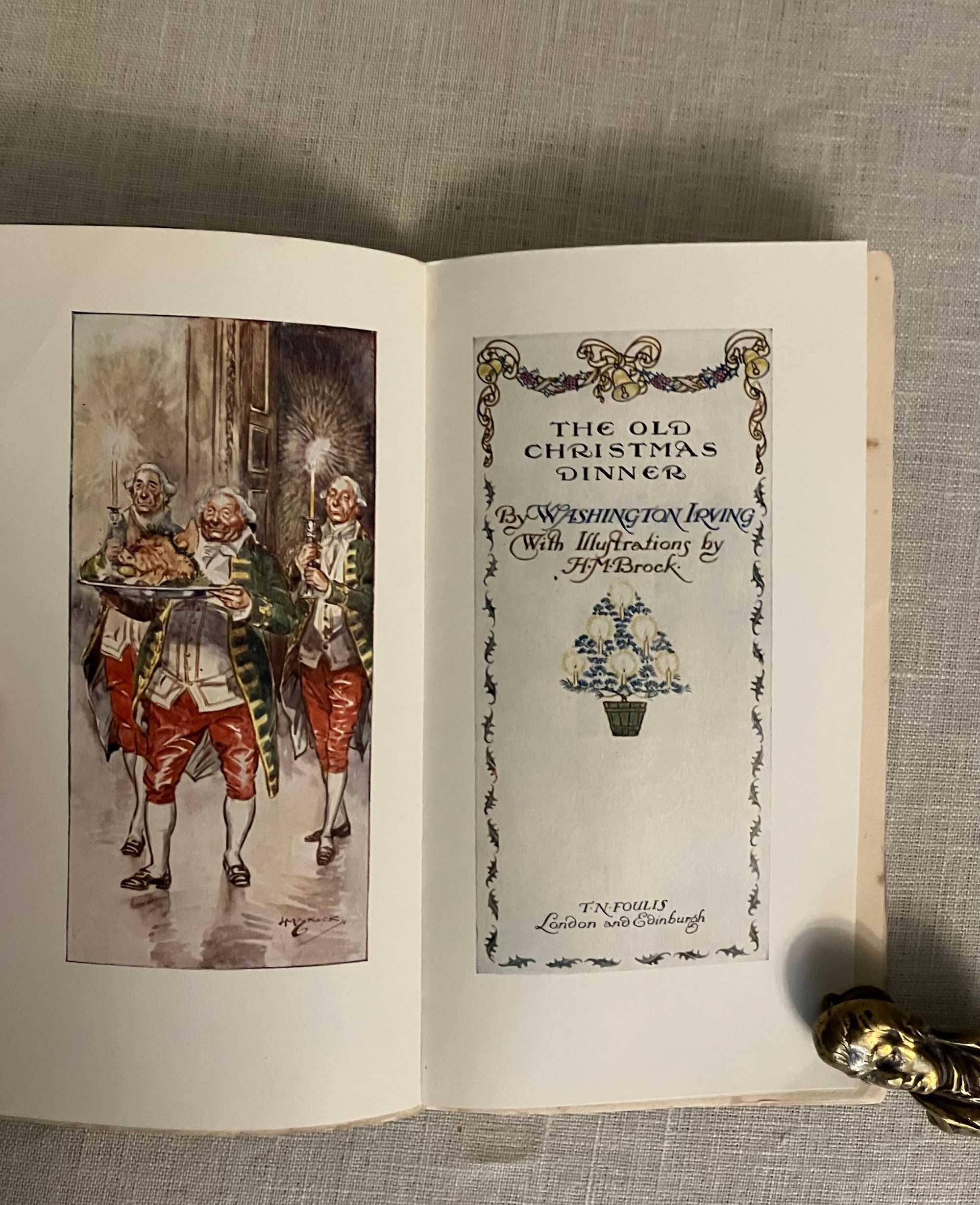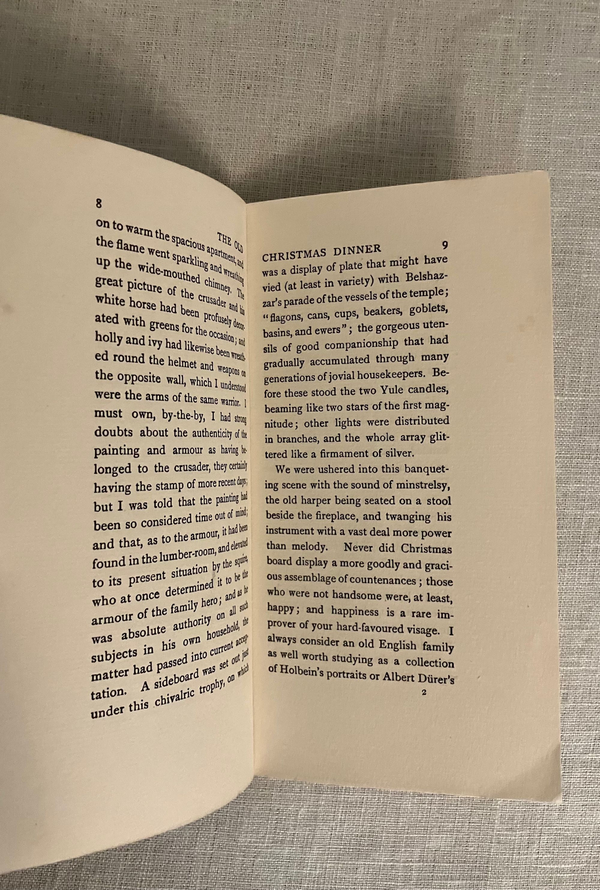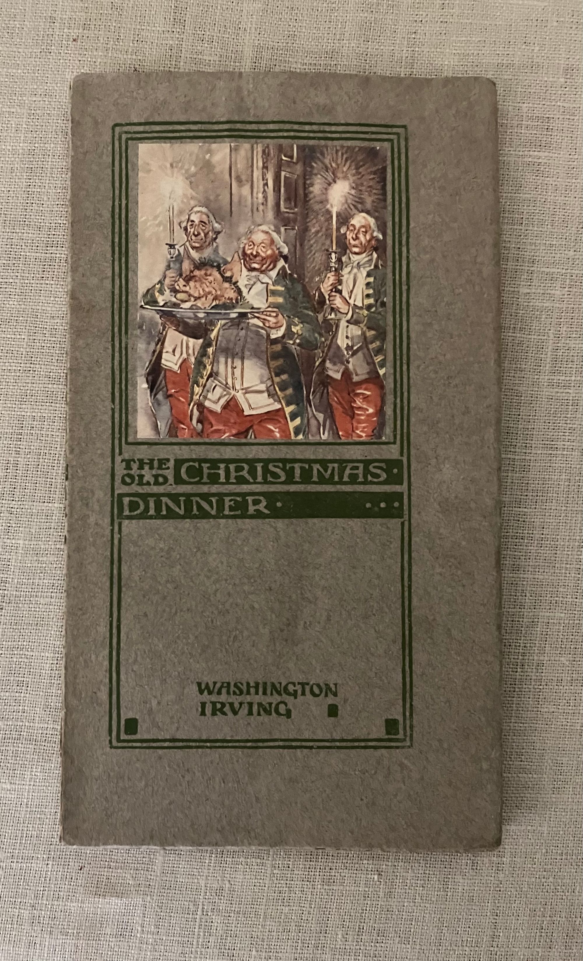 Reprint. Soft cover chapbook, 16mo, (measuring 3 3/4 x 6 1/4 inches,) in gray green paper over stiff card, with applied chromolithographed art to cover, the titles in green ink, printed on art paper by Neill and Company, Ltd., Edinburgh, 35 pp. (No publisher's ads.) Chromolithographed illustrations by Englishman Henry Matthew Brock (1875-1970), Cambridge School of Art graduate, illustrator of Charles Dickens and other books, worked as well in advertising. He also contributed illustrations to the magazine "Punch." Here he provides the onlaid cover illustration, titled "He bore a silver dish, on which was an enormous pig's head," which is also used (in full) for the frontispiece The hand-lettered and illustrated title page as well as two other full page illustrations within the text, for a total of five. The text is abstracted from Washington Irving's (1783-1859) serialized " Sketchbook of Geoffrey Crayon, Gent." first published in 1820." Crayon enjoys old English hospitality at the Bracebridge Christmas Dinner Table. CONDITION: Very Good Plus. Exterior very clean and sound. Inside, a former owner's name appears on the inside front cover in pen. There are a few single spots of foxing affecting some pages, but generally the pages remain bright and clean. Beginnings of dog-ear corner some text pages are less prominent seen in better light. The illustrations measure about 2 1/4 x 5 inches within the text; larger than some other chapbook editions by this publisher. Scarce title for holiday gifting. Elfick and Harris 164; lack of ads indicates reprint, p. 103.