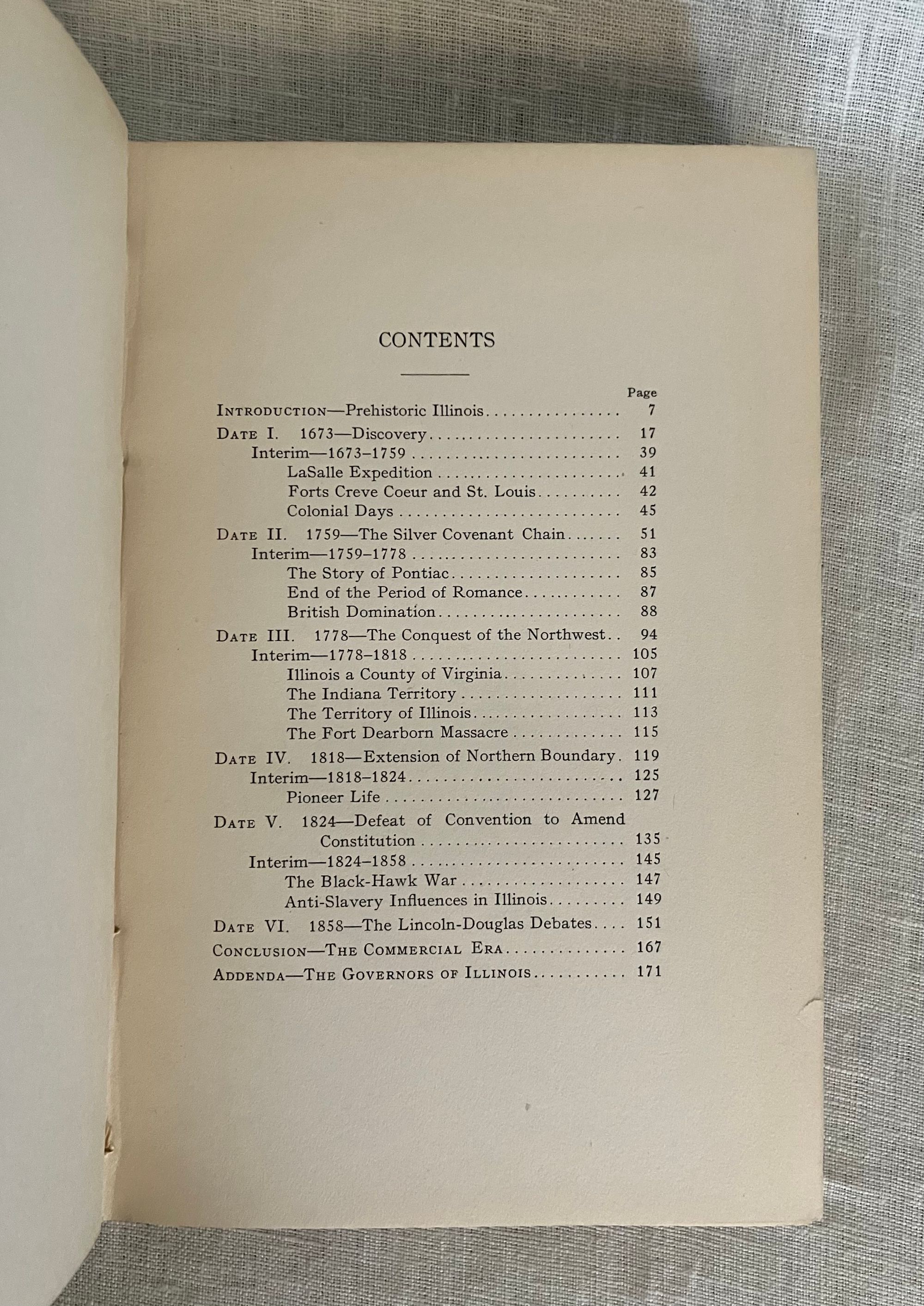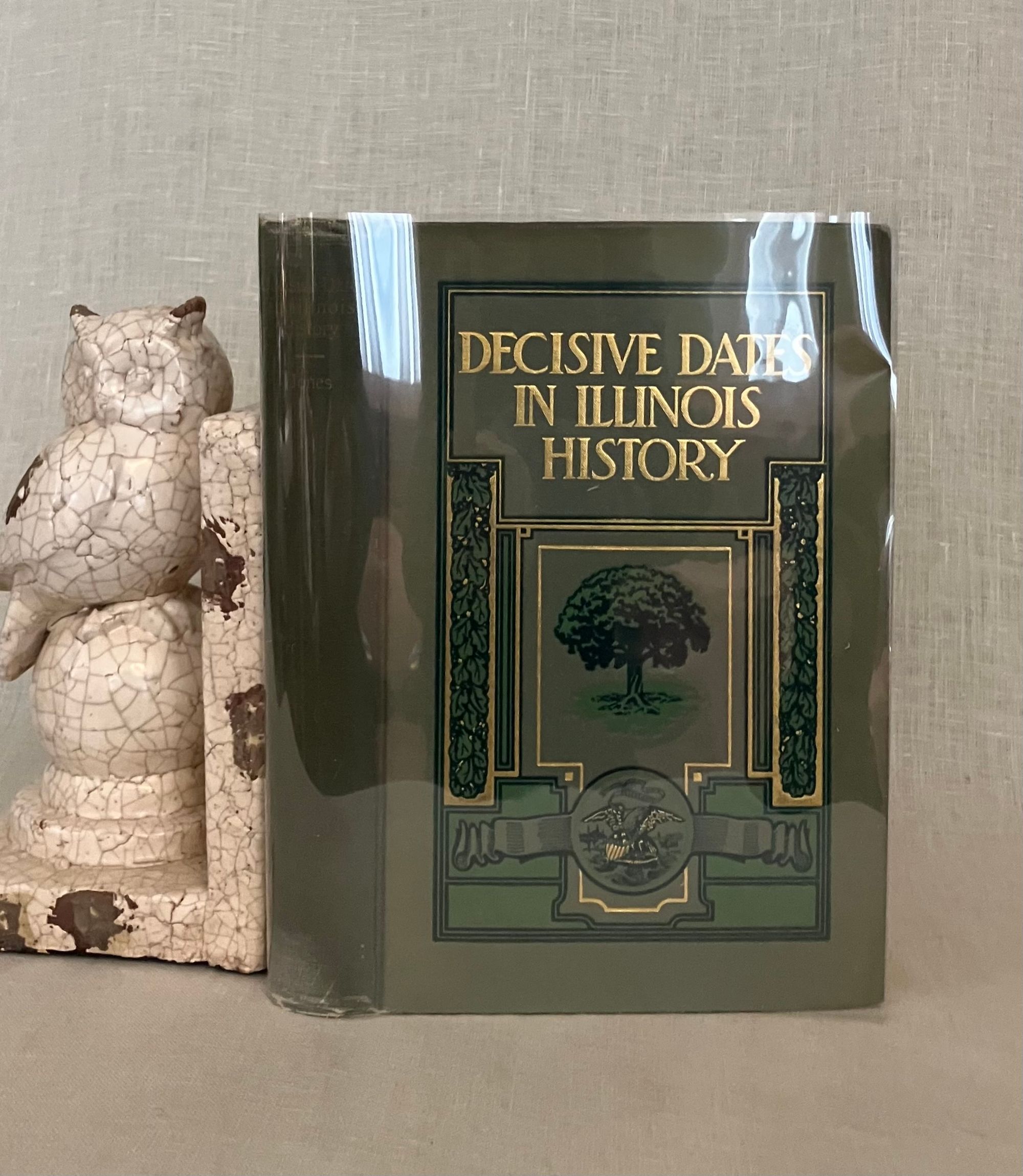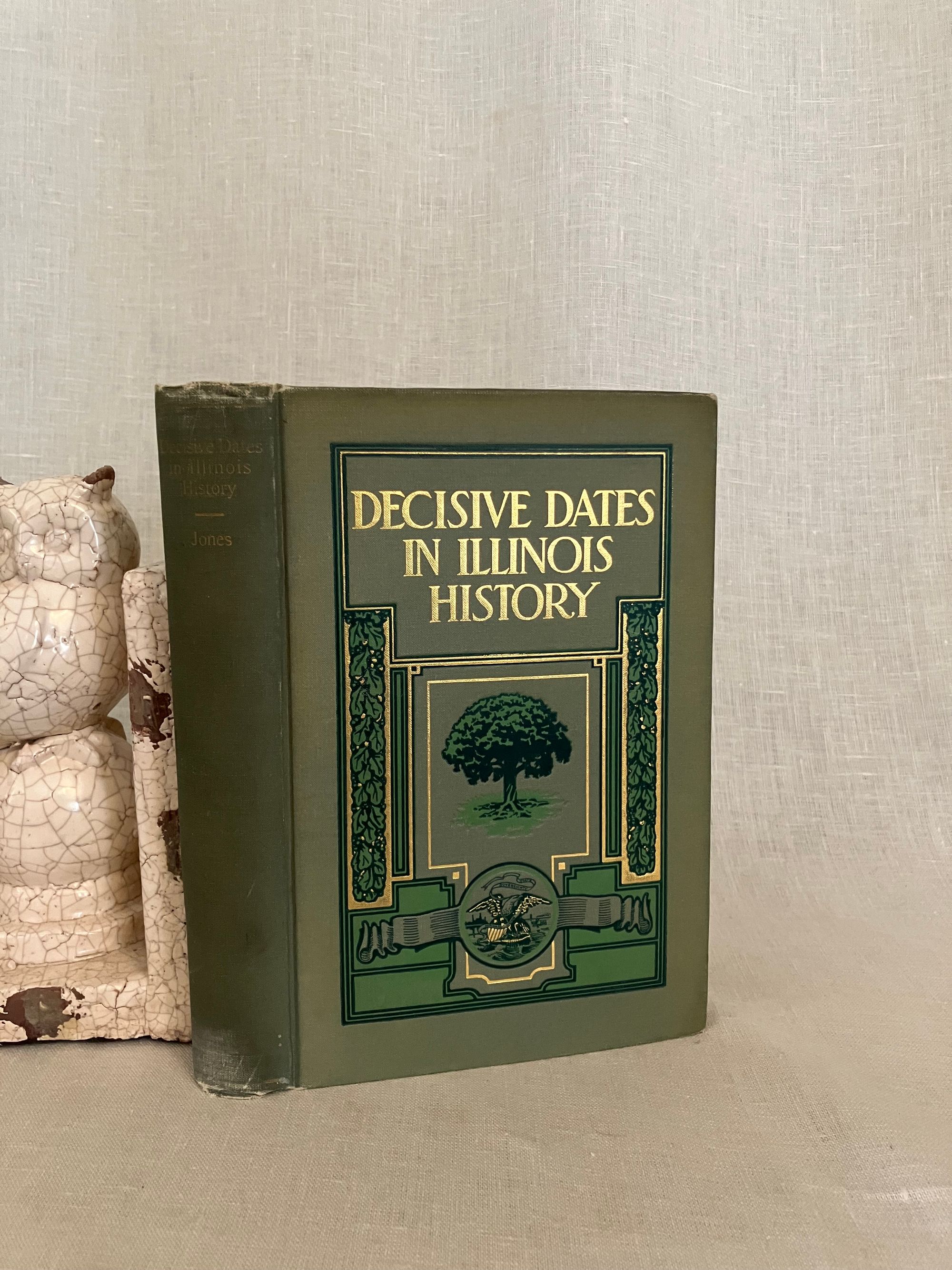 Hard cover, 8vo, in green cloth blocked in dark green gold and black with a pictorial design with the state tree and seal in an Art Deco frame, titles blocked in gold to the spine, 276 pp. Includes a bibliography, primary source quotations, and thirty photogravure illustrations. *CONDITION: Very Good. Minor wear and some rubbing to spine at head and foot. Titles a bit faded to the spine. Inside, last signature shaken. Hinges in order. Engraved bookplate former owner to front endpaper. Now in mylar. ** Ms. Jones makes a case for the importance of the early French explorers, missionaries, and traders (Joliet, Marquette, La Salle) of the Mississippi Valley in the seventeenth century. She argues that the economic interests of the English were otherwise geographically engaged, leaving the area open to French influence. She argues that the enmity between the Algonquin and Iroquois was a buffer to conflict between the competing European interests of the colonial period. She further argues that Illinois's eventual status as a non-slave State affected the balance of power leading into the Civil War. Chapters are thus arranged by key events and inclusive of primary source quotations.