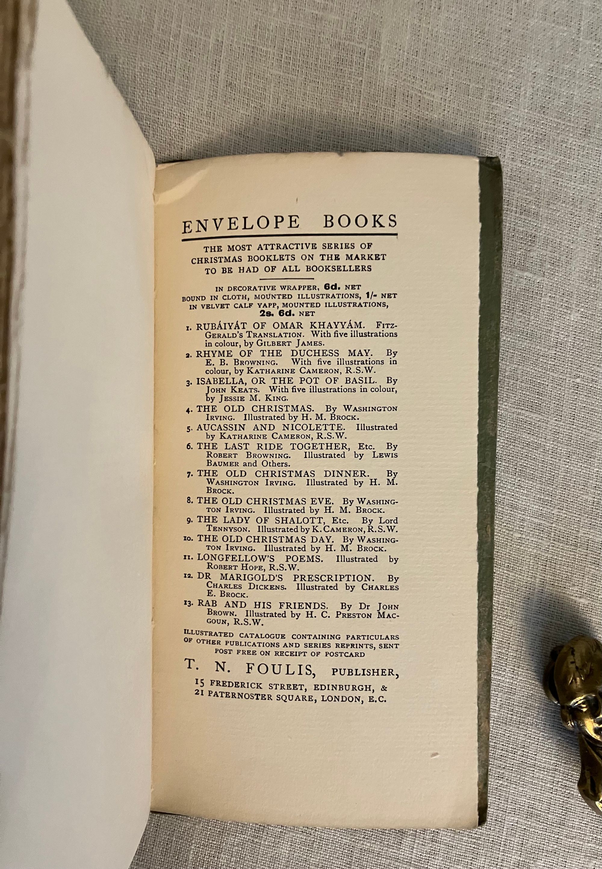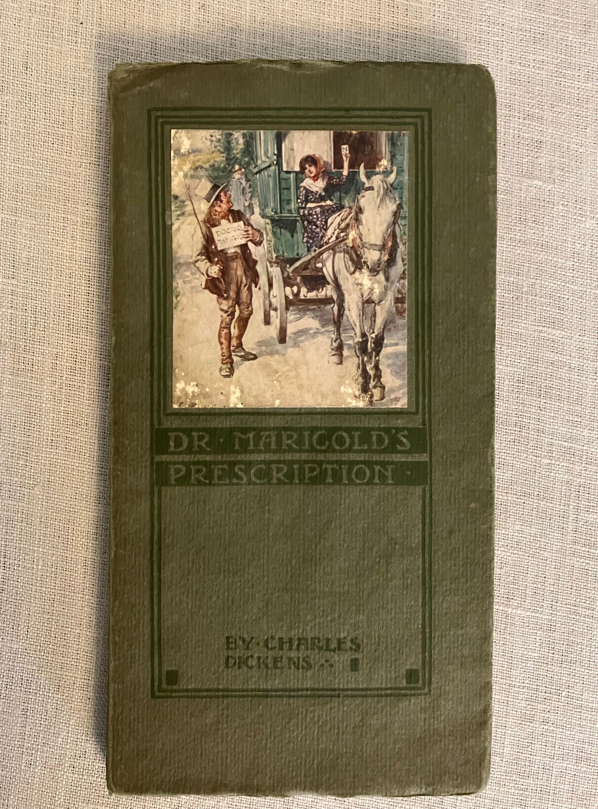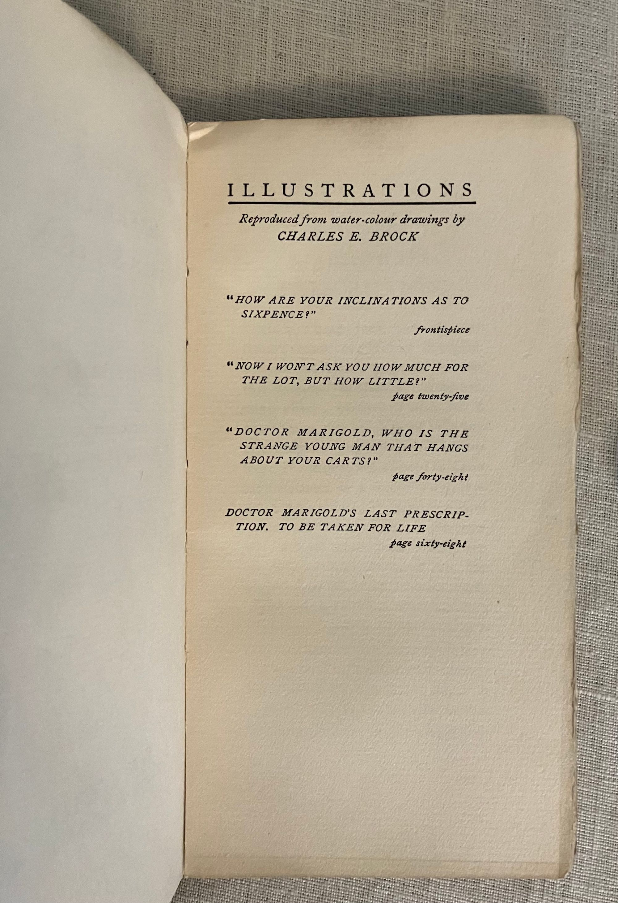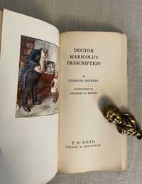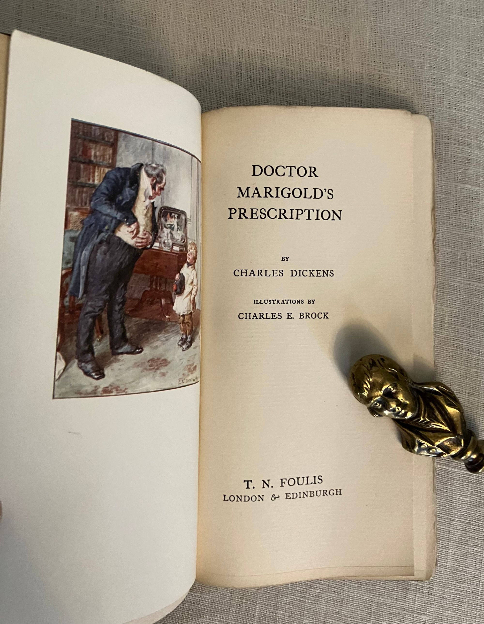 First Edition. Soft cover chapbook in green card wraps, yapp edge, over paper, 16mo (measuring 3 1/2 x 6 3/4 inches) with vignette watercolor reproduction art by London-born artist Charles E. Brock (1870-1938) on front of wraps, titles printed in darker green. Frontispiece, plus three additional watercolor plates by Brock within the text. Printed by Neill and Company, Edinburgh.**Charles Dickens's short story was first published in 1865, and T.N. Foulis did a number of different editions of this popular Christmas story. It features the struggle to overcome adversity faced by a street pedlar, named Dr. Marigold (after the man who delivered him,) and his adopted, deaf-mute daughter. Sophie has had a background of her own childhood trauma to deal with. The work has been noted for its progressive views on the deaf. It was also reworked into a play. CONDITION: Very Good Plus. Some scuffing to the applied cover image. However, the wraps remain bright, and the interior is clean and bright. There is a small, neat undated inscription to the half title page in old ink.OCLC 427566936. Elfick and Harris 86. Advertising indicates first edition, see p. 75.