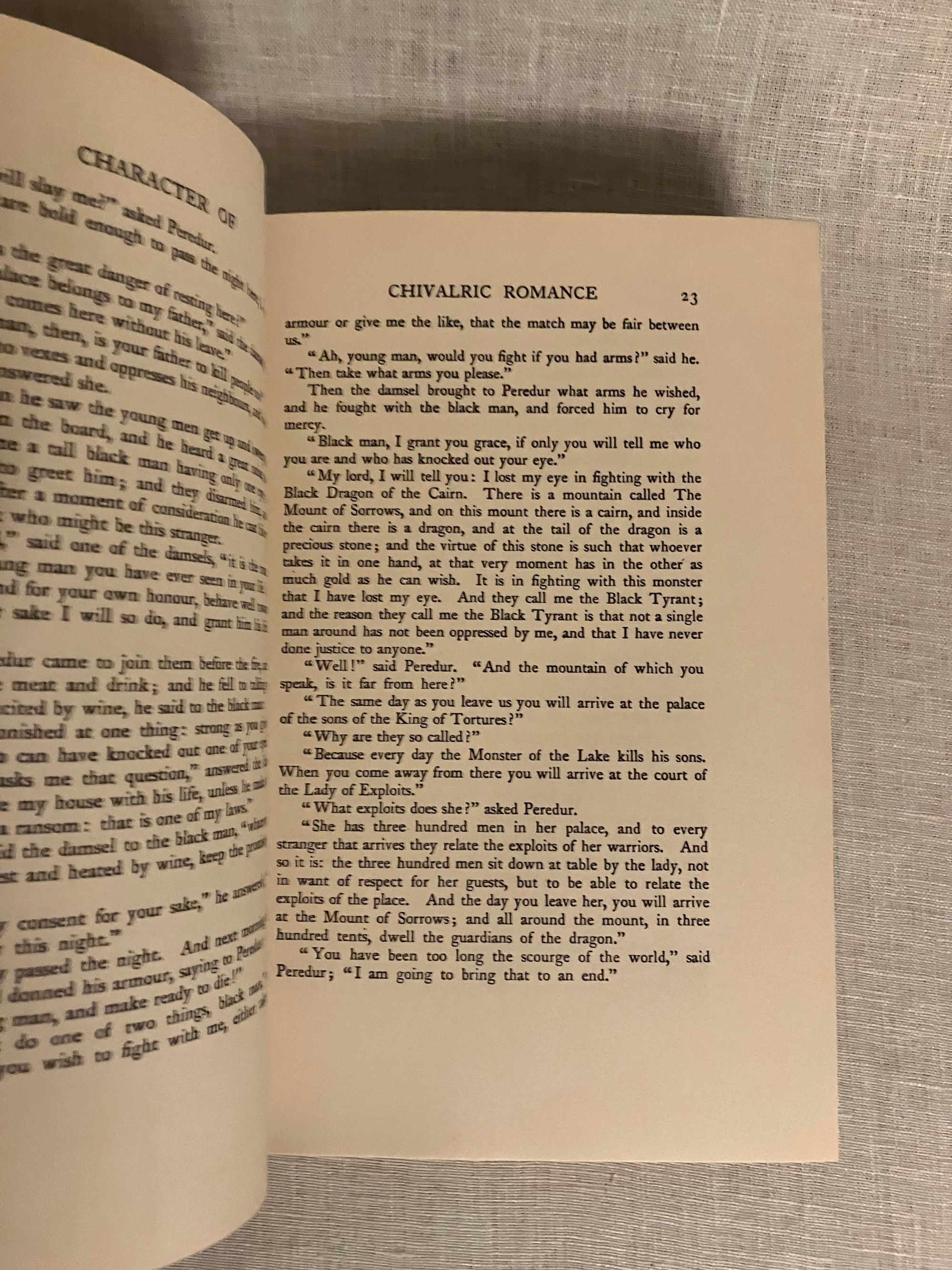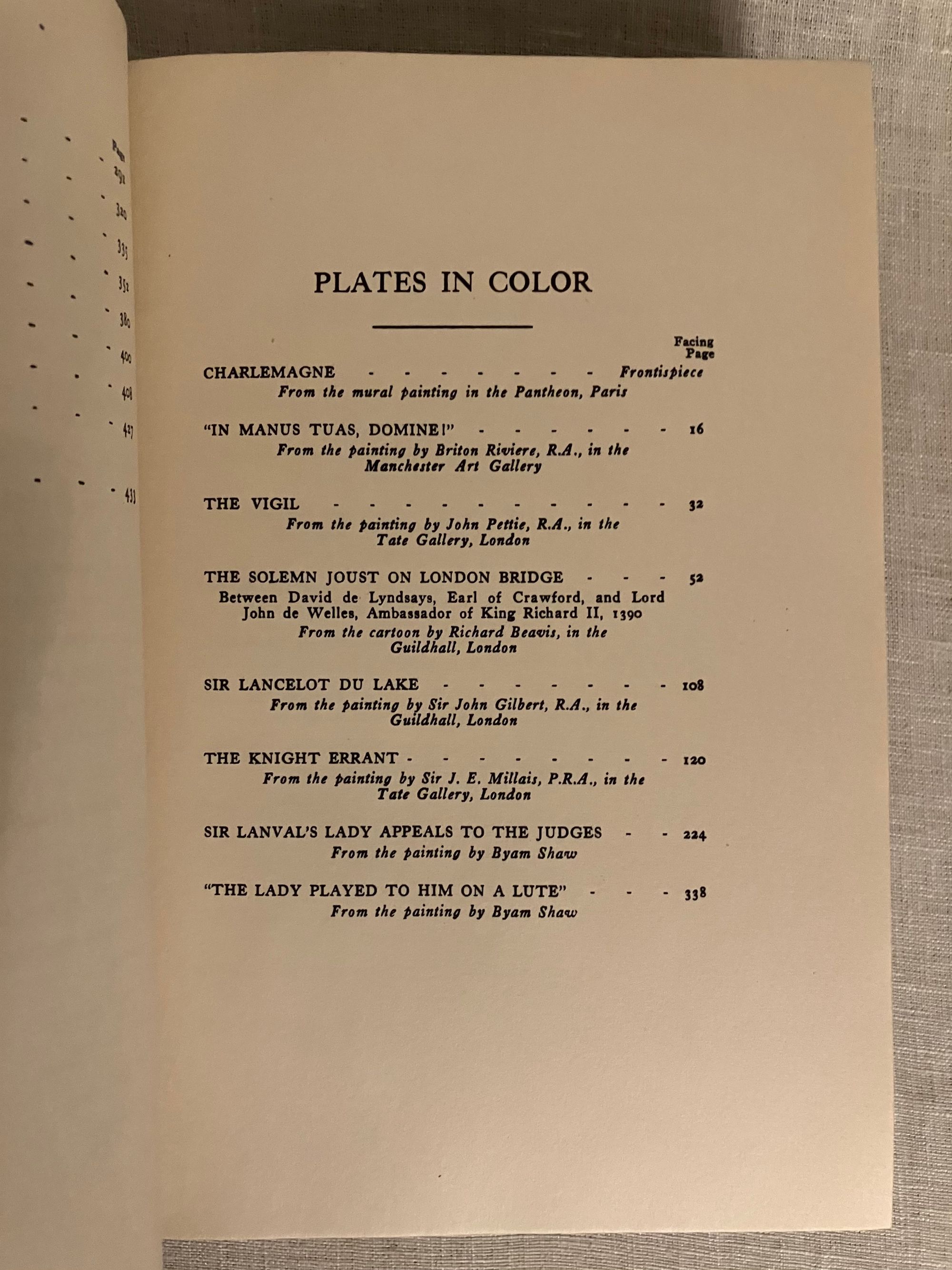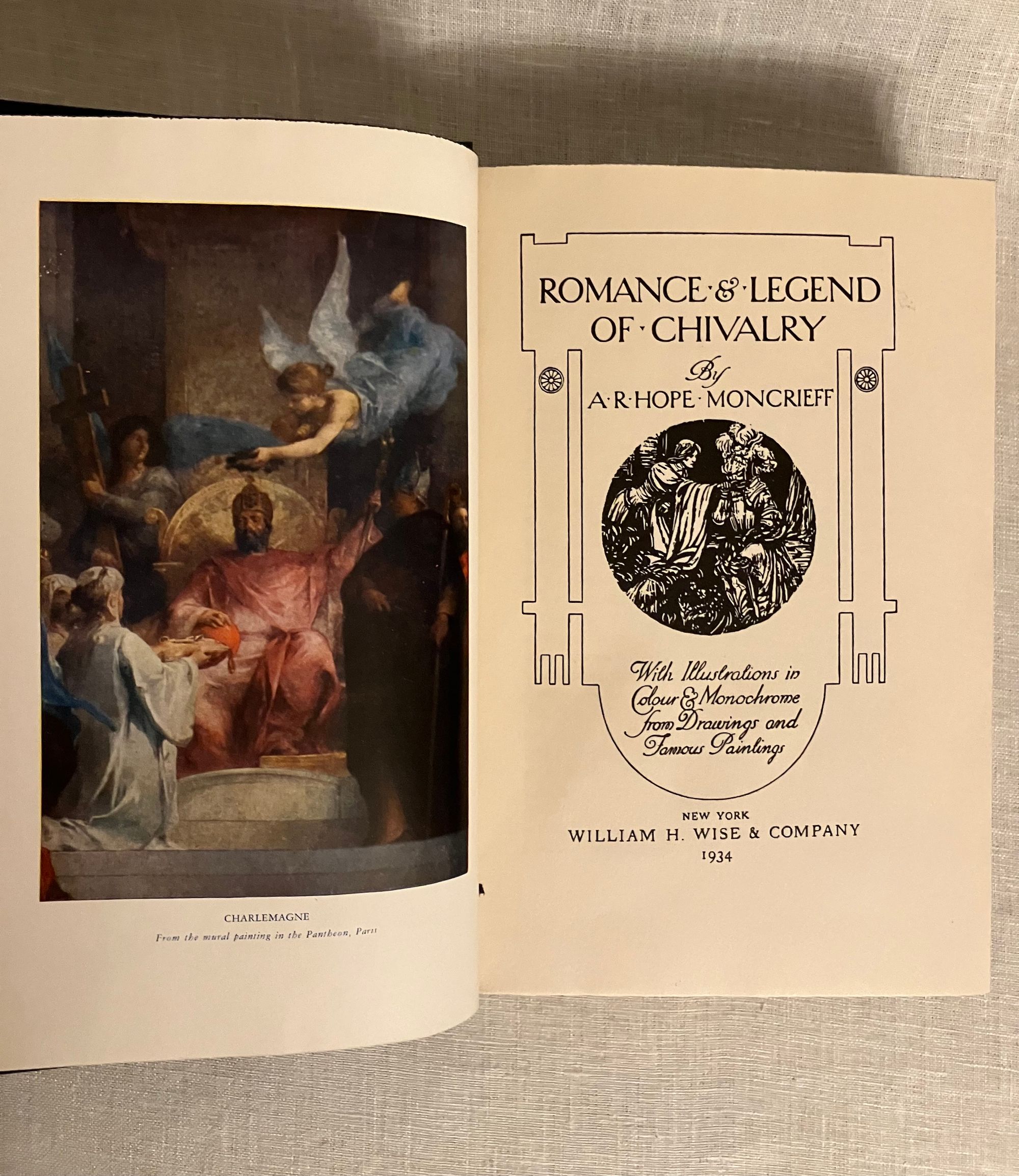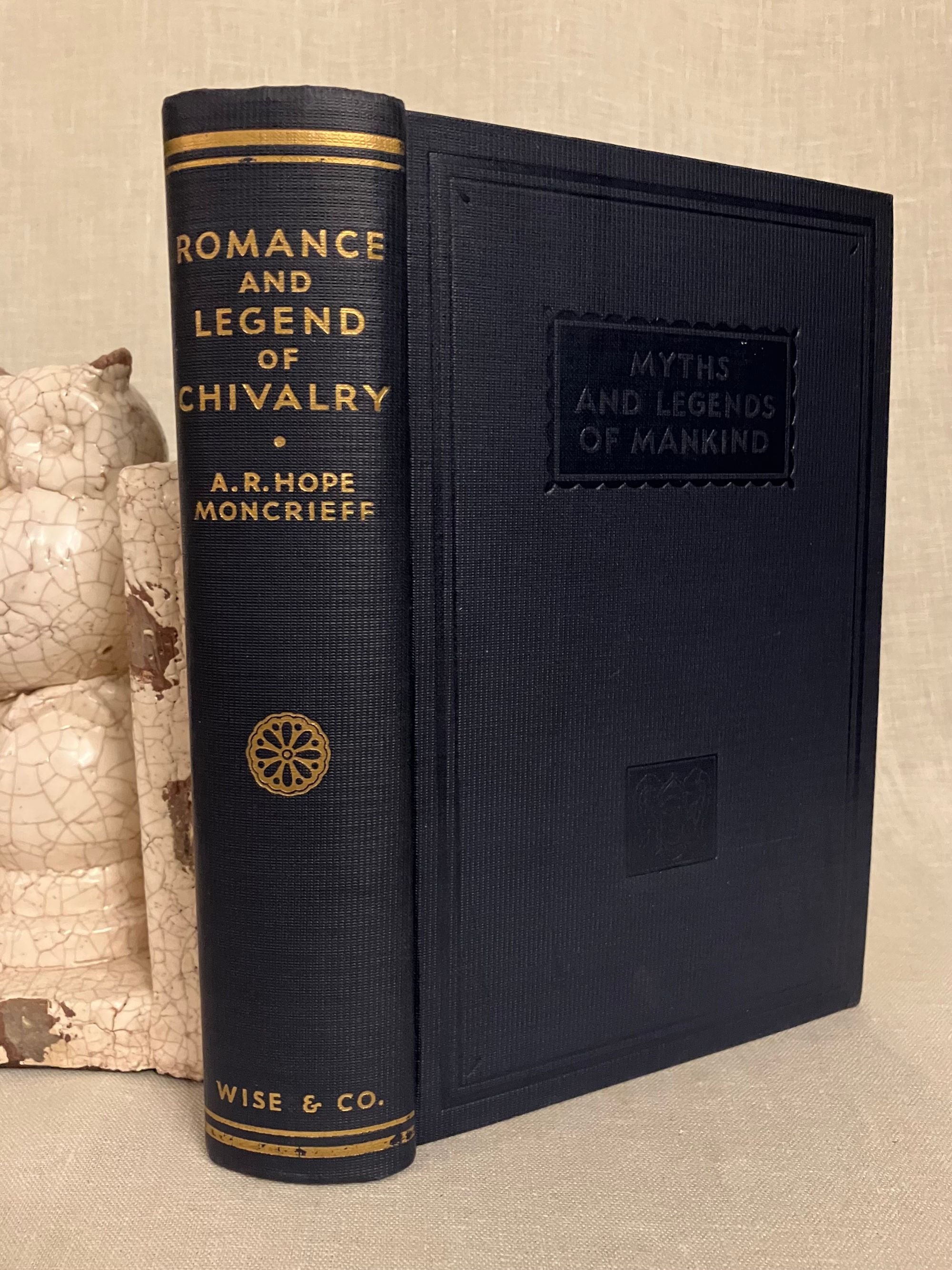 Hard cover, 8vo., 439pp. In publisher's navy cloth boards, blind stamped and with gold lettering to spine. Includes publisher's advertising postcard for "The Seven Wonders of the World". CONTENTS: A study of the tales of the chivalric Romance, together with a collection of those stories. The history of the Chivalric Romance discusses Chaucer, Cervante's "Don Quixote", "Le Morte D'Arthur", Sir Walter Scott's "The Talisman". The included stories are: "The Young Unknown", "The Knight of the Lion", "Sir Gawayne and the Green Knight", "Sir Lanval", "Guy of Warwick", "Roland and Oliver", "Ogier the Dane", "Roncevalles", "Huon's Quest", "Vivien", "The Forbidden Island", "Beltenbros", "Esplandian", "The Dragon of Rhodes", "Pierre of Provence and "The Ransom". ILLUSTRATED with eight color and twenty-seven monochrome plates, being reproductions of paintings by British Pre-Raphaelite and other artists including Ford Madox Brown, Sir John Gilbert, Edwin A. Abbey, Edward Burne-Jones, John Everett Millais, Byam Shaw. AUTHOR Robert Hope Moncrieff (1846-1927) was a prolific writer of children's books and a number of A&C Black travel books. CONDITION: Near Fine. Very light wear to gold lettering on spine. Original owner's signature in ink, dated October, 1934. to ffep. (Less toned appearing than these pictures show.)