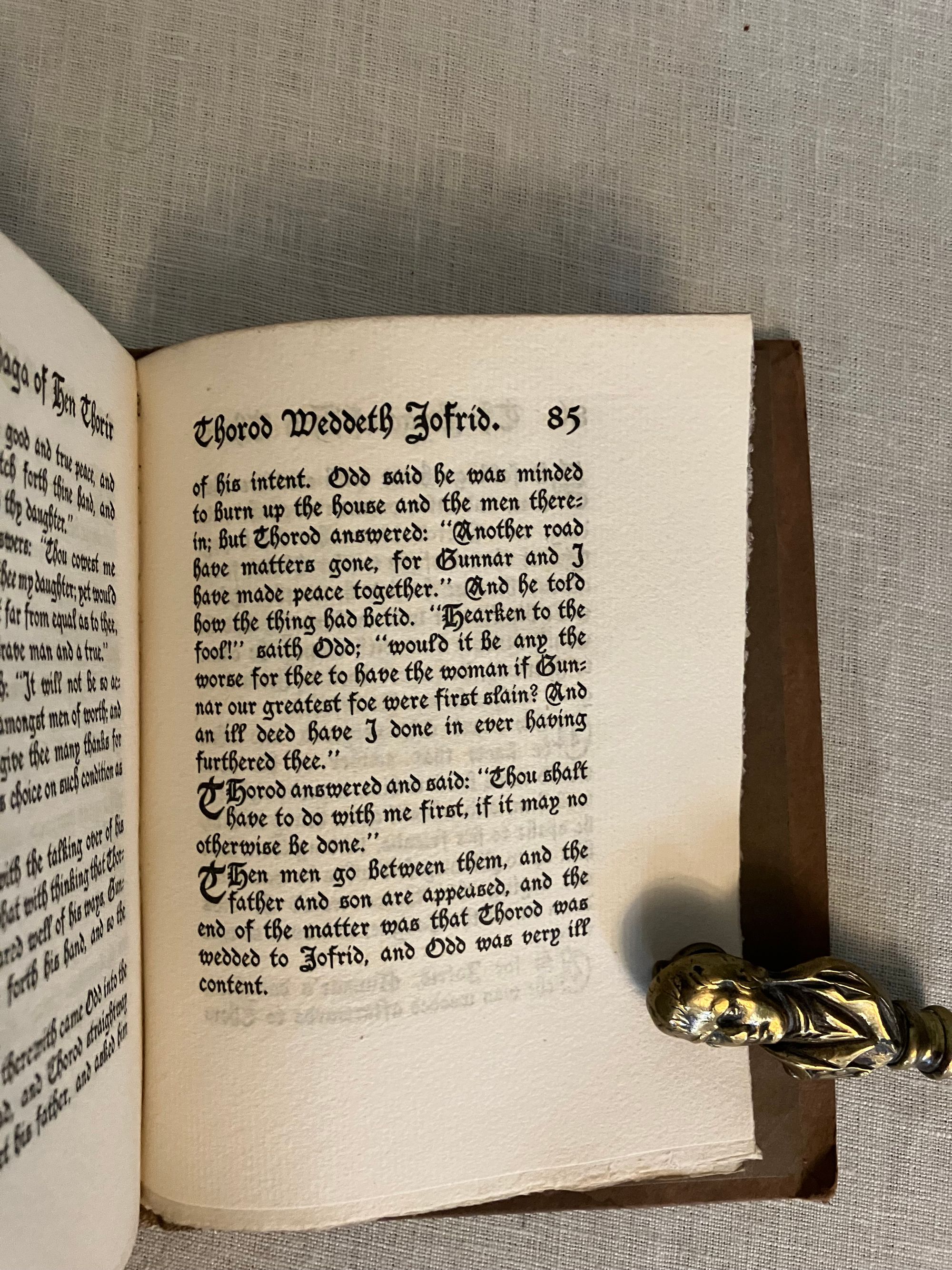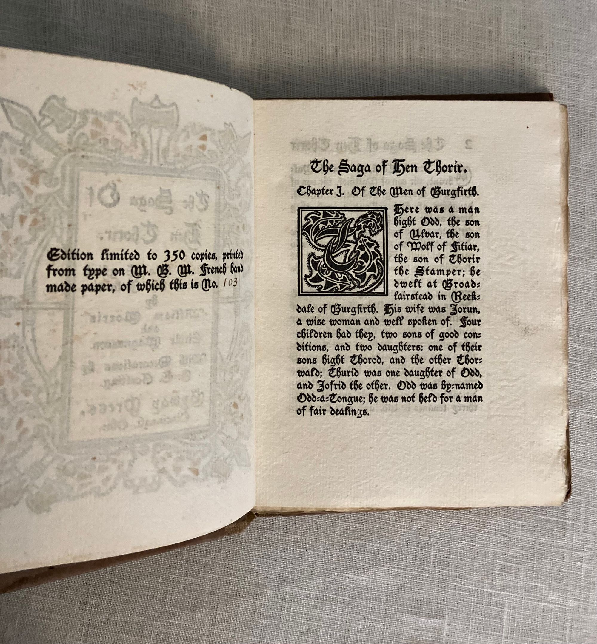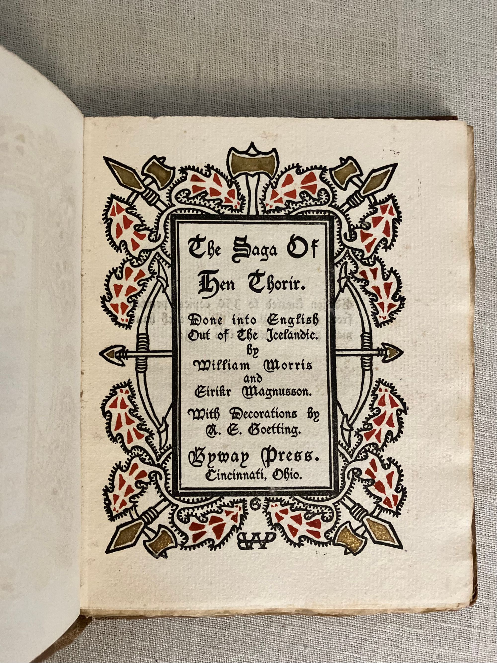 Hard cover, 12mo (measuring 5 x 6 1/2 inches) in quarter brown linen over brown paper-covered boards, the title in gilt on an identical brown paper label applied to front board, outlined in blind. Similar pastedowns. Ghost of bookplate removal to front pastedown. Handsewn with visible stitches seen in gutter of pastedowns. Applied brown paper label to spine, now illegible. Printed on WBW watermarked paper, partially unopened with other edges untrimmed, numbered 103 on limitation page. (8) 87, (5) pp. , First (only) edition. The decorative bordered title page is hand colored with red and gold accents to the black text. Additional incidental carved vignettes appear as chapter footers and historiated caps.** This seems to be a printer or binder's dummy, based on differences seen to other copies. Ours has a gilt tooled paper label, which seems to have been rejected in the end for the use of blind tooling to the front board. Secondly, there is a partial, illegible brown paper label applied to the spine which seems to be "tried for size" with the normal copies having a black printed cream spine label. At least some of the edition would be bound in handmade marbled paper with similar marbled paste downs, both of which are lacking here.** CONDITION: Very Good. There is a tideline of old moisture stain to the paper covered boards where the glue was applied. There is some foxing seen verso the hand-colored details. A few printer's smudges, or jig marks are seen to the pages within. Bookplate or other label ghost on front pastedown. In conclusion, the peculiarities seen in this item are valuable in showing the printer/designer's decision-making process, perhaps analogous to seeing an artist's under-painting in which the position of a limb might be changed mid-process to improve the design.**The Story of Hen-Thorir was translated in 1891 from the Icelandic by William Morris and his Cambridge tutor in Old Norse, Eikir Magnusson (1833-1913). Images of Morris's beautiful, original illuminated calligraphic MS translation can be seen at The Morris Archive at the University of Iowa (from the Bodleian MS.) ***PUBLISHER, The Byway Studio Press, a letterpress run by A.E. Curtis of Cincinnatti, Ohio, began in 1903. This title is the first imprint of The Byway Press, and appears under the publisher's former name A.E. Goetting, dated 1903. (The name change was in response to the divorce of his parents.) An article in the Cincinnati Enquirer (1/29/1950, p.85) details his background as a four-year scholarship winner at the Cincinnatti School of Art beginning in 1901. He and his wife ran the printing/publishing business out of their home. The occasion of the article was the inclusion of his 1923 imprint, "The Masque of the Red Death," in a 1950 exhibition of Edgar Alan Poe works shown at the Library of Congress. Thus, a scarce production dummy of the artist/printer's very first publication, done with a unique, rustic design interpretation reflecting the ancient roots of the material.( The colophon is not shown as that page remains unopened.)W. Ransom, (1927) Byway Studio Press checklist No.1 (of 3 titles only), p. 224. S.O. Thompson, (1996) p .202.