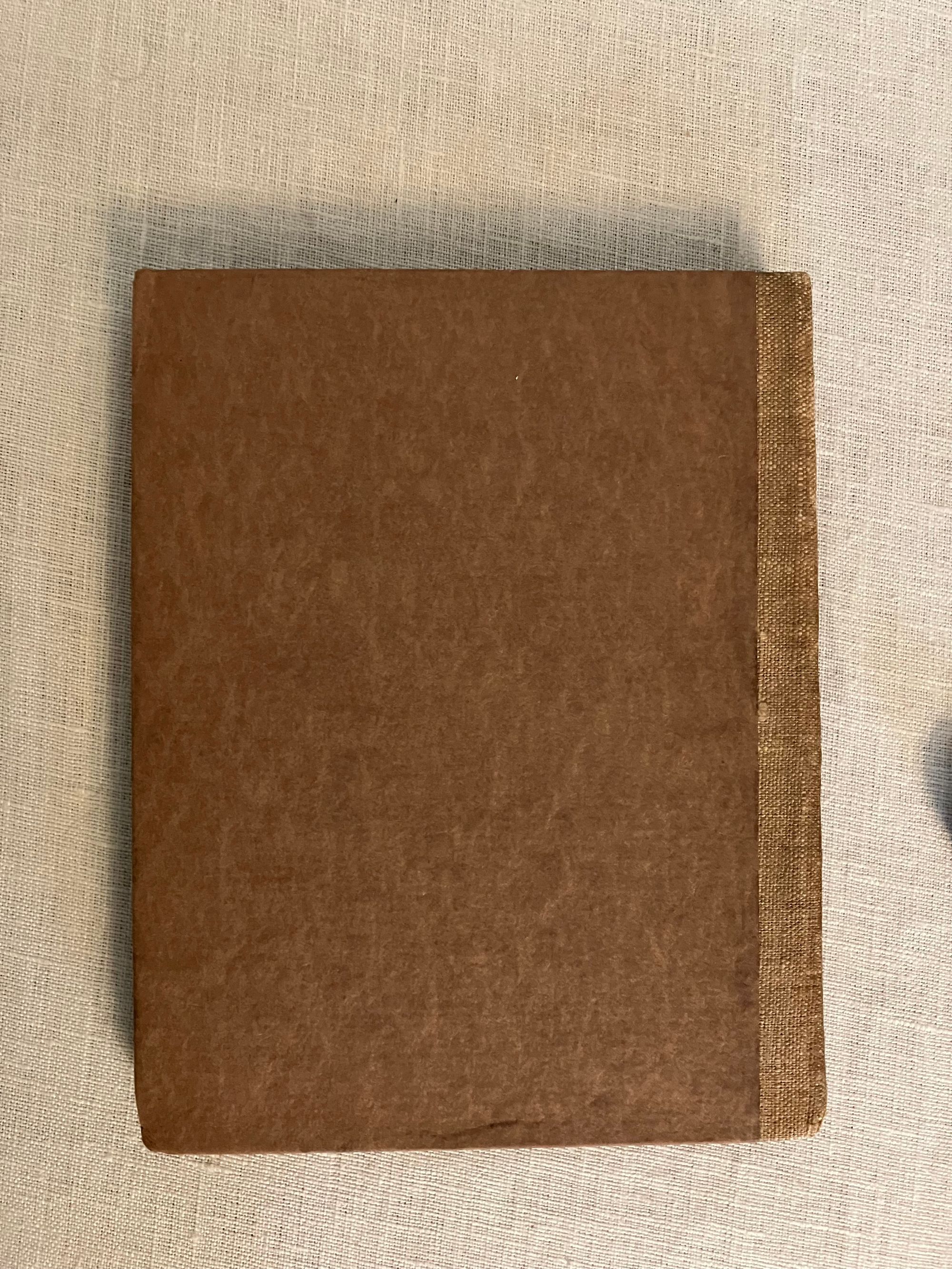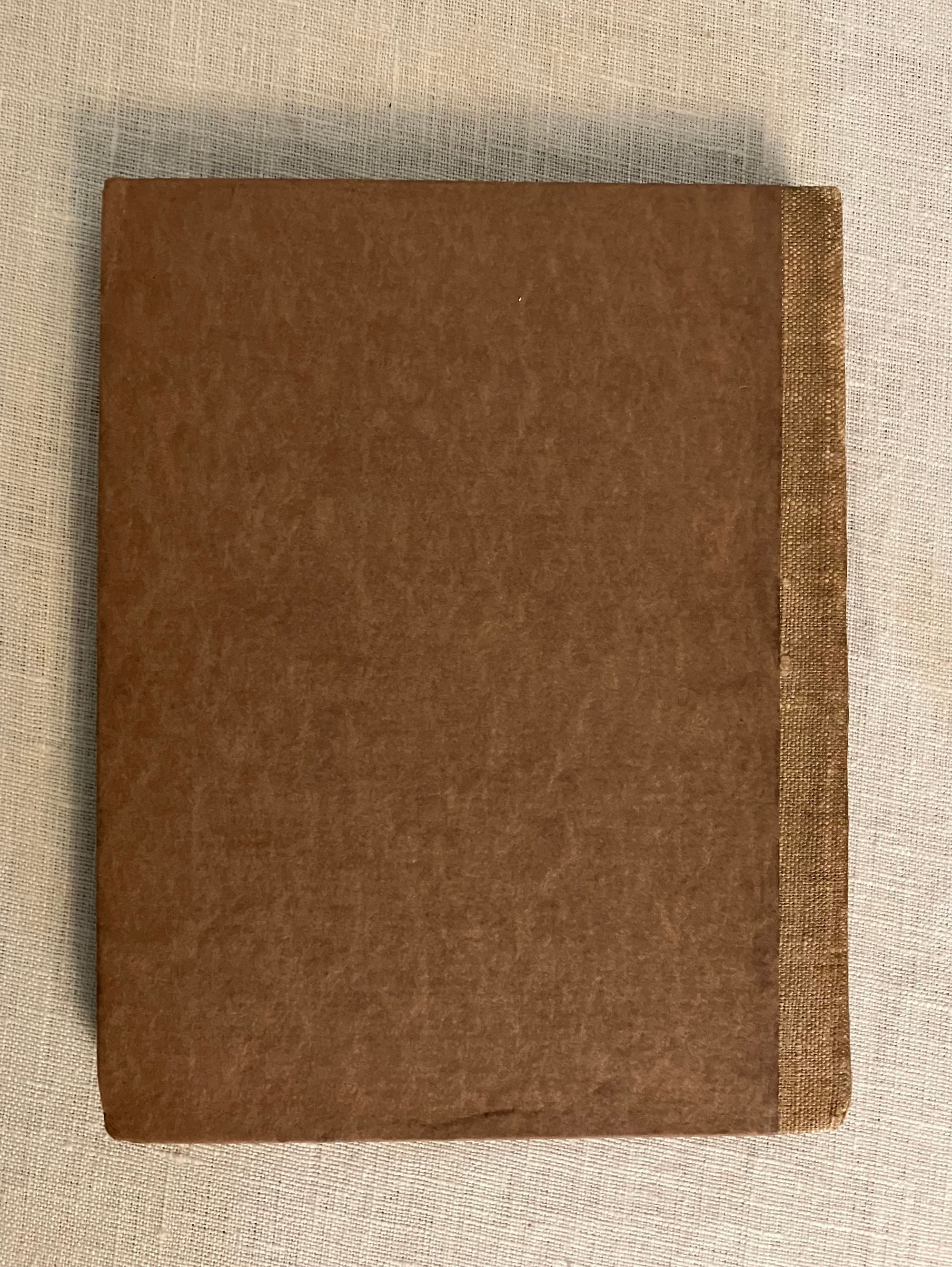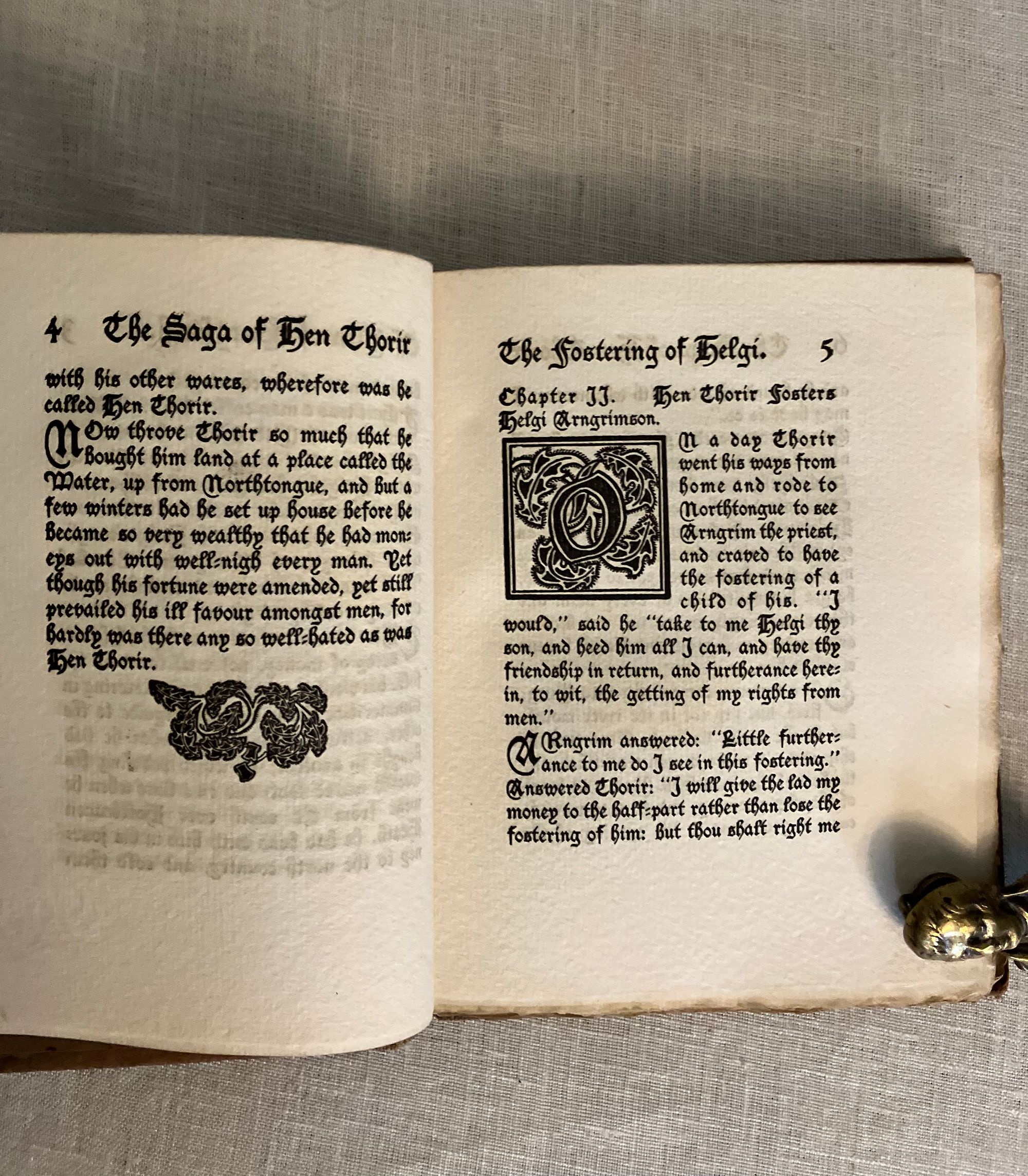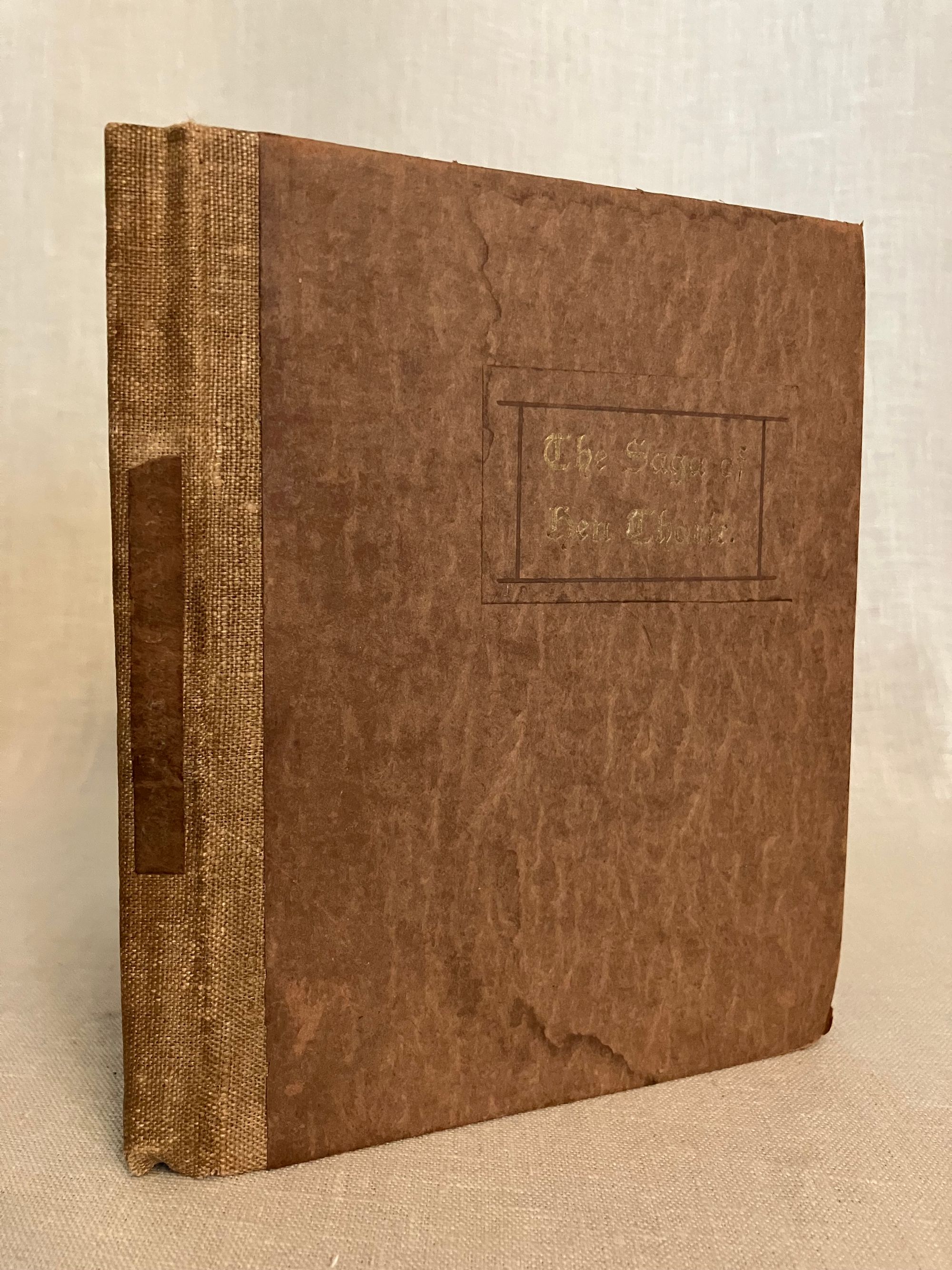 Hard cover, 12mo (measuring 5 x 6 1/2 inches) in quarter brown linen over brown paper-covered boards, the title in gilt on an identical brown paper label applied to front board, outlined in blind. Similar pastedowns. Ghost of bookplate removal to front pastedown. Handsewn with visible stitches seen in gutter of pastedowns. Applied brown paper label to spine, now illegible. Printed on WBW watermarked paper, partially unopened with other edges untrimmed, numbered 103 on limitation page. (8) 87, (5) pp. , First (only) edition. The decorative bordered title page is hand colored with red and gold accents to the black text. Additional incidental carved vignettes appear as chapter footers and historiated caps.** This seems to be a printer or binder's dummy, based on differences seen to other copies. Ours has a gilt tooled paper label, which seems to have been rejected in the end for the use of blind tooling to the front board. Secondly, there is a partial, illegible brown paper label applied to the spine which seems to be "tried for size" with the normal copies having a black printed cream spine label. At least some of the edition would be bound in handmade marbled paper with similar marbled paste downs, both of which are lacking here.** CONDITION: Very Good. There is a tideline of old moisture stain to the paper covered boards where the glue was applied. There is some foxing seen verso the hand-colored details. A few printer's smudges, or jig marks are seen to the pages within. Bookplate or other label ghost on front pastedown. In conclusion, the peculiarities seen in this item are valuable in showing the printer/designer's decision-making process, perhaps analogous to seeing an artist's under-painting in which the position of a limb might be changed mid-process to improve the design.**The Story of Hen-Thorir was translated in 1891 from the Icelandic by William Morris and his Cambridge tutor in Old Norse, Eikir Magnusson (1833-1913). Images of Morris's beautiful, original illuminated calligraphic MS translation can be seen at The Morris Archive at the University of Iowa (from the Bodleian MS.) ***PUBLISHER, The Byway Studio Press, a letterpress run by A.E. Curtis of Cincinnatti, Ohio, began in 1903. This title is the first imprint of The Byway Press, and appears under the publisher's former name A.E. Goetting, dated 1903. (The name change was in response to the divorce of his parents.) An article in the Cincinnati Enquirer (1/29/1950, p.85) details his background as a four-year scholarship winner at the Cincinnatti School of Art beginning in 1901. He and his wife ran the printing/publishing business out of their home. The occasion of the article was the inclusion of his 1923 imprint, "The Masque of the Red Death," in a 1950 exhibition of Edgar Alan Poe works shown at the Library of Congress. Thus, a scarce production dummy of the artist/printer's very first publication, done with a unique, rustic design interpretation reflecting the ancient roots of the material.( The colophon is not shown as that page remains unopened.)W. Ransom, (1927) Byway Studio Press checklist No.1 (of 3 titles only), p. 224. S.O. Thompson, (1996) p .202.