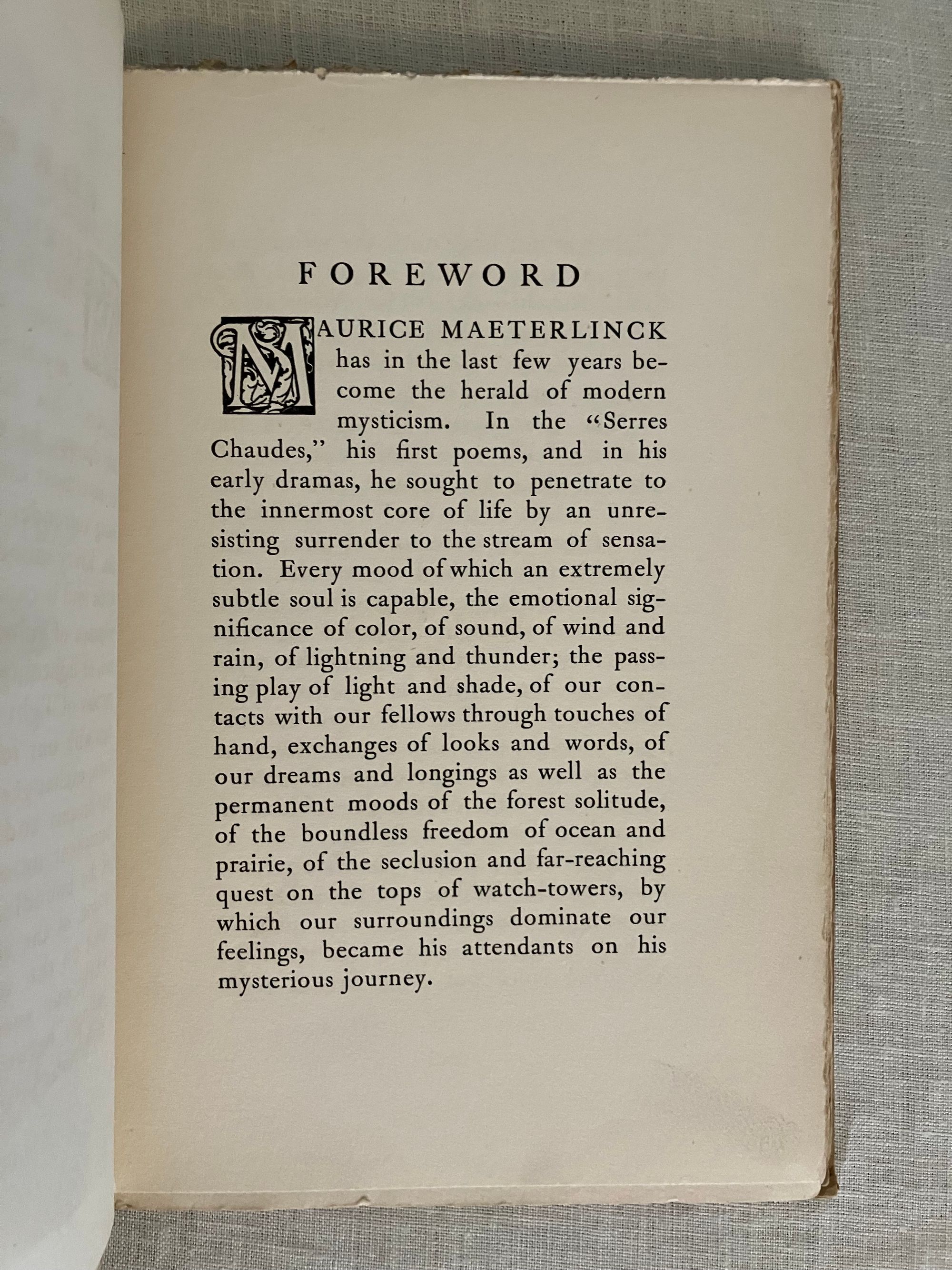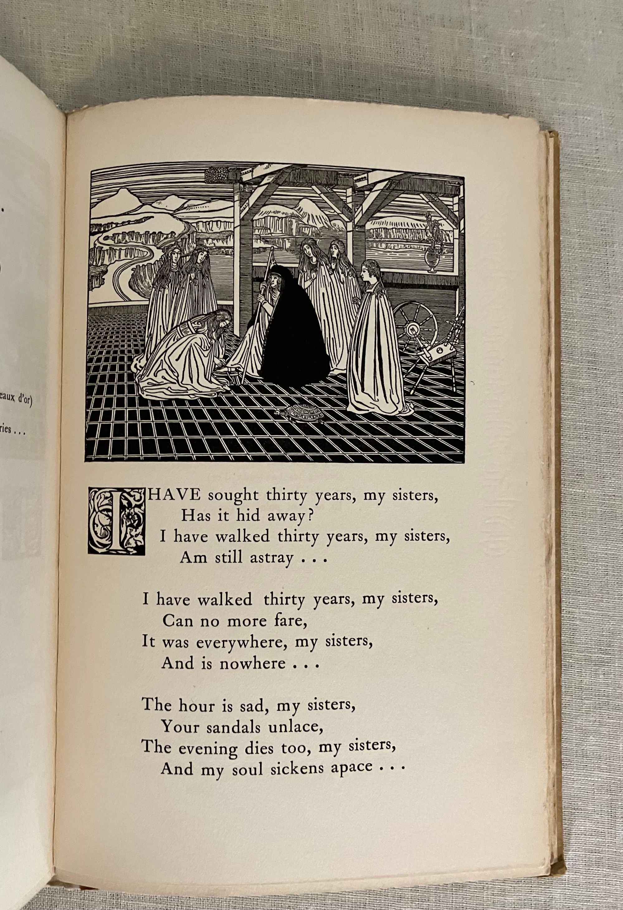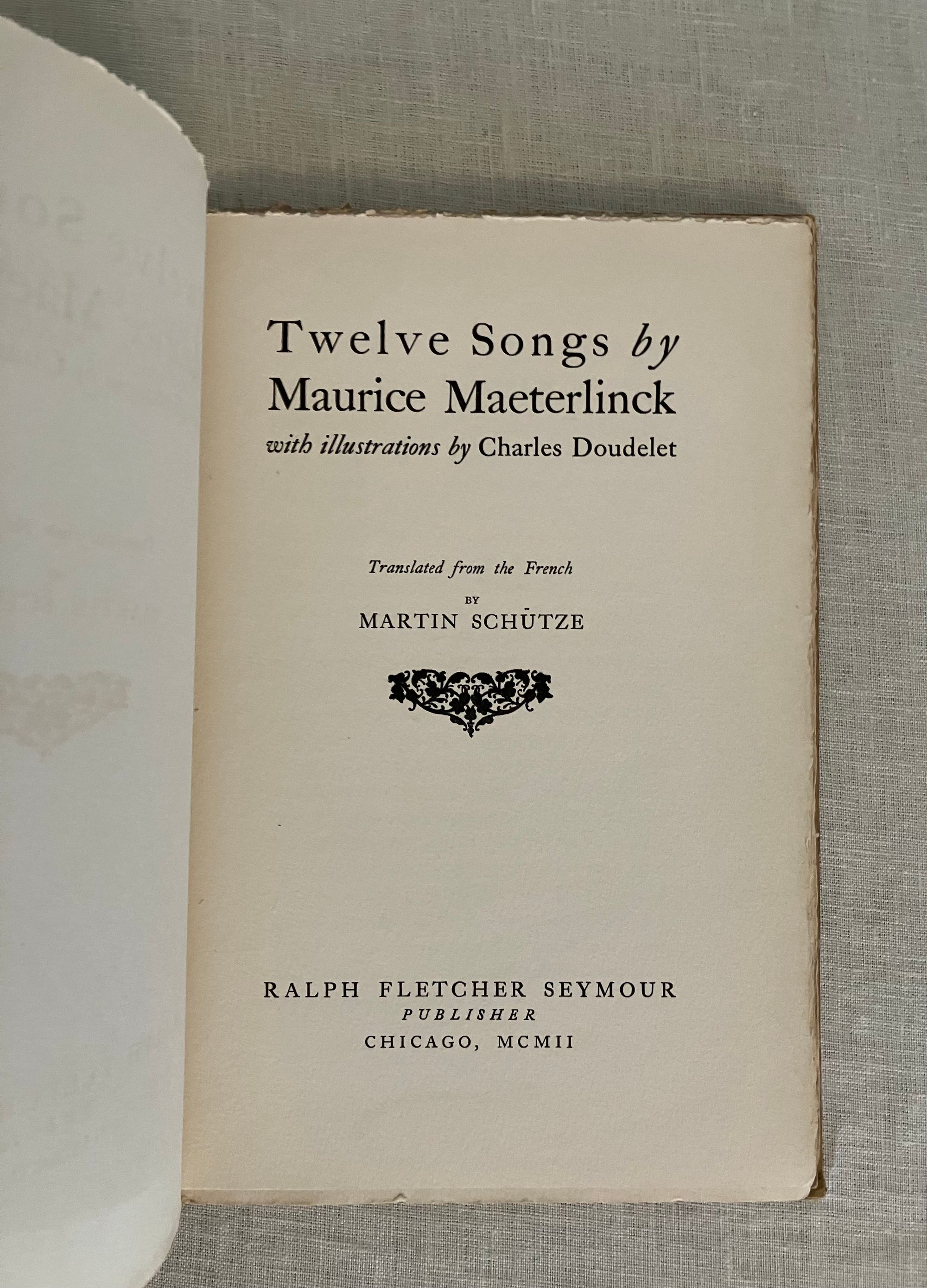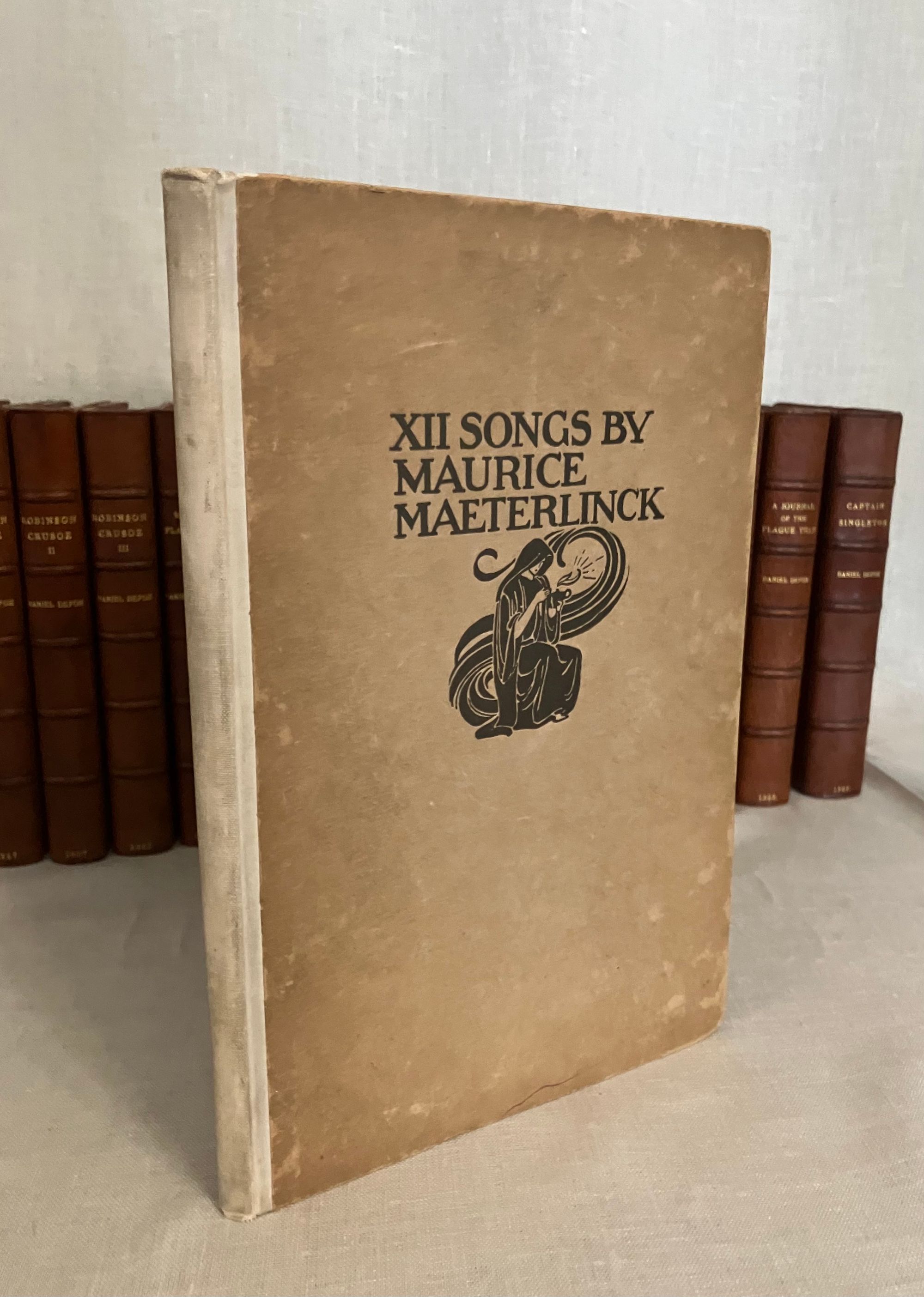 Hard cover, 8vo, in quarter cream cloth over brown paper covered boards, decorated with illustration and titles in brown to top board, the text printed on art paper, edges untrimmed, [36pp.] unpaginated, with limitation page at rear, 400 unnumbered copies. Contains historiated initial capitals and twelve half-page sized, or larger, illustrations by the French-born Symbolist Artist Charles Doudelet (1861-1938). In English and French. Publisher Ralph Fletcher Seymor was also the proprietor of the Alderbrink Press, the imprint not upon appearing in this book. He operated in Chicago from 1898. CONDITION: Very Good Minus, showing some wear to covers and corners, a cracked front hinge, soiling to spine, and light age-toning to text. Now in mylar.** Belgian-born Maeterlinck,(1862-1949) was acknowledged as an early adherent of the Symbolist movement in late nineteenth century art and letters, and the author won the Nobel Prize for Literature in 1911. He was also a noted playwright. In the Forward to this edition, the translator describes Maeterlinck's modern mysticism: "...he sought to penetrate to the innermost core of life by an unresisting surrender to the stream of sensation. Every mood of which an extremely subtle soul is capable, the emotional significance of color, of sound, of wind, and rain, of lightning and thunder; the passing play of light and shade, of our contacts with our fellows through touches of hands, exchanges of looks and words..." Poetry, he asserts, is the best expression of the spiritual consciousness. ** Frenchman Charles Doudelet's engraved illustrations are bold of line, divided into scenes reminiscent of a Renaissance emblem book. OCLC 1179213525. Will Ransom (1929) Aderbrink Press/ Ralph Seymor Fletcher checklist, No. 8 p., 196.