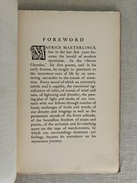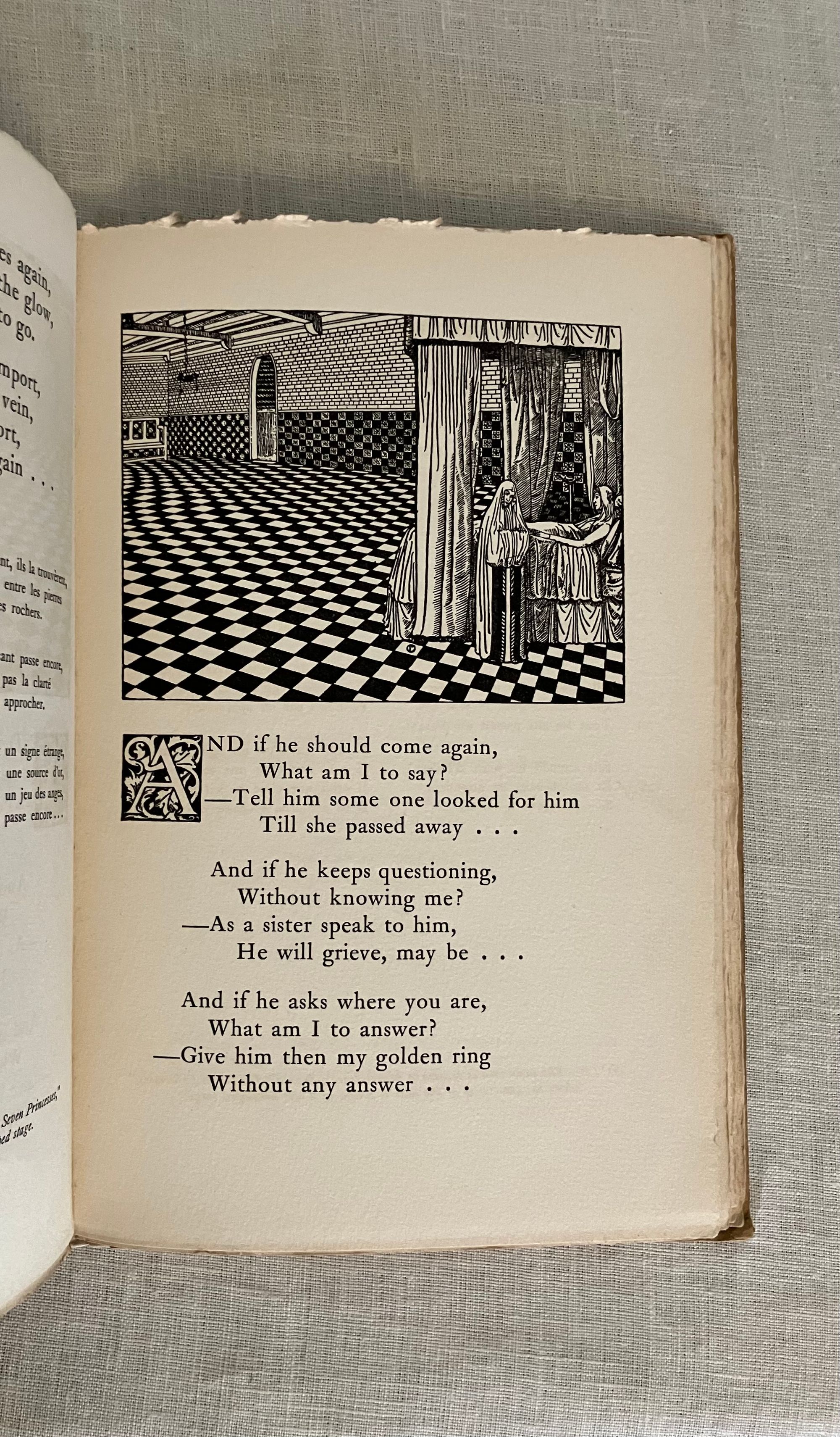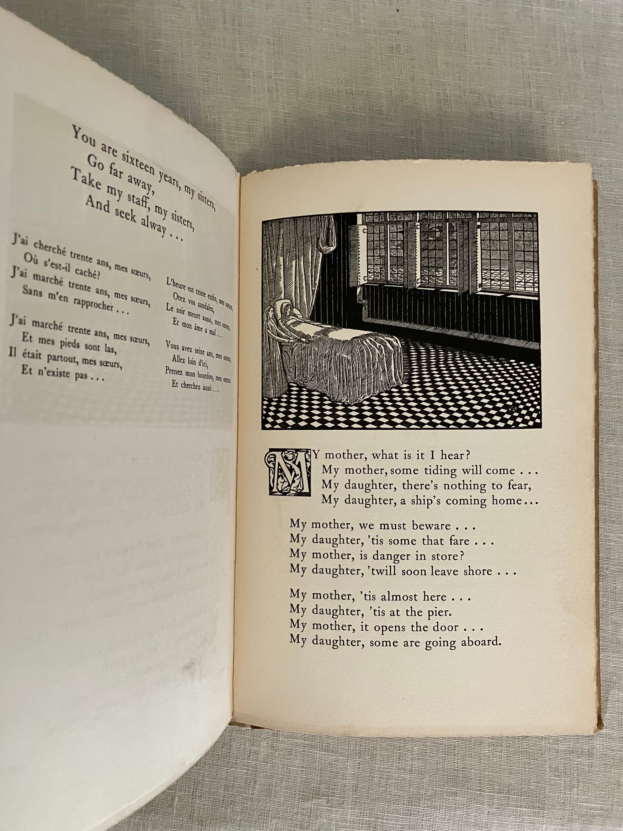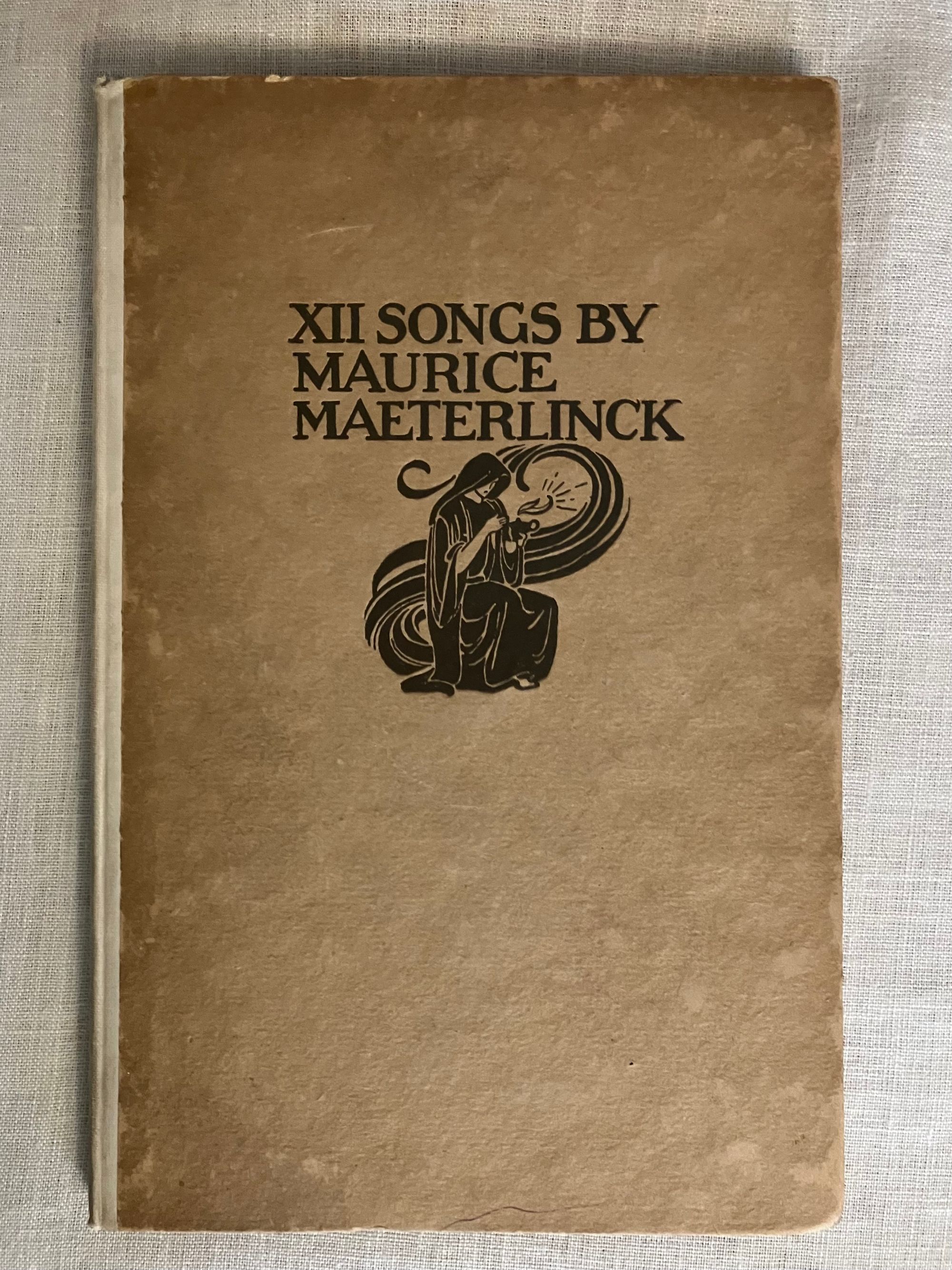 Hard cover, 8vo, in quarter cream cloth over brown paper covered boards, decorated with illustration and titles in brown to top board, the text printed on art paper, edges untrimmed, [36pp.] unpaginated, with limitation page at rear, 400 unnumbered copies. Contains historiated initial capitals and twelve half-page sized, or larger, illustrations by the French-born Symbolist Artist Charles Doudelet (1861-1938). In English and French. Publisher Ralph Fletcher Seymor was also the proprietor of the Alderbrink Press, the imprint not upon appearing in this book. He operated in Chicago from 1898. CONDITION: Very Good Minus, showing some wear to covers and corners, a cracked front hinge, soiling to spine, and light age-toning to text. Now in mylar.** Belgian-born Maeterlinck,(1862-1949) was acknowledged as an early adherent of the Symbolist movement in late nineteenth century art and letters, and the author won the Nobel Prize for Literature in 1911. He was also a noted playwright. In the Forward to this edition, the translator describes Maeterlinck's modern mysticism: "...he sought to penetrate to the innermost core of life by an unresisting surrender to the stream of sensation. Every mood of which an extremely subtle soul is capable, the emotional significance of color, of sound, of wind, and rain, of lightning and thunder; the passing play of light and shade, of our contacts with our fellows through touches of hands, exchanges of looks and words..." Poetry, he asserts, is the best expression of the spiritual consciousness. ** Frenchman Charles Doudelet's engraved illustrations are bold of line, divided into scenes reminiscent of a Renaissance emblem book. OCLC 1179213525. Will Ransom (1929) Aderbrink Press/ Ralph Seymor Fletcher checklist, No. 8 p., 196.