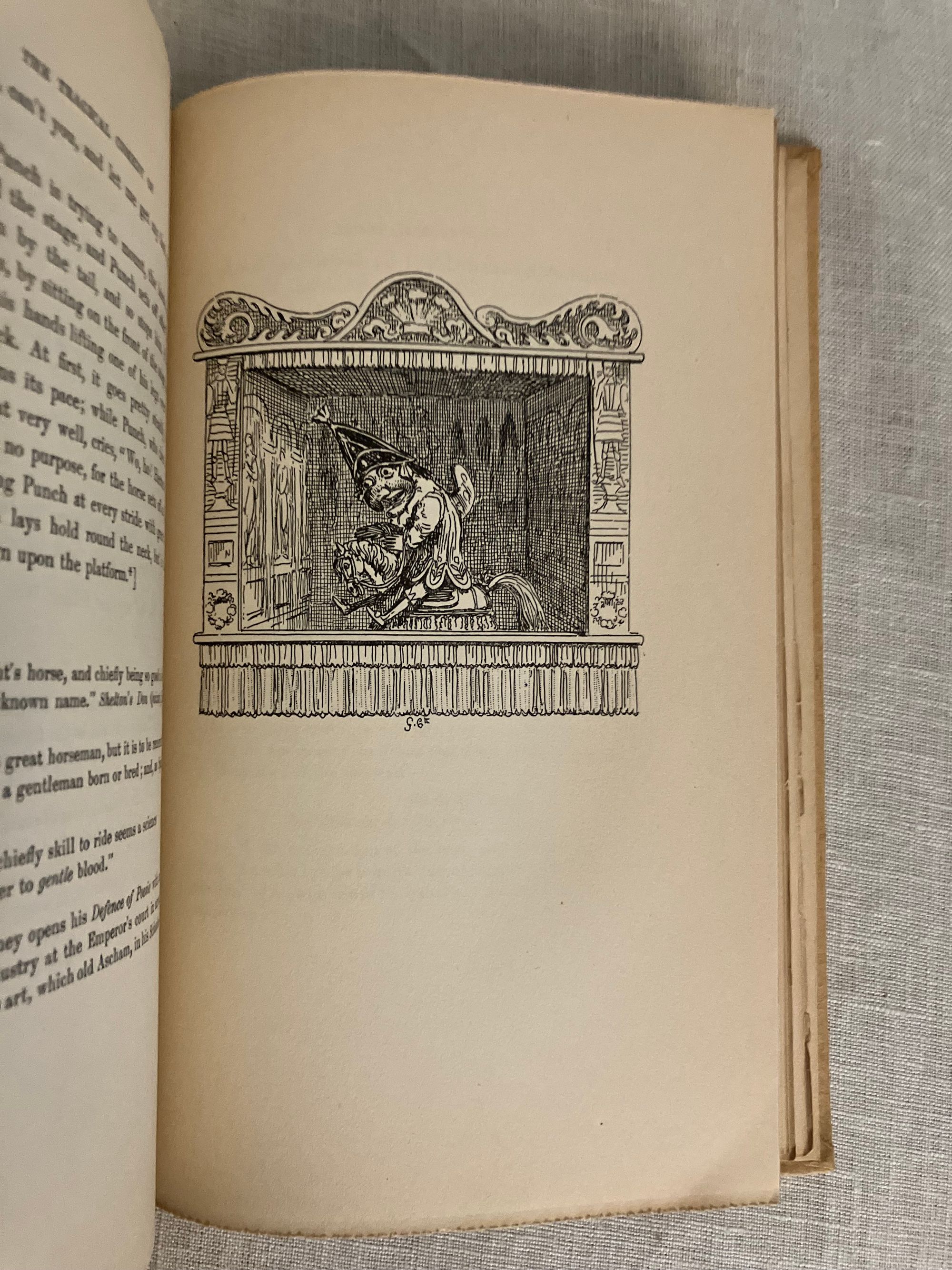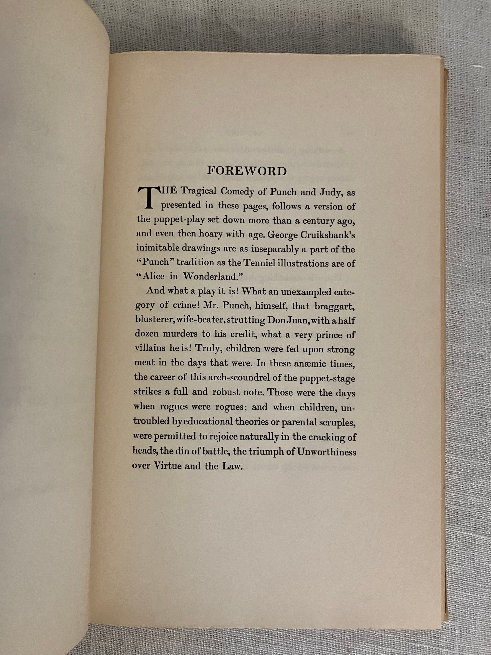 First Edition Thus. Hard cover, 8vo in quarter red buckram over hay-yellow paper covered boards, printed paper label in black on hay-yellow paper applied to the spine. xviii, 148 pp., 25 pp. with unnumbered illustration plates of the original 24 etchings and four woodcut engravings originally featured in the 1828 First Edition. This Limited Edition, numbered 169 of 376. Colophon: "An edition of 376 copies, designed and printed by D.B. Updike, The Merrymount Press, Boston; set in Scotch-free Type and printed on Wove Antique paper." Distributed by Doubleday, Doran and Company, Inc., New York, October 25, 1929.CONDITION: Very Good Plus. Small spot to front board, moderate age toning to pages, many unopened. Now in mylar. **The Punch and Judy puppet show is a classic of British entertainment, "when children, untroubled by educational theories or parental scruples, were permitted to rejoice naturally in the cracking of heads, the din of battle, the triumph of Unworthiness over Virtue and the Law." (from the Foreward.) This volume traces the remote seventeenth-century Italian roots of of the puppet drama, commedia dell'arte, the spread of marionette drama during the Thirty Years War, characterizations and text for the plays, as well as the enduring artistry of English Artist George Cruikshank's engravings of the same, as first seen in book form in 1828. Cruikshank's "signature"is a facsimile only to the ffep. The original drawings were hand-colored by Cruikshank in the first edition, and are now housed in the V & A Museum, South Kensington, London. OCLC 2720476.