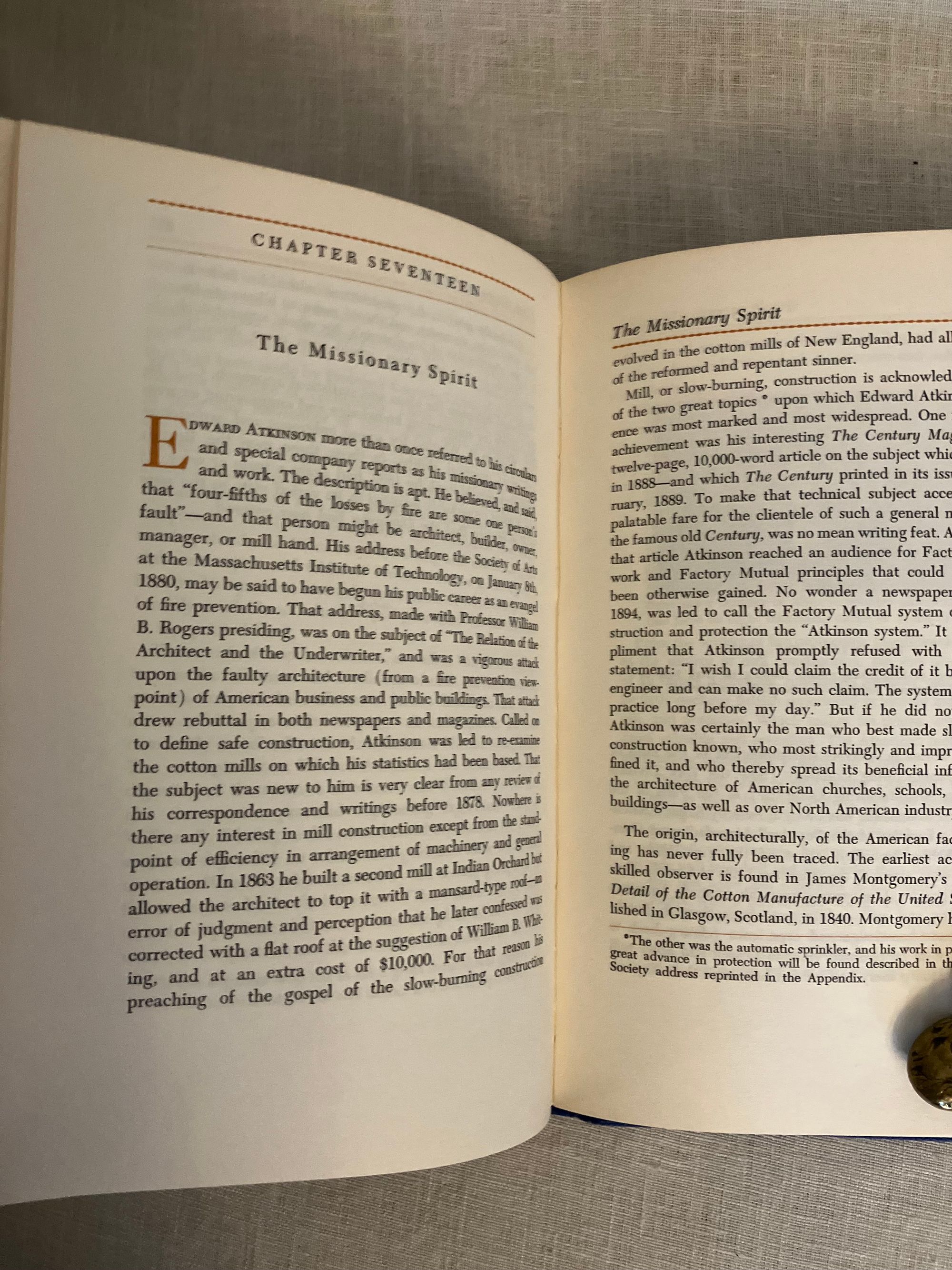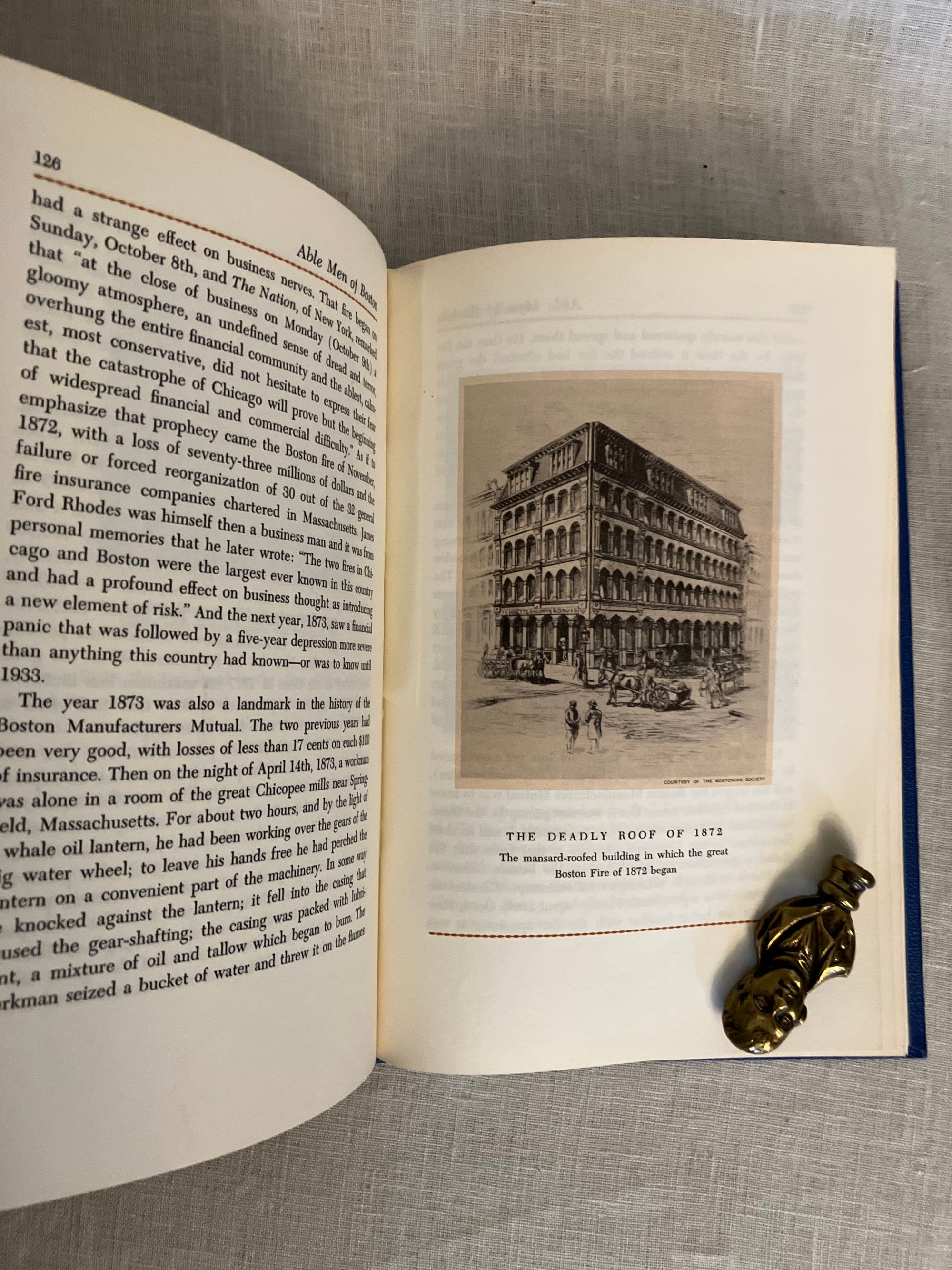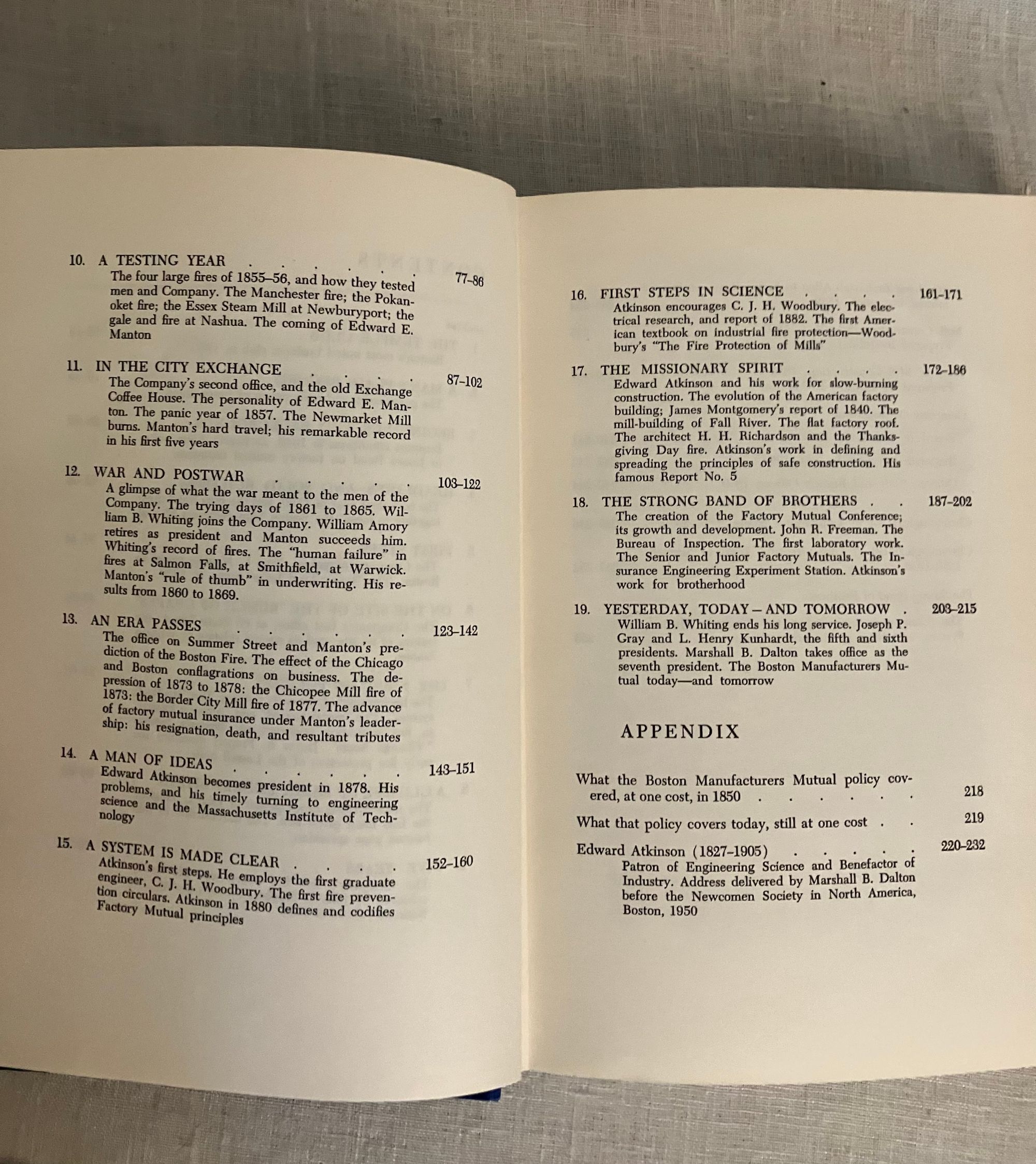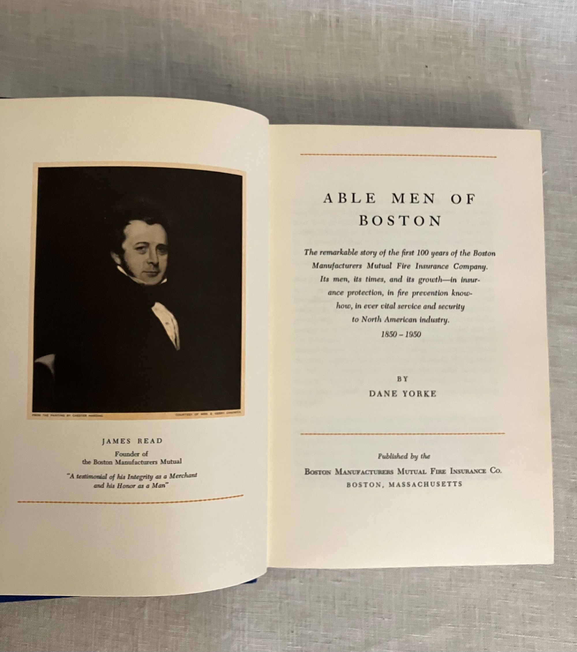 Hard cover, 8vo in blue cloth with titles in gold blocked to top board and on spine, blue endpapers, frontispiece portrait, rubricated title page, illustrations, 253pp., First Edition. This history of the BMMFIC was written by Dane Yorke, who, coincidentally, in 1942 was employed as a city librarian at the Boston's MacArthur Library, and is recorded as participating in a city-twinning broadcast on short wave radio WRUL between Biddeford, Maine and Bideford, Devon, Great Britain, as seen in a press cutting from the MacArthur Library. These broadcasts were considered an important source of morale for the populace of both countries during WW II. (See MacArthurArchivesdotorg). **The present work by this author, however, is a significant and very readable history of Boston industry, and the development of the civic infrastructure that supported it. Topics such as the first public water system in the United States are addressed, as a necessary forerunner to the works of the BMMFIC. A biography of the organization's first President, James Read (b. 1789) forms a portion of the book, with anecdotes of characters of Old Boston of the early nineteenth century. There are histories of mill fires, including one at the the Essex Steam Mill Newburyport in 1856, and the notorious Boston Fire of 1872, and the organization of mutual aid. CONDITION: Near Fine. Faint rubbing at front hinge. Lacking glassine, now in mylar.