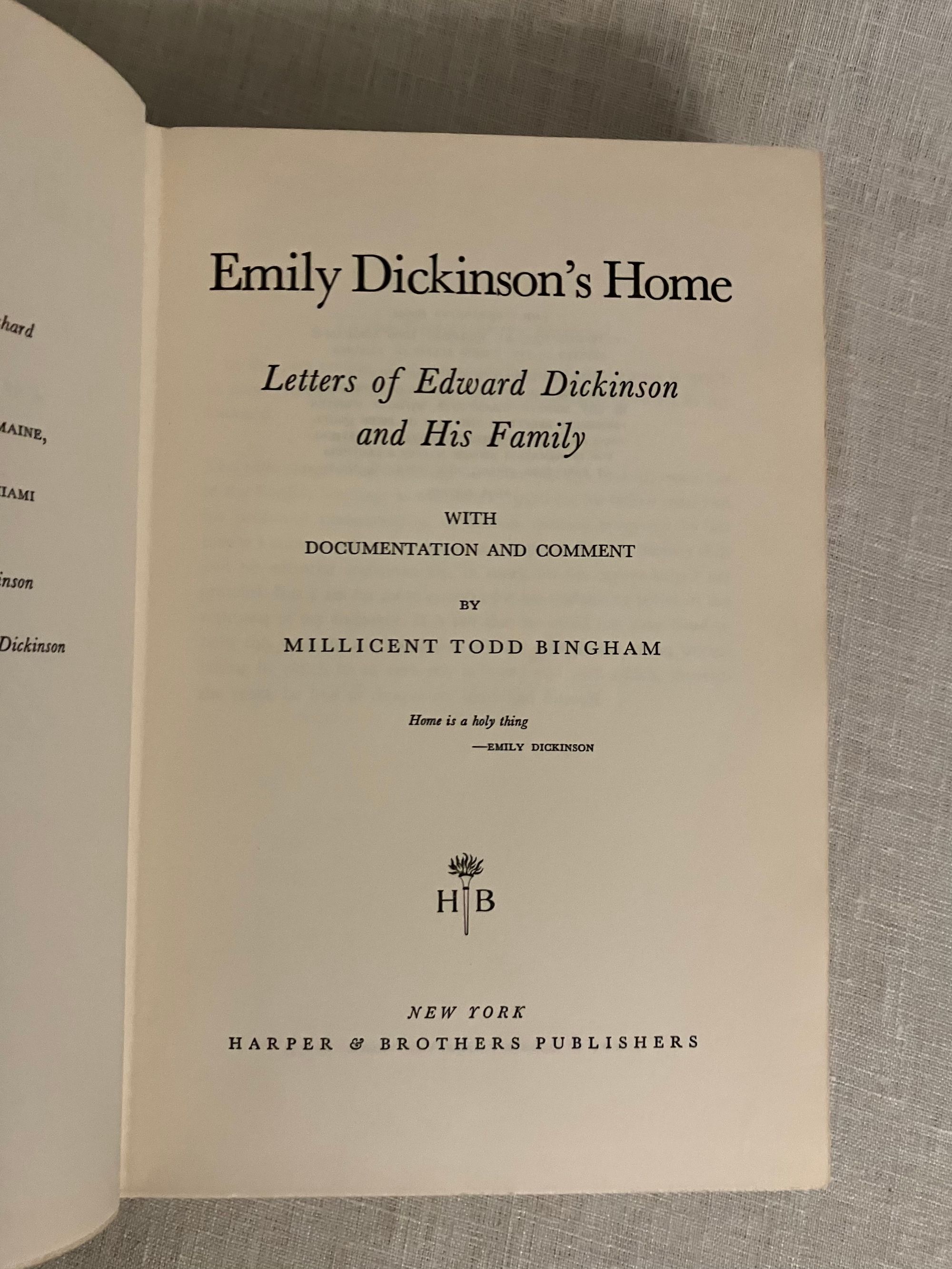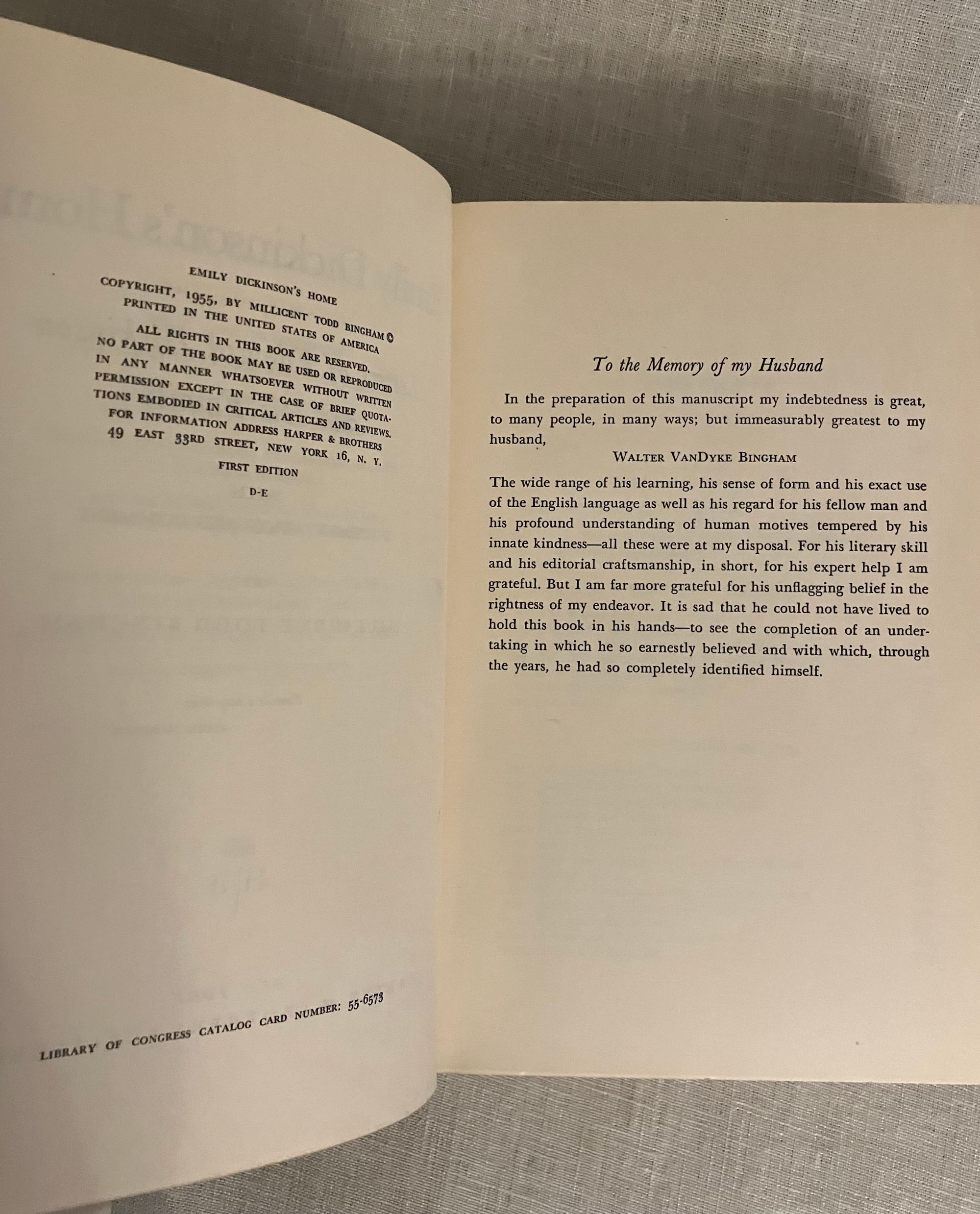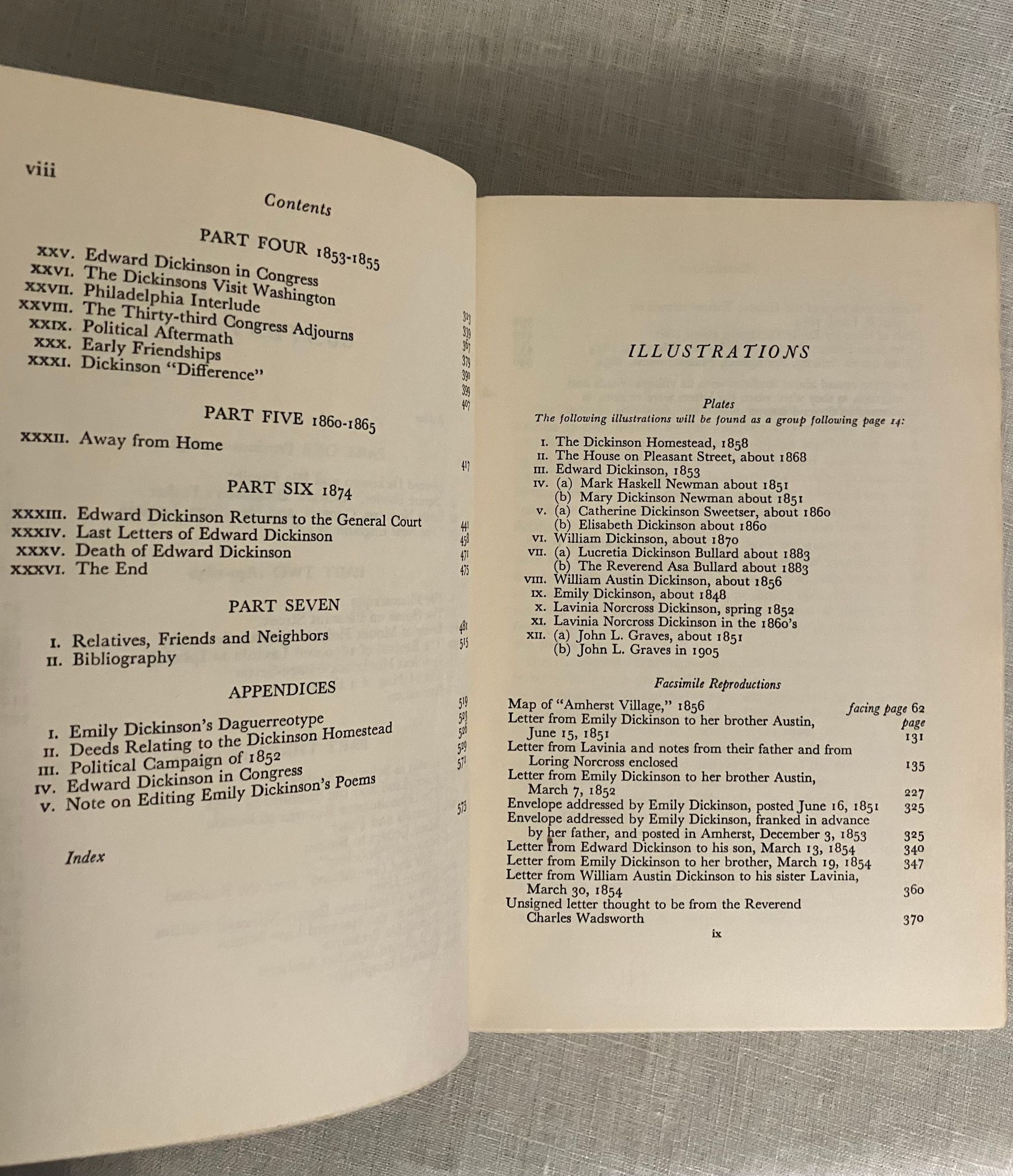 Hard cover, 8vo in green cloth, titles in gold, in the original tan and green dust jacket, map endpapers, xvii, 600pp. Stated First Edition, with Harper Code D-E , (for April, 1955). Includes the fold-out map, facsimile correspondence.**CONDITION: Near Fine. Slight edge wear, top edge of boards, otherwise exterior is very clean. D/j is price clipped, lightly sunned to spine, with light edgewear at head and tail of same. Pages are clean and bright.** This is the fourth in a series of four works about Dickinson by the Author Millicent Todd Bingham, who sidestepped a scholarly career in geology and geography when presented with a trunk of literary off-cuts and other unpublished materials by her mother, Mabel Todd Loomis (1856-1932). Loomis, along with Newburyport's own Rev. Thomas W. Higginson, were the original editors of the famously reclusive poet's works to the world. Loomis's choices have been controversial, perhaps affected by her longterm affair with the poet's brother, and a friendship with Emily which, although near neighbors, was carried on almost exclusively via correspondence. For the student of the works of Emily Dickinson, this biography presents much interesting source material about her upbringing, including background on her father, family life and Emily Dickinson's early education. From the blurb: " Anything that Mrs. Bingham has to contribute concerning the morbid world of Emily Dickinson is important because, as the daughter of the late Mabel Loomis Todd, she is the last survivor who had direct contact with the appalling heritage of speculation, mystery, rage and litigation that fell due with Emily Dickinson's death and has continued almost to the present." (Robert Hillyer) OCLC 271347.
