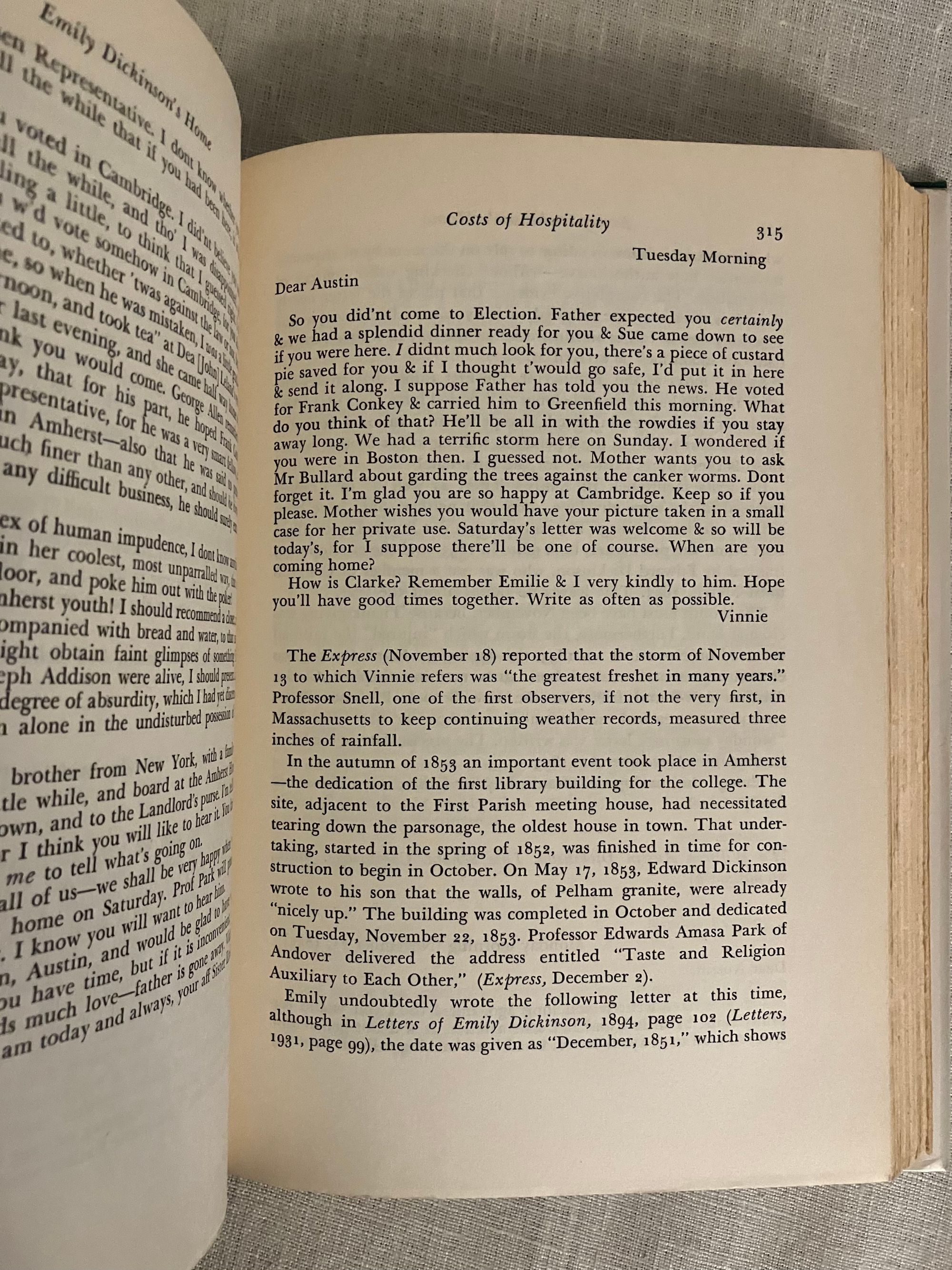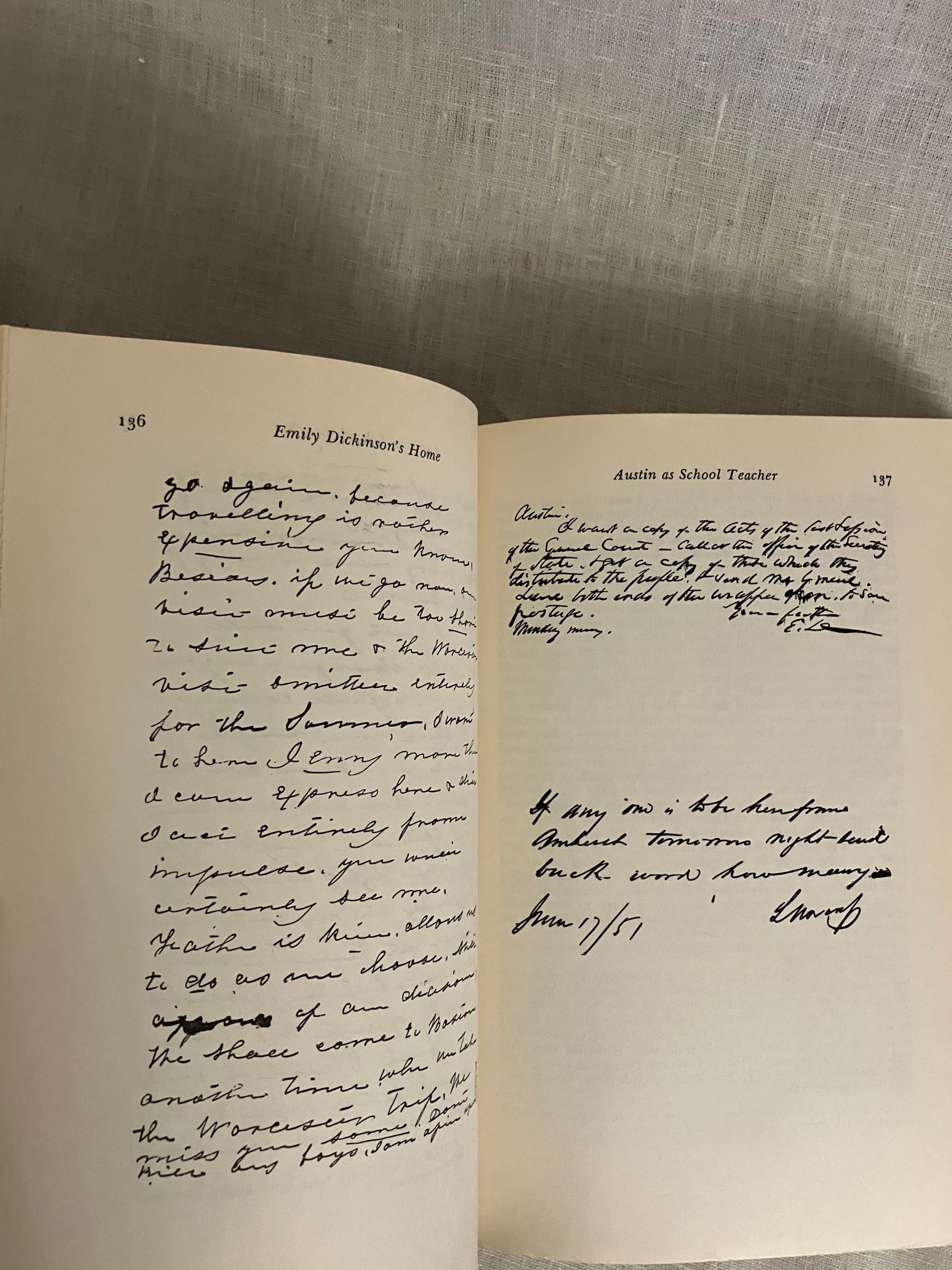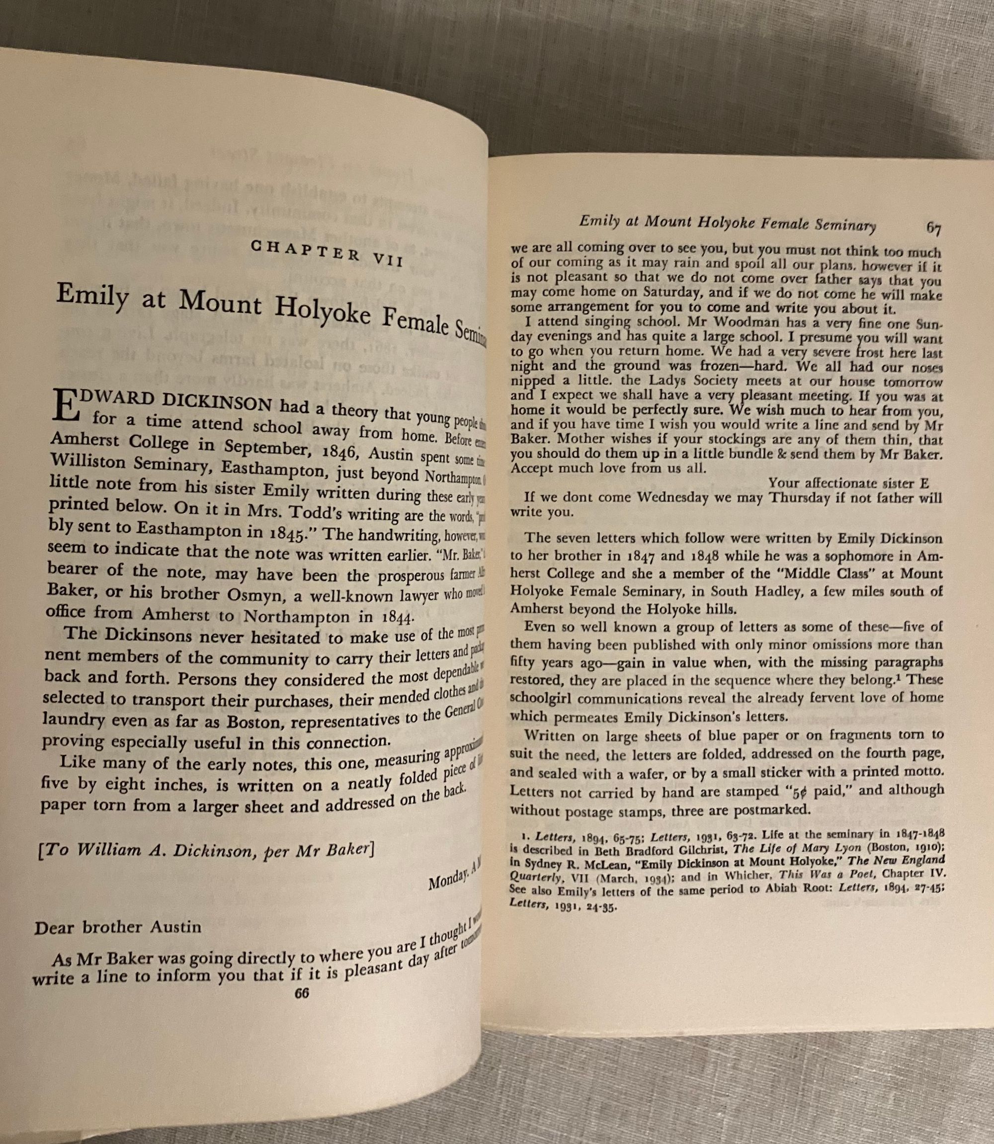 Hard cover, 8vo in green cloth, titles in gold, in the original tan and green dust jacket, map endpapers, xvii, 600pp. Stated First Edition, with Harper Code D-E , (for April, 1955). Includes the fold-out map, facsimile correspondence.**CONDITION: Near Fine. Slight edge wear, top edge of boards, otherwise exterior is very clean. D/j is price clipped, lightly sunned to spine, with light edgewear at head and tail of same. Pages are clean and bright.** This is the fourth in a series of four works about Dickinson by the Author Millicent Todd Bingham, who sidestepped a scholarly career in geology and geography when presented with a trunk of literary off-cuts and other unpublished materials by her mother, Mabel Todd Loomis (1856-1932). Loomis, along with Newburyport's own Rev. Thomas W. Higginson, were the original editors of the famously reclusive poet's works to the world. Loomis's choices have been controversial, perhaps affected by her longterm affair with the poet's brother, and a friendship with Emily which, although near neighbors, was carried on almost exclusively via correspondence. For the student of the works of Emily Dickinson, this biography presents much interesting source material about her upbringing, including background on her father, family life and Emily Dickinson's early education. From the blurb: " Anything that Mrs. Bingham has to contribute concerning the morbid world of Emily Dickinson is important because, as the daughter of the late Mabel Loomis Todd, she is the last survivor who had direct contact with the appalling heritage of speculation, mystery, rage and litigation that fell due with Emily Dickinson's death and has continued almost to the present." (Robert Hillyer) OCLC 271347.
