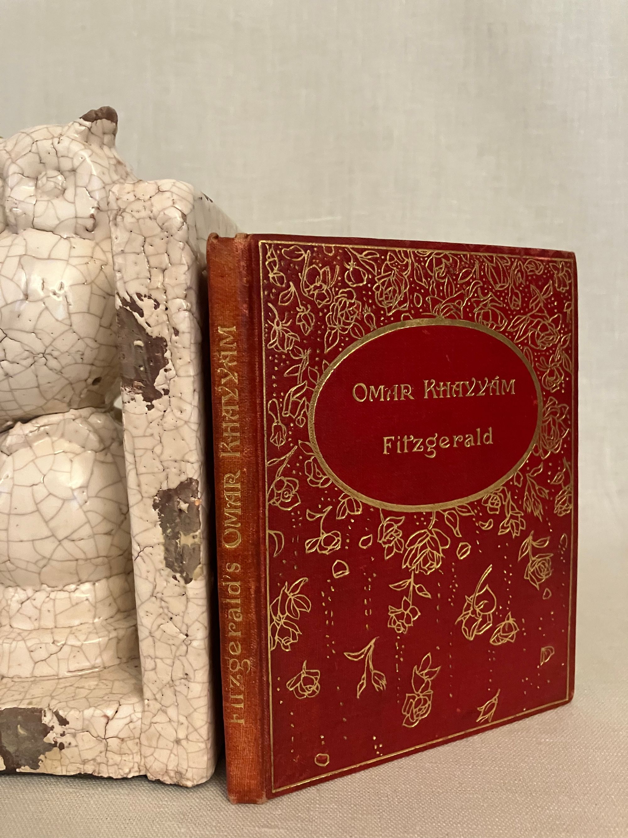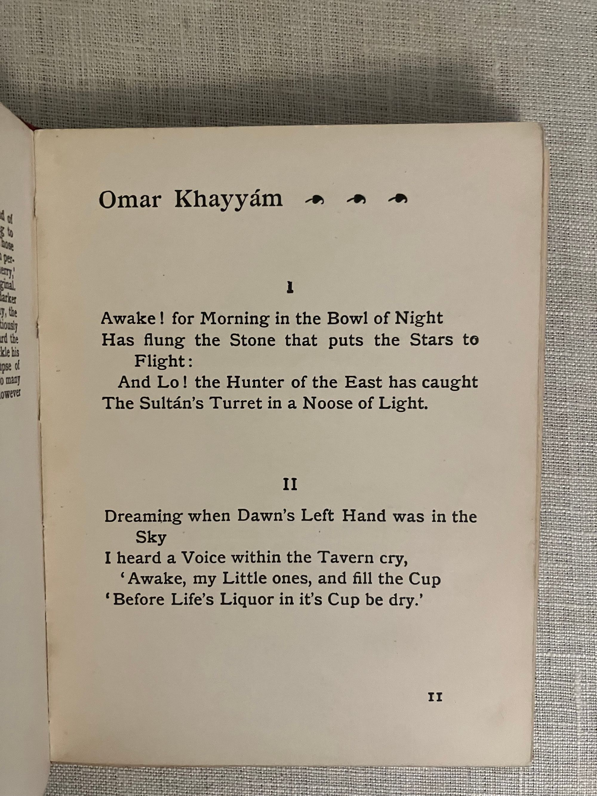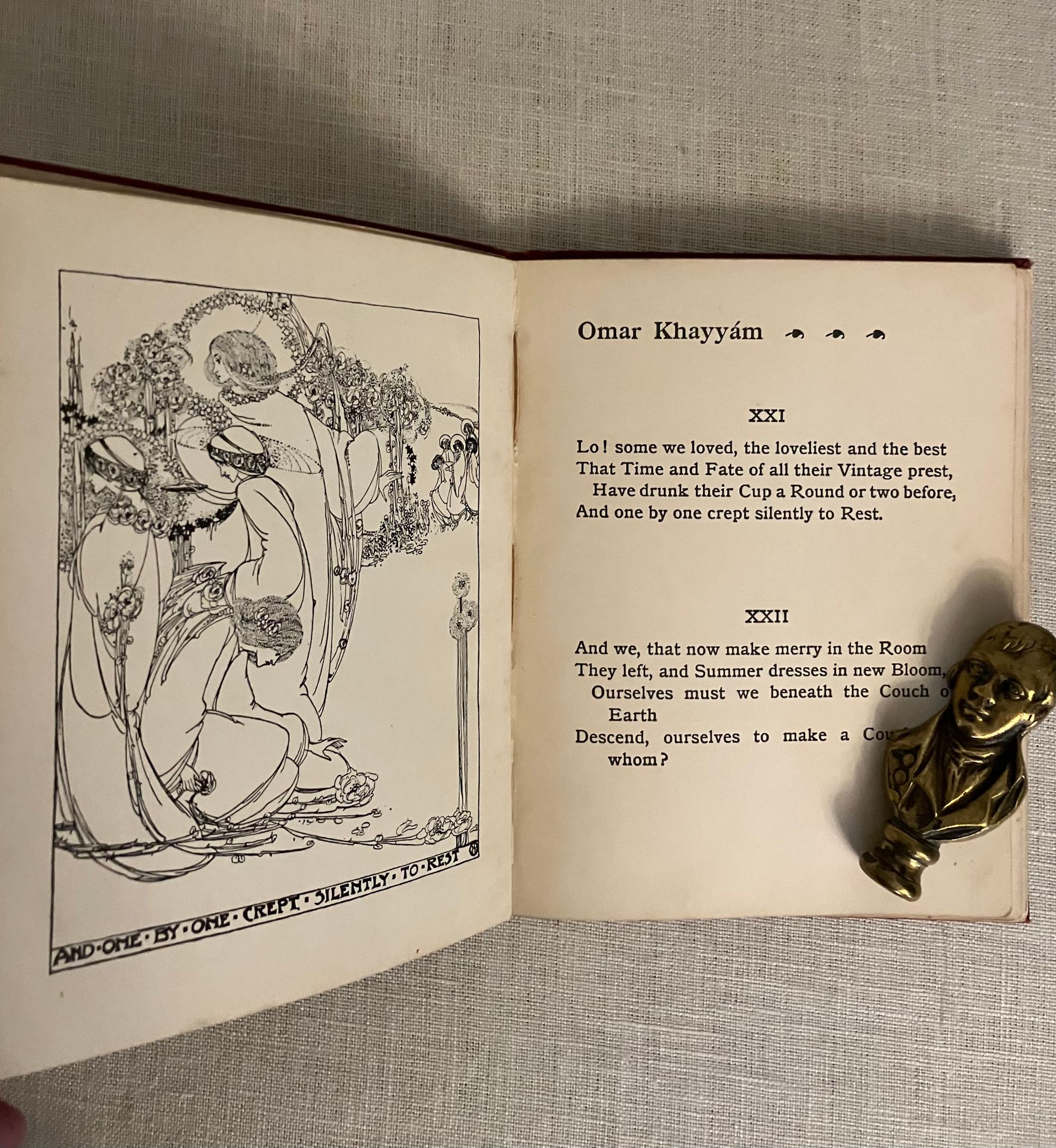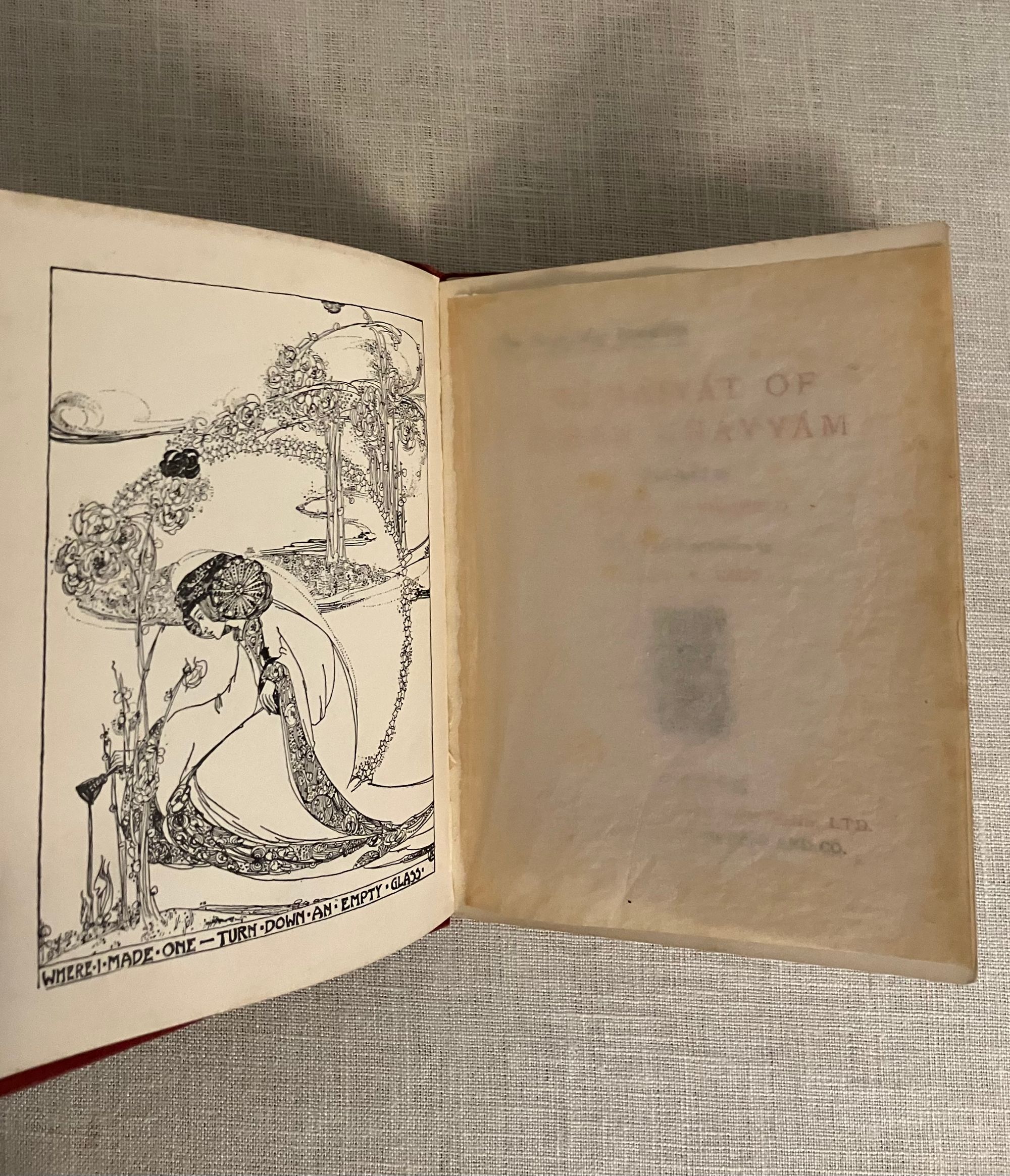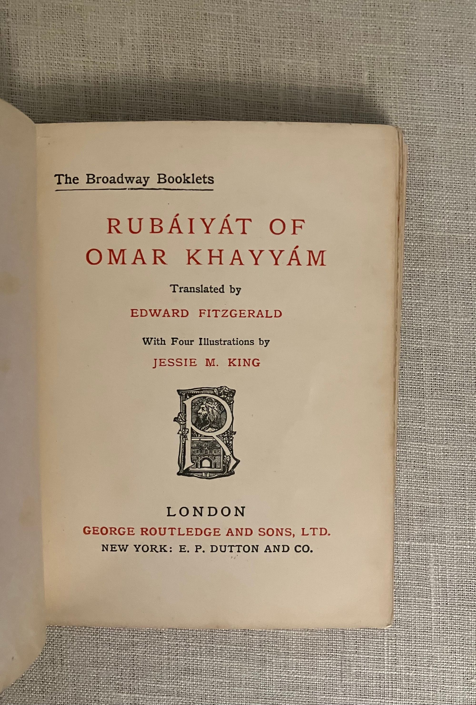 Hard Cover, 24mo, (4 x 5 1/2 inches) in decorated red cloth blocked in gold with a design of falling roses, the titles in an oval to the top board and along the spine, 47pp. undated but circa 1909. Contains four black and white illustrations by the Scottish artist, Jessie M. King (1875-1949.) The cover illustration is not by her. The tissue-guarded frontispiece illustration by King plus three additional black and white full page illustrations within the text, are each signed with her monogramed initials and titled with hand-lettering. Undated, but bibliographer cites a 1903 contract for these illustrations by King, and surmises this particular variation was from circa 1909. (see below) **CONDITION: Very Good, with some small marks to top of boards., more noticeable to rear board. A few signatures are slightly loose, but holding firm. Christmas inscription in old ink dated 1909 to ffep., plus a second fountain ink signature elsewhere in prelims. Illustrations are clean and bright, text and endpapers lightly toned.**These represent the artist's most collectible style of illustration. The titles of King's drawings are: "Where I Made One--Turn Down An Empty Glass," (frontis); "And One By One Crept Silently To Rest"; "Came Stealing Through the Dusk an Angel-Shape," and "The Angel With His Darker Draught." Executed in the artist's earliest style of finely detailed pen and ink on vellum drawings, paying some homage to the work of Aubrey Beardsley, but are also representing a uniquely Scottish interpretation of the Art Nouveau style of illustration. Along with fellow students at the Glasgow School of Art, under the instruction of Fra Newberry in the 1890's. King would later go on to illustrate children's books, sell her framed drawings, design silver, jewelry and textiles, and work as an important commercial book designer and illustrator. See Colin White, " A Guide to the Printed Work of Jessie M. King," (2007) B34, fifth variation p. 34.