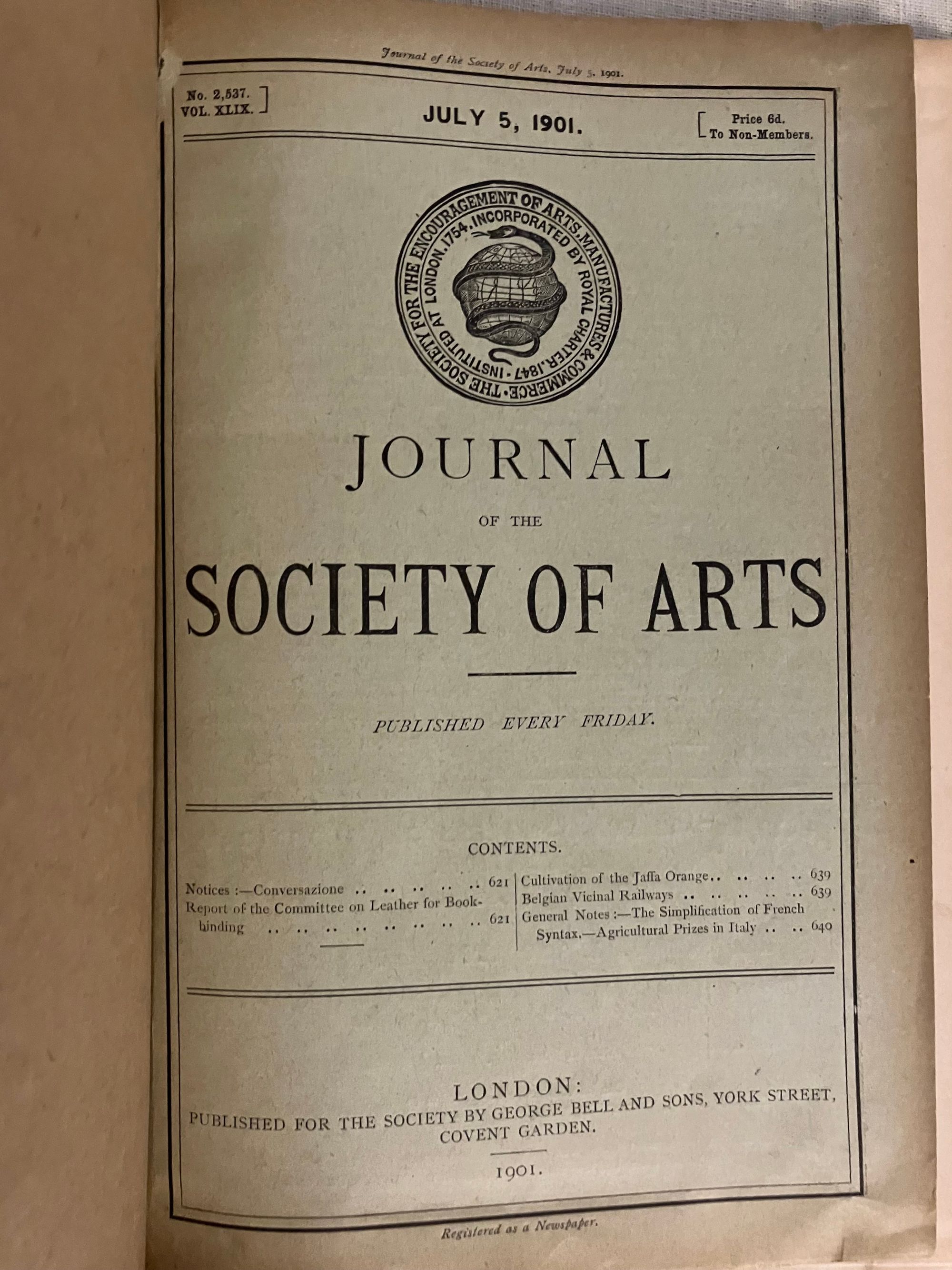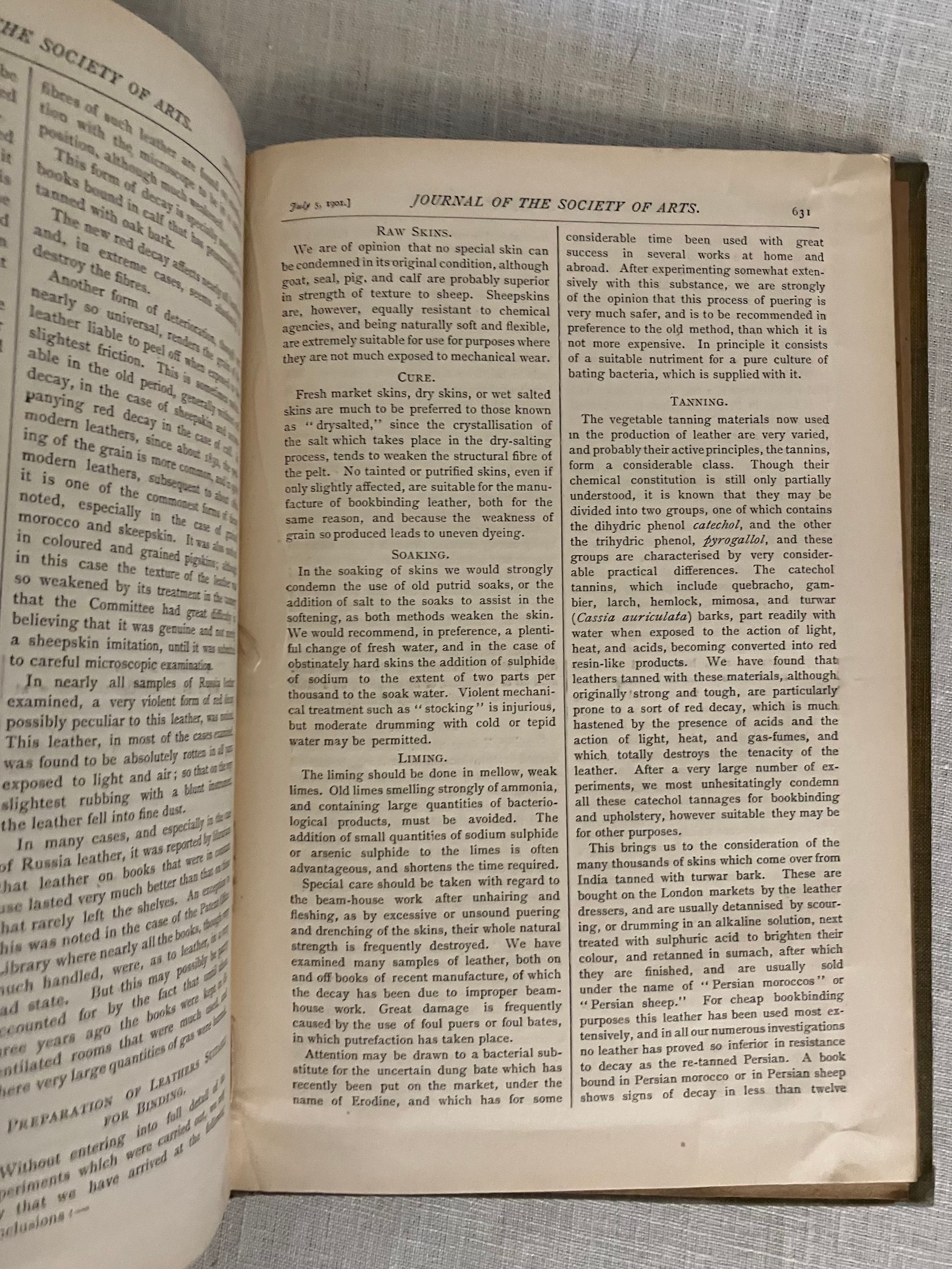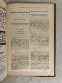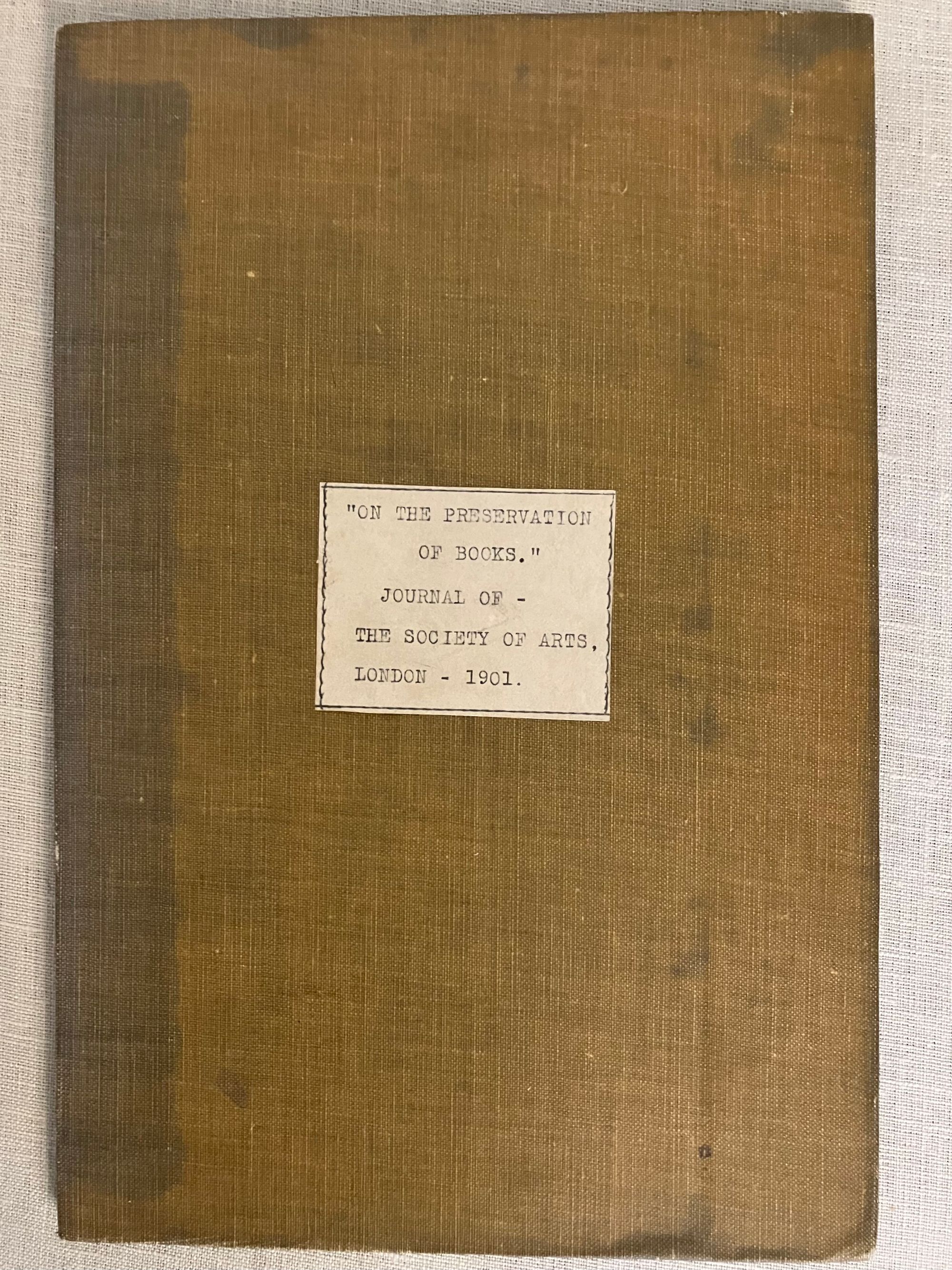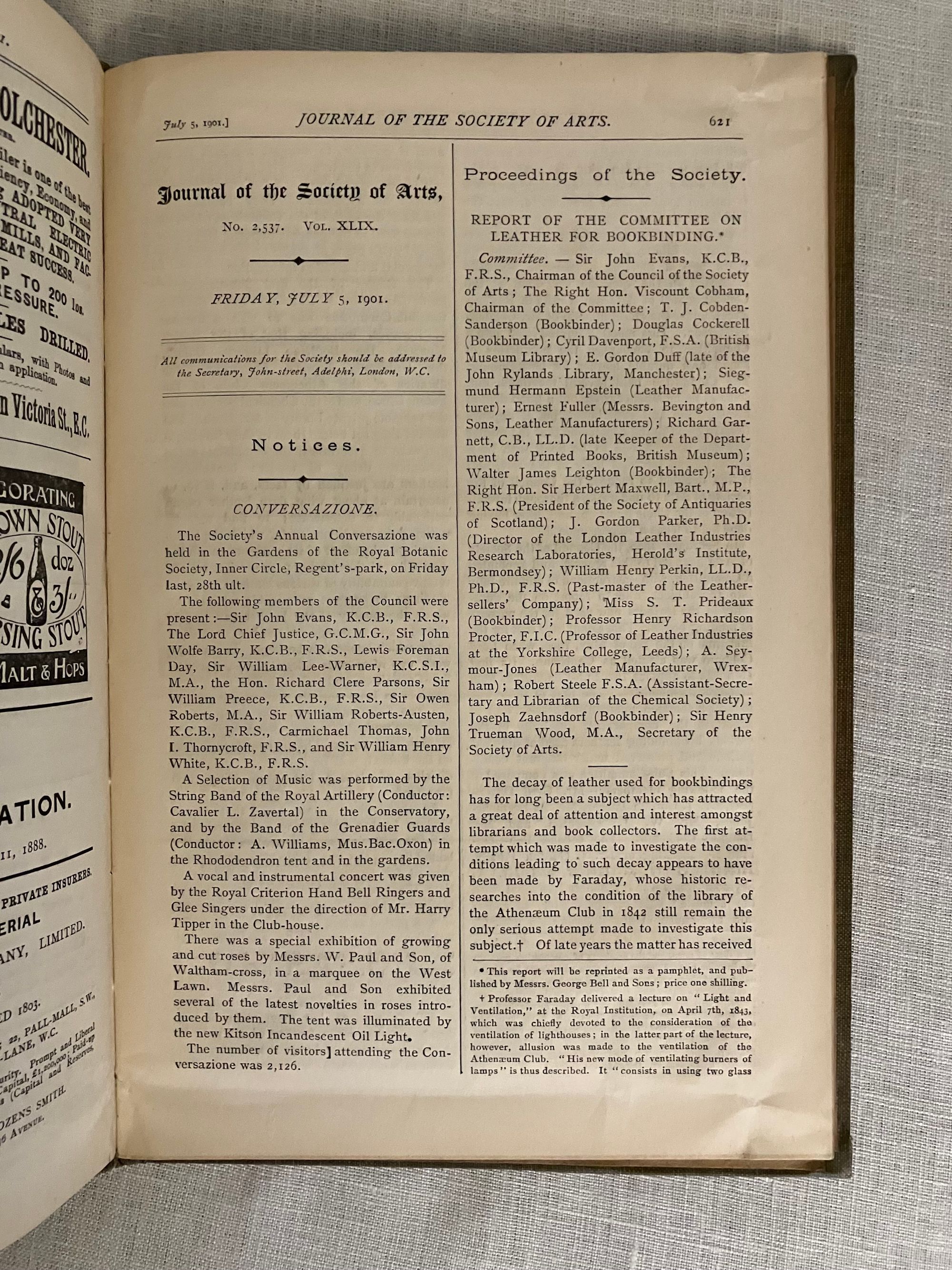 Hard cover, tall 8vo, in tan cloth covered boards over original printed green wraps, brown kraft type pastedowns, with a typed label applied to front, ii,621-640, iv. including advertising, First Edition. CONDITION: Very Good. Front board is sunned, or stained. The wraps are lightly browned at edges, and pages moderately age toned. A pencil location note at rear end paper.**This is the entire issue of this influential weekly arts newspaper for July 5, 1901, featuring a description off the Society's annual garden party, called "The Converzatione," whereupon over two thousand arts-minded Londoners were treated to orchestral music, choral singers, and no doubt tea and sandwiches, on the grounds of the Royal Botanical Society ( and within The Rhododendron Tent.) One presentation at this idlyllic sounding soiree was bad news about the deterioration of books bound beginning around 1830 and especially after 1860. The investigative committee set up by the Society took up the baton of British bookbinder Thomas Cobden-Sanderson, who had made noise about the sad state of affairs in book rot beginning a couple of years prior, from his editorial pulpit at The Central School of Arts and Crafts. His fellow committee members included a number of prominent English hand-bookbinders such as Douglas Cockerell, Walter J. Leighton, Sarah Prideaux and Joseph Zaensdorf. Also on the slate were prominent librarians connected with the British Library and Museum, Richard Garnett and Cyril Davenport, a raft of leather manufacturers, and at least one noted collector, Mr. Huth. The results of these investigations make for good reading, and represent the first concerted effort in the understanding of book conservation. Beyond manufacturing causes, there is discussion of the damage done by environmental contaminants, such as damp, nicotine and the like. The article flags up considerations for the modern collector about the proper storage of old books.